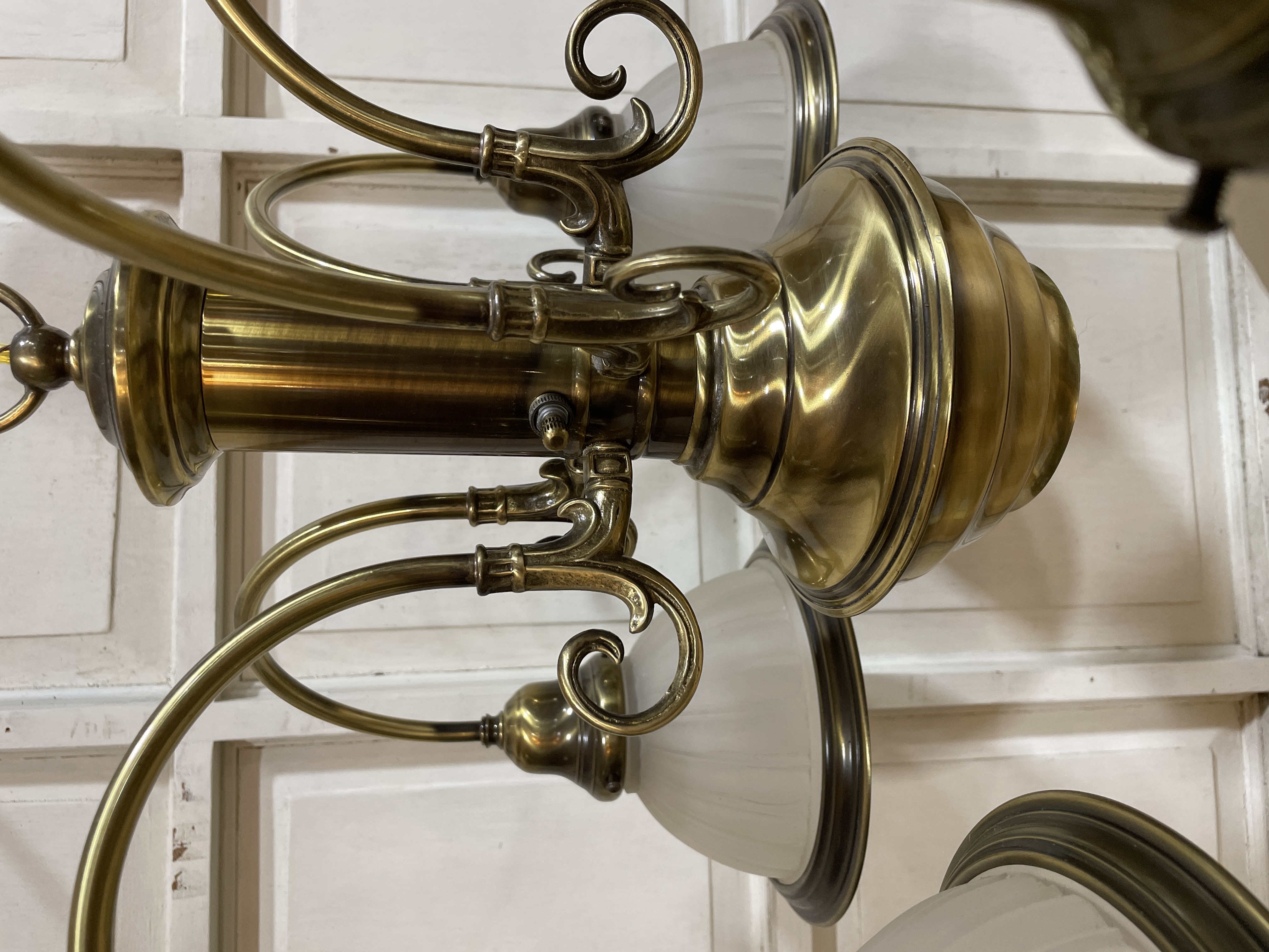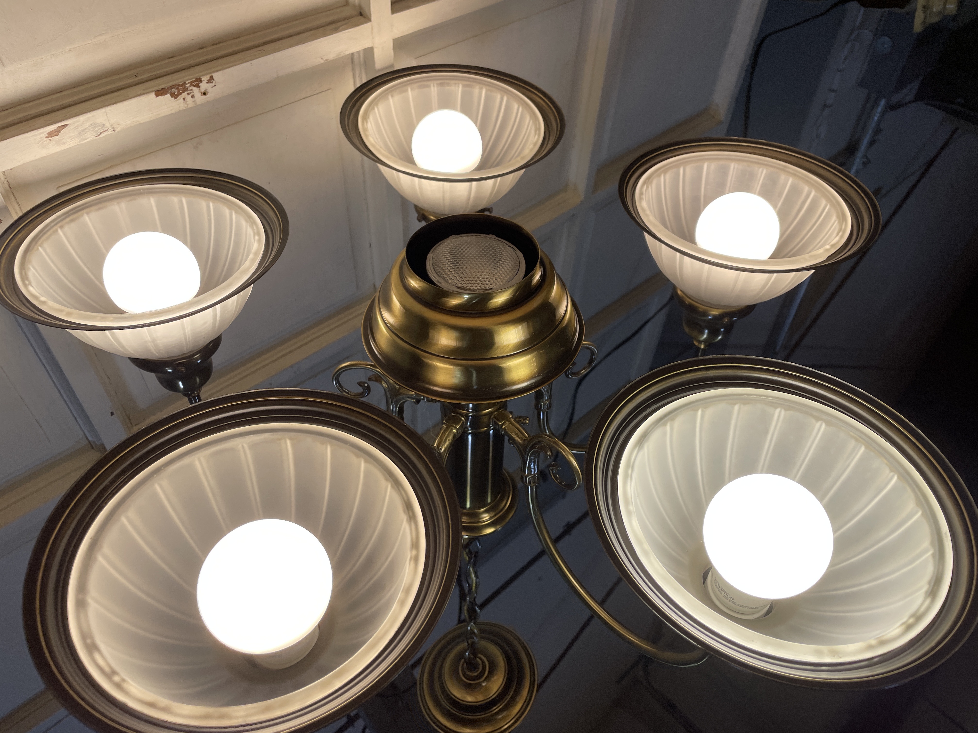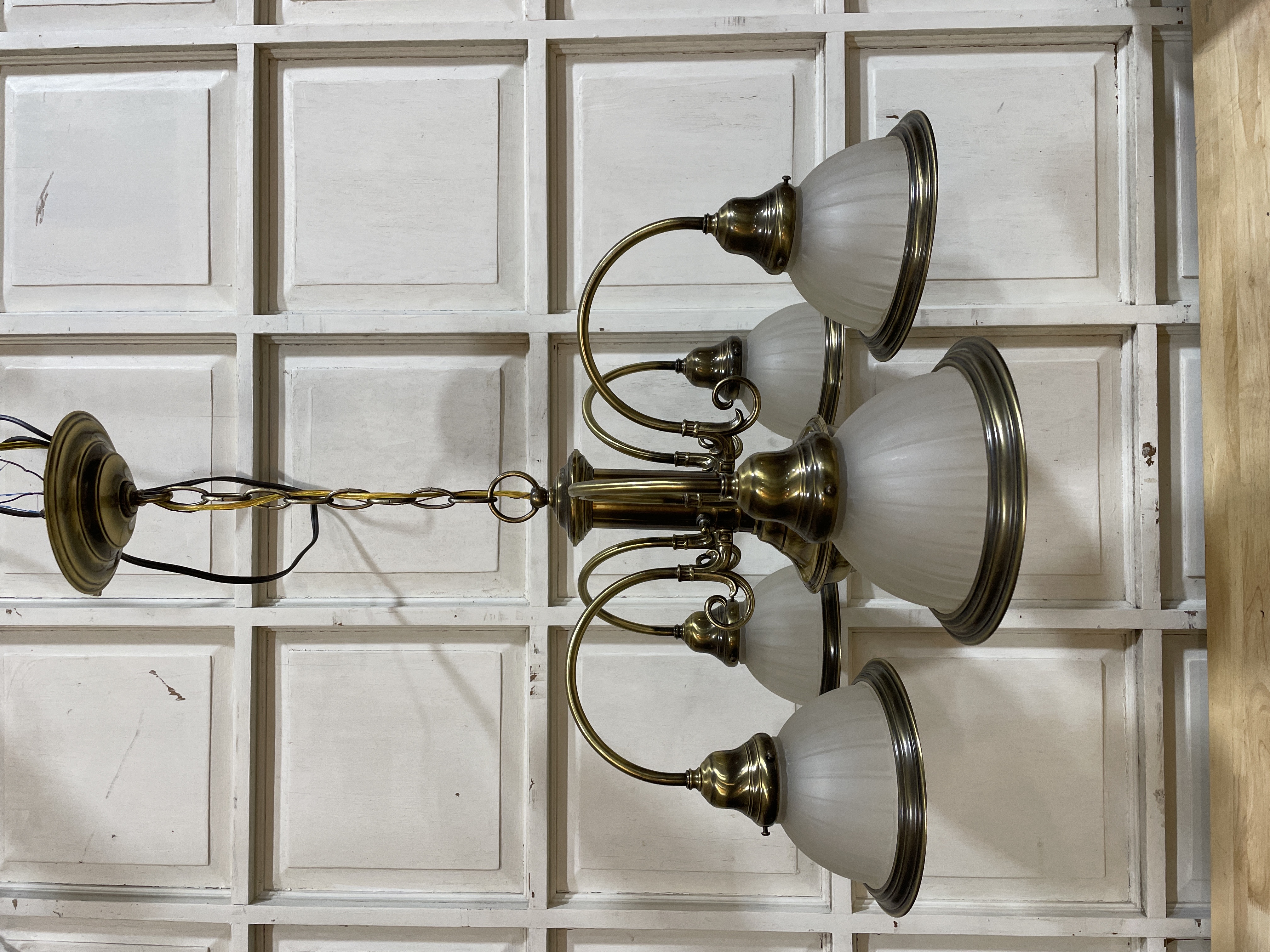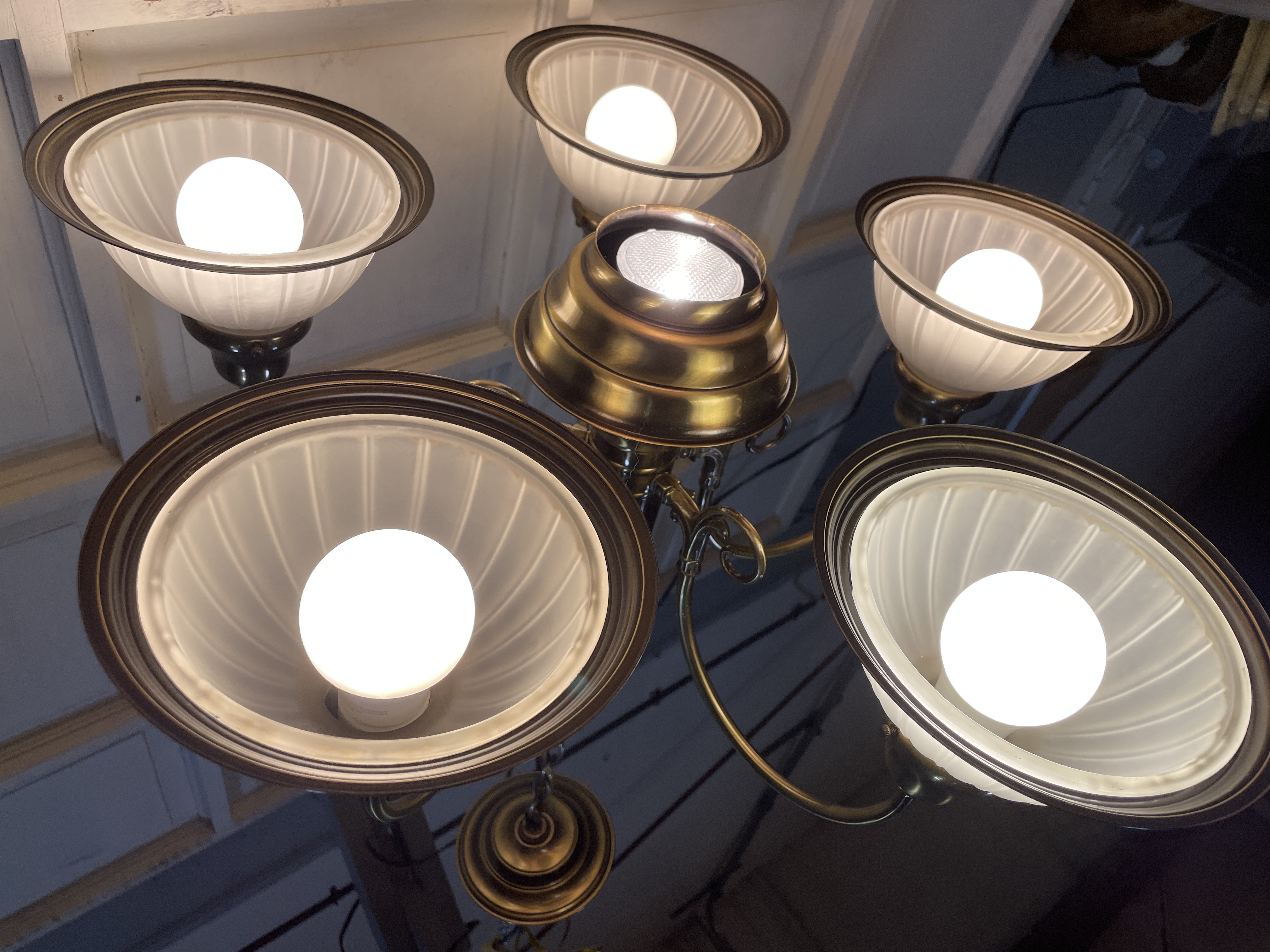 5 arms with center bulb for extra lights. Rubbed brass metal with a curlicue design. Ribbed and frosted shades. Light switch allows for 3 settings, see photos.