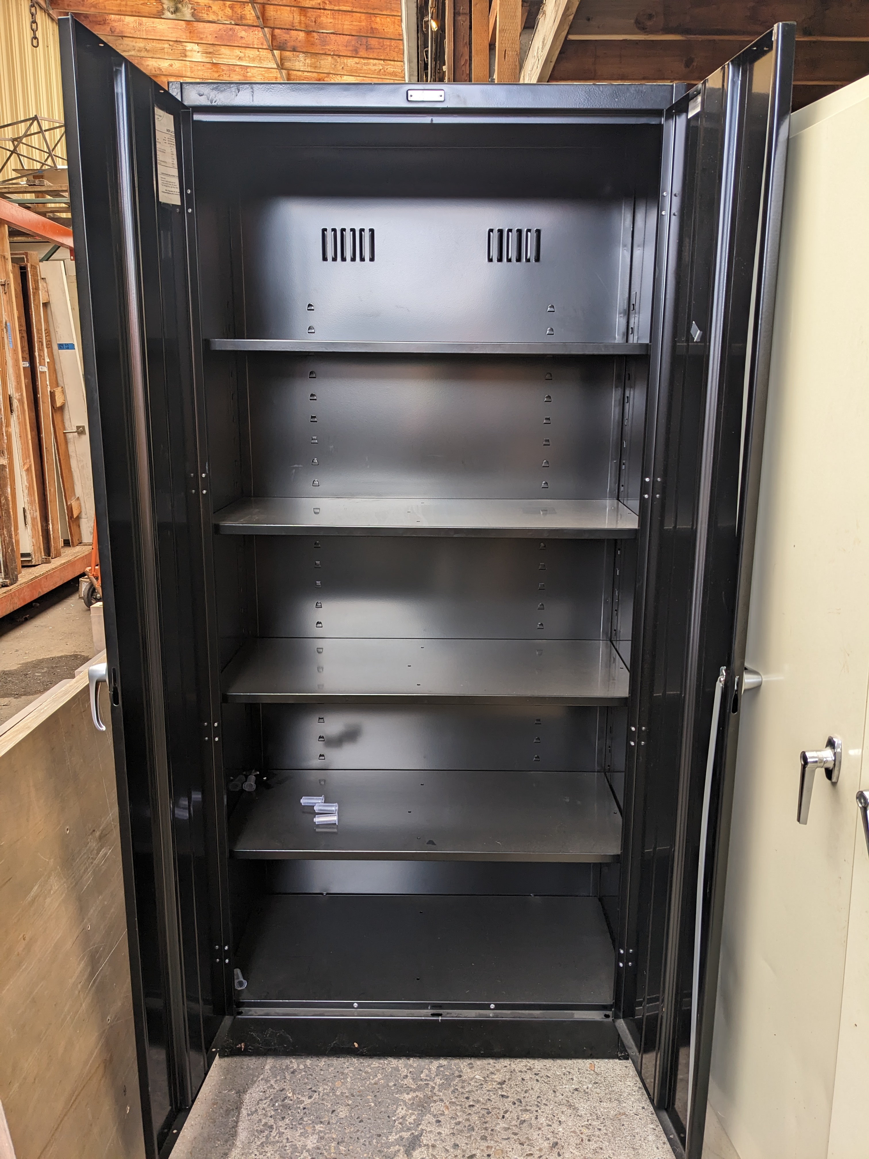Large and in charge, this heavy duty metal tool cabinet is ready to make your workshop organization dreams come true! Features 5 adjustable shelves, all metal construction, and an all black palette for a sleek goth look.