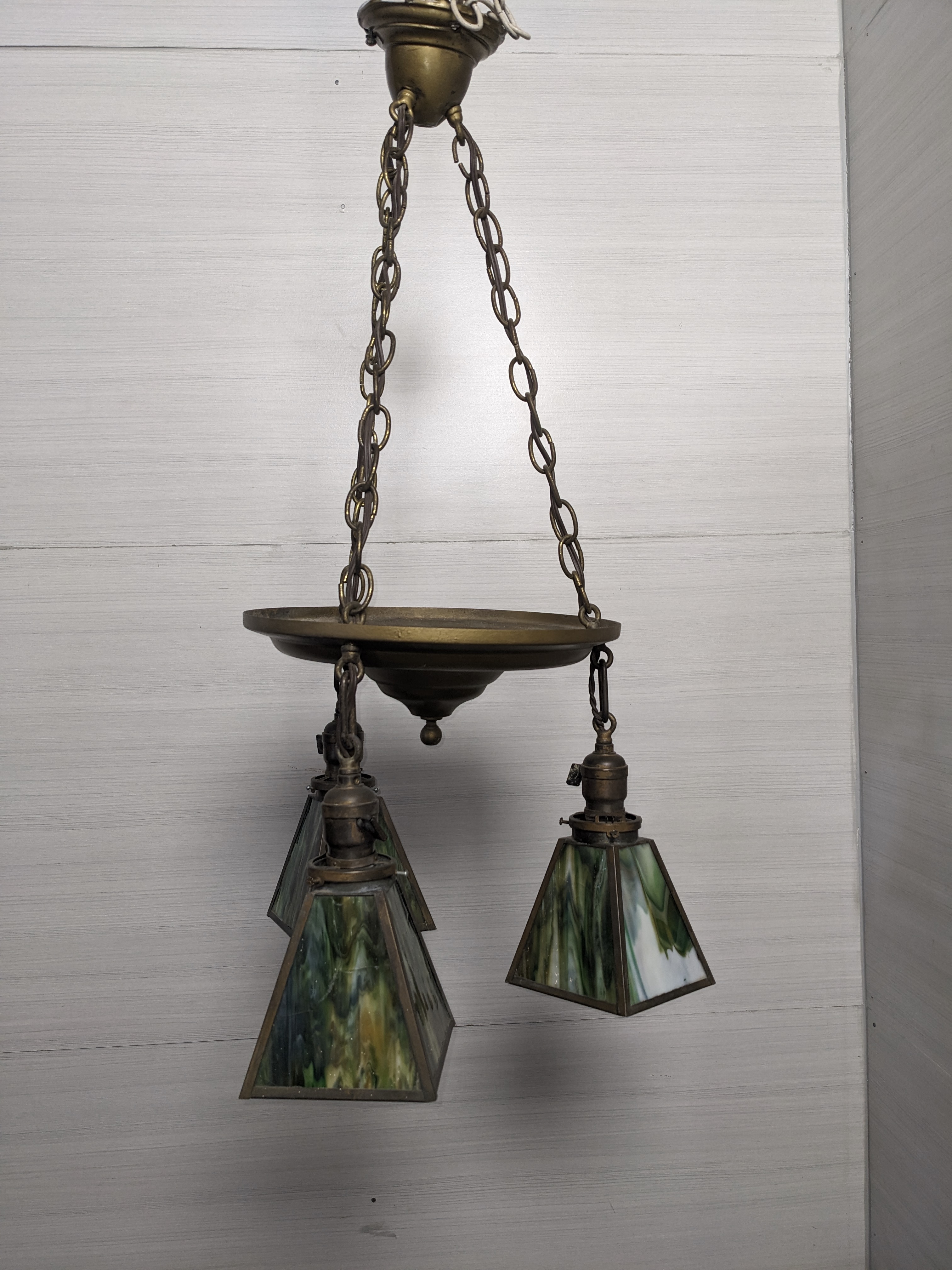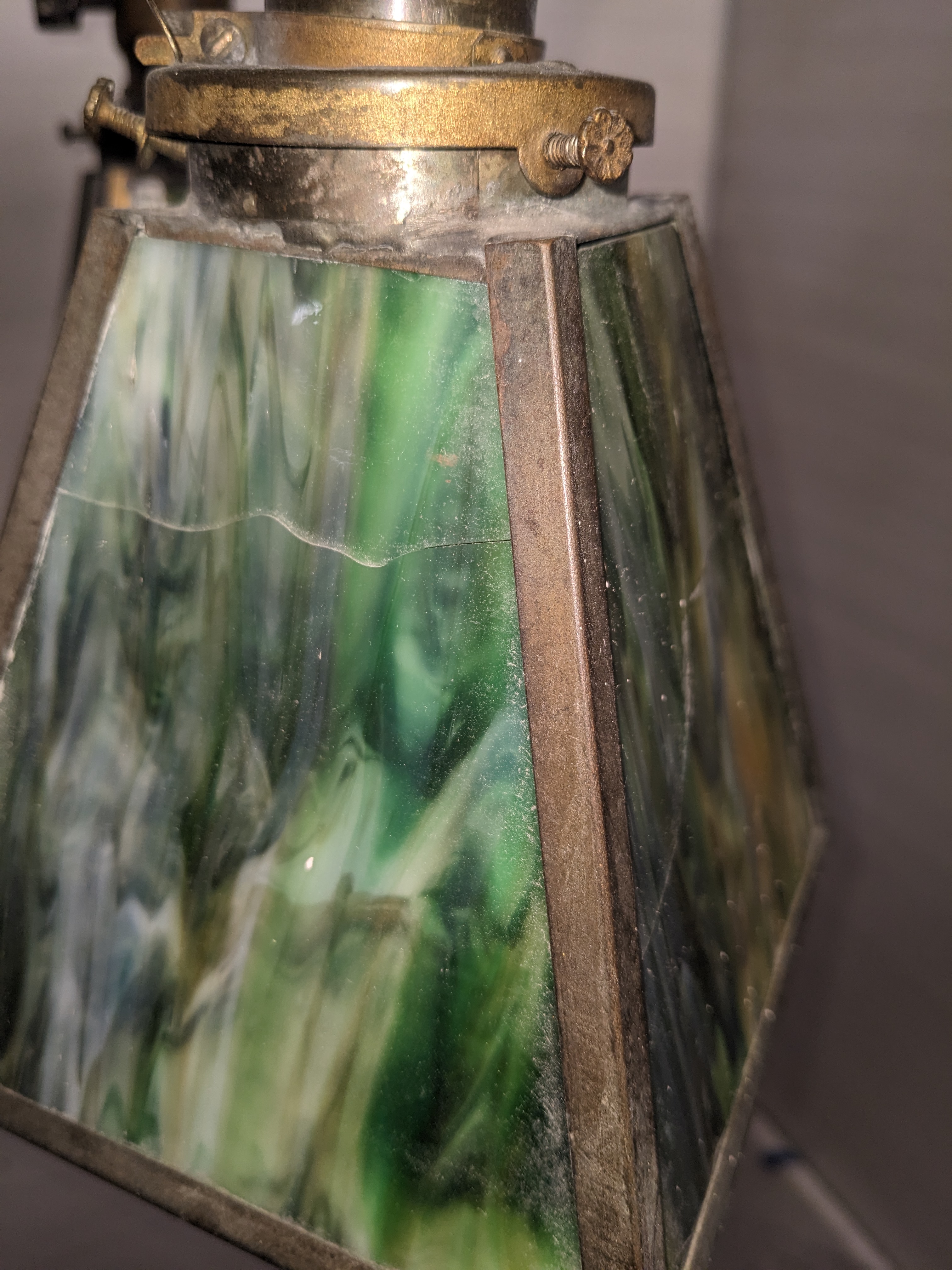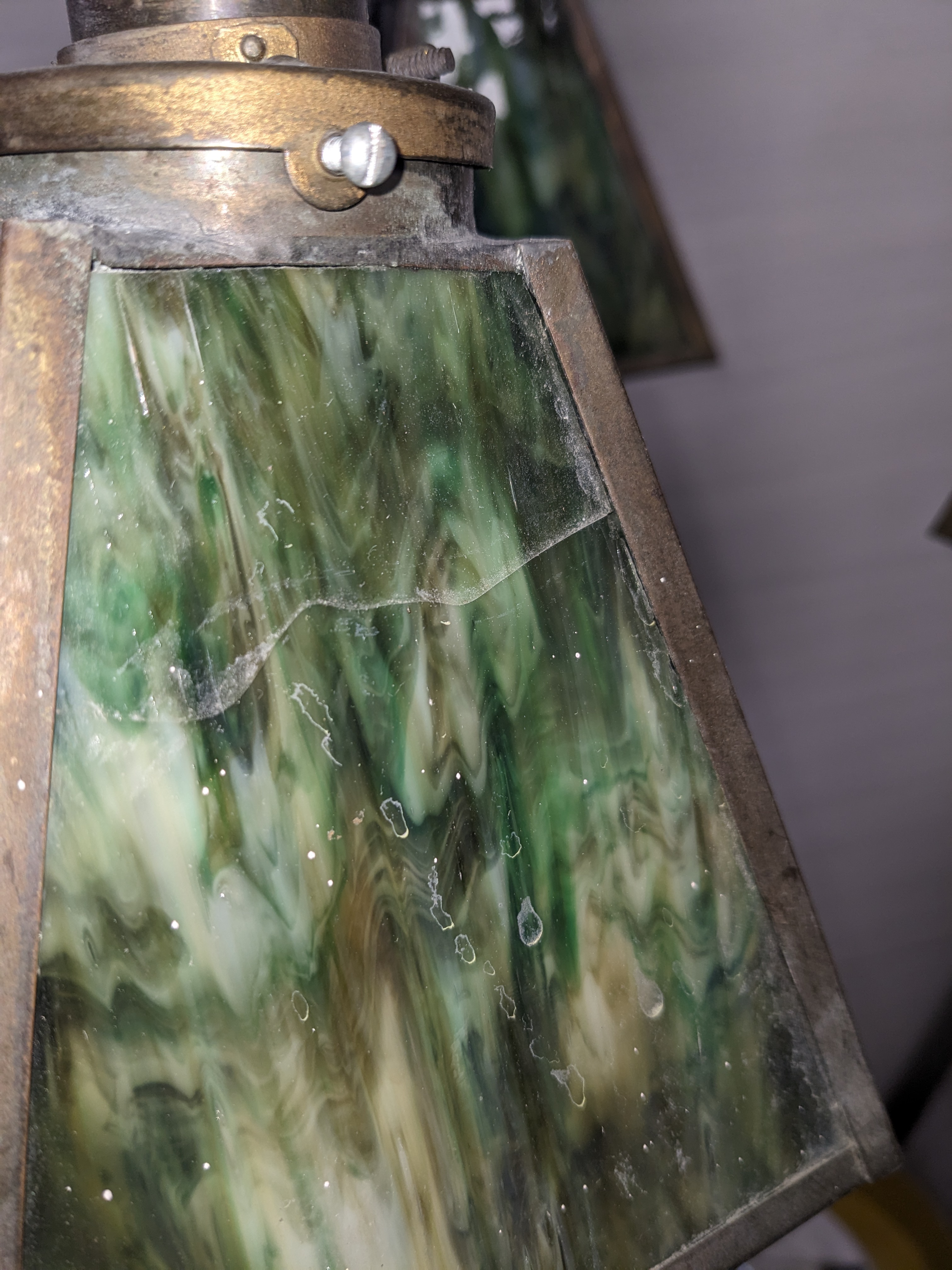 This light is sold As-is. It needs some work. The wiring is updated, that's good. All 3 of the shades are cracked on 3 of the 4 sides. They aren't horrible, see photos and then decide. Still a pretty cool light.