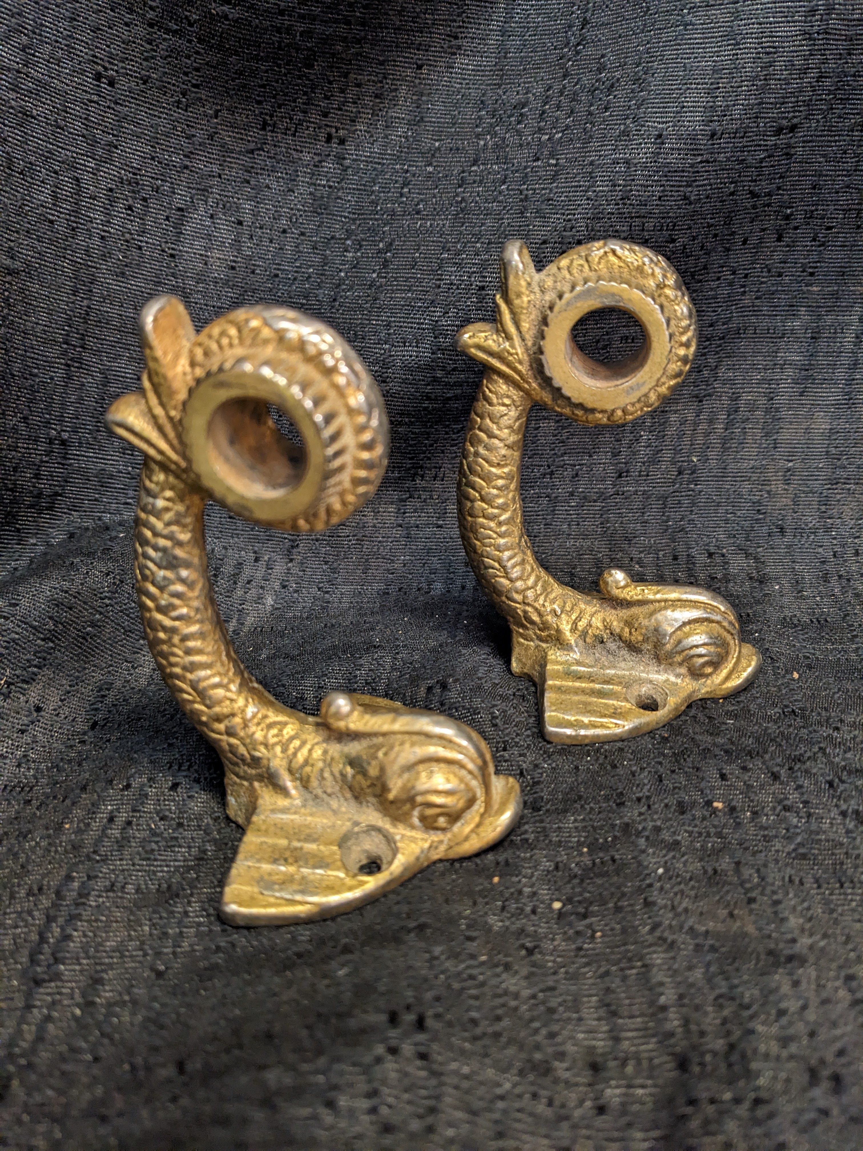 These unique brass brackets feature a decorative fish and measure 2.25 x 2 x 3.5.