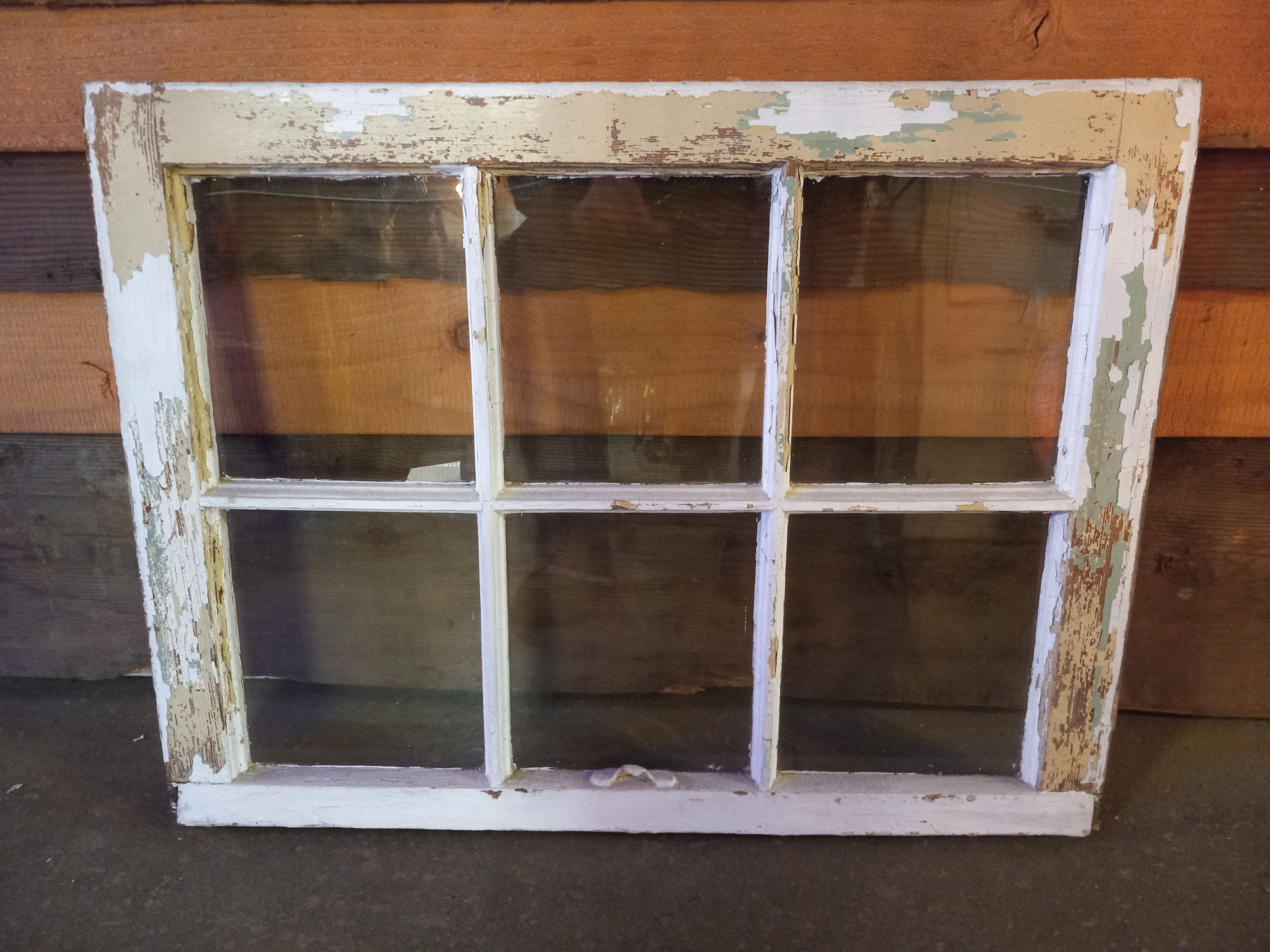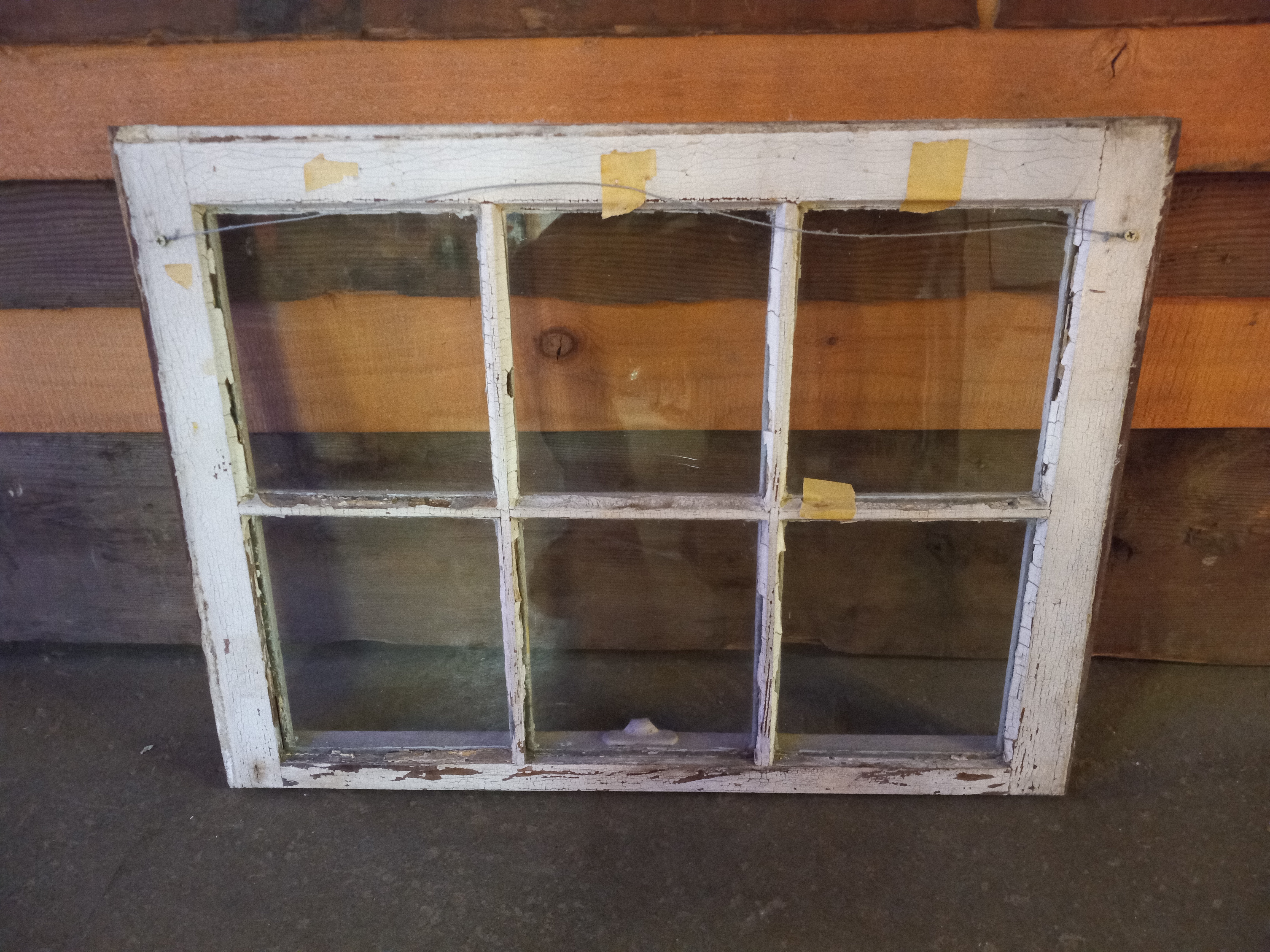 This wooden framed window is in fair condition. It has a wire on the back to hang up. The panes are intact but the glazing has fallen off in most places.