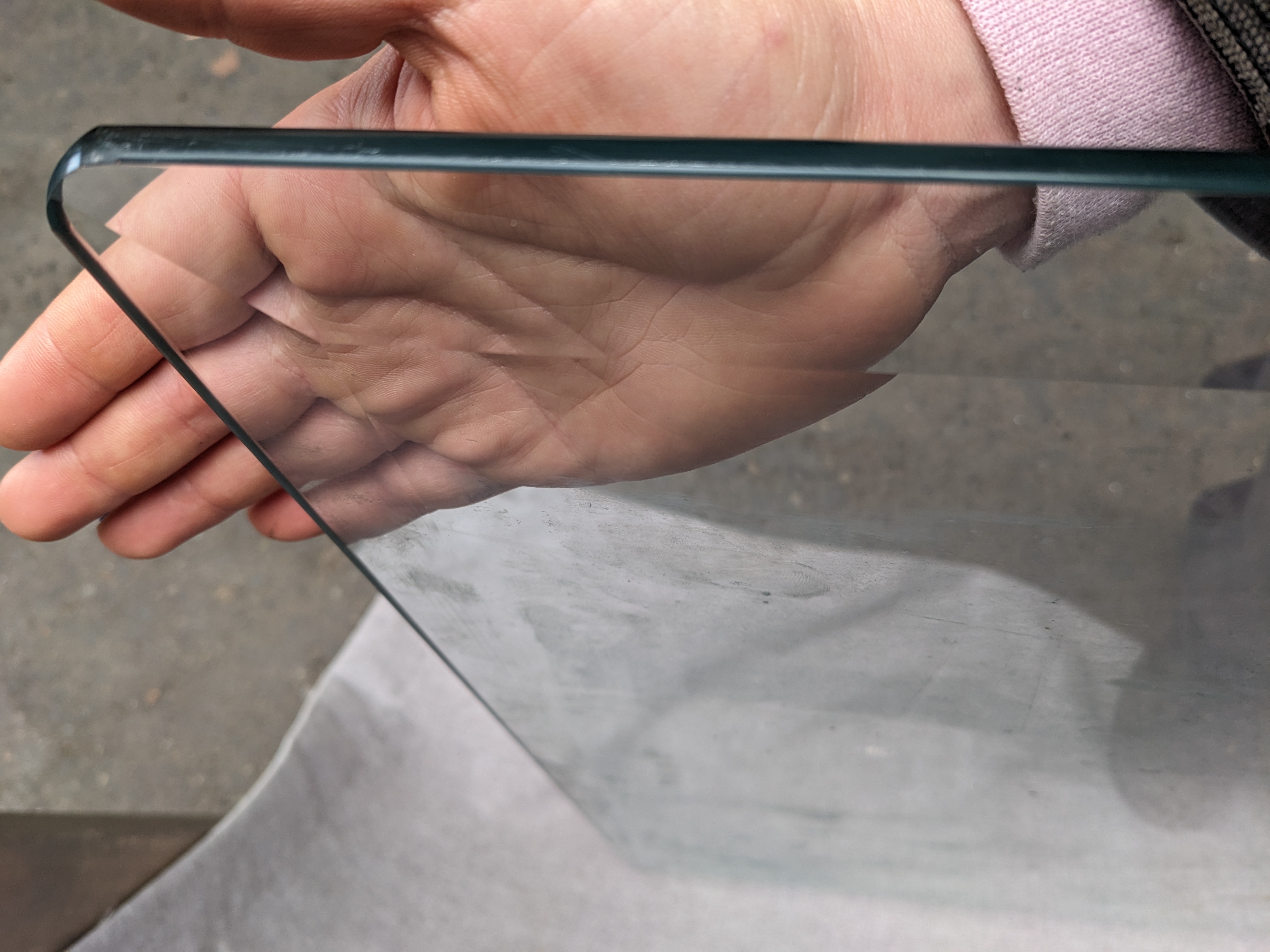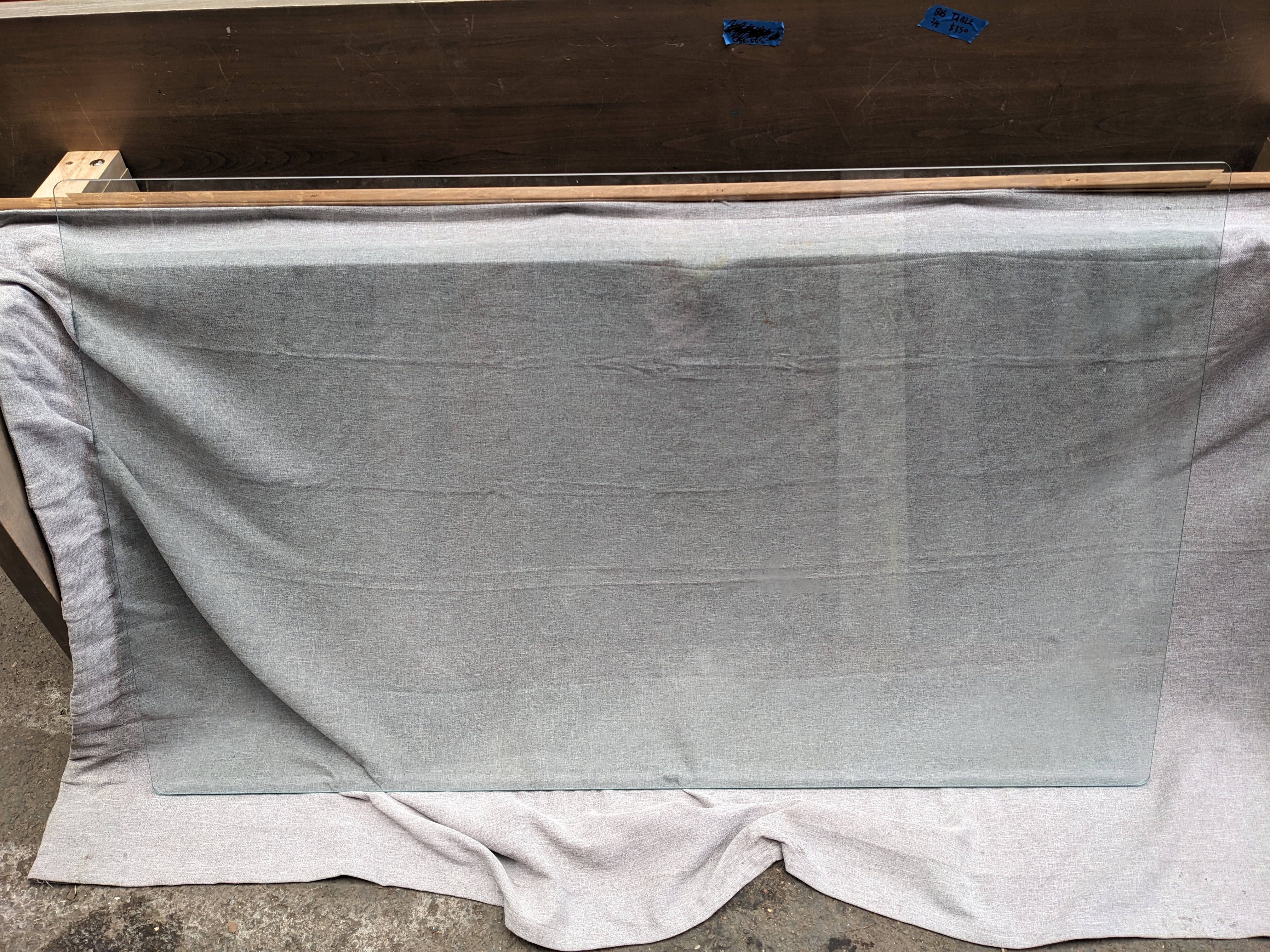 This glass tabletop has wide beveled edges and is a 0.25 inch thick. It is quite heavy and most likely tempered. There is no table base sold with it, so you will have to find or make your own for it to rest on!