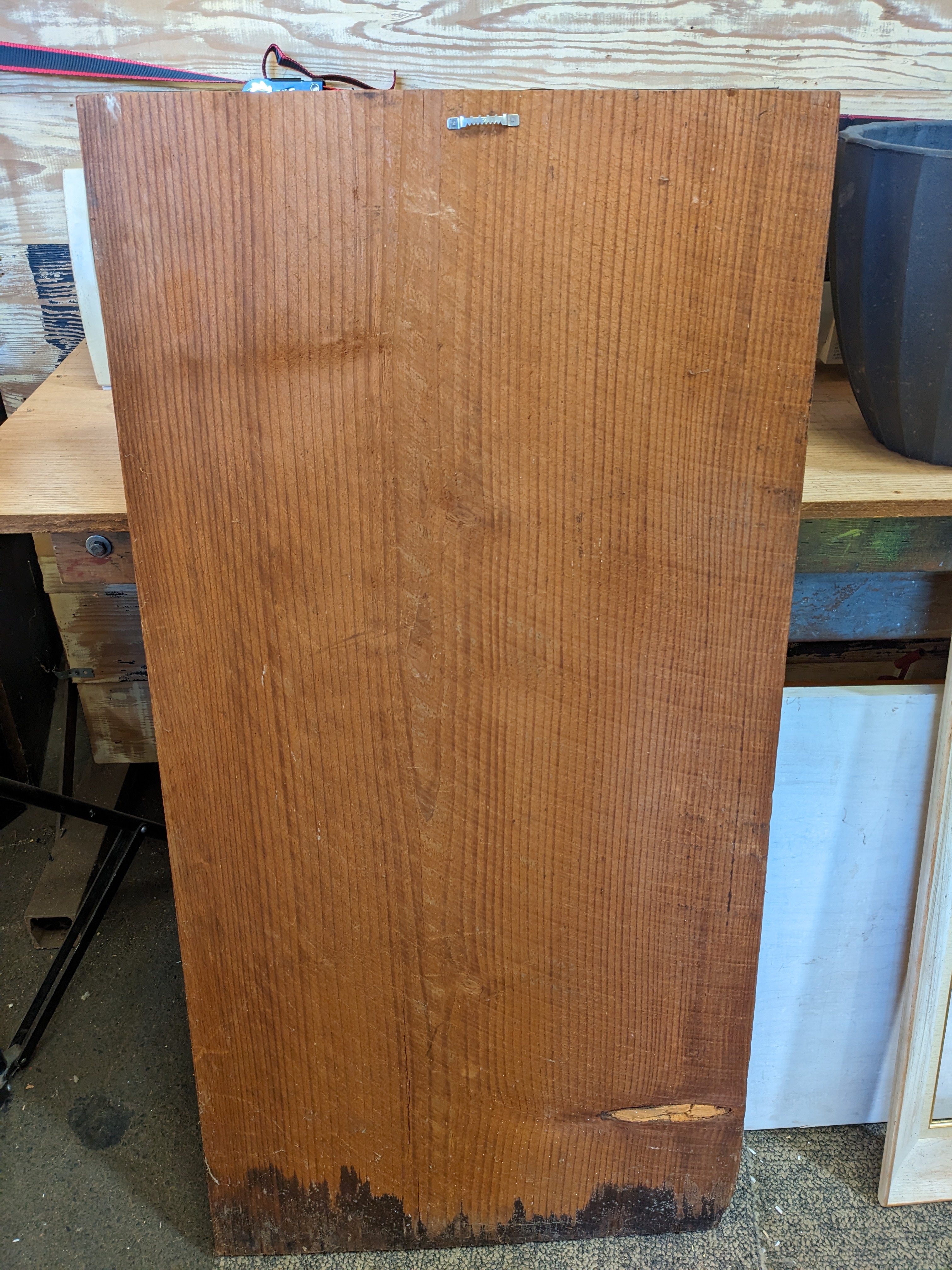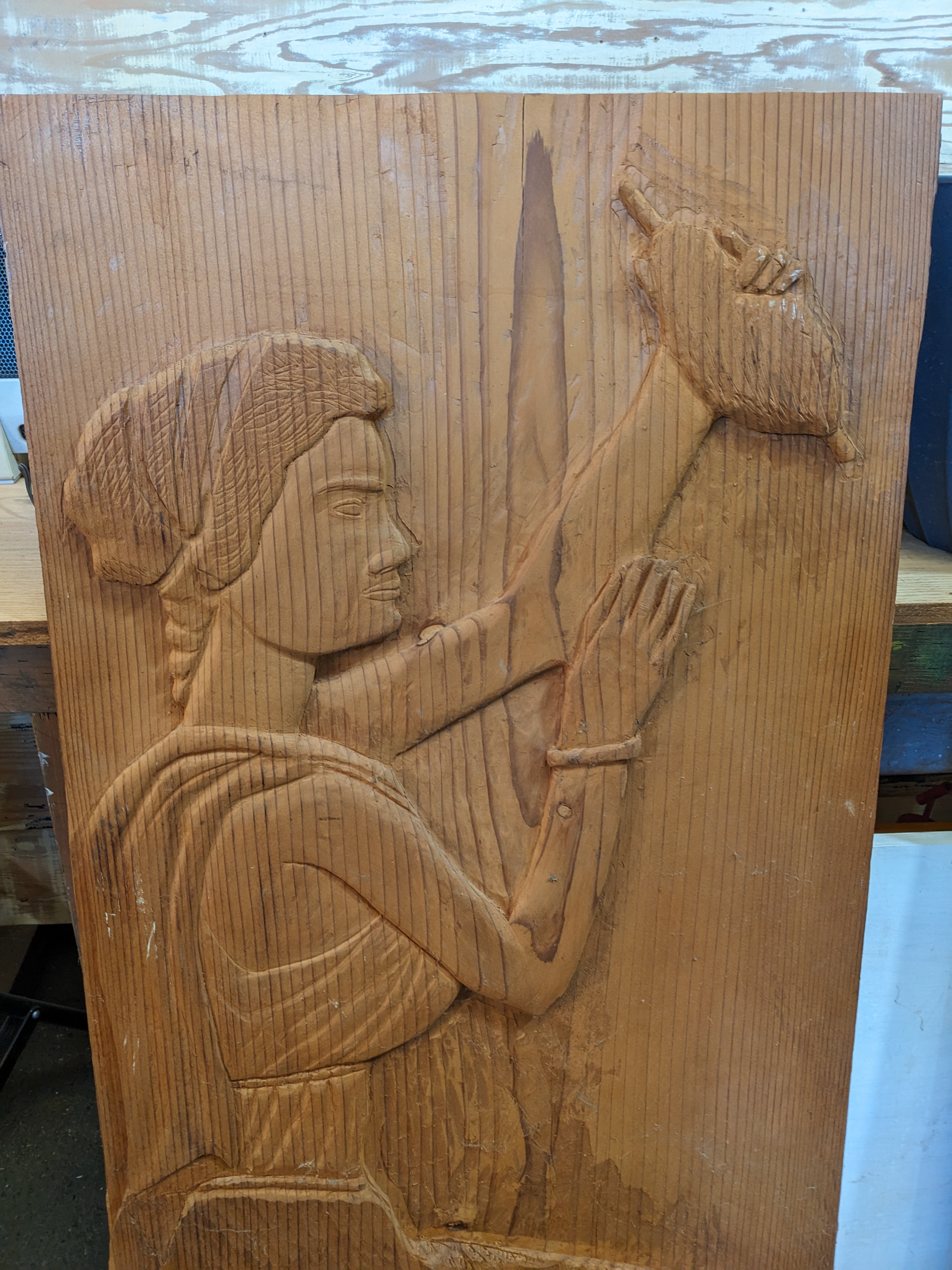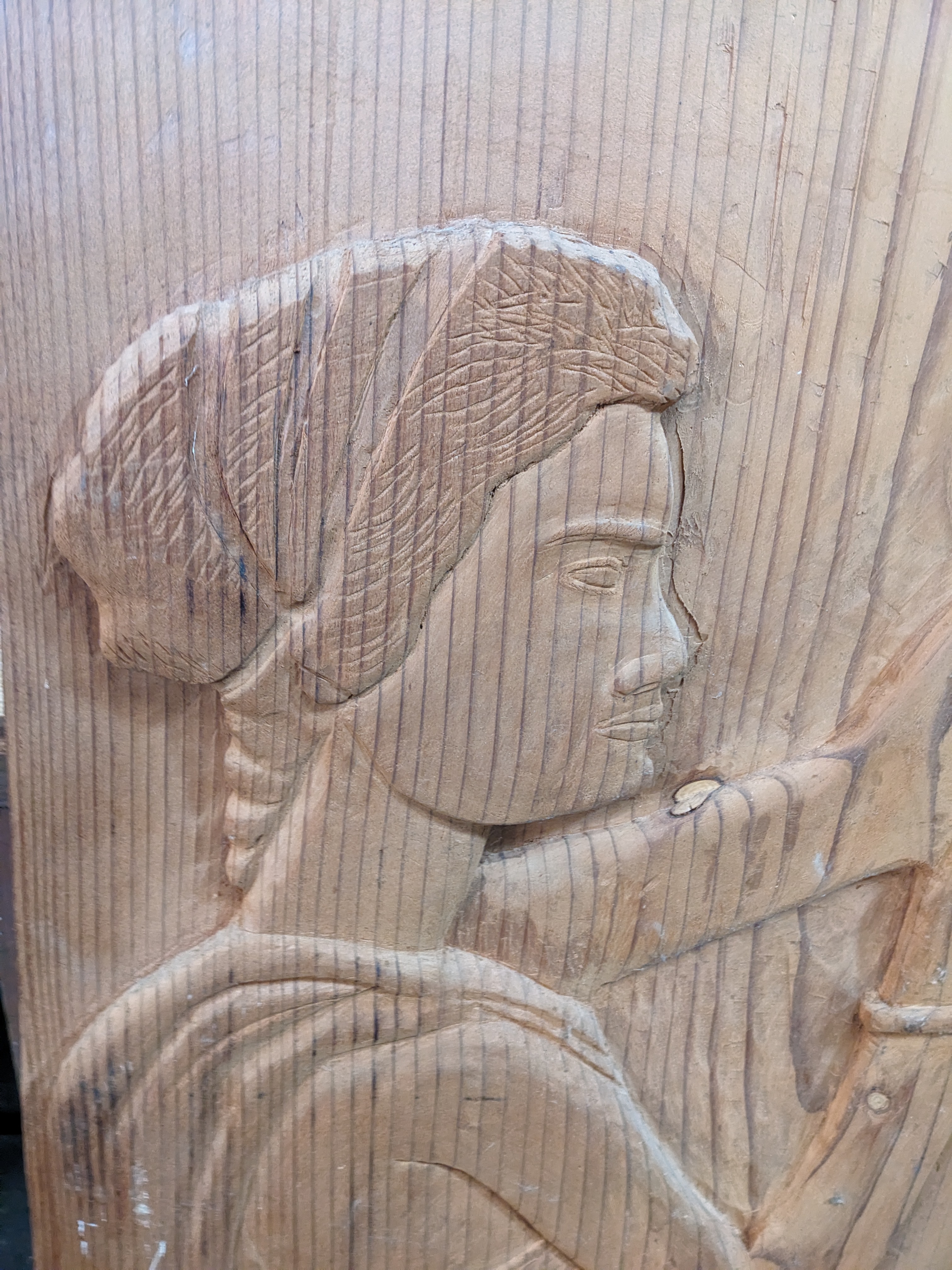 Decorative wood panel that has a woman holding something, perhaps a shells or gooey duck? It provides a fun visual and would look great in a cabin by the water. Has a hook in the back to hang it.