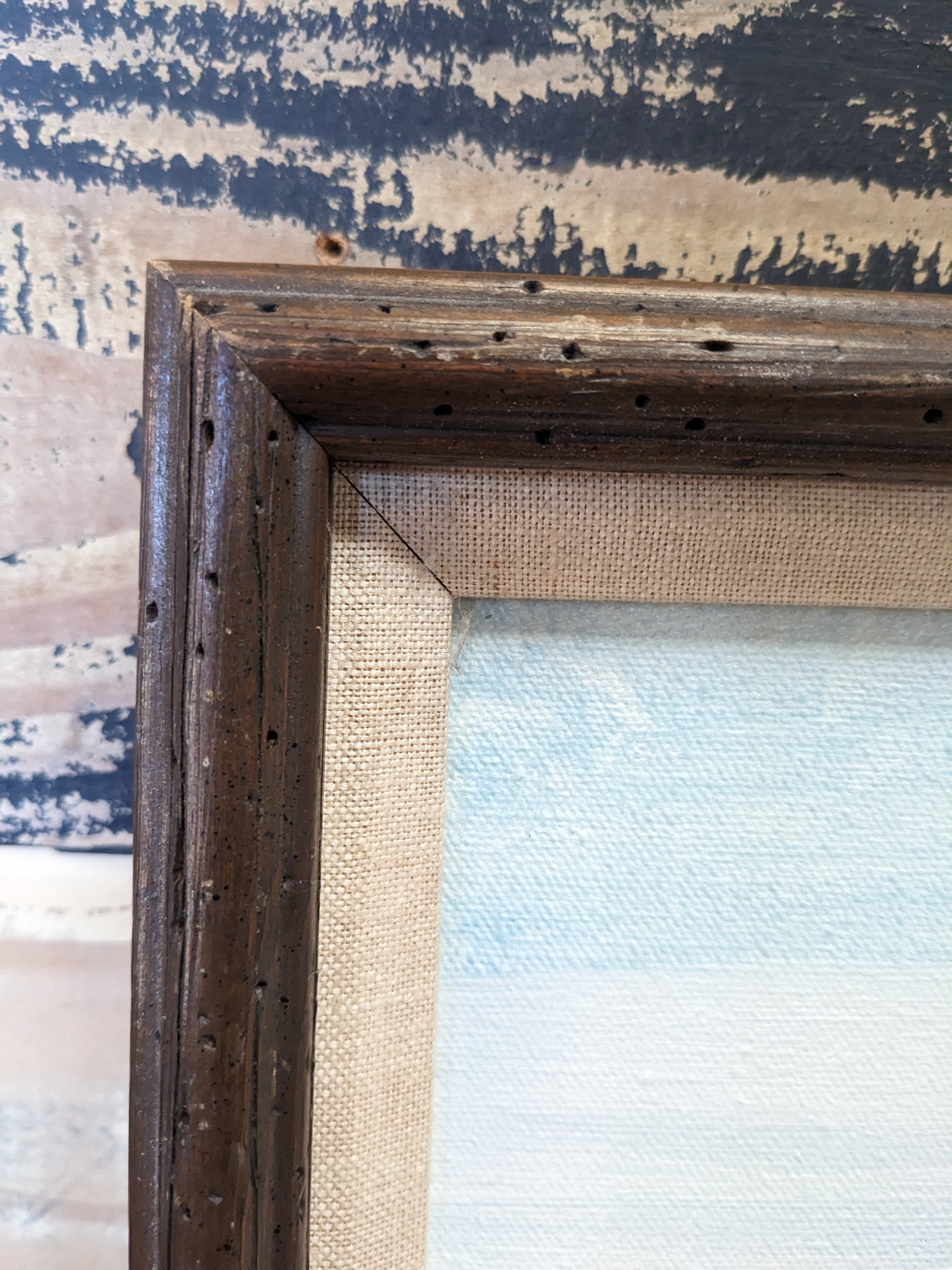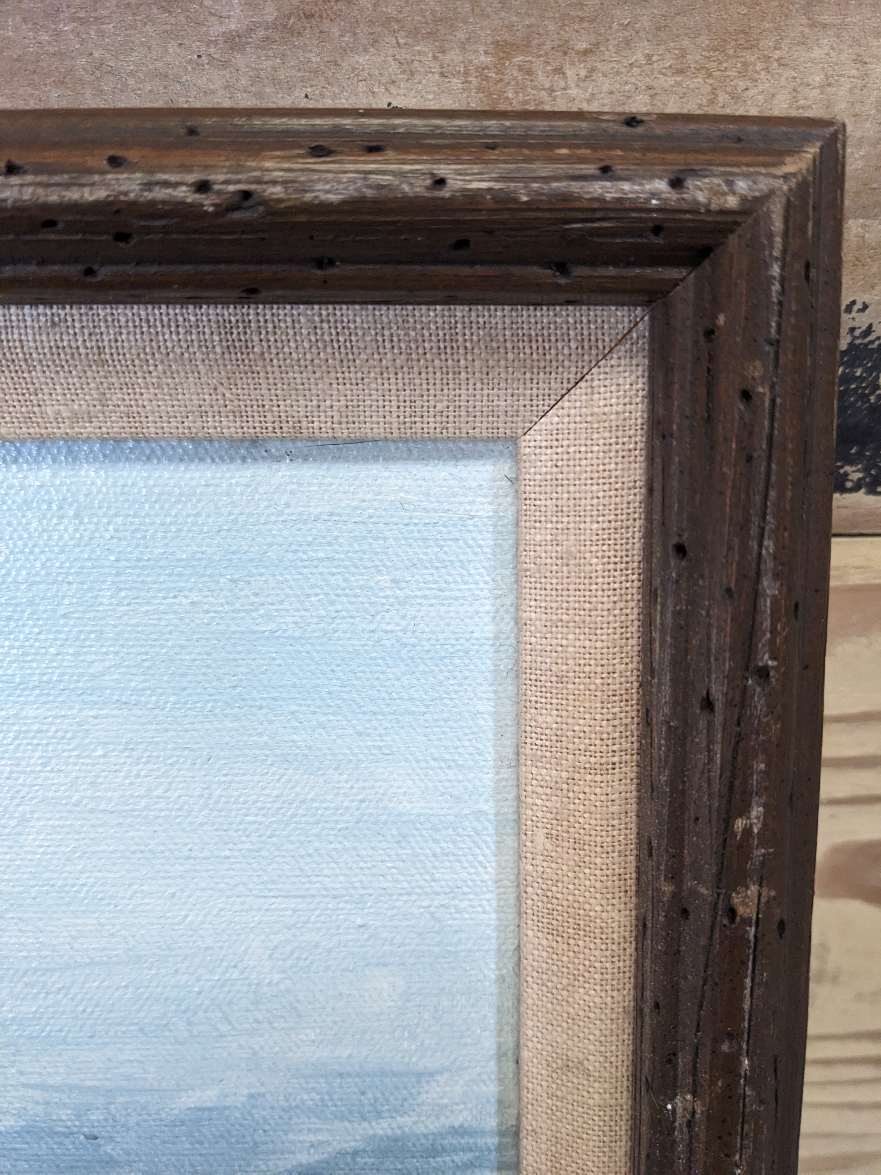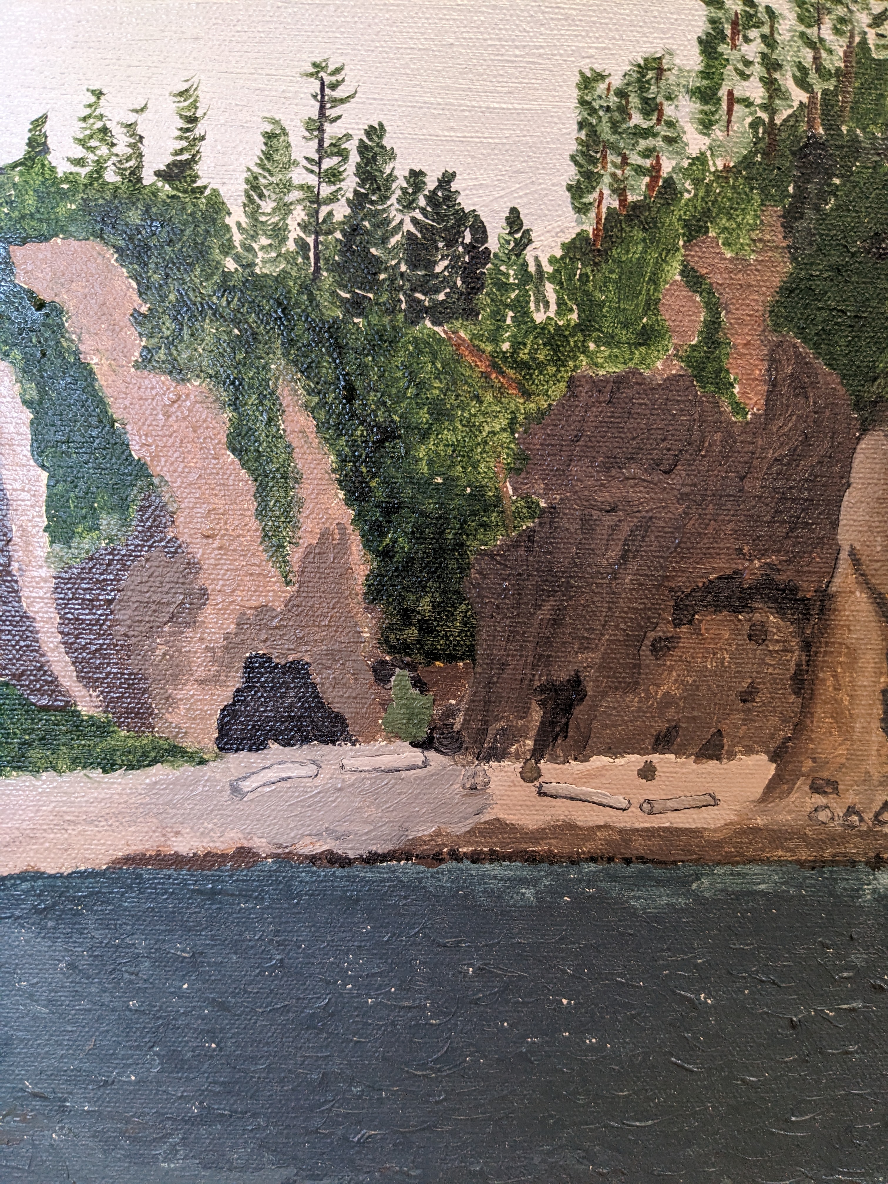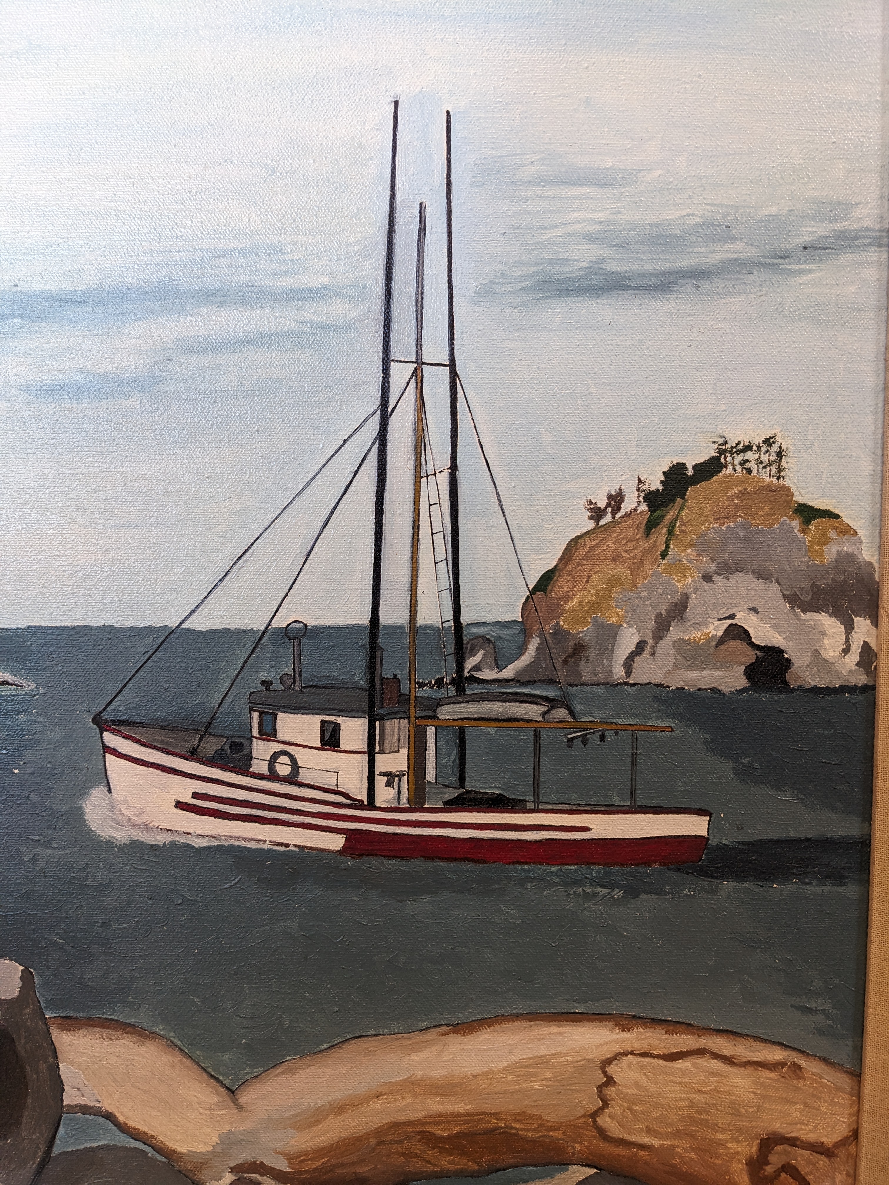 A serene coastal scene. Where's that boat headed? Whose the Captain? Very well could be somewhere in the San Jaun Islands. Watch out for drift logs, they kill! Unknown artist. Framed in a great canvas and wood frame.