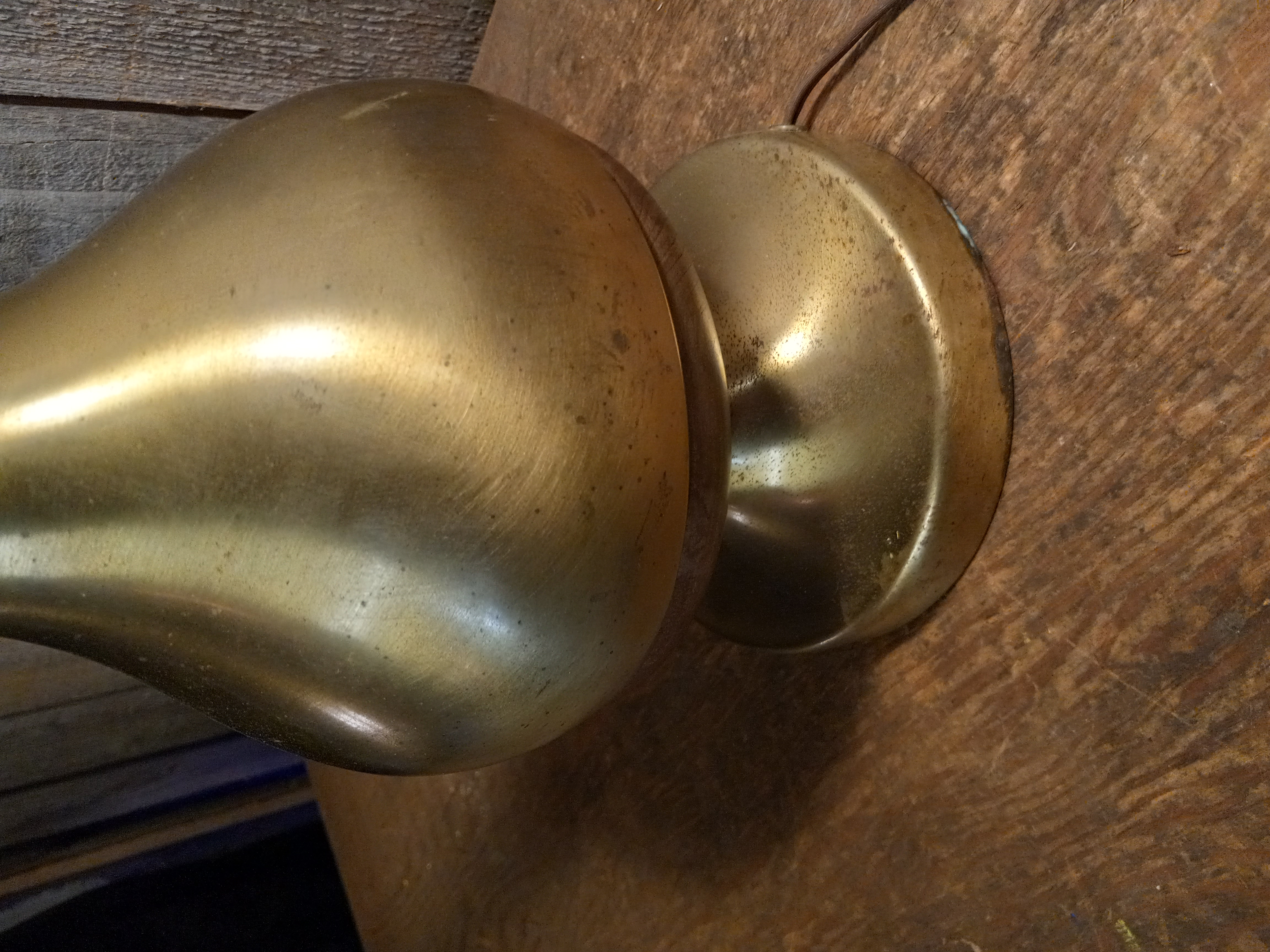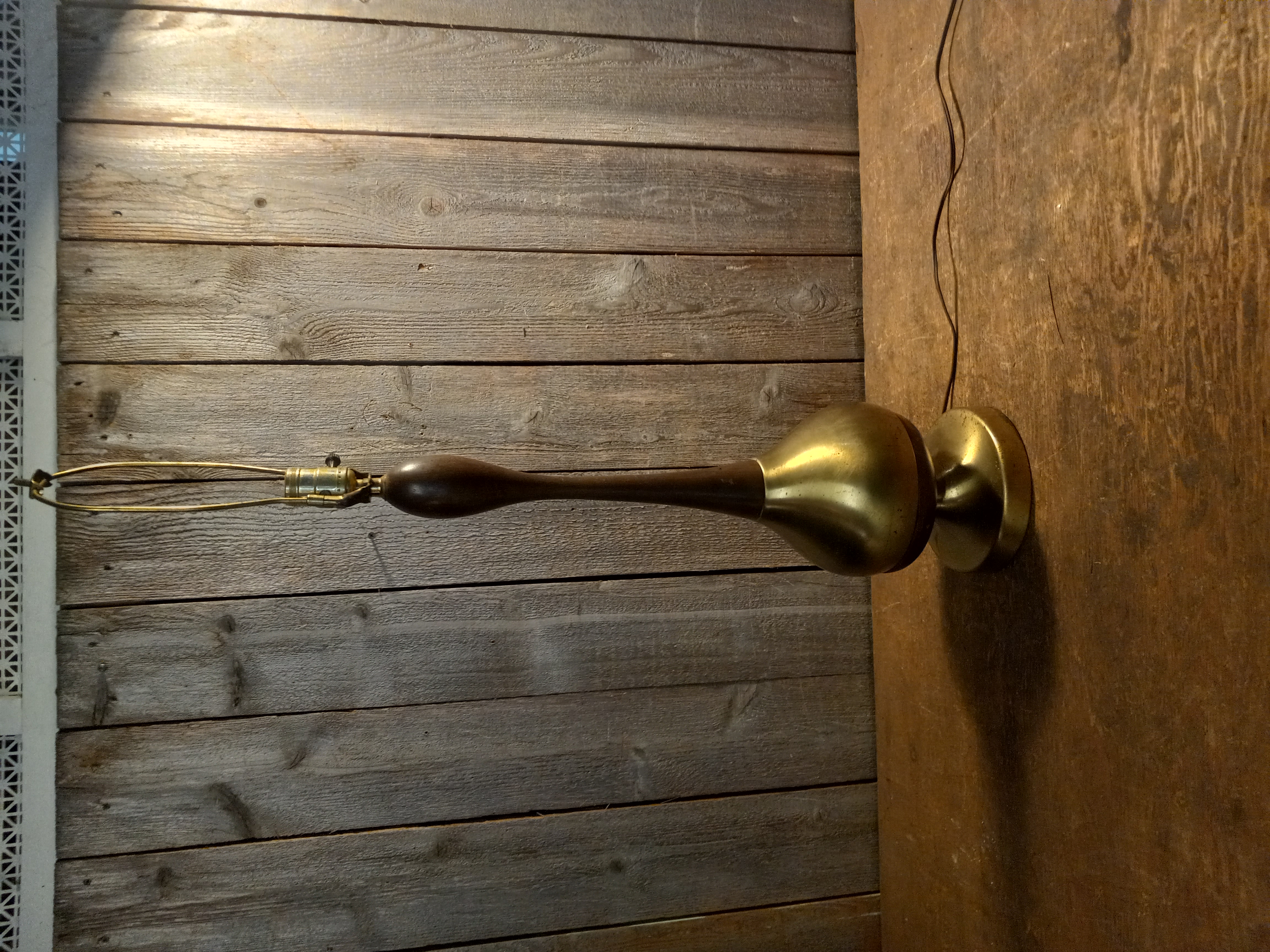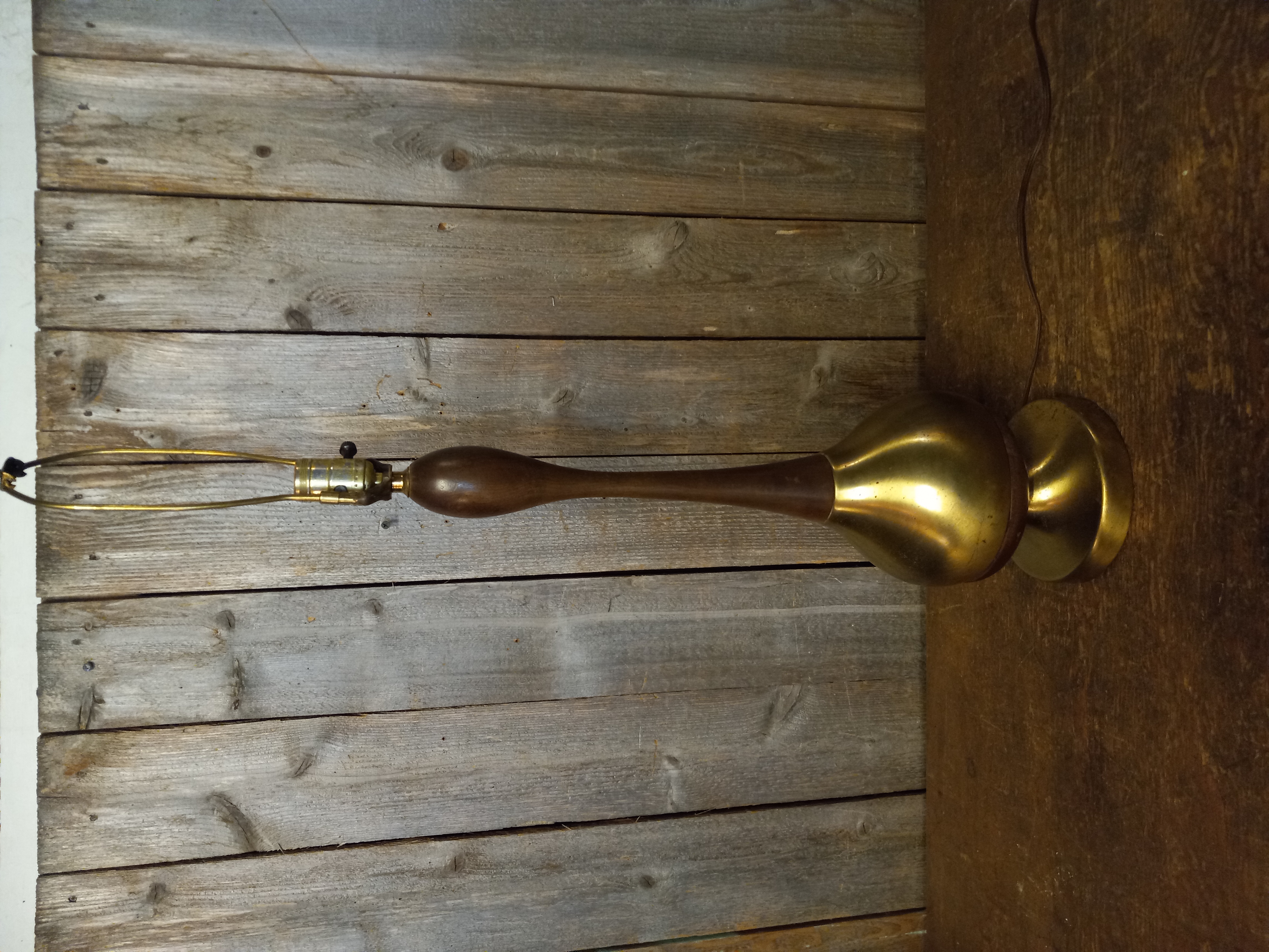 The wood is in good condition but does show some small blemishes. The brass is a brushed brass coating over metal that also shows some blemishes and does have some surface rust. Priced accordingly.