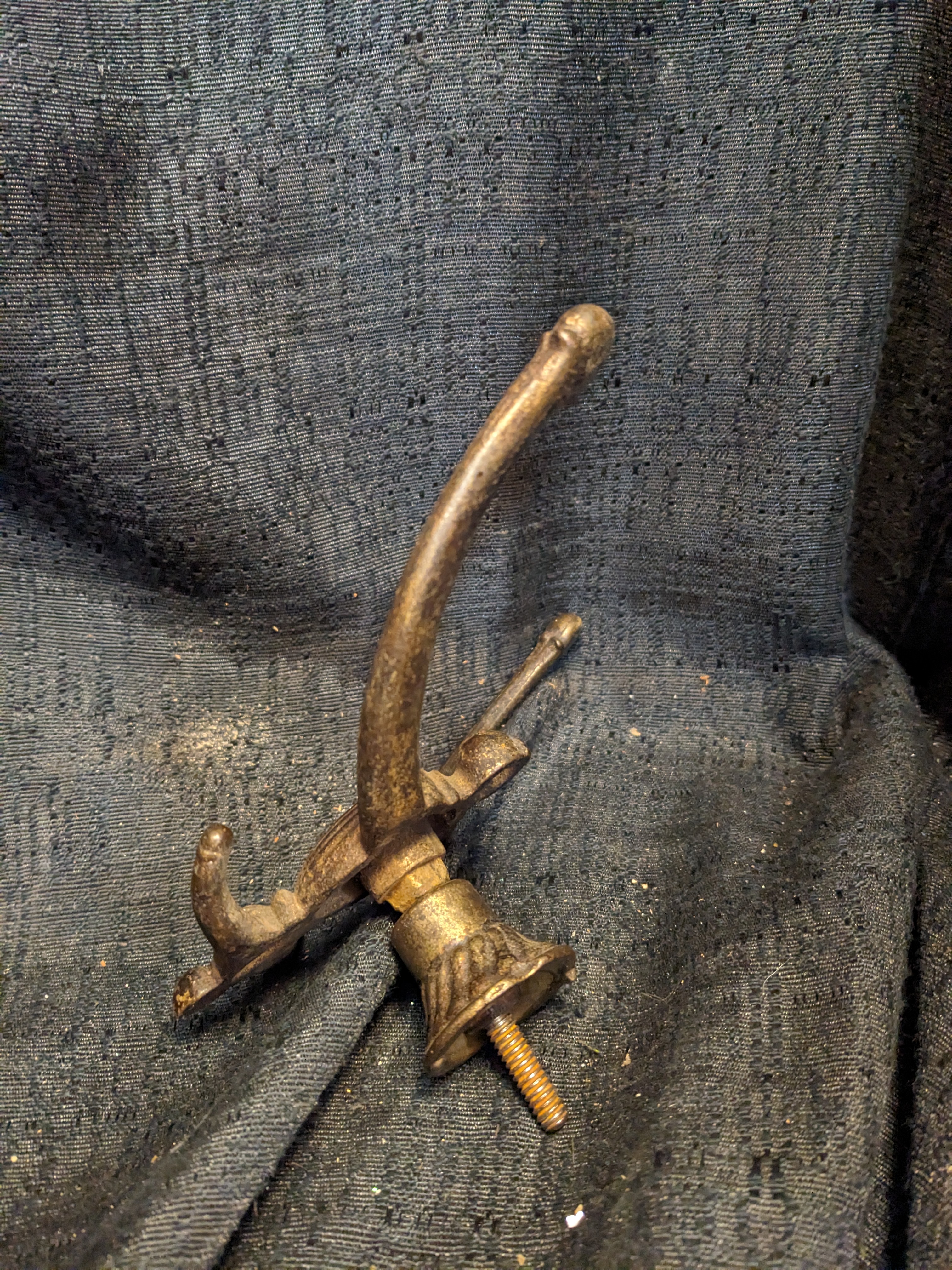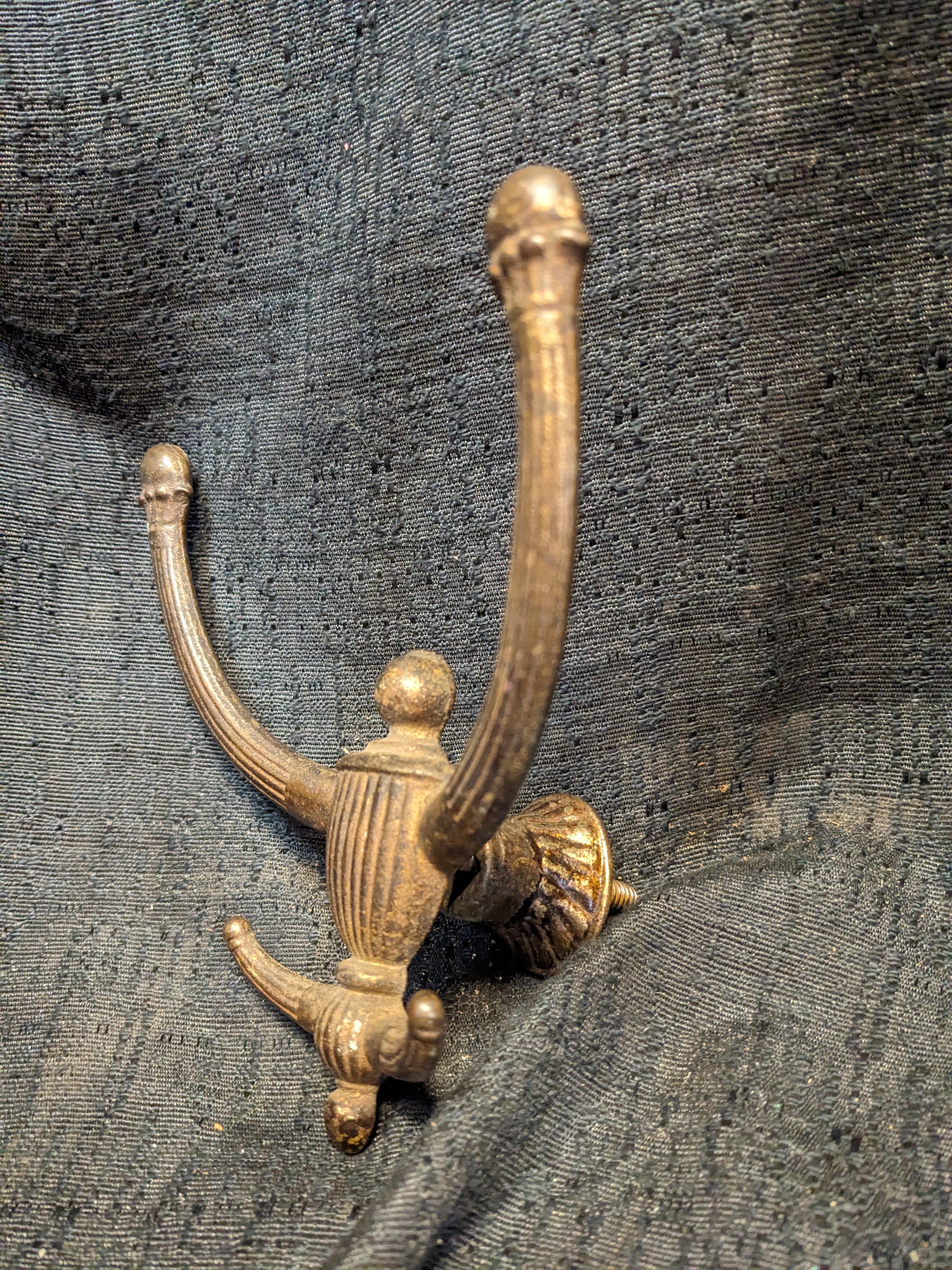 This hook has plenty of room for all your layers and more. It is old cast iron with a bit of a shine from a finish that is mostly worn off. It is installed by drilling through a door or board, feeding the post through, and securing it with a nut on the back.