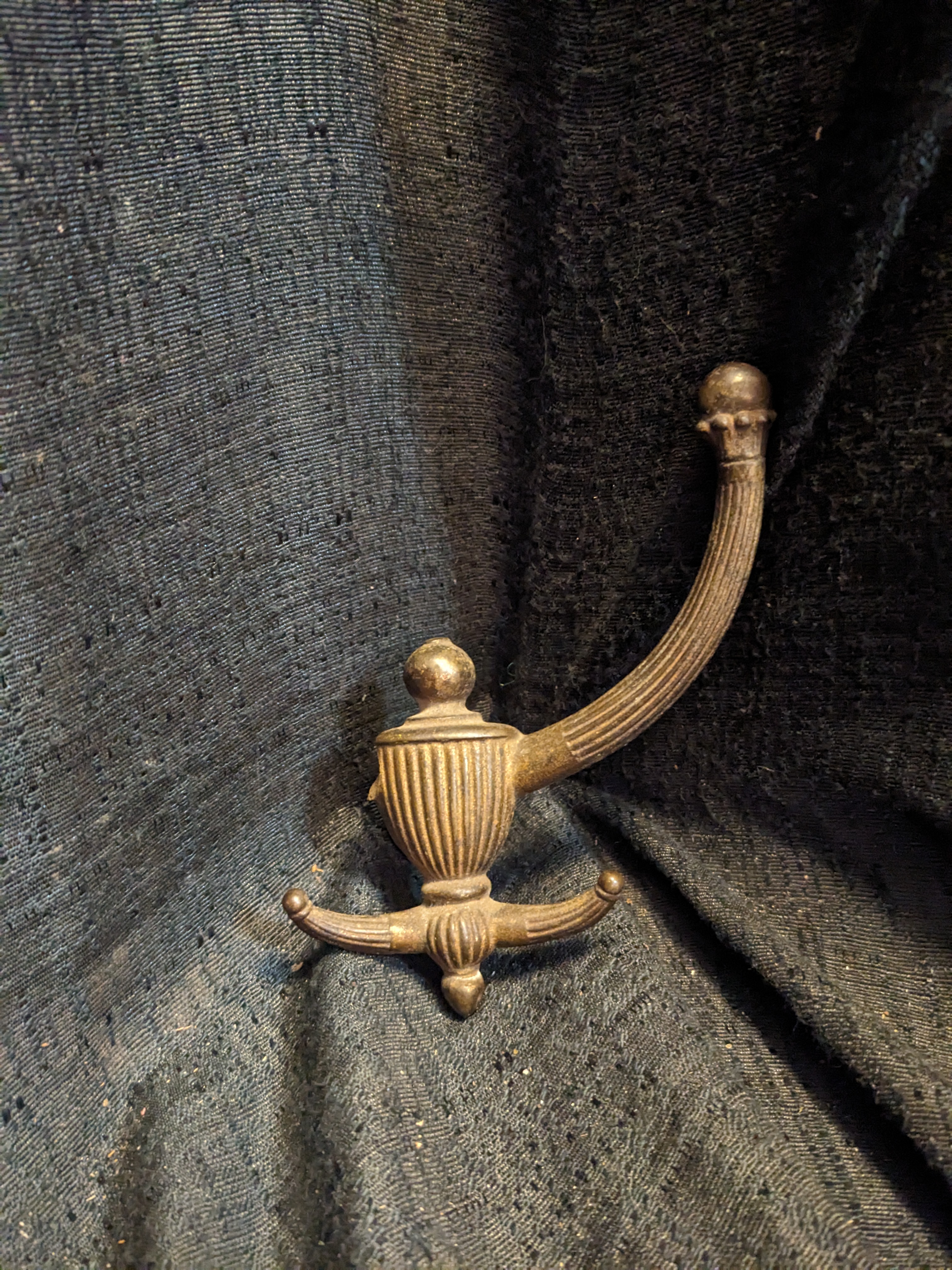 Even with only three arms, this hook has room for all your layers. It is old cast iron with a bit of a shine from a finish that is mostly worn. It is installed by drilling through a door or board, feeding the post through, and securing it with a nut on the back.