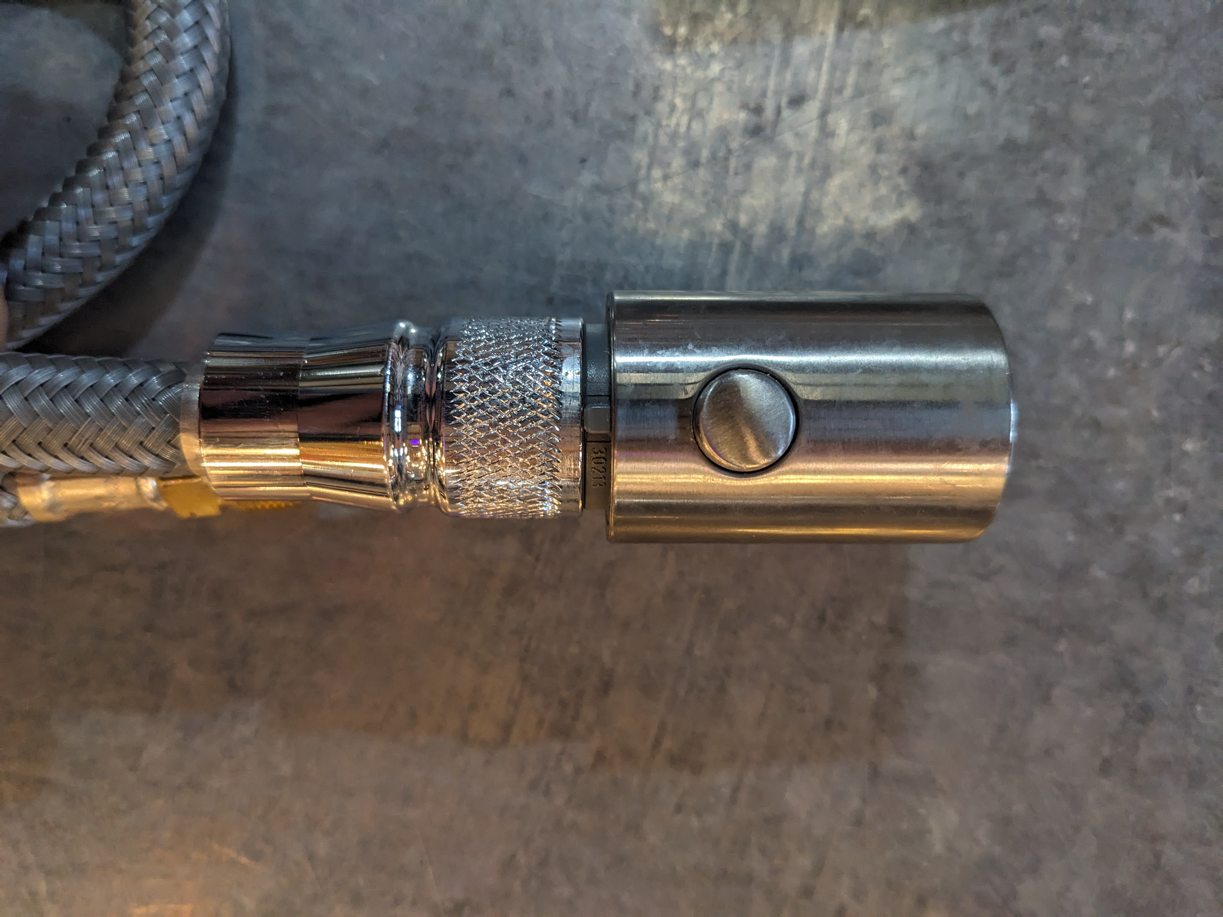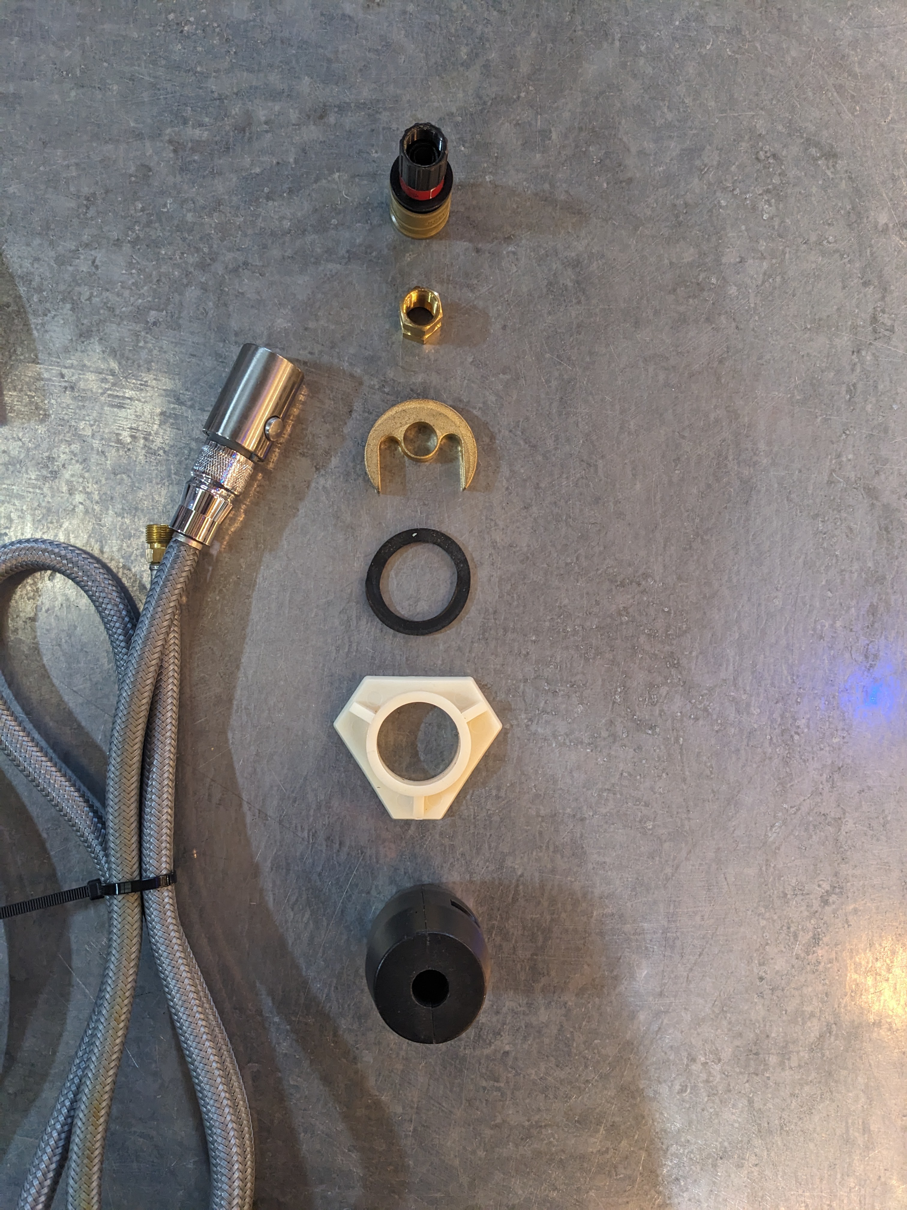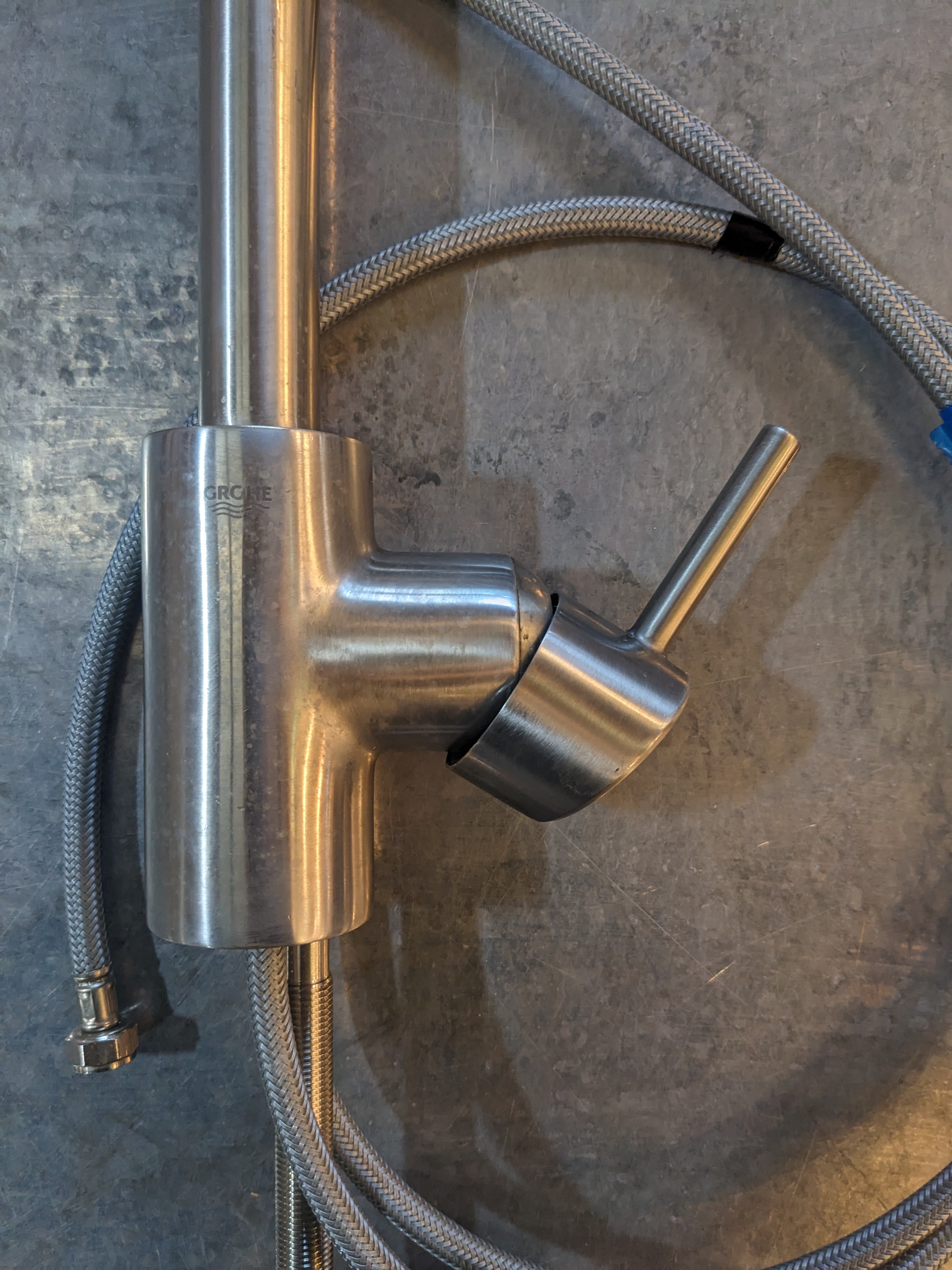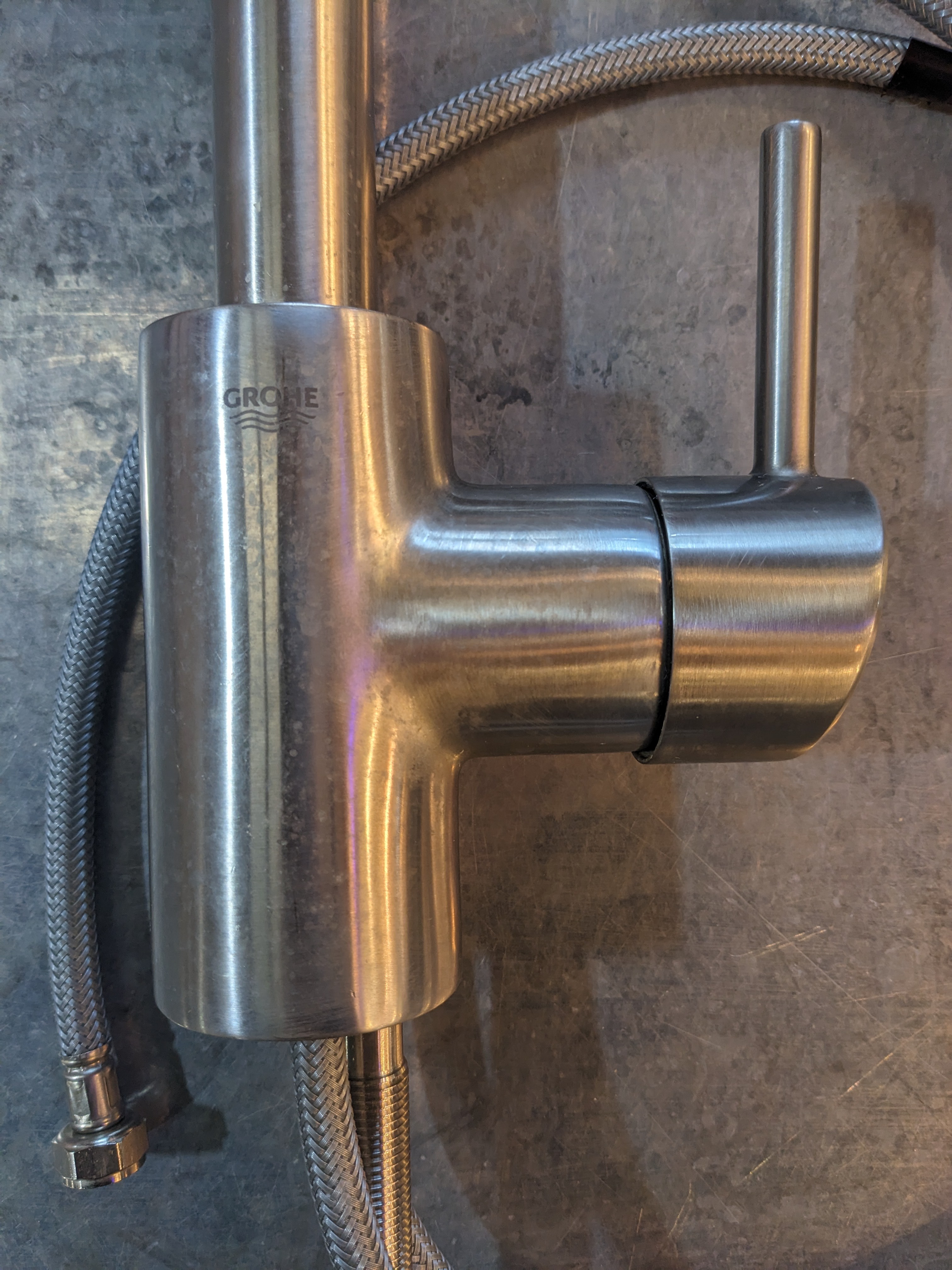 Get your GROHE on with this brushed steel single hole pull down kitchen faucet! Currently the pull down isnt threaded through the faucet, but easily could be. All hardware to install comes included. Used condition with some watermarks and tarnish on the body of the faucet, could be polished for that brand new feel. Dimensions: 2.5 x 15 x 9.5