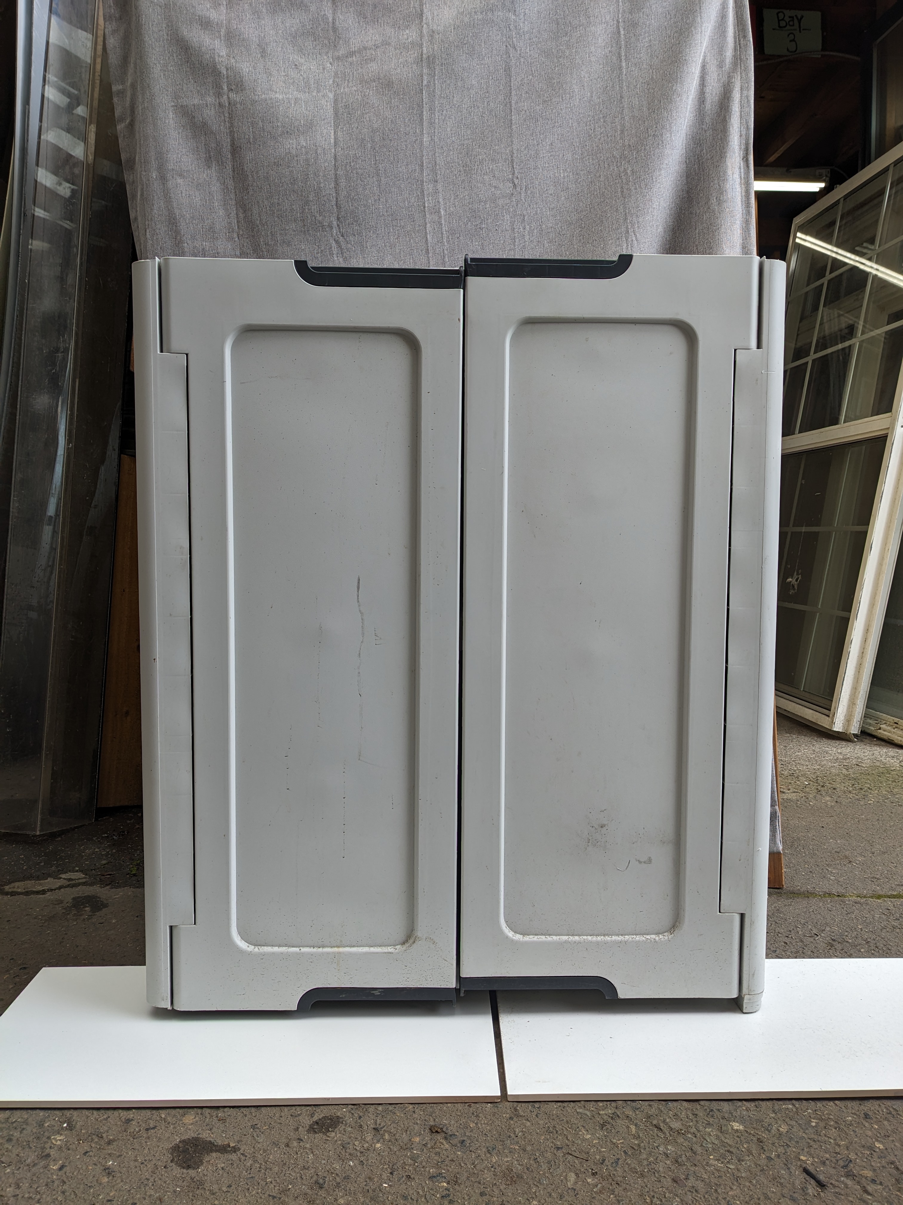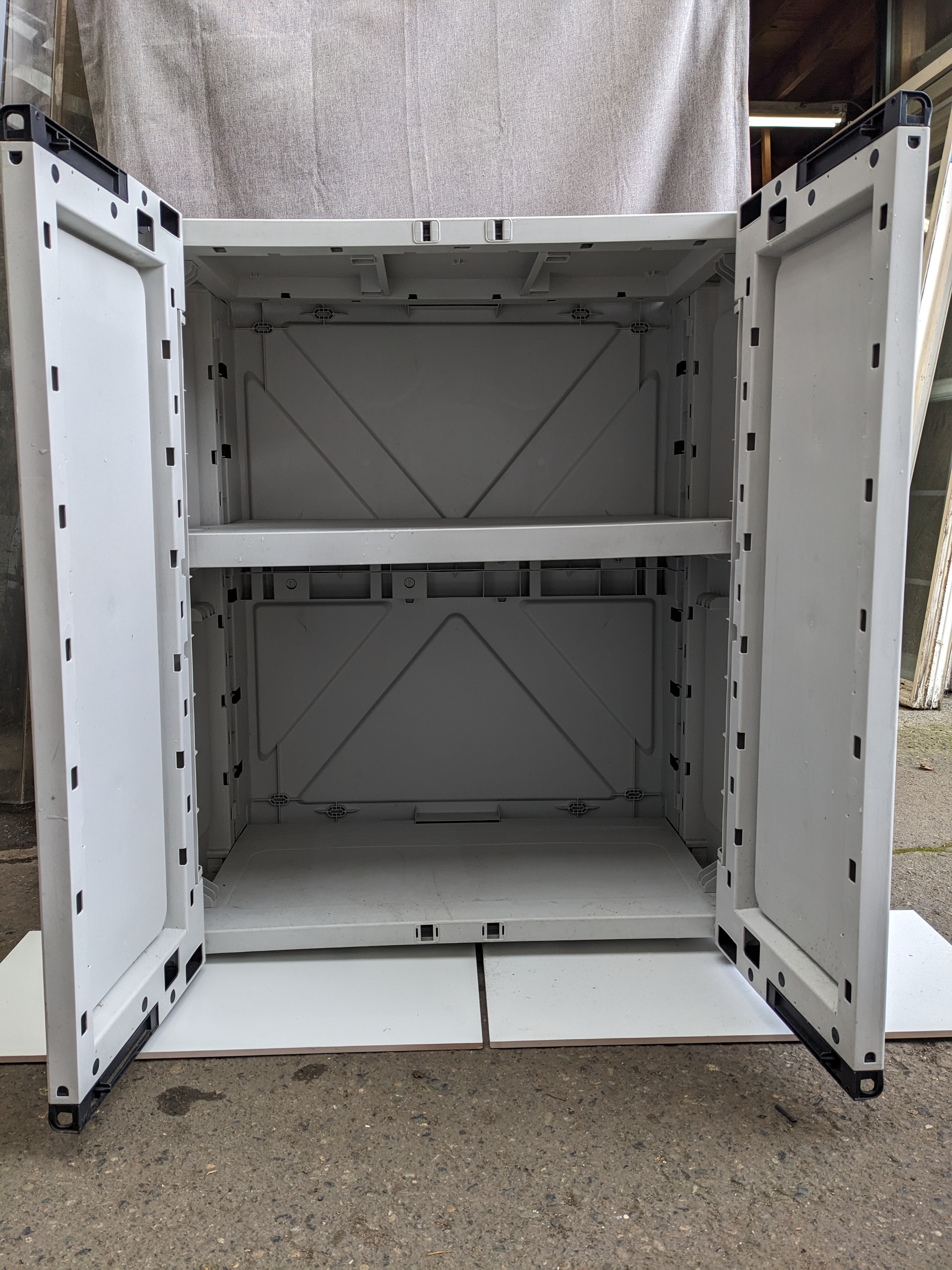 A light gray shop cab, with two doors and two shelves of storage inside. Decent condition, and it should hold up well to time. Resin doesn't decay, or rust!
