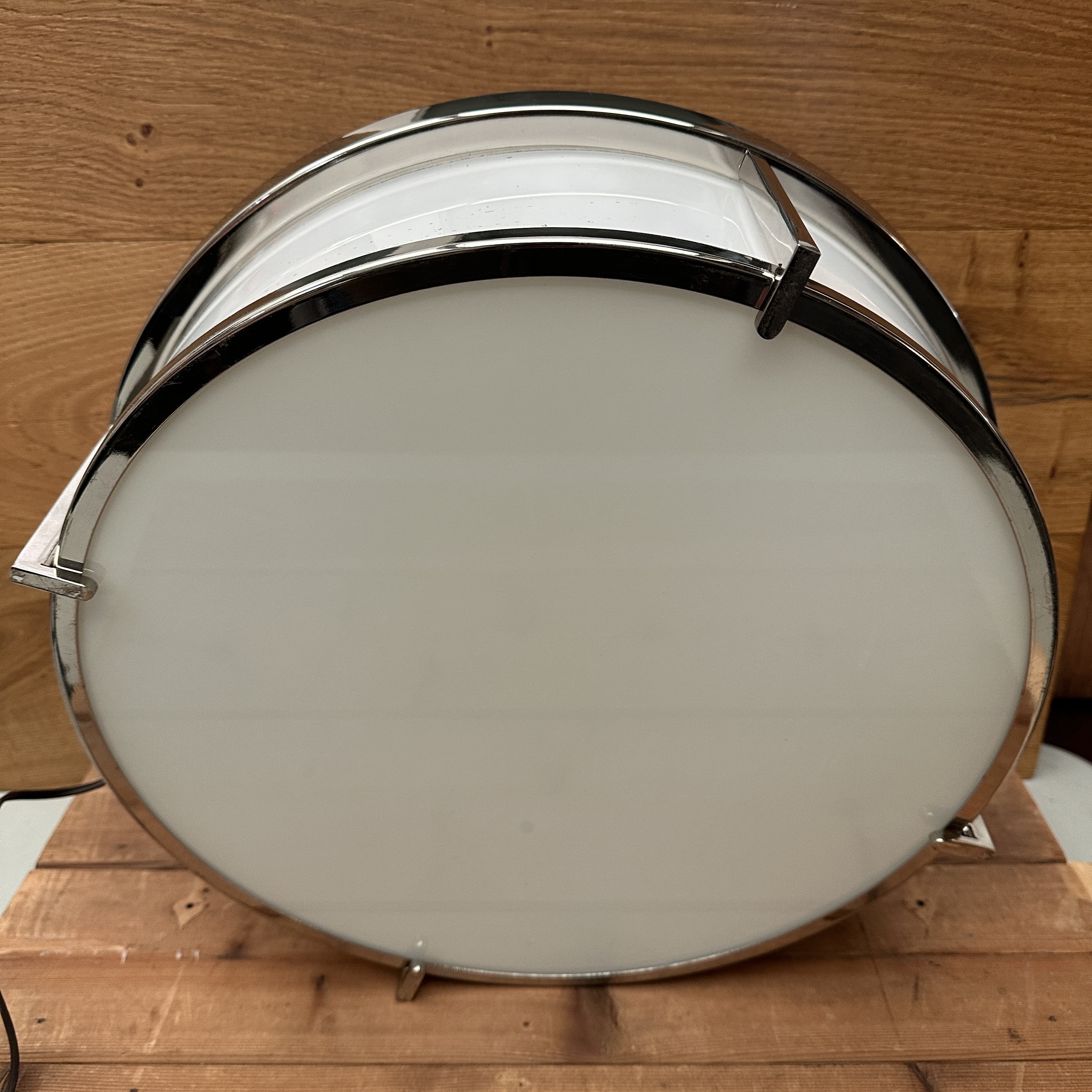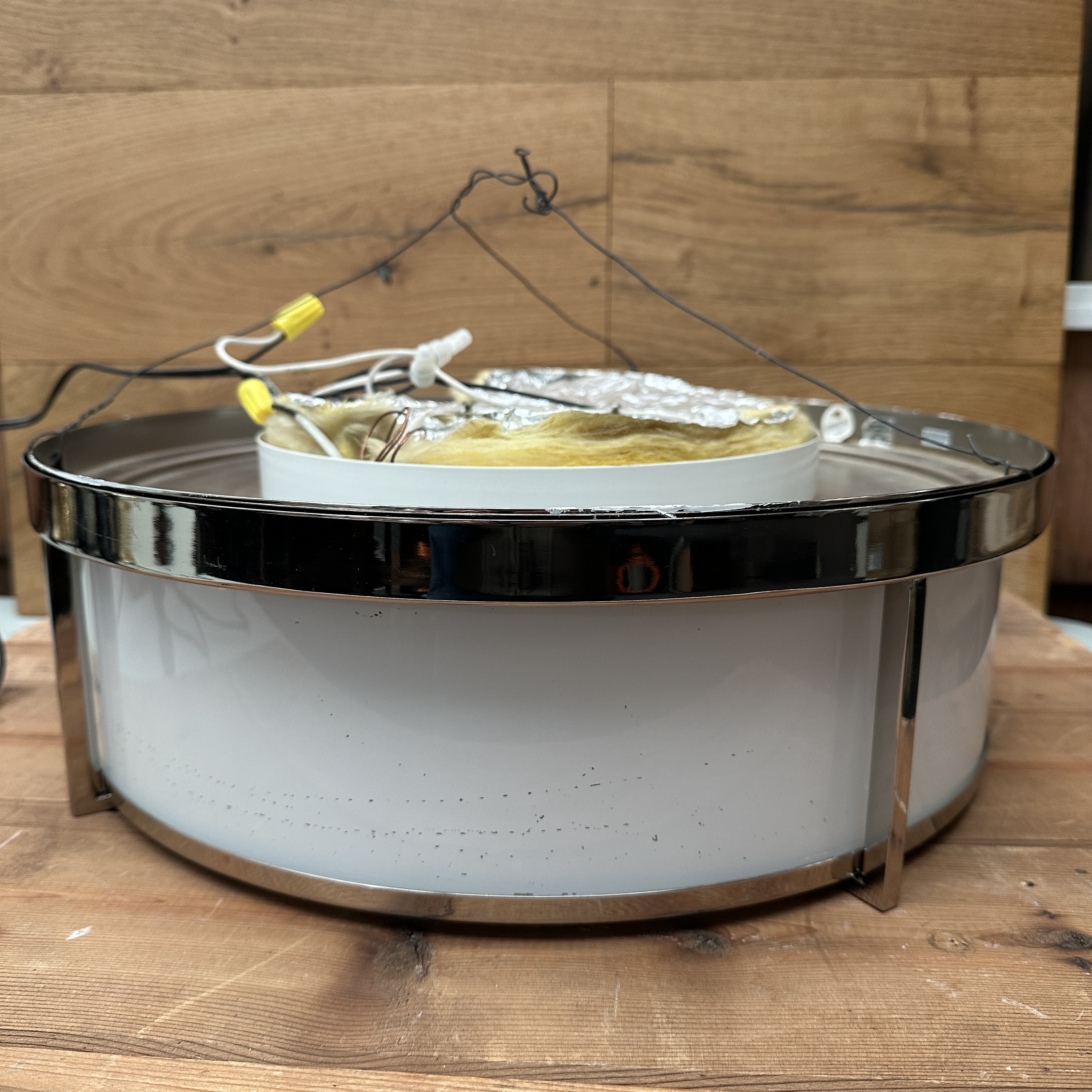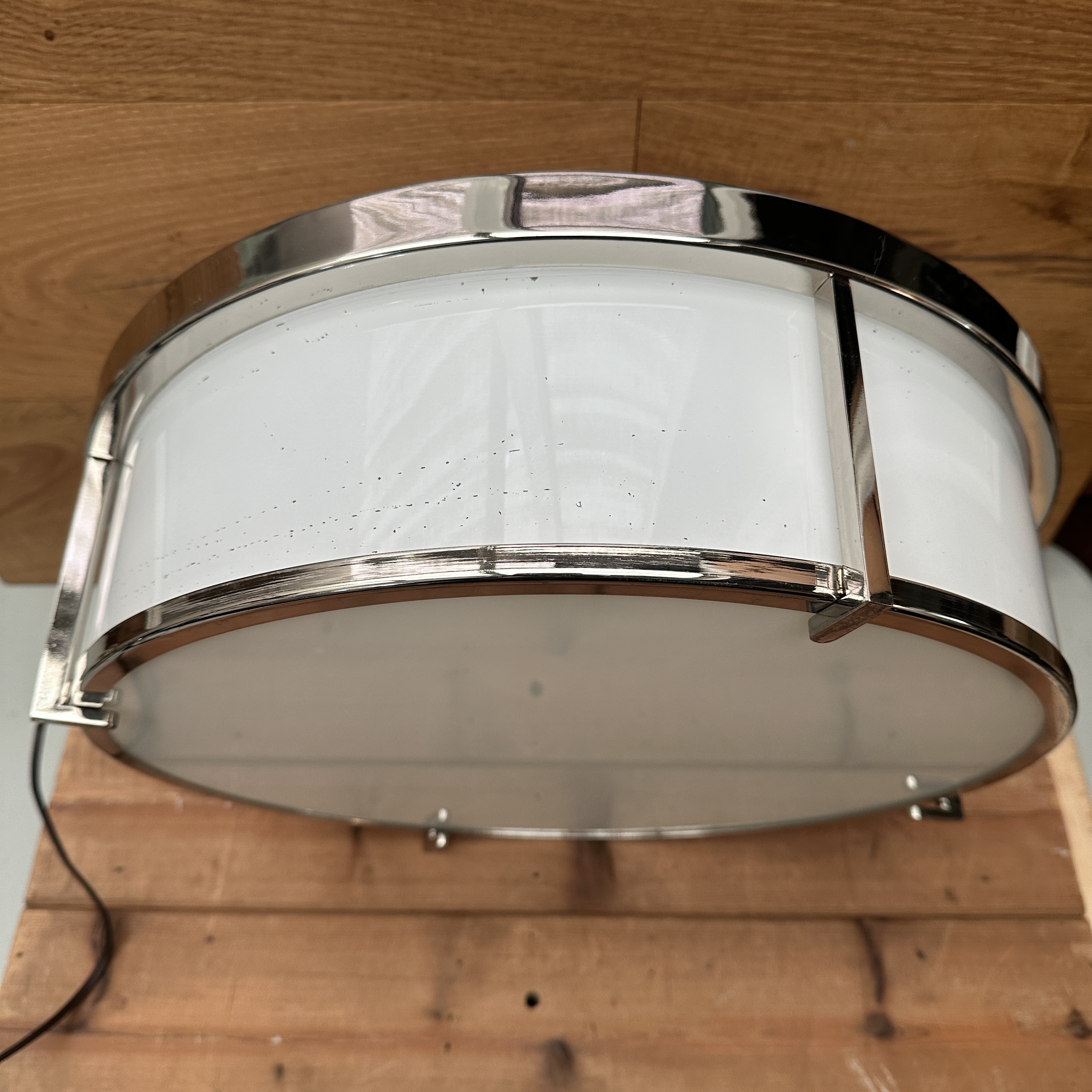 Large Restoration Hardware glass and metal snare drum style flush mount. Cosmetic condition is fair since there are surface scratches on the metal and some of the white has been removed on the inside of the glass.