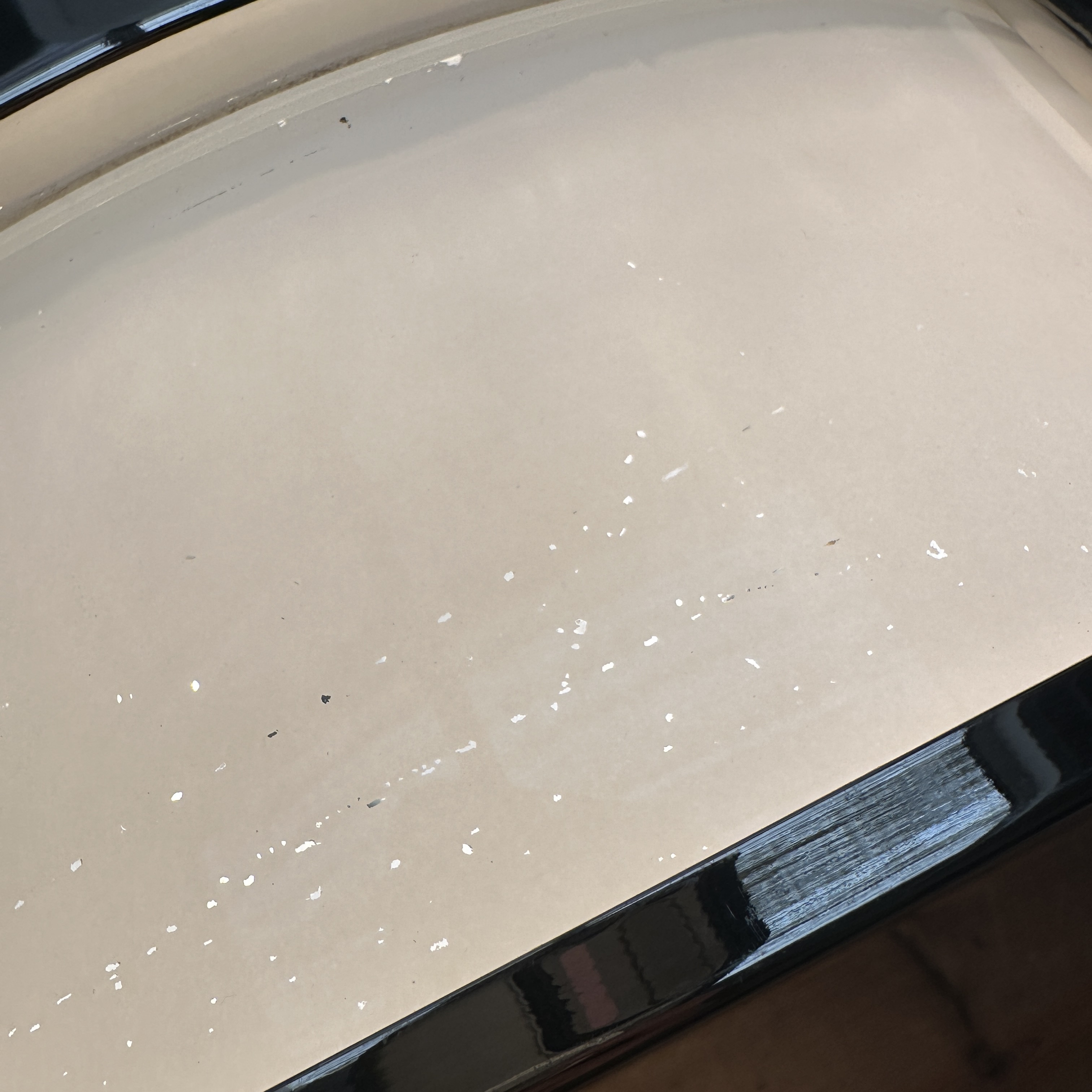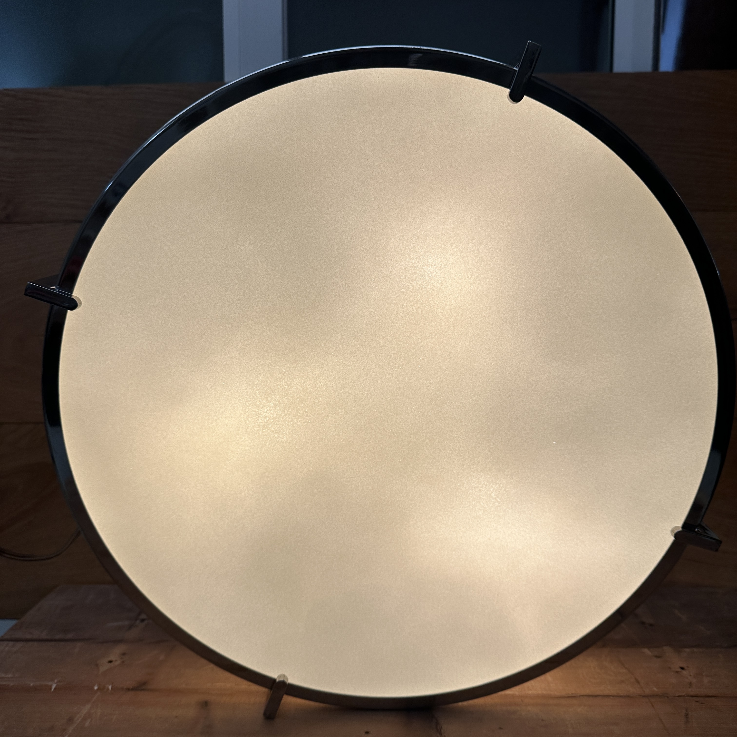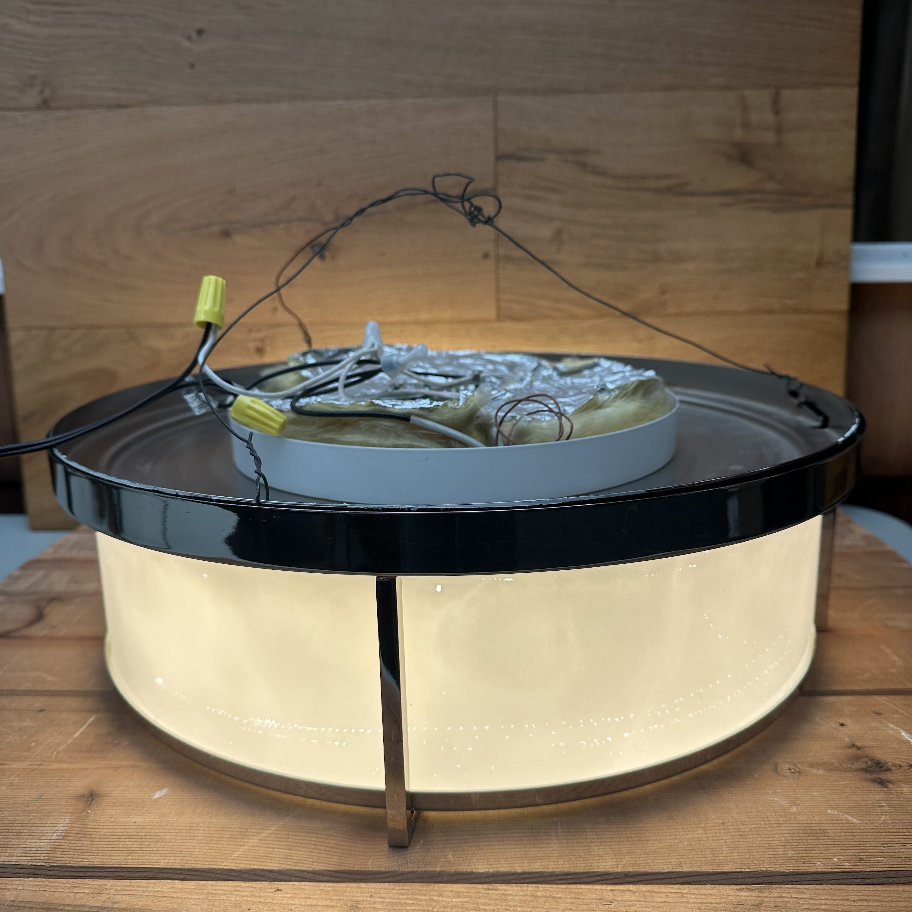 Large Restoration Hardware glass and metal snare drum style flush mount. Cosmetic condition is fair since there are surface scratches on the metal and some of the white has been removed on the inside of the glass.