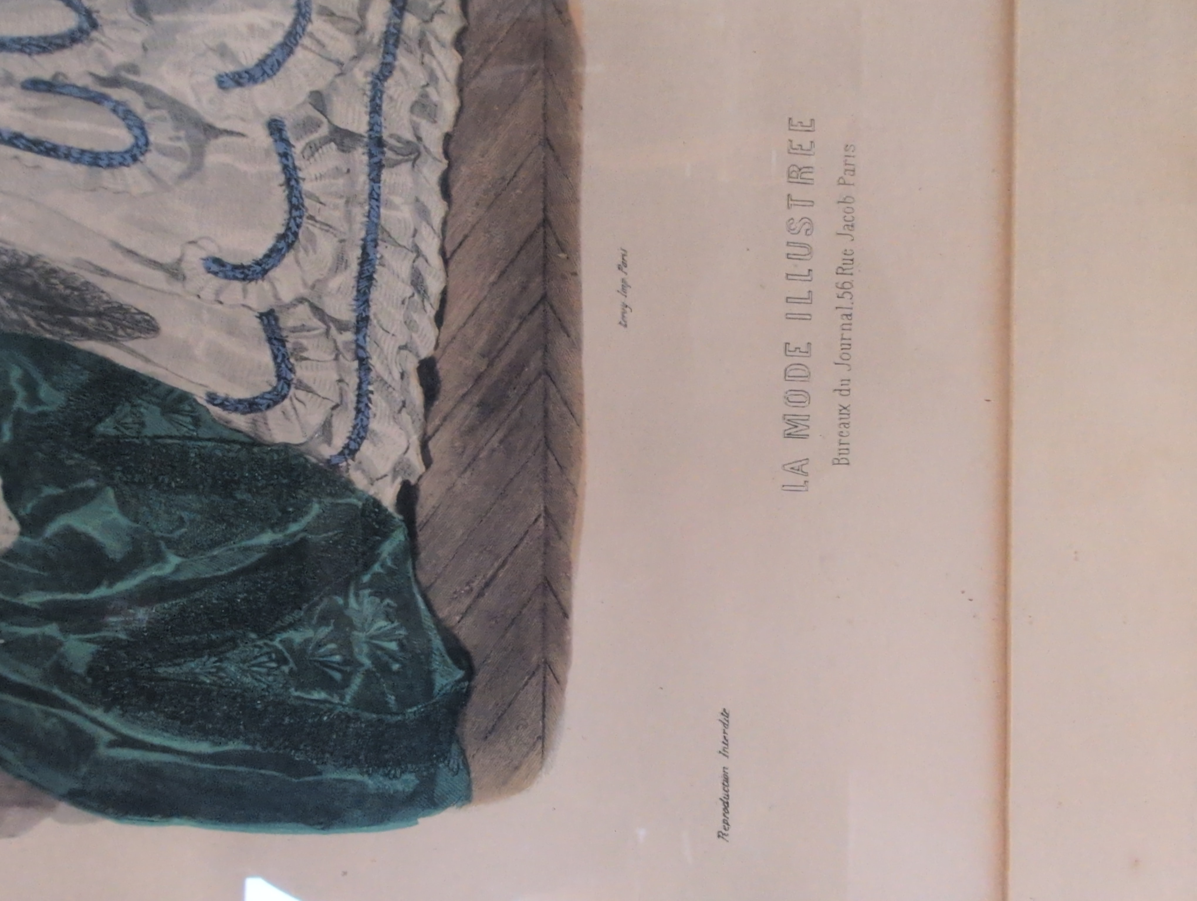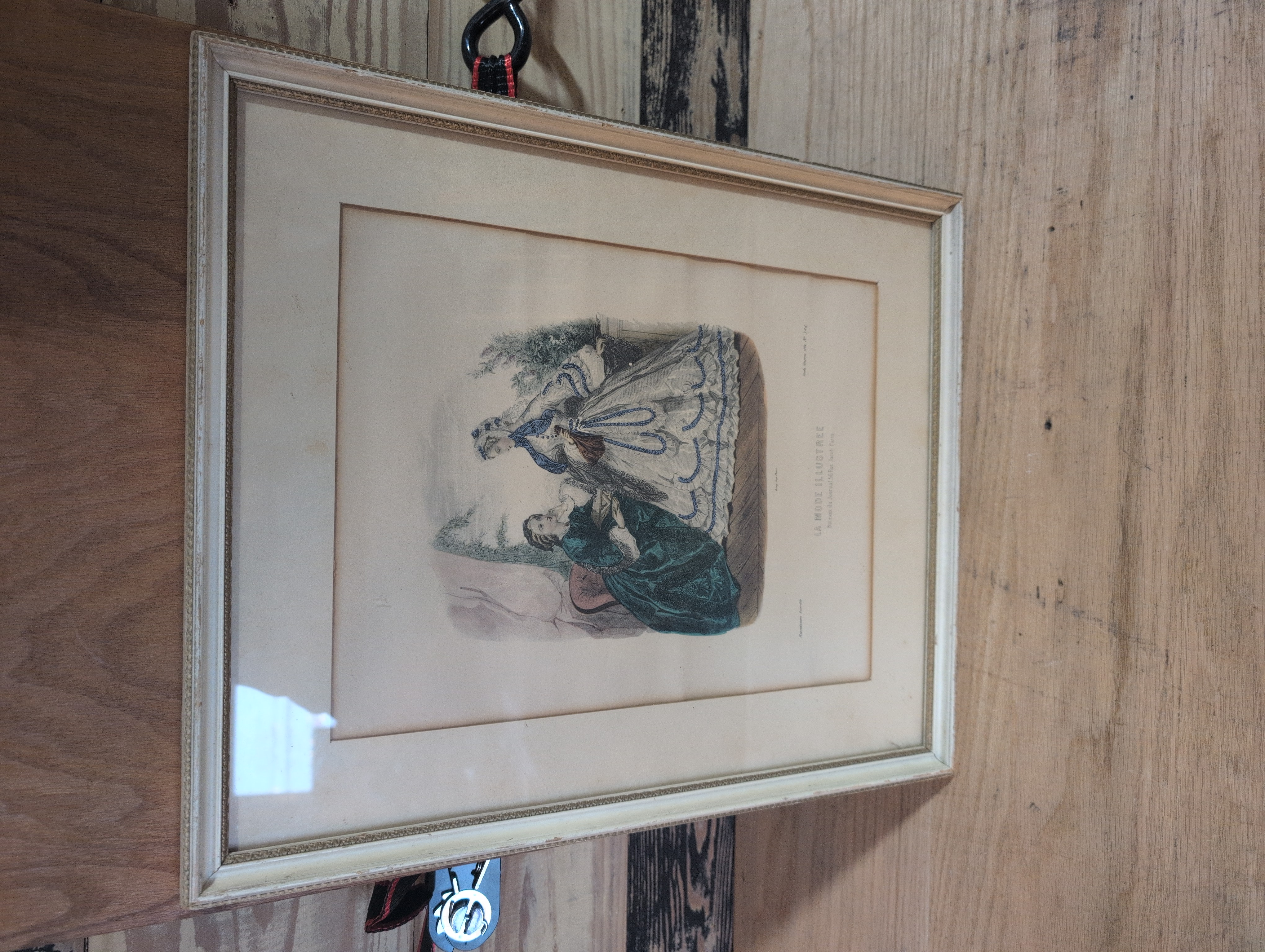 Framed print from La Mode Illustru00e9e, a French fashion magazine published between 1860 and 1937. The original publication date is unclear, although this is almost certainly a reproduction. This print presents two women (likely French) in big beautiful gowns apparently discussing a fascinating secret. Frame is a good quality but a bit scratched up. Has a mounting wire. 18.25 in. tall by 15 in. wide.