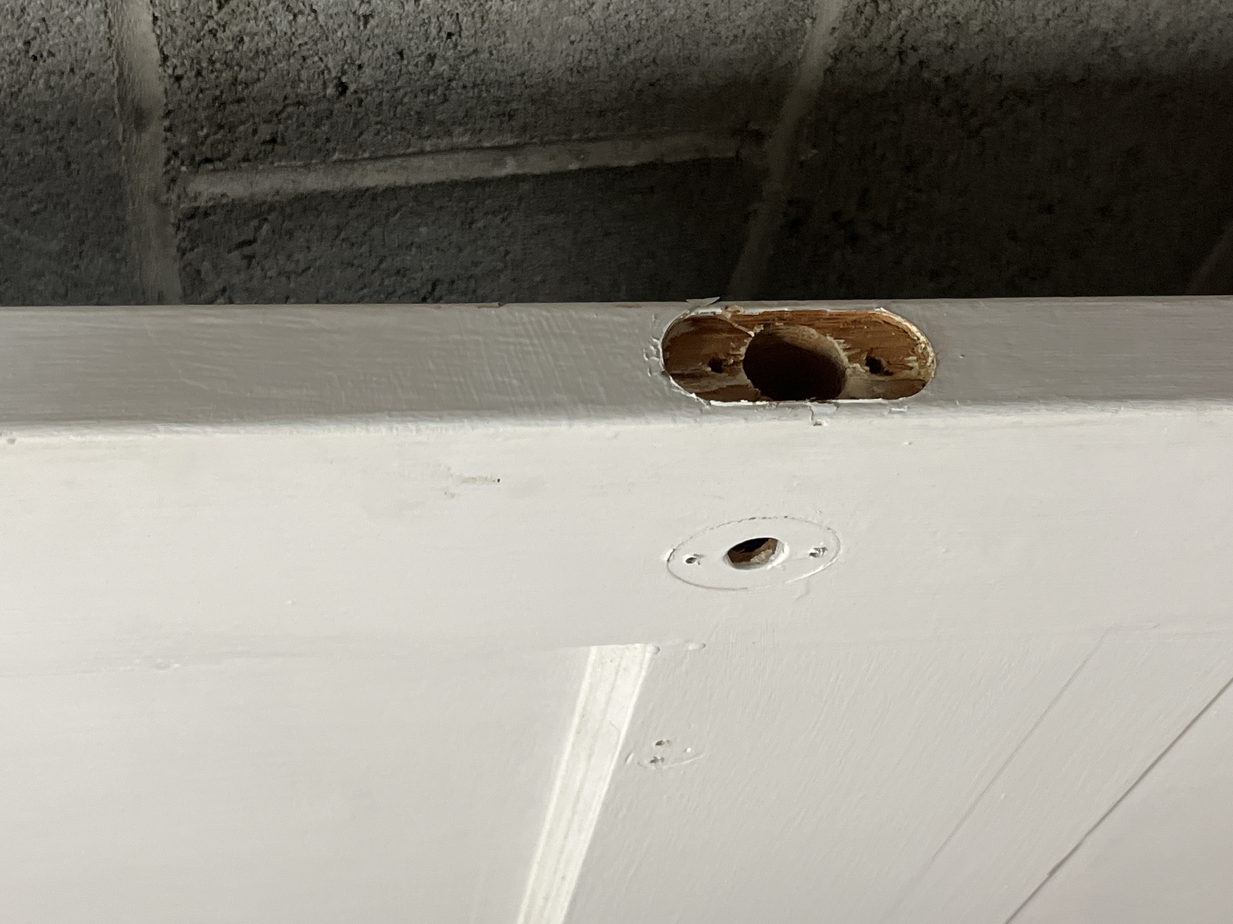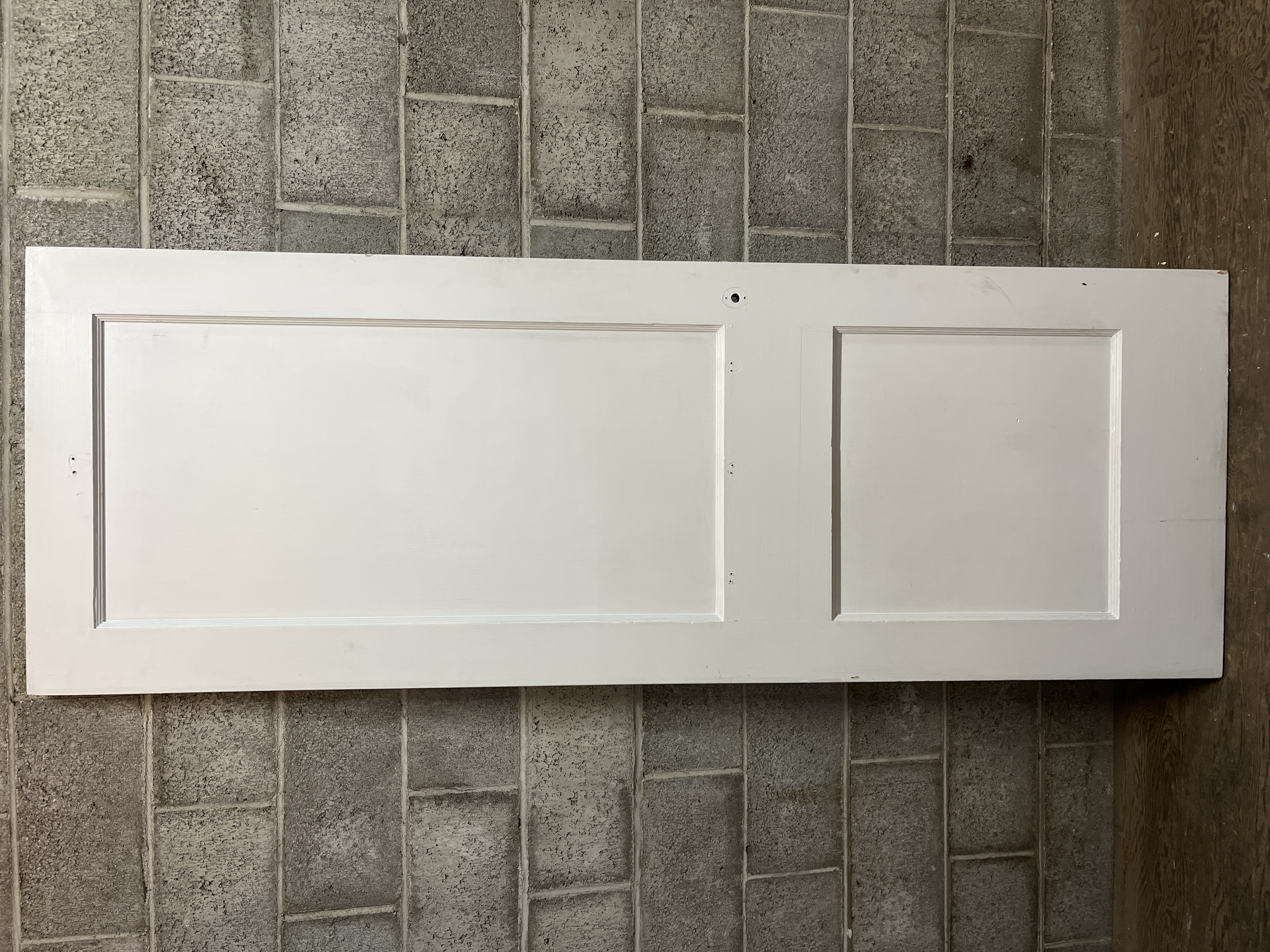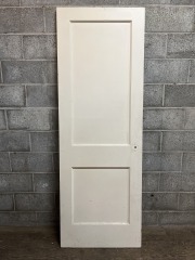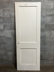 A vintage 2 panel door painted white on white, left hand swing, drilled for a modern style knob set. Measures 28 x 78.75 x 1.25 inches.