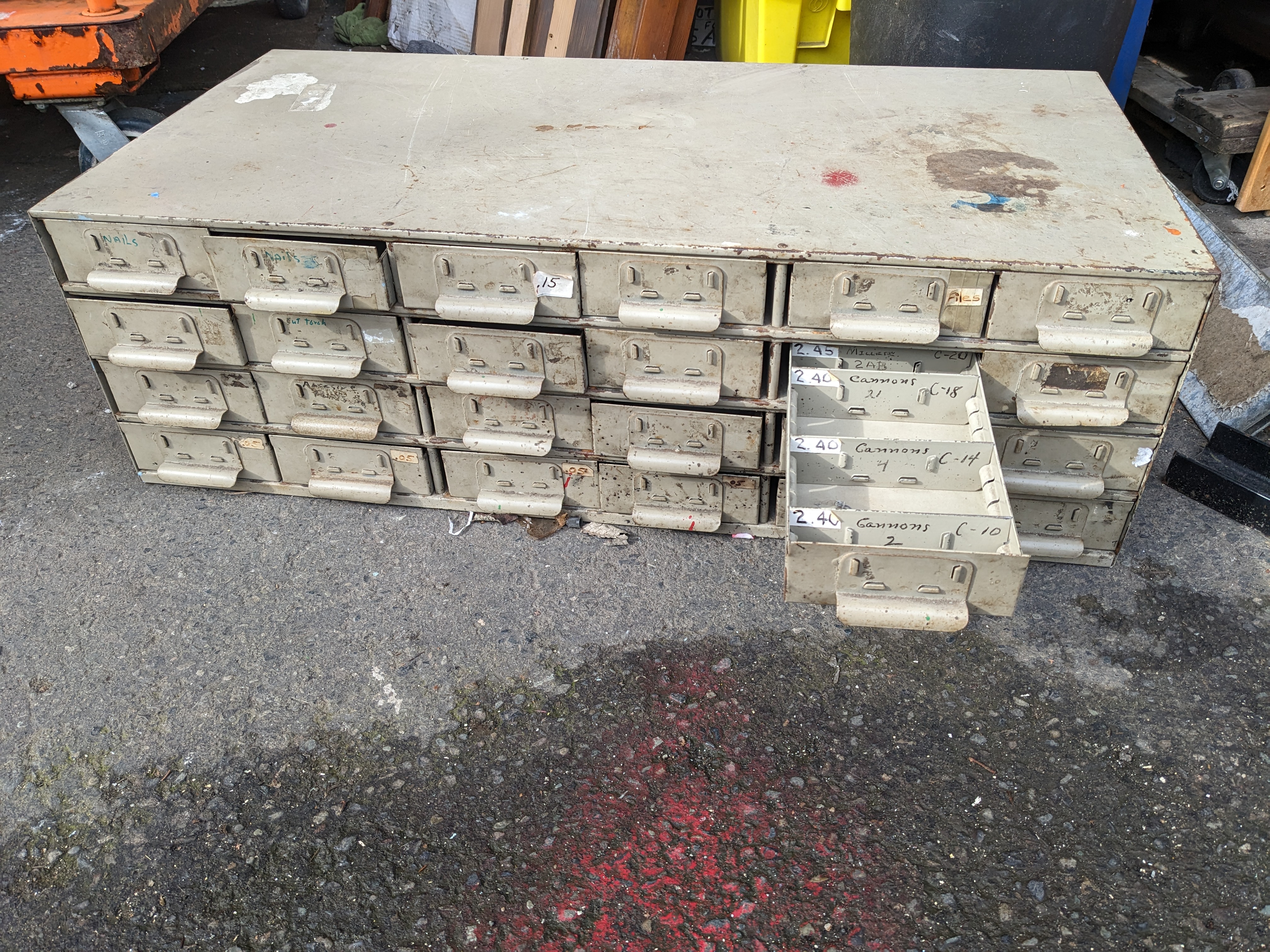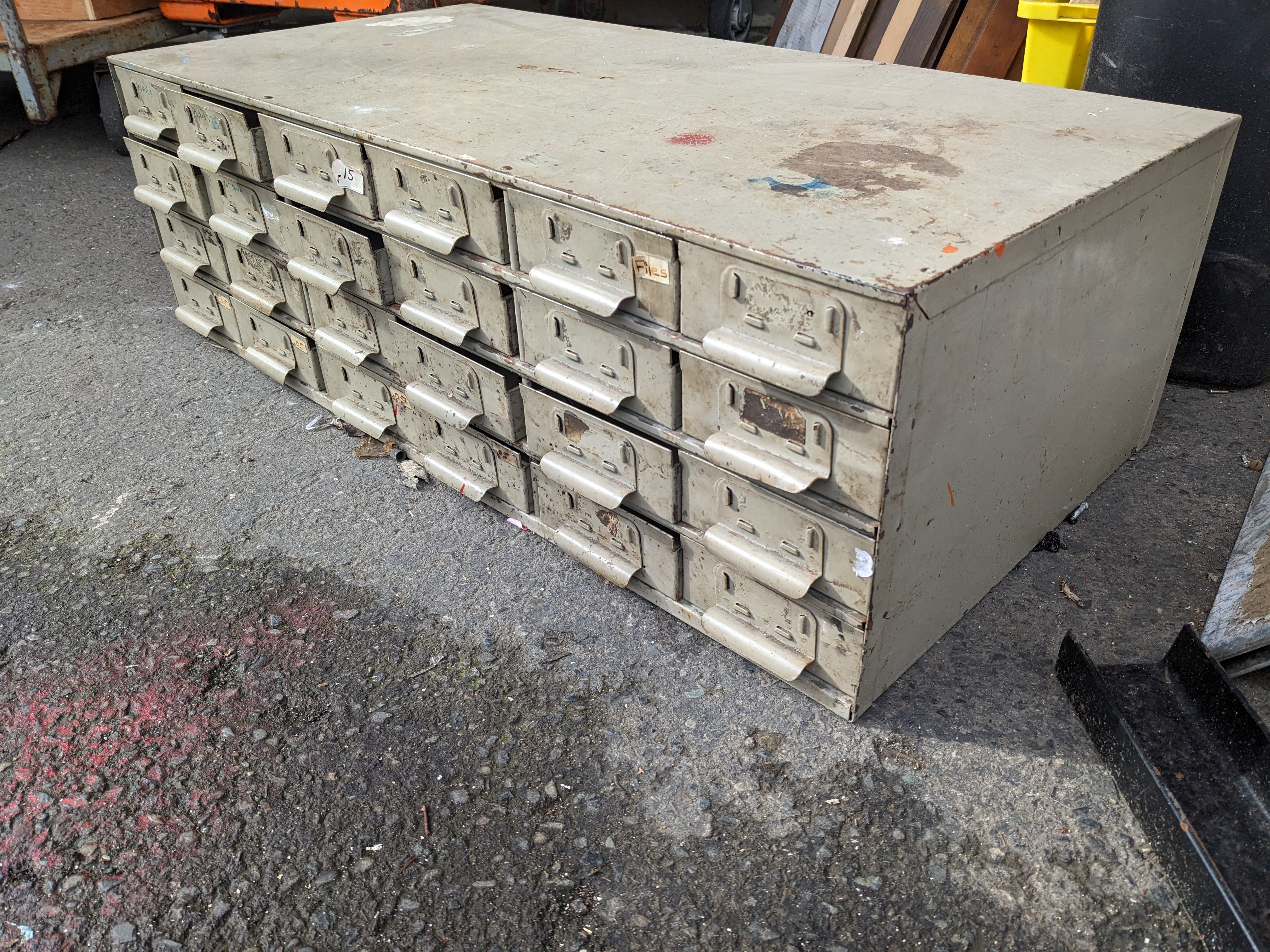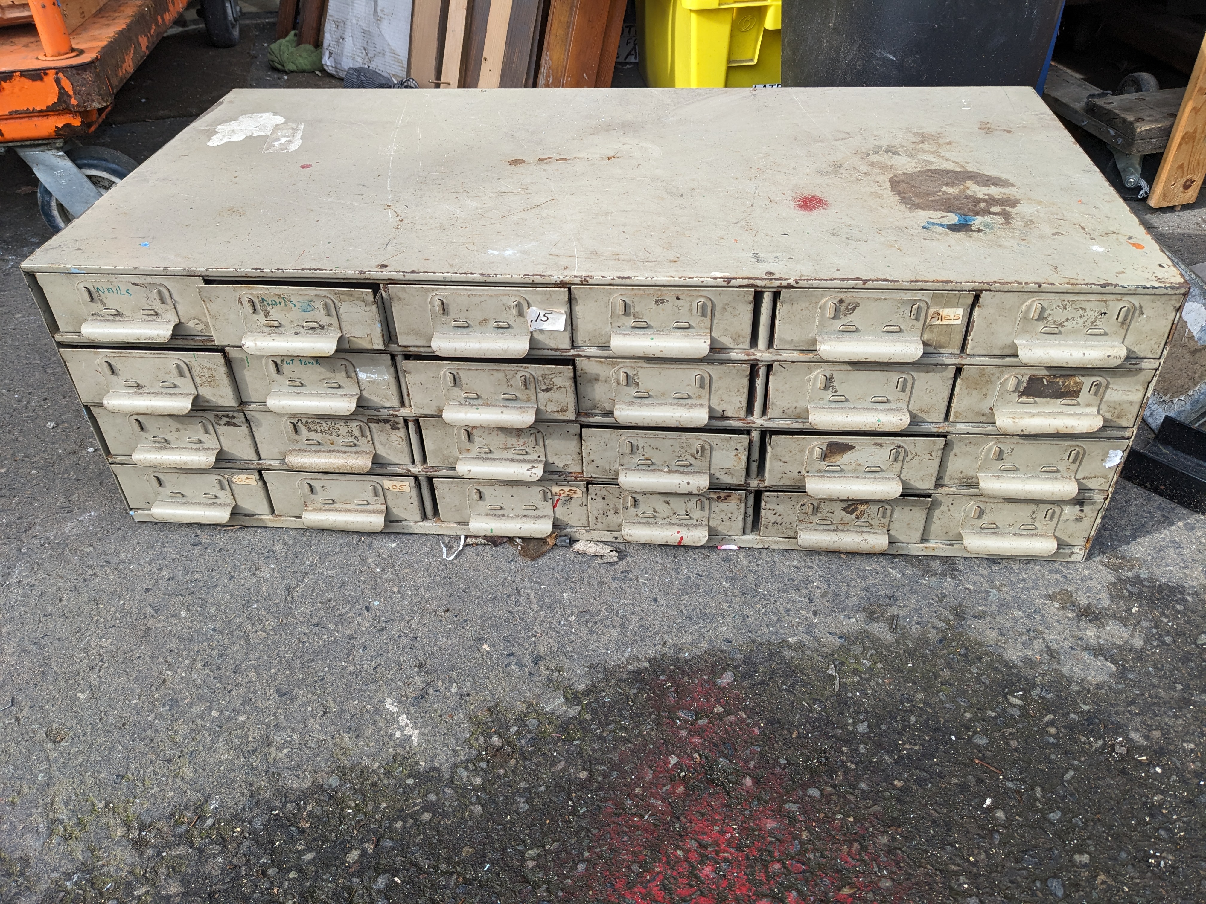 Very sturdy and well made metal organizer. Perfect for storing smaller odds and ends . The paint is a bit worn down from use but that simply adds to the character of this item.