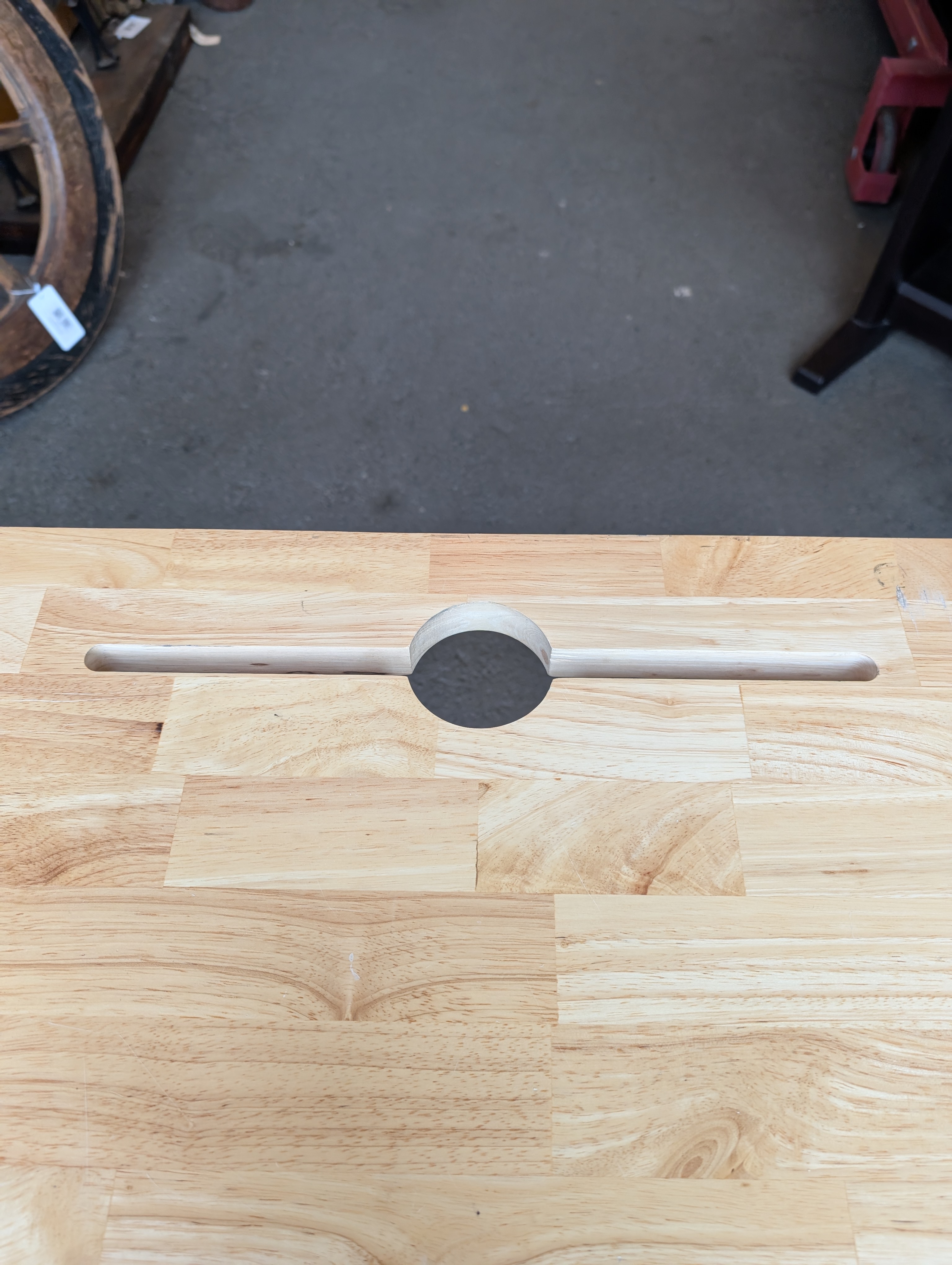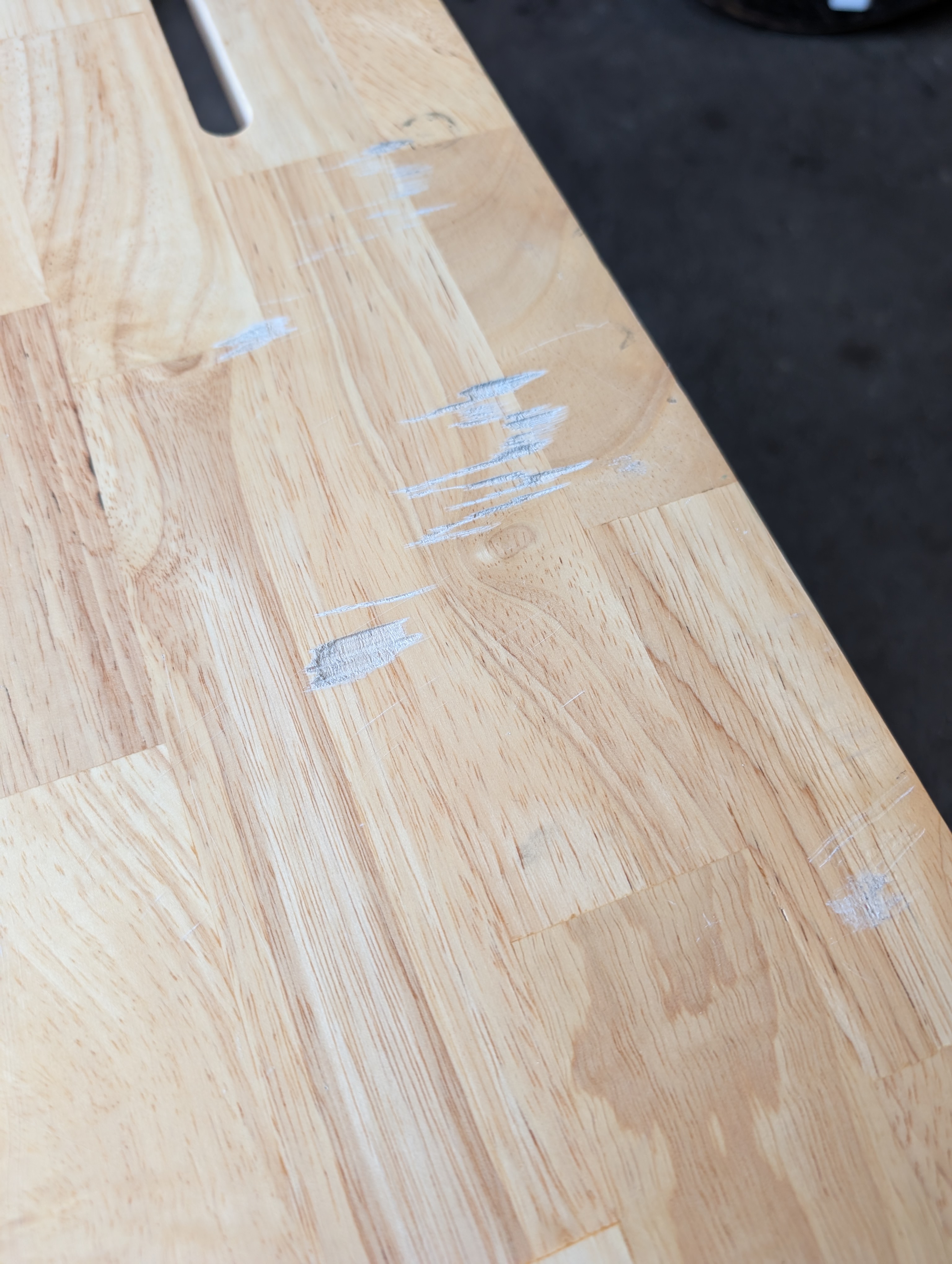 Utilitarian desk with nice butcher block top and metal tube legs. Desktop has a cutout for ease of cord management. Simple and sturdy, the block does have some scratches but those could be addressed easily.