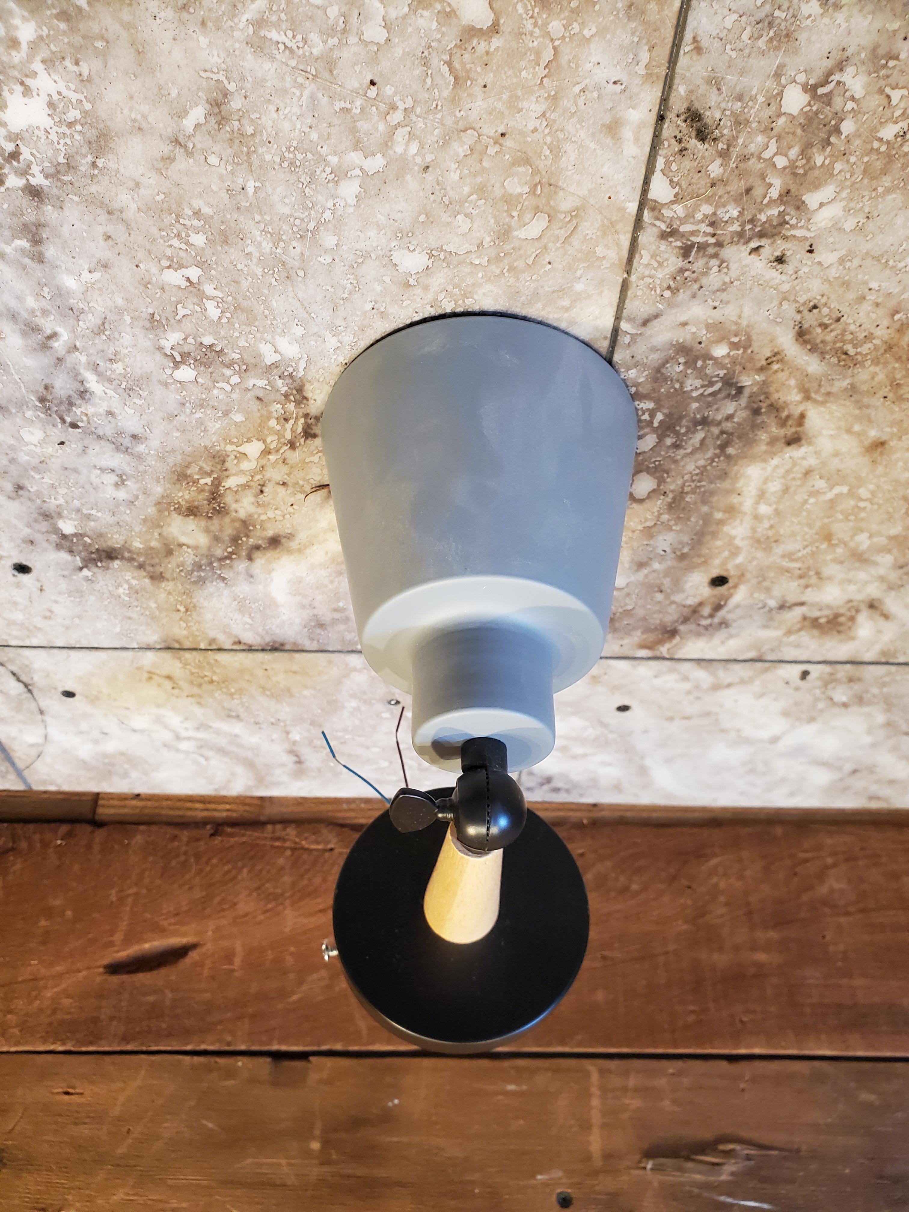 This medium gray matte wall sconce is in great condition. It would look fantastic in an office area. It is made out of wood and steel.
