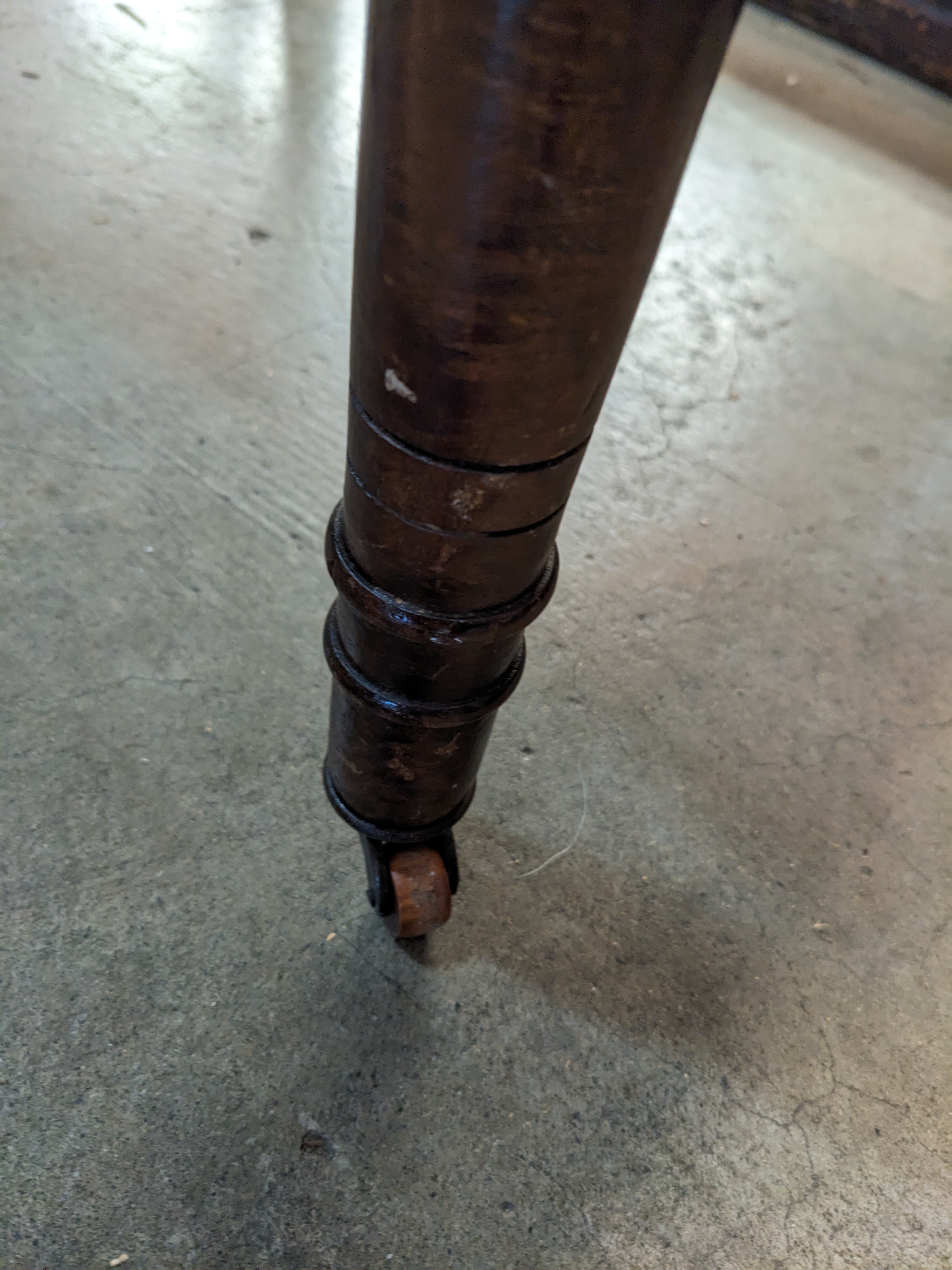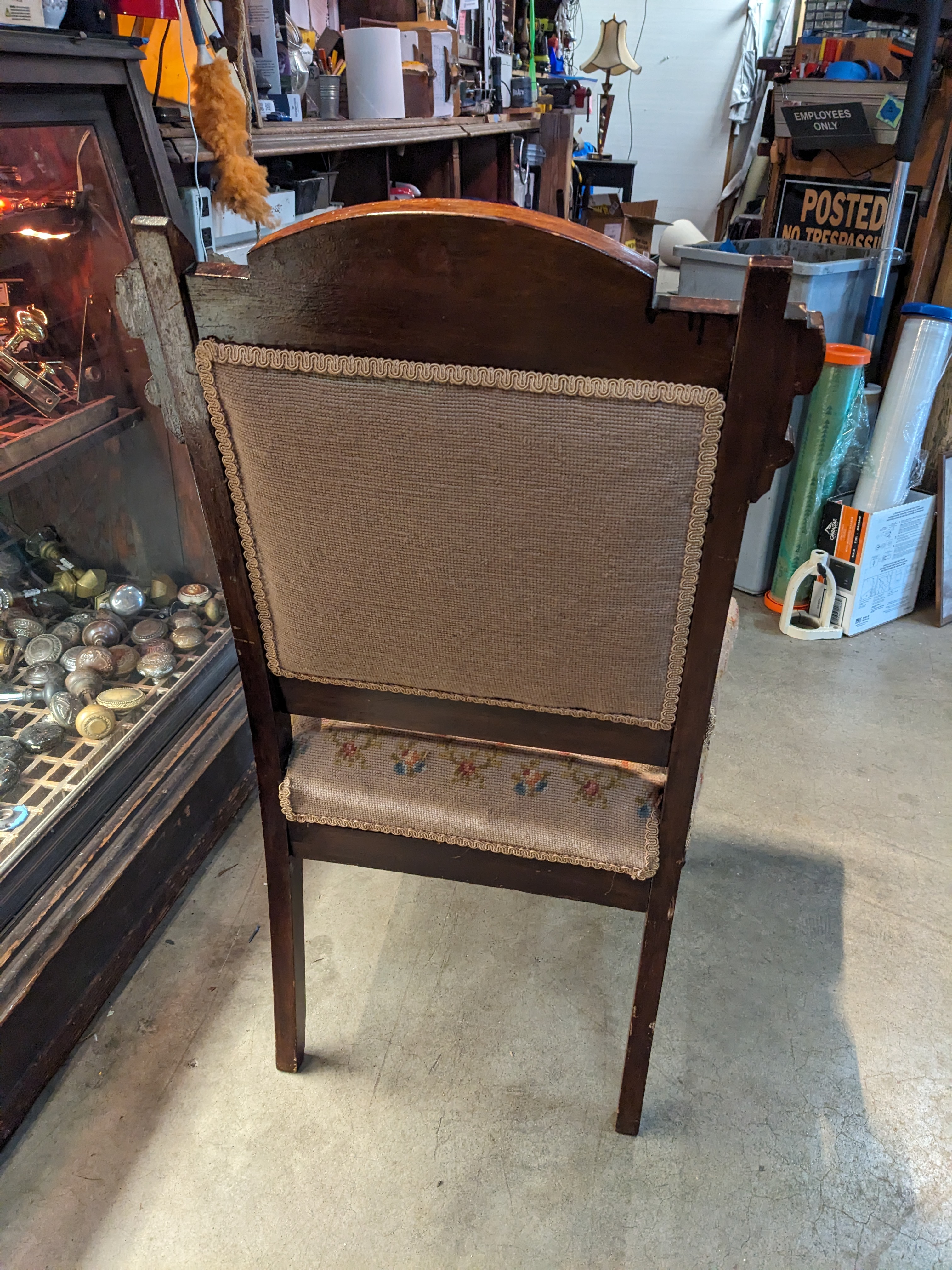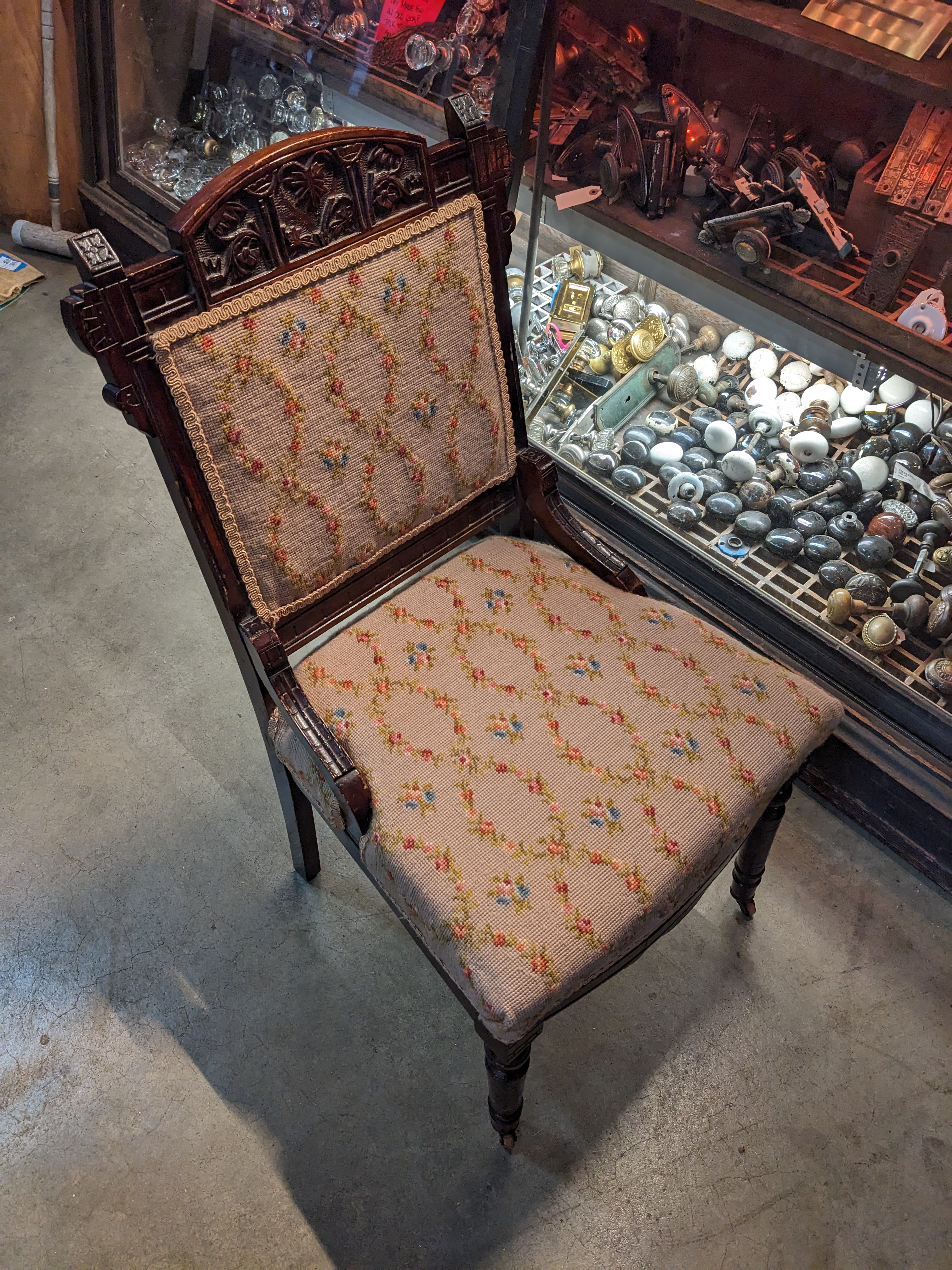 This gorgeous chair is in good condition and features and ornate carved wooden frame with a fabric needle point felted backing and cushion. It measures 19 x 36 x 17.5. The front two legs have castors.