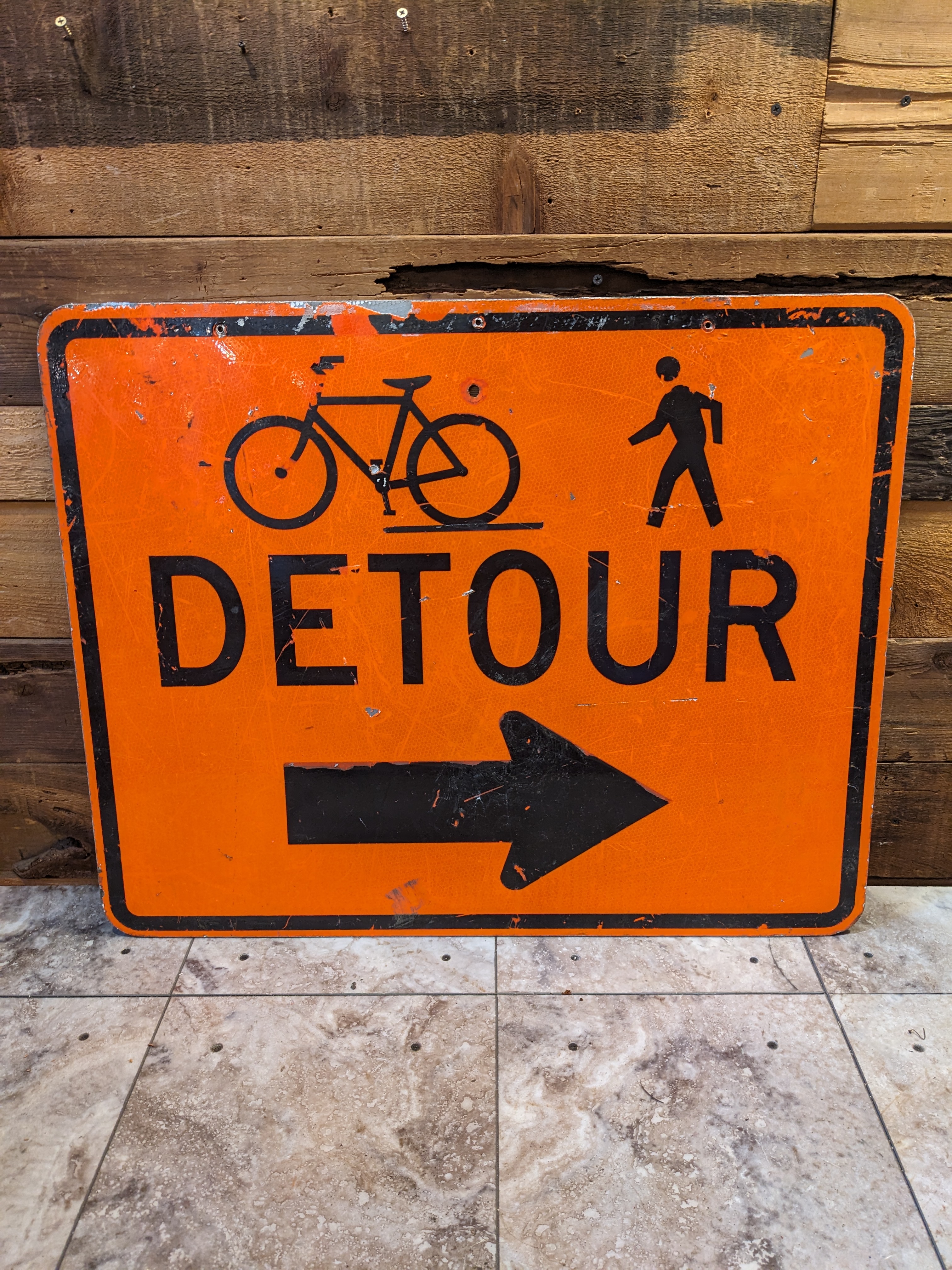A big bright orange metal sign showing a detour for pedestrians and bicycles.