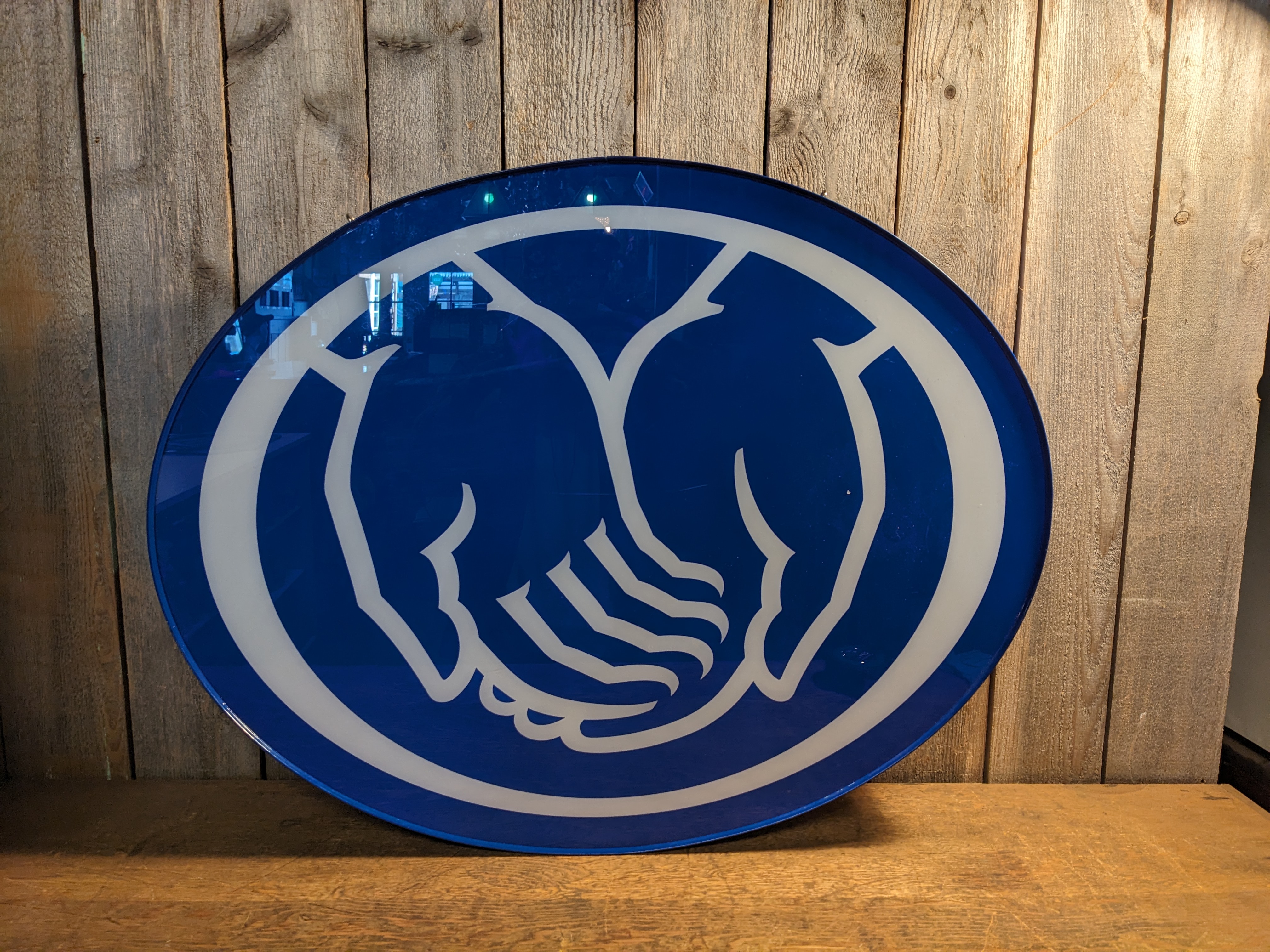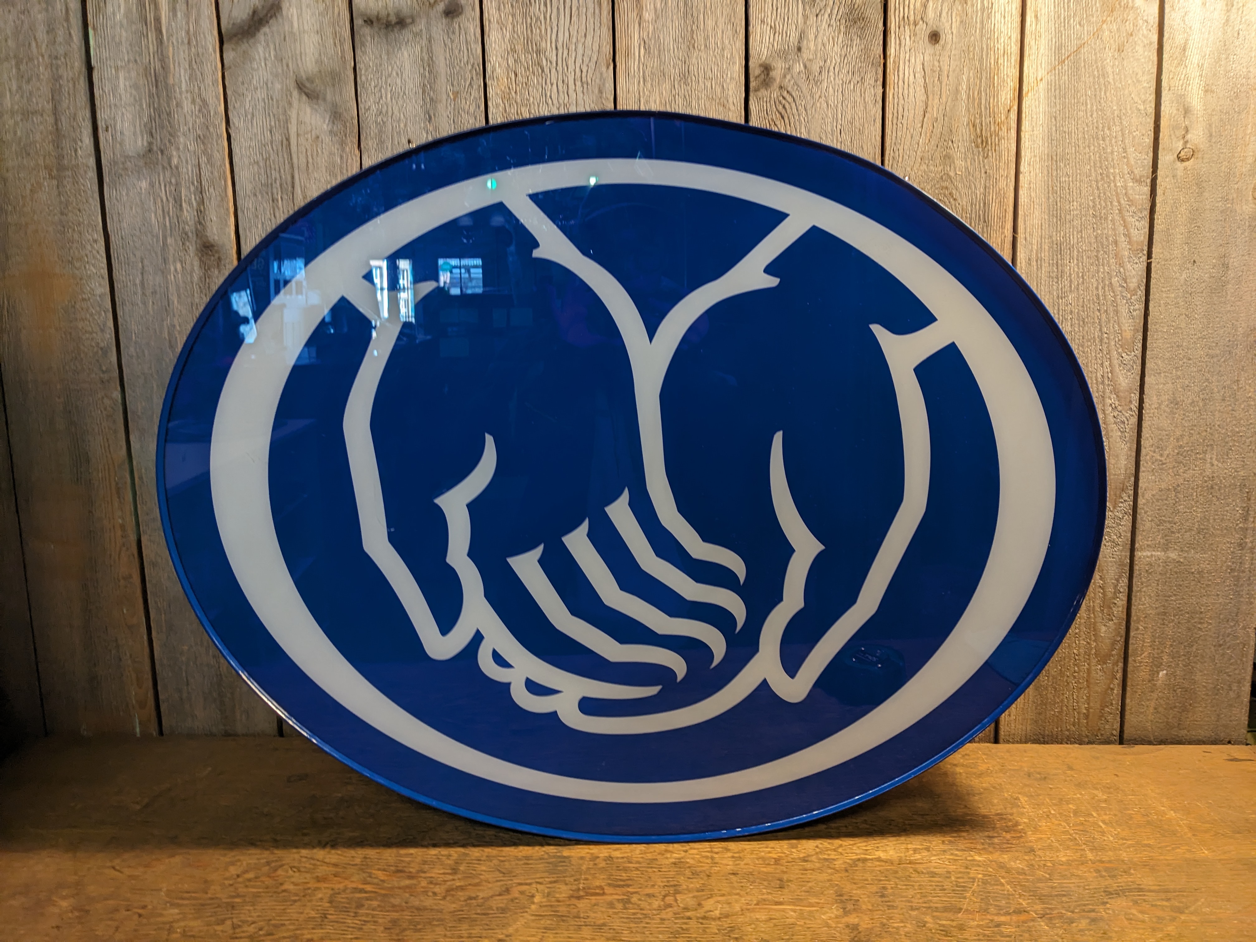 A blue light up sign depicting a pair of hands. There's no brand name or words on this sign. It's in good condition with just bit of wear, and some small scratches. It's untested, and may need a new bulb. It measures 30 x 23.5 x 4.5 inches.