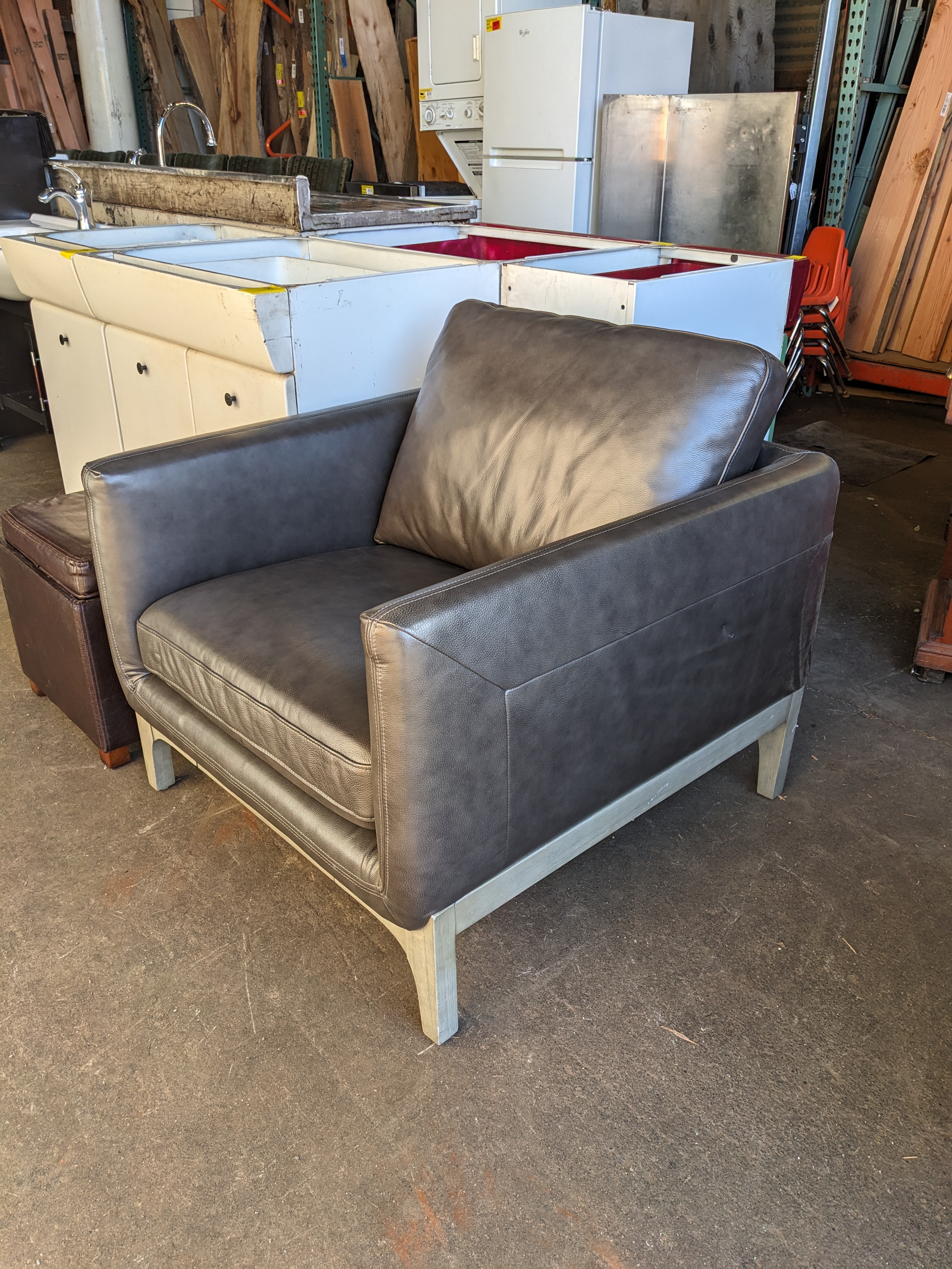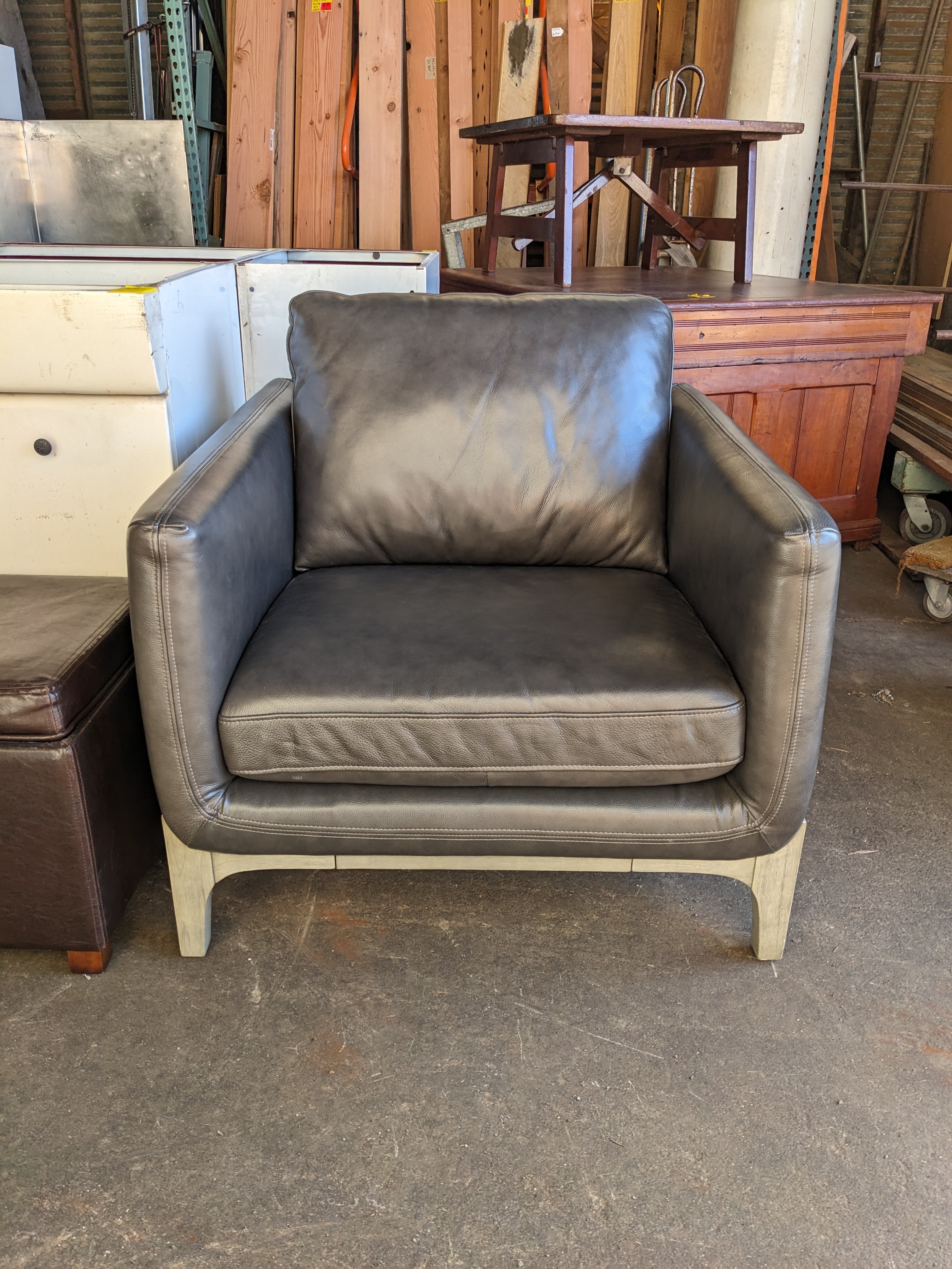 A modern arm chair made from composite leather. It's in good condition with almost no wear. It measures 33 x 34 x 36.5 inches.