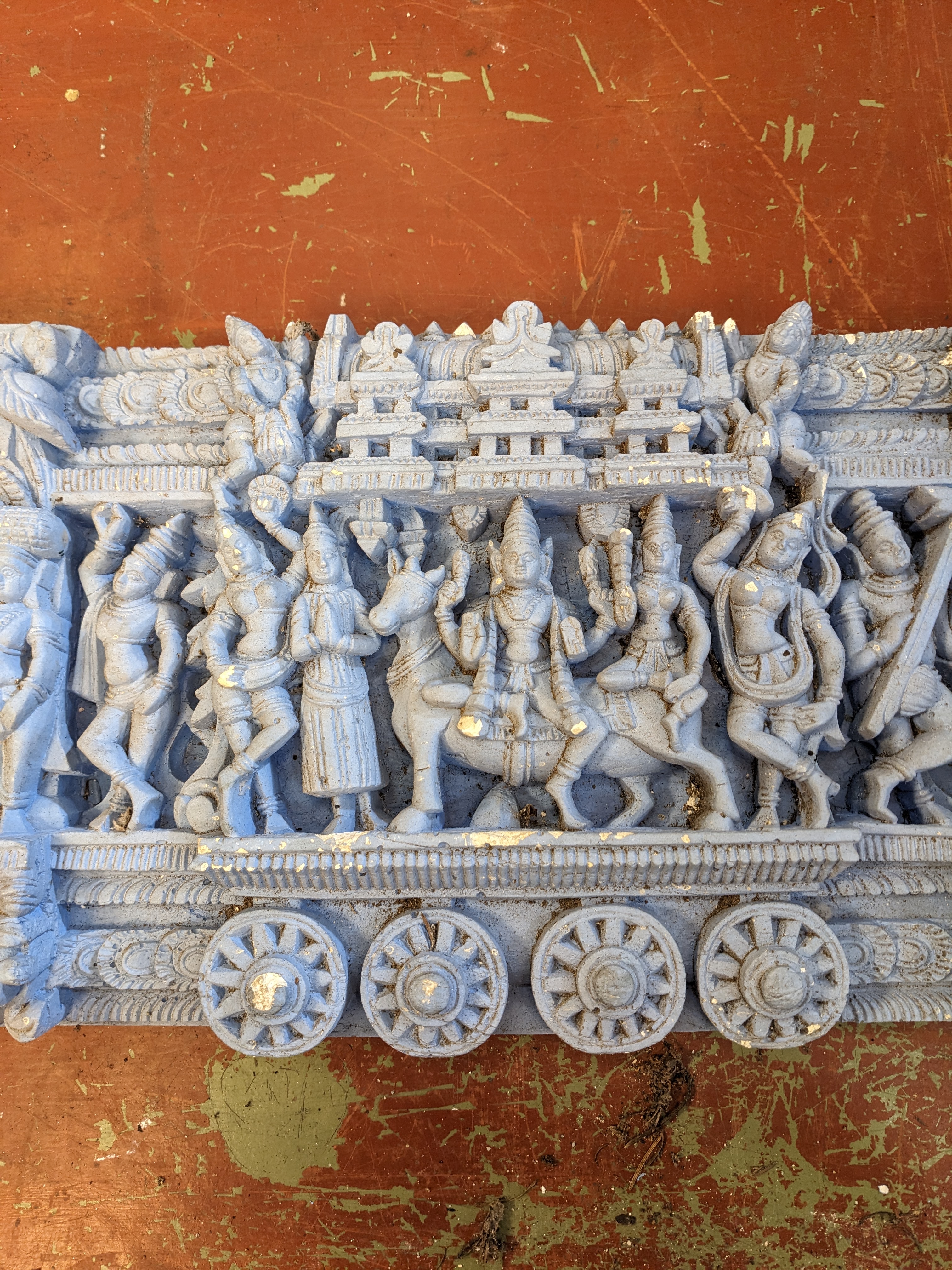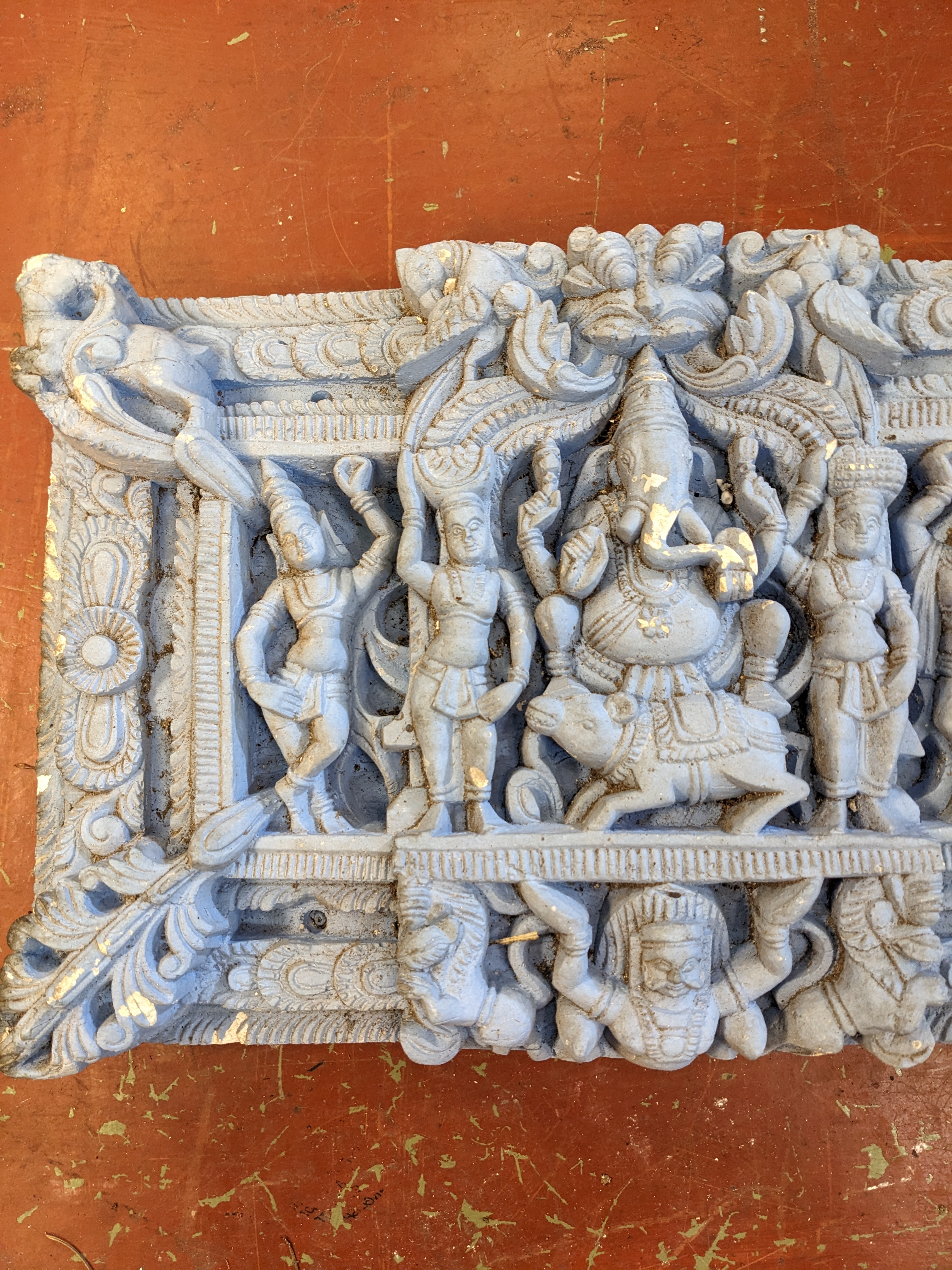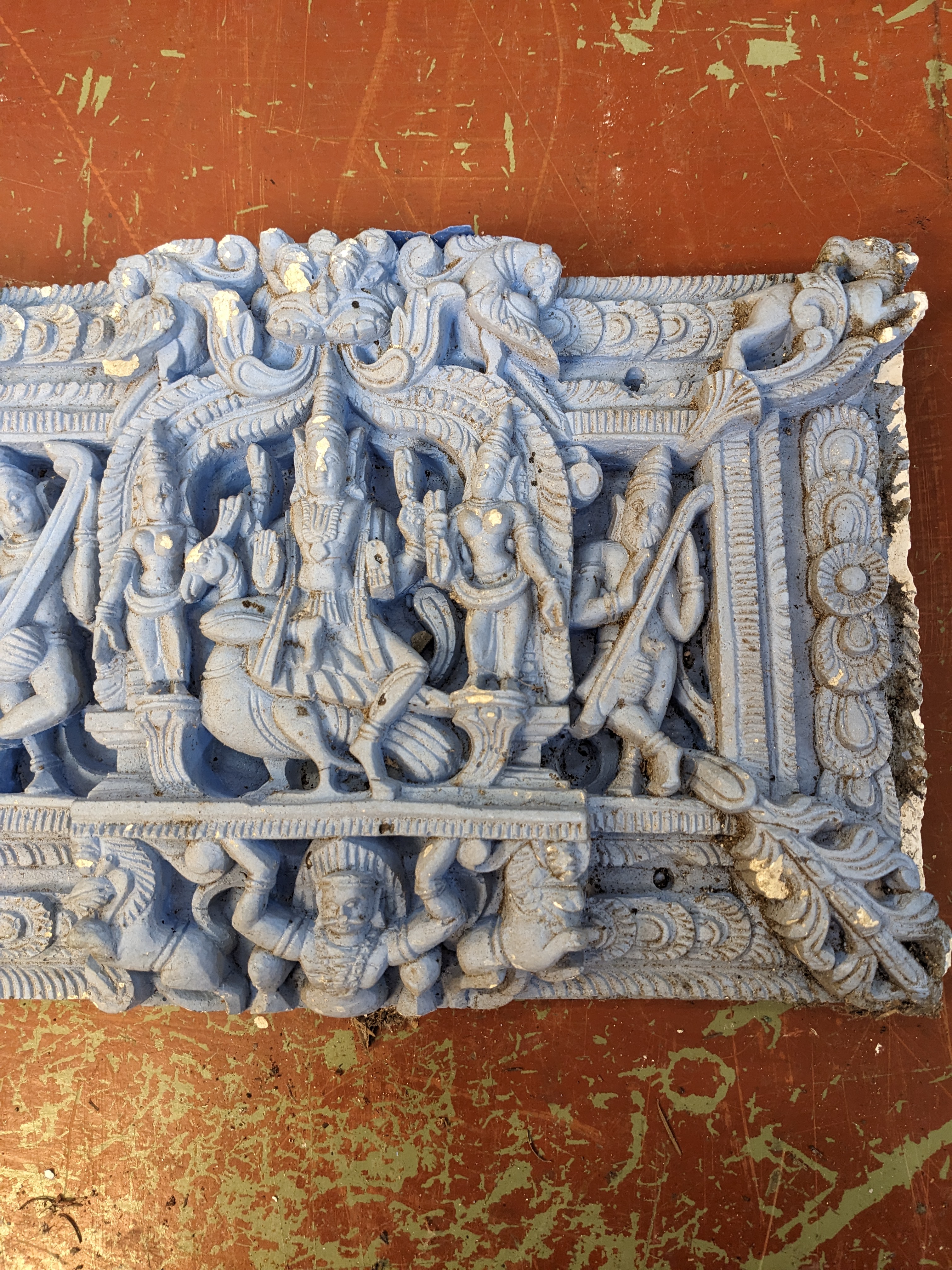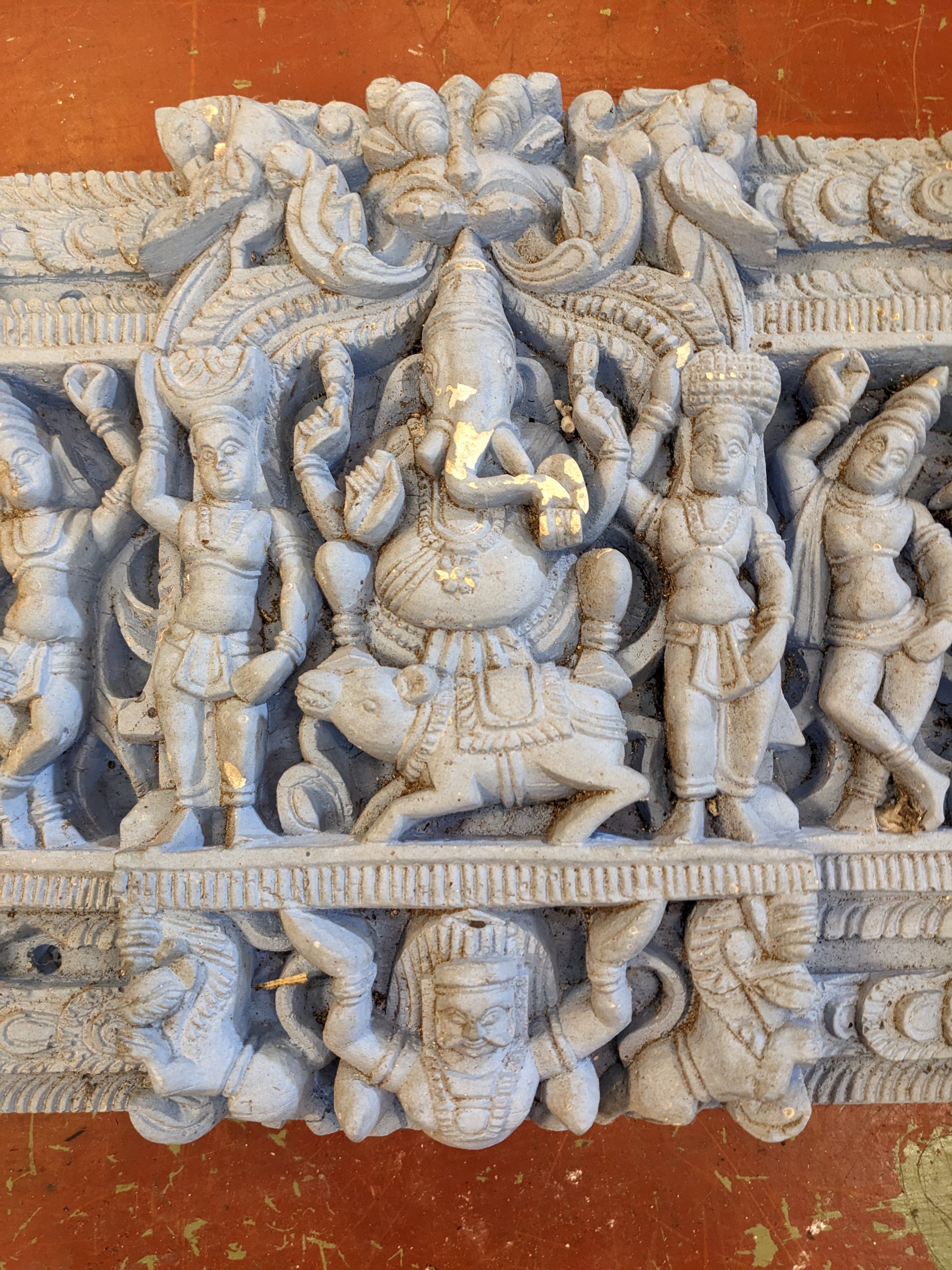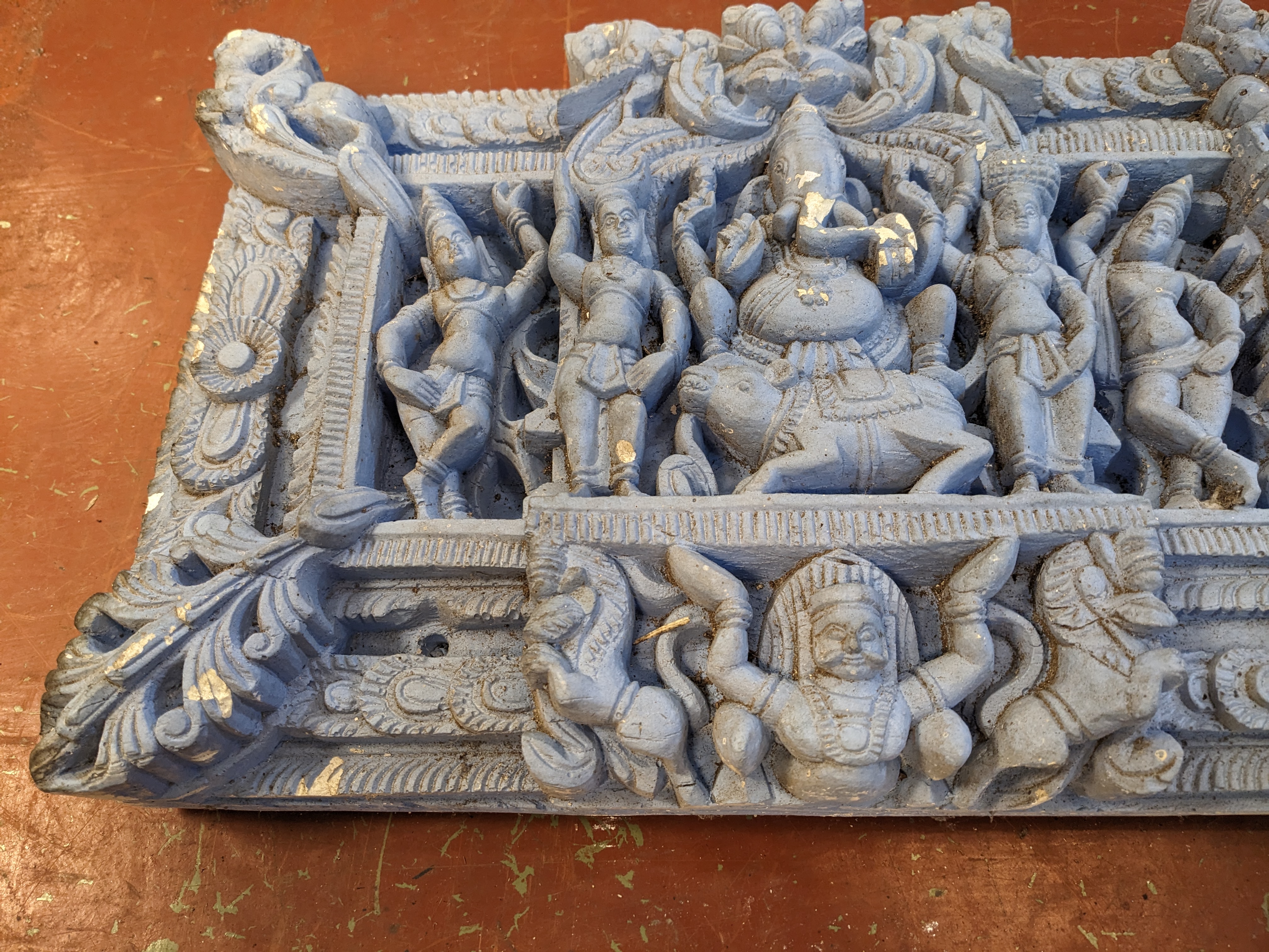 Blue painted plaster Hindu Relief featuring motifs of Ganesh and other Hindu deities, great for decor or as a centerpiece on a tiled wall, and or fireplace mantel. Has a few chips here and there.
