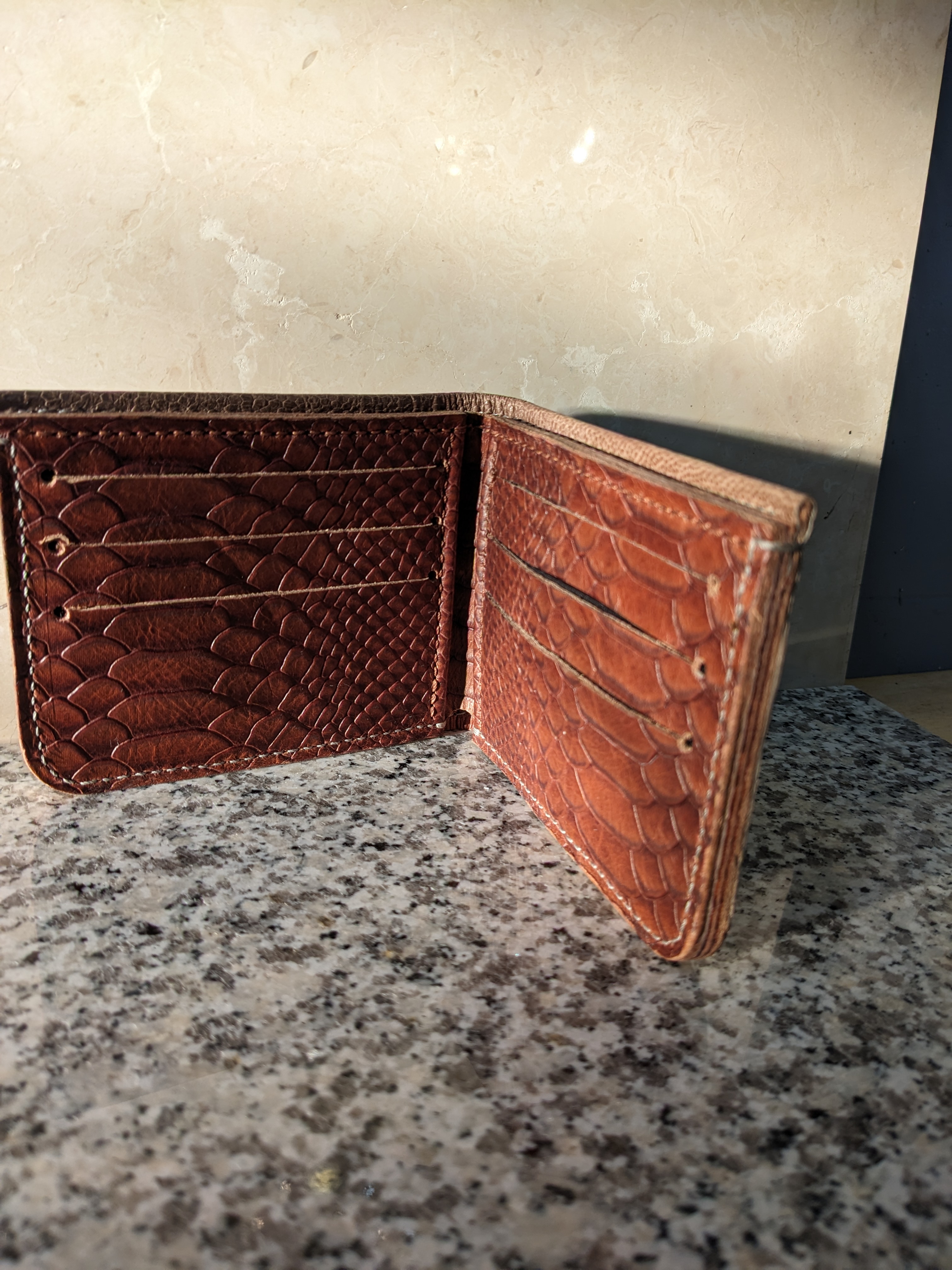 We have an exquisite hand crafted ostrich Leg Wallet with an alligator skin interior. This wallet is in unused condition with no damage.