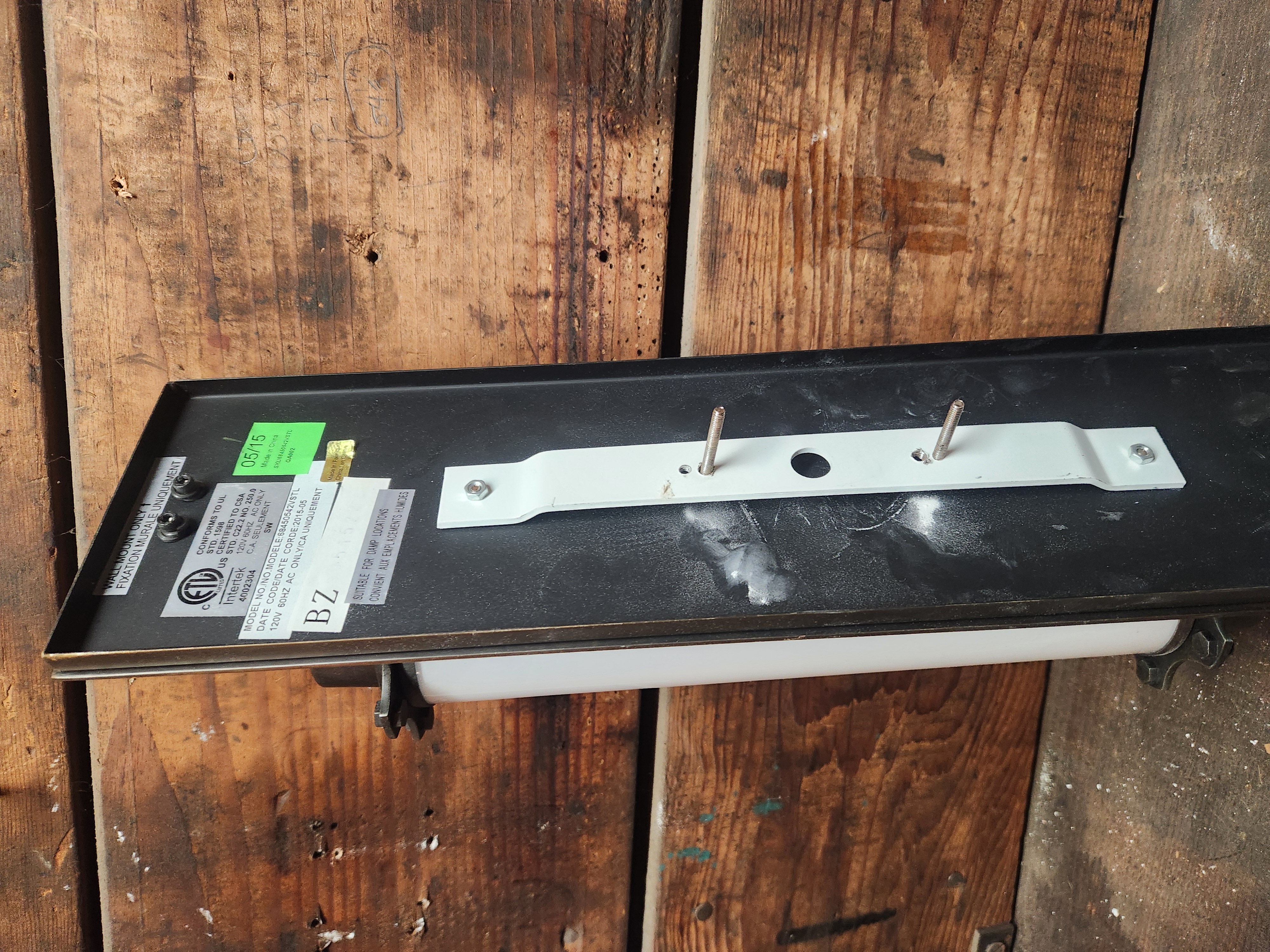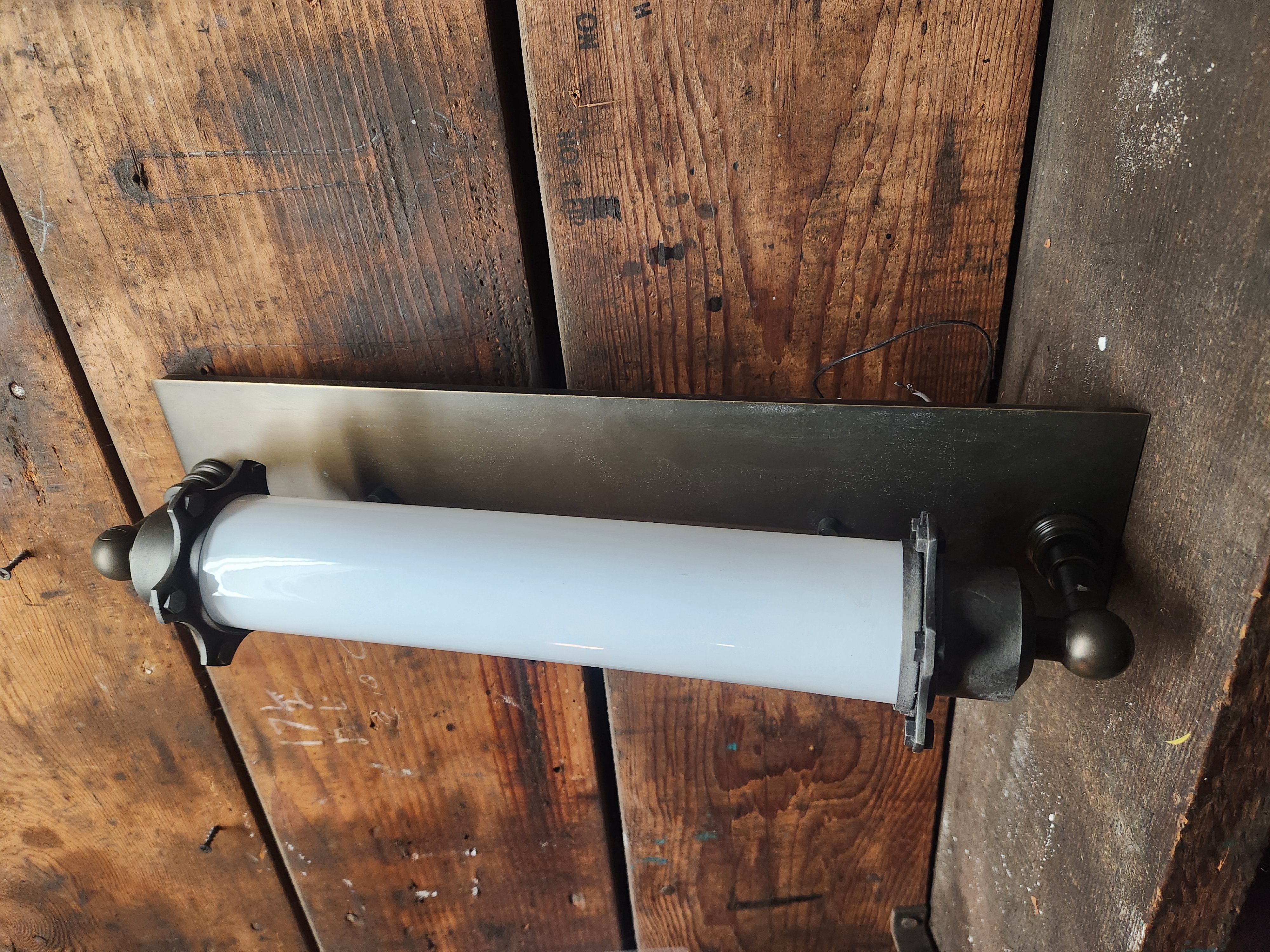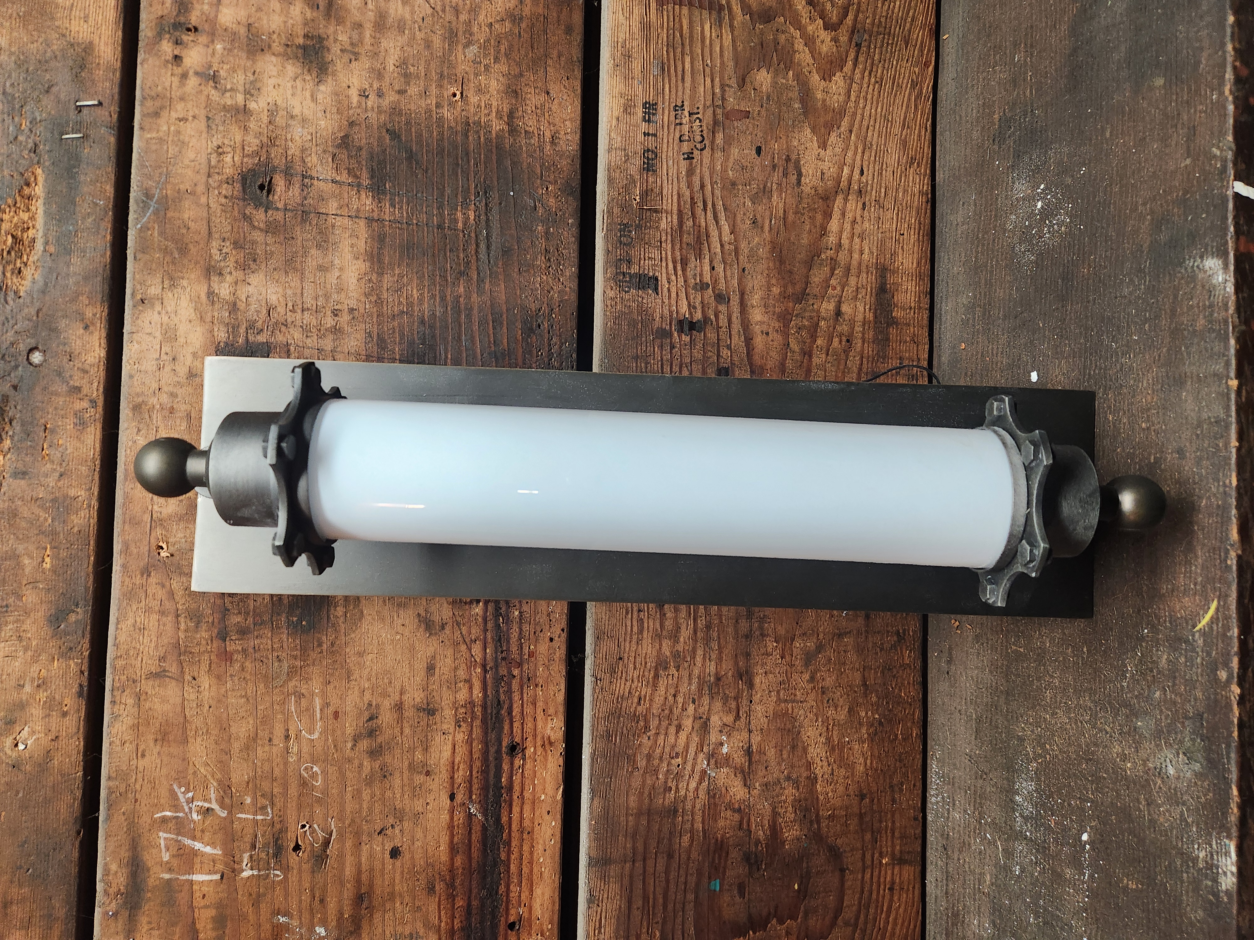Industrial style tube light with some minor cosmetic wear. It has a surprising weight to it. Meant to be mounted upright. Measures 4.625 x 18 x 4.75.