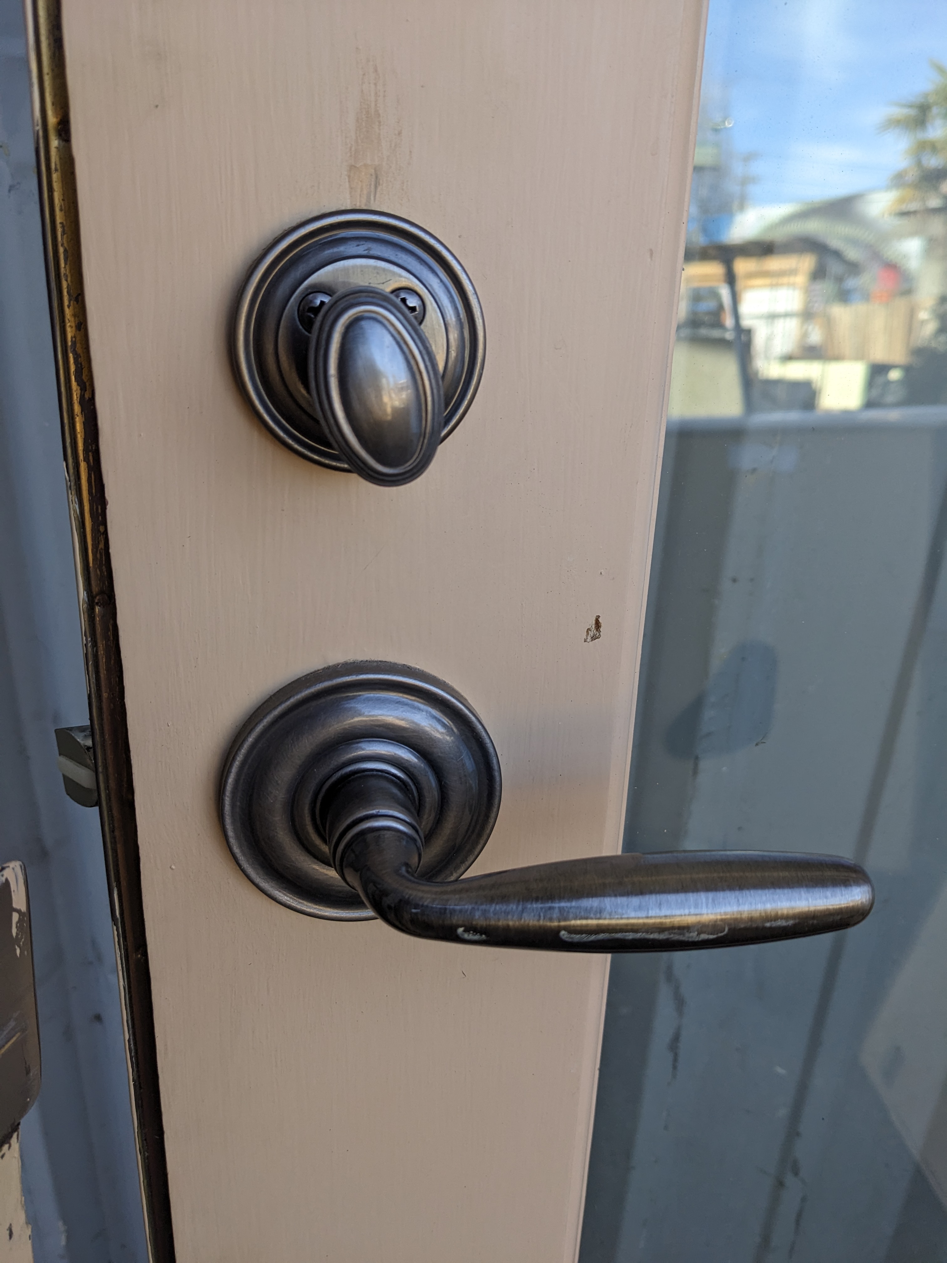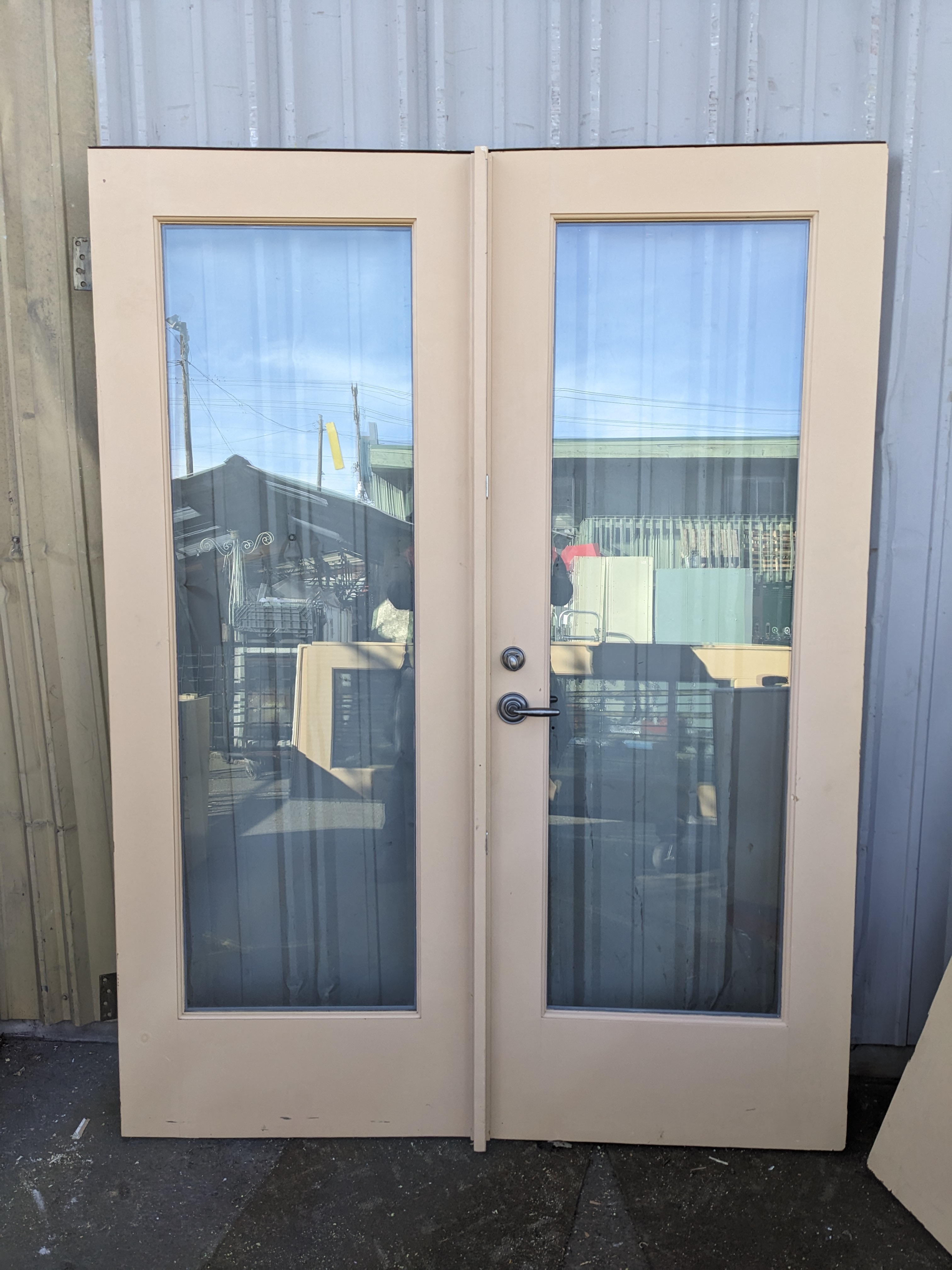 French doors with a single full lite of double paned and coated glass for insulation.