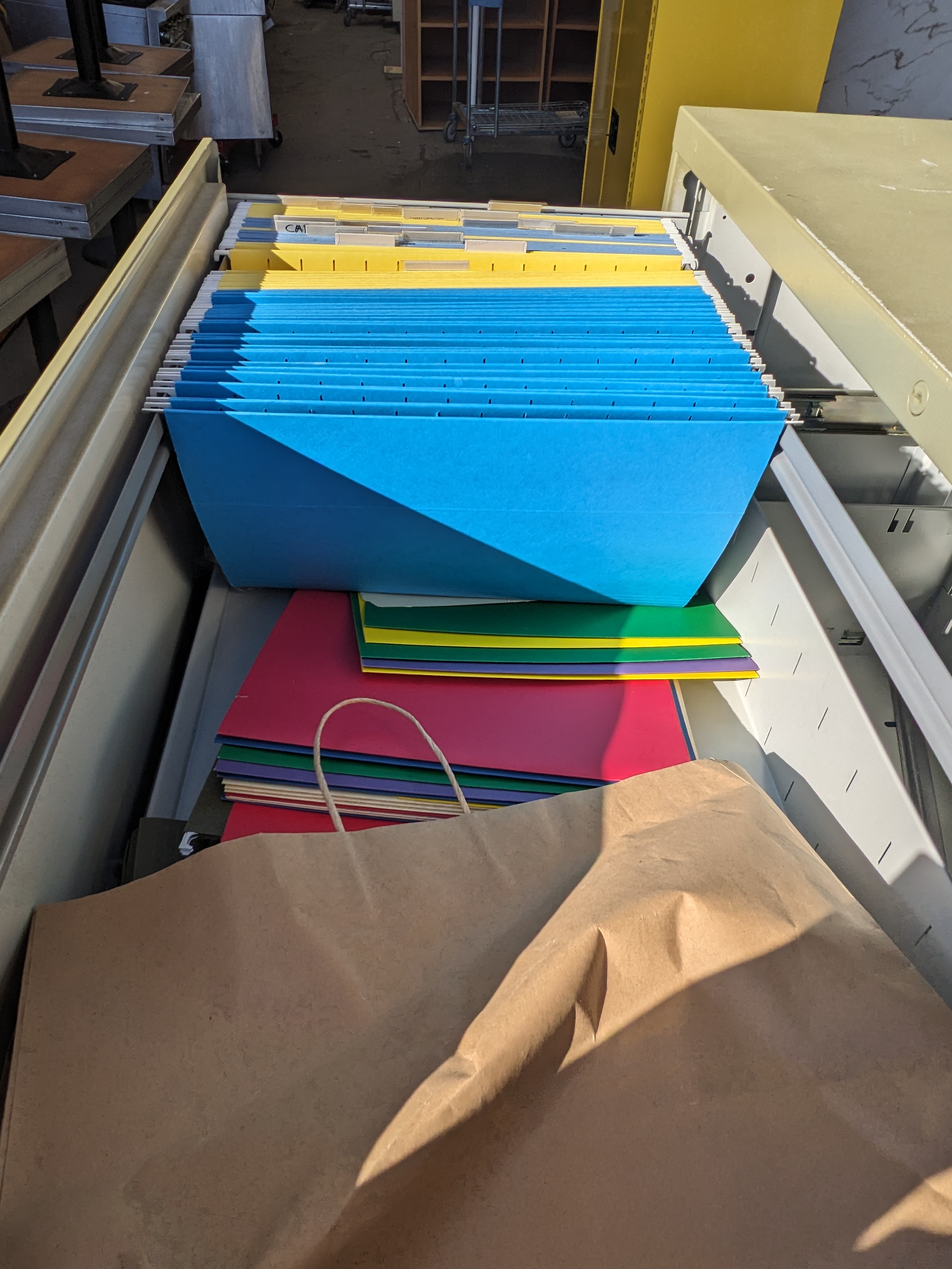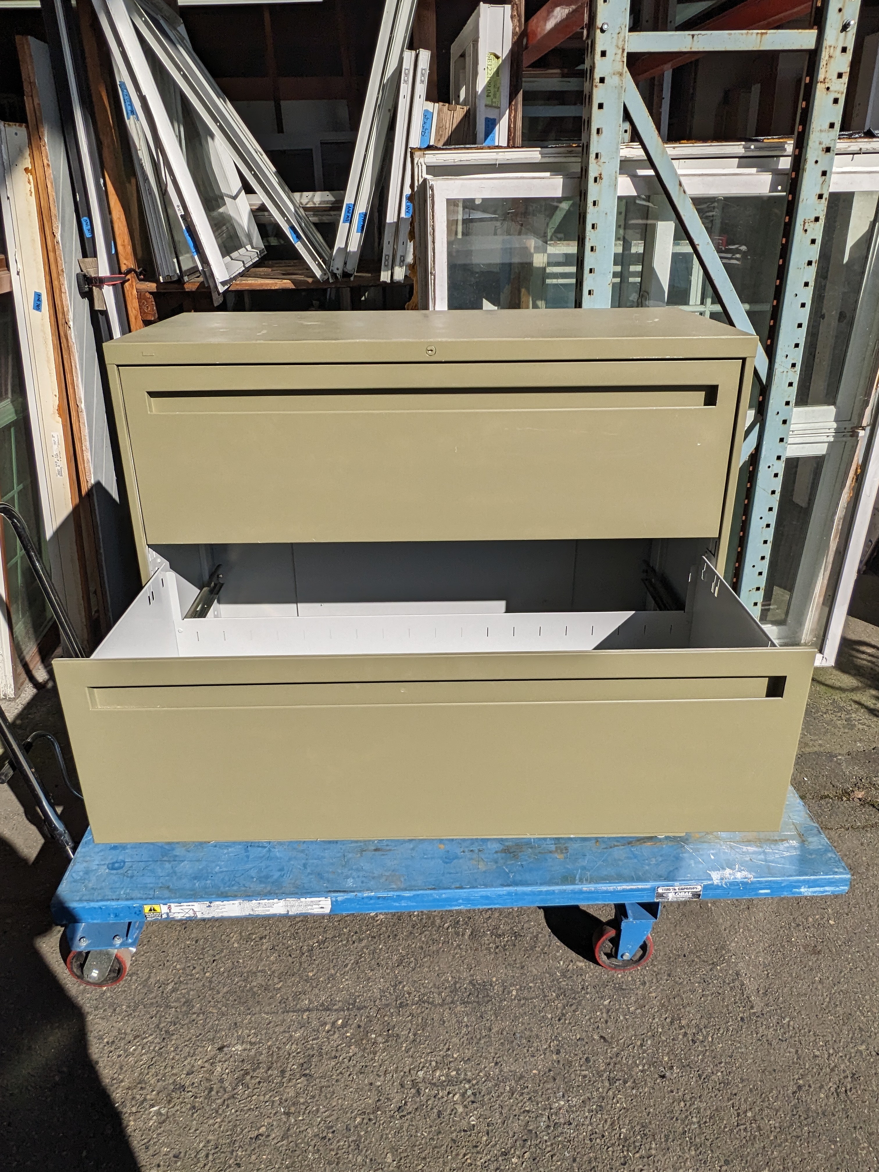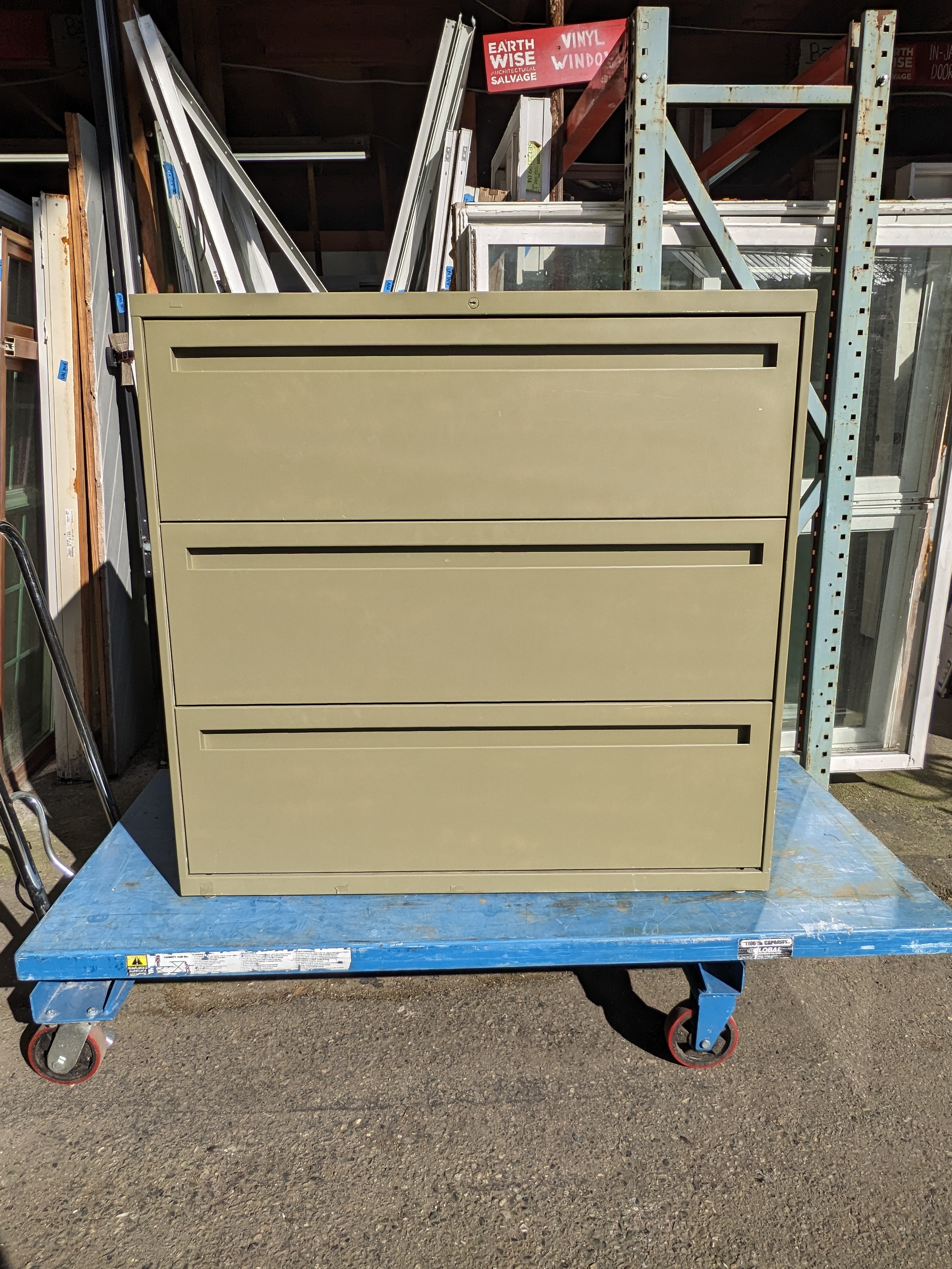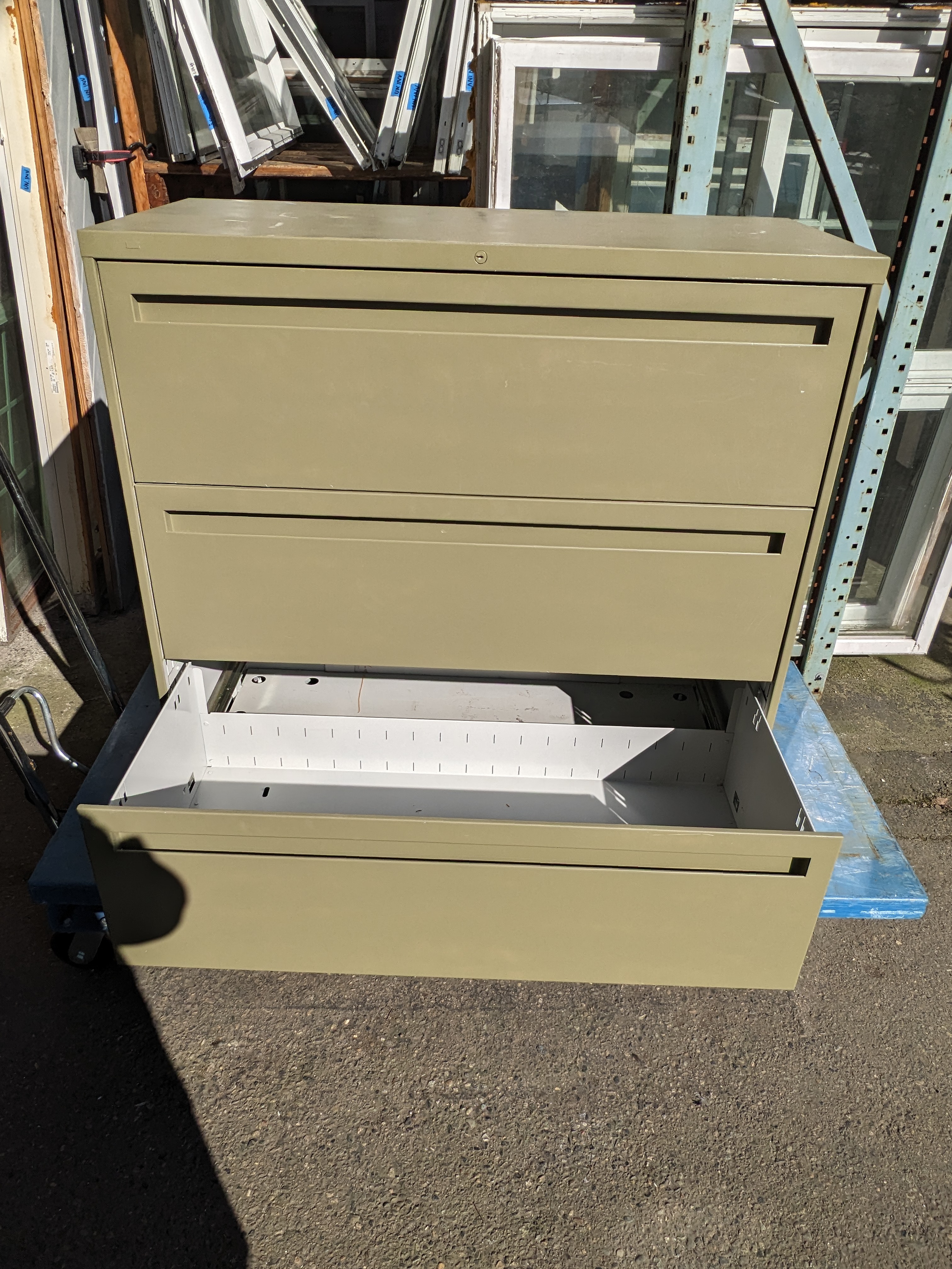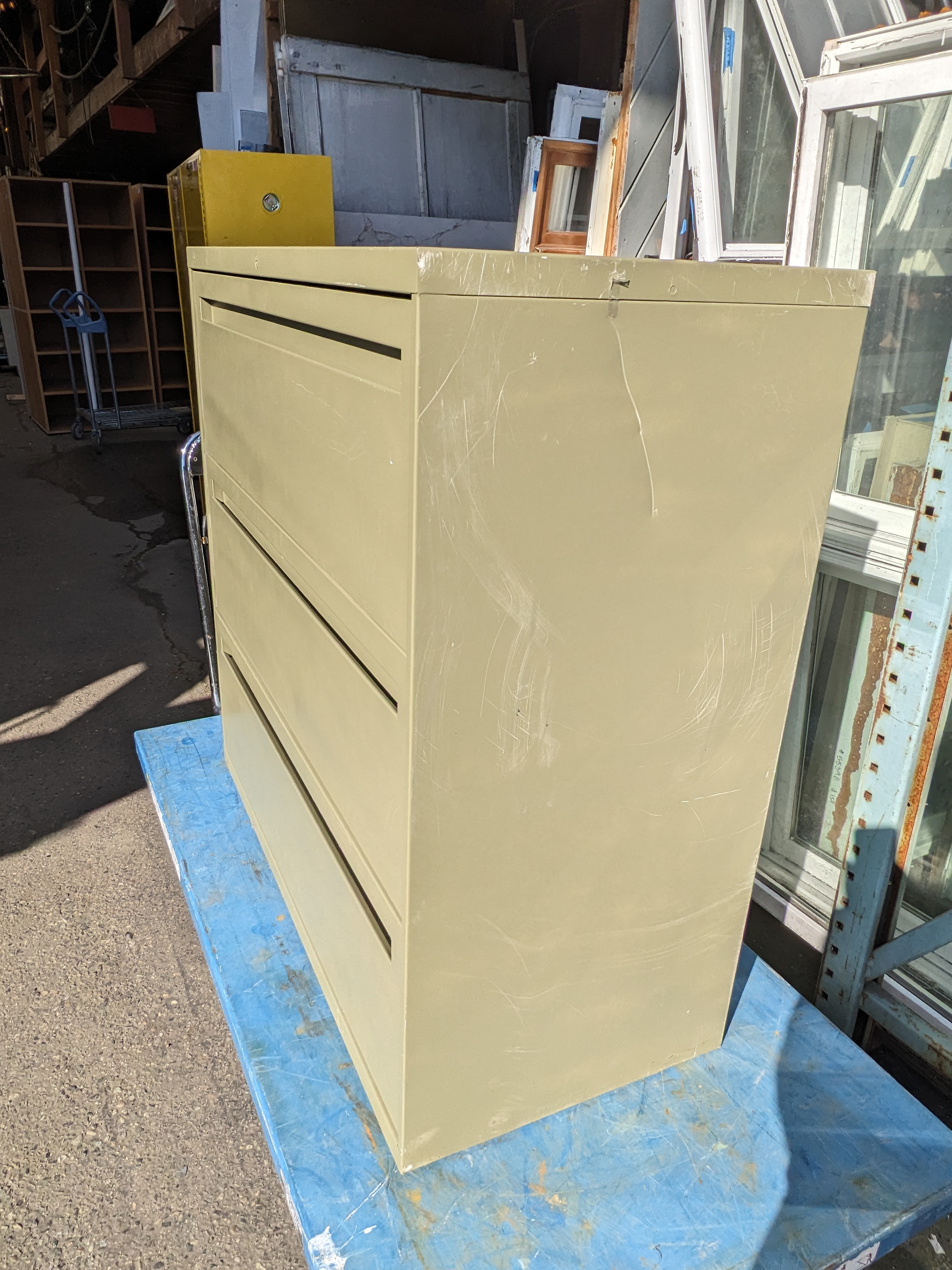Ready to get organized? Do it with the help of this wide three drawer green filing cabinet. Comes stocked with more filing dividers than any one person should ever need - I hope you dont need them all. Only one drawer opens at a time. Seemingly the green is a spray painted coat over an originally white cabinet. Its a little scratched up, but still very sturdy and strong. Dimensions: 42 x 40 x 19.25