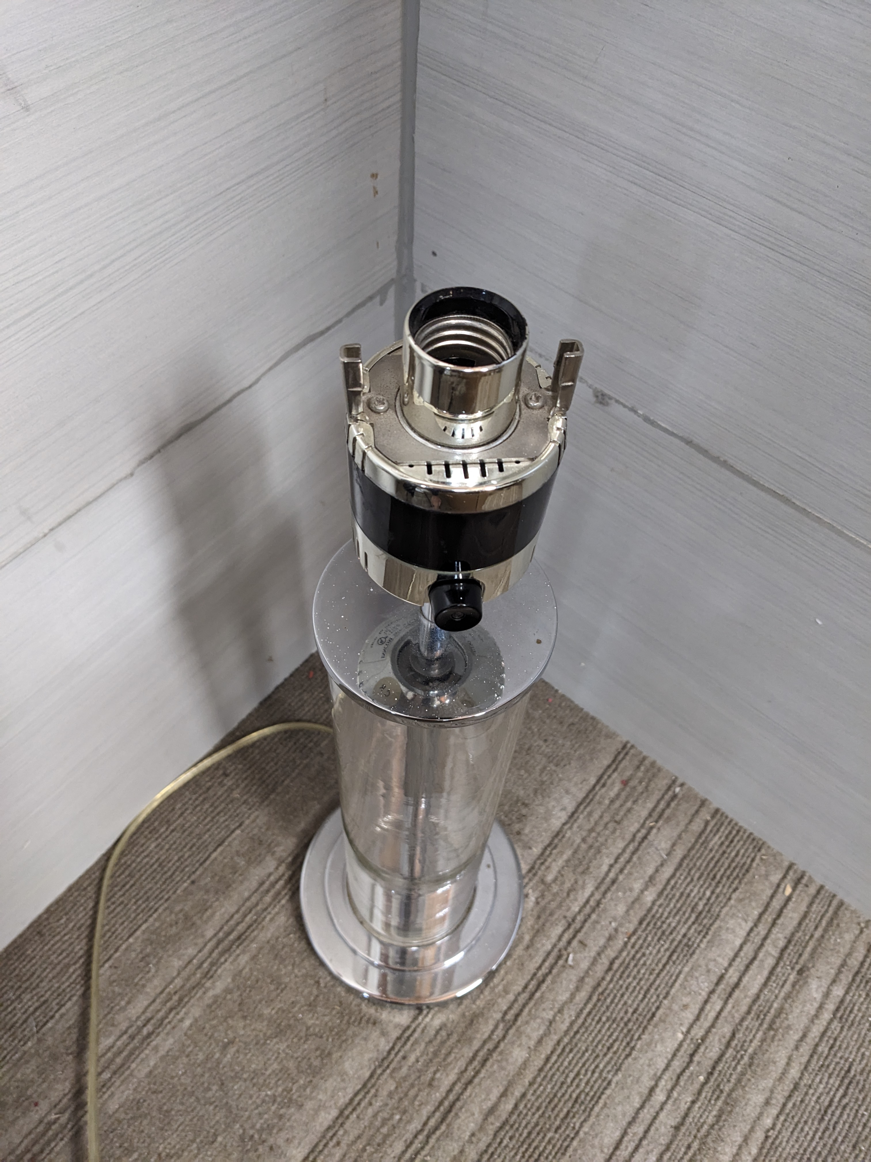 This modern style glass and metal table lamp is very ornate and is free of any damage or blemishes. It has a switch that allows for a low and high light setting. This lamp would need a replacement shade.