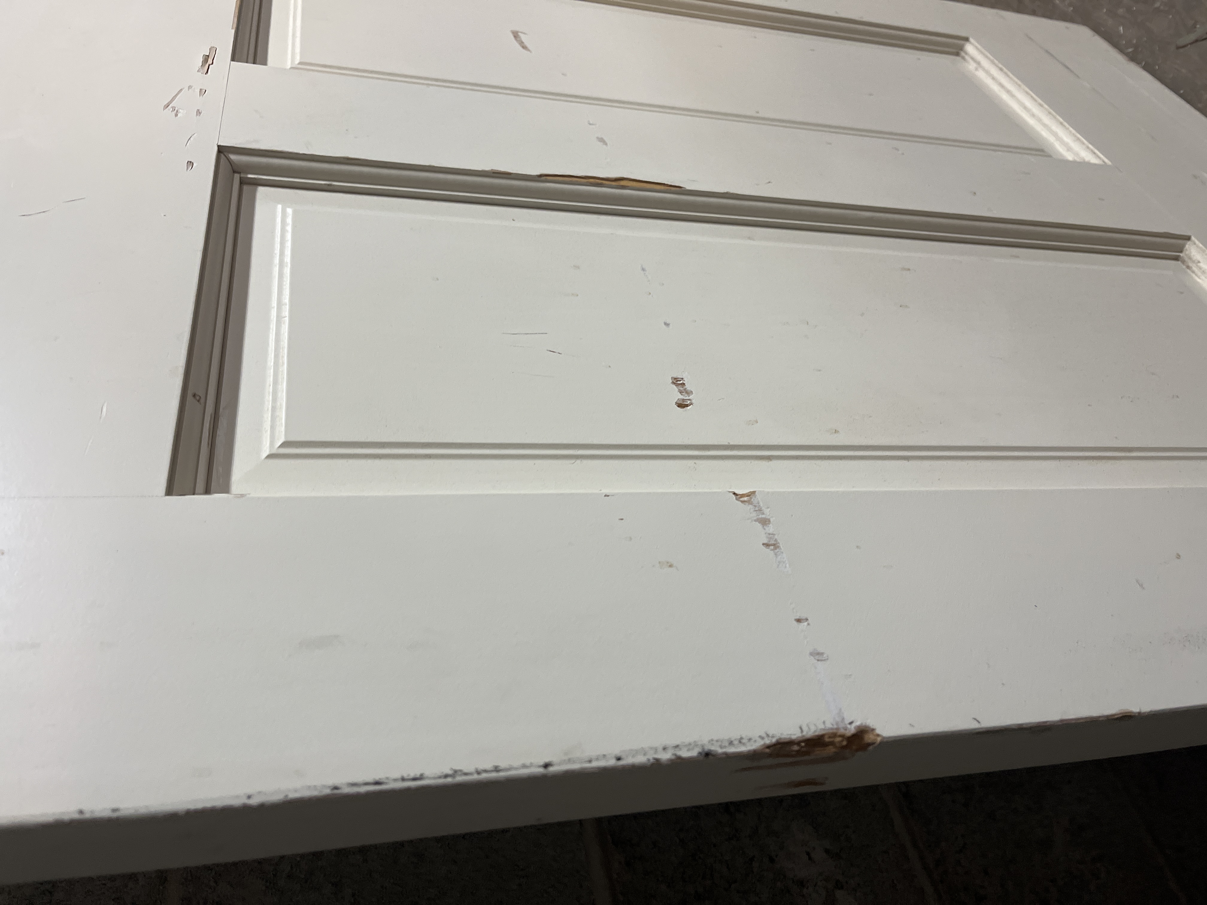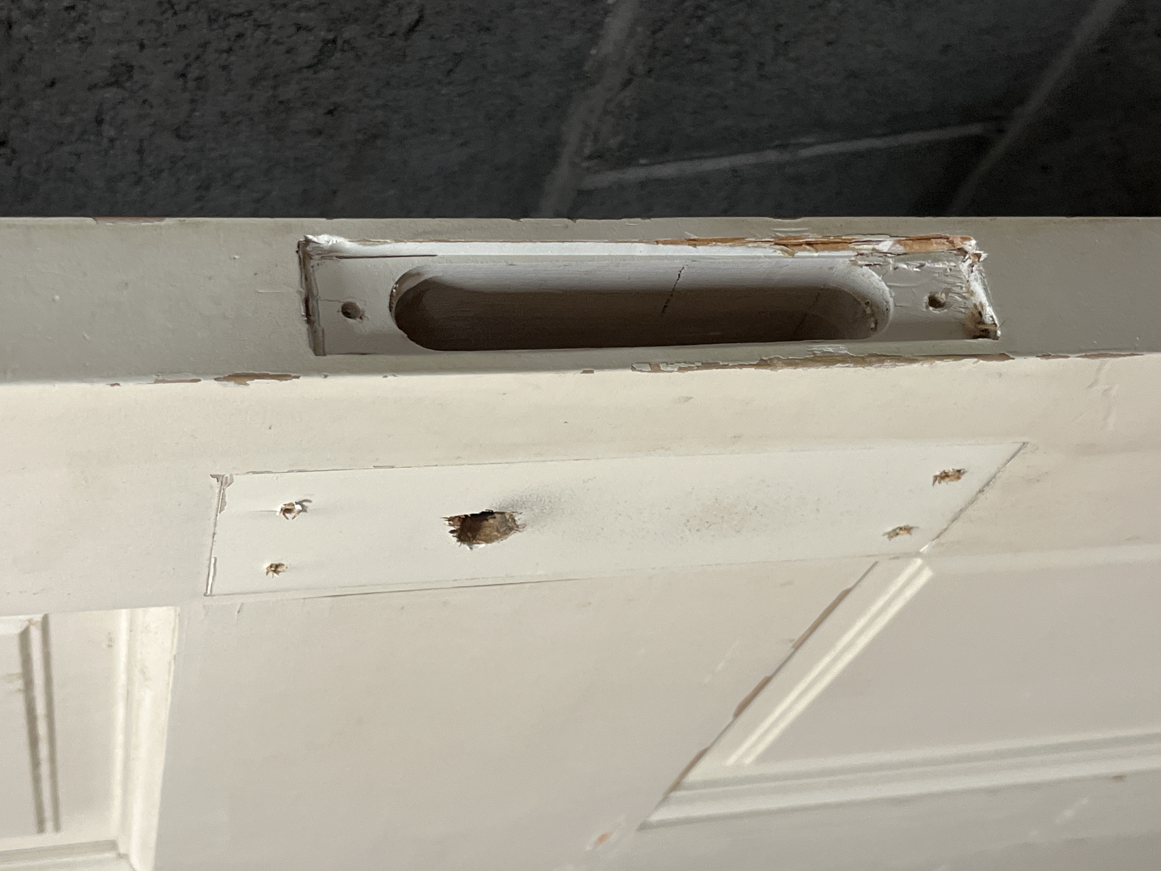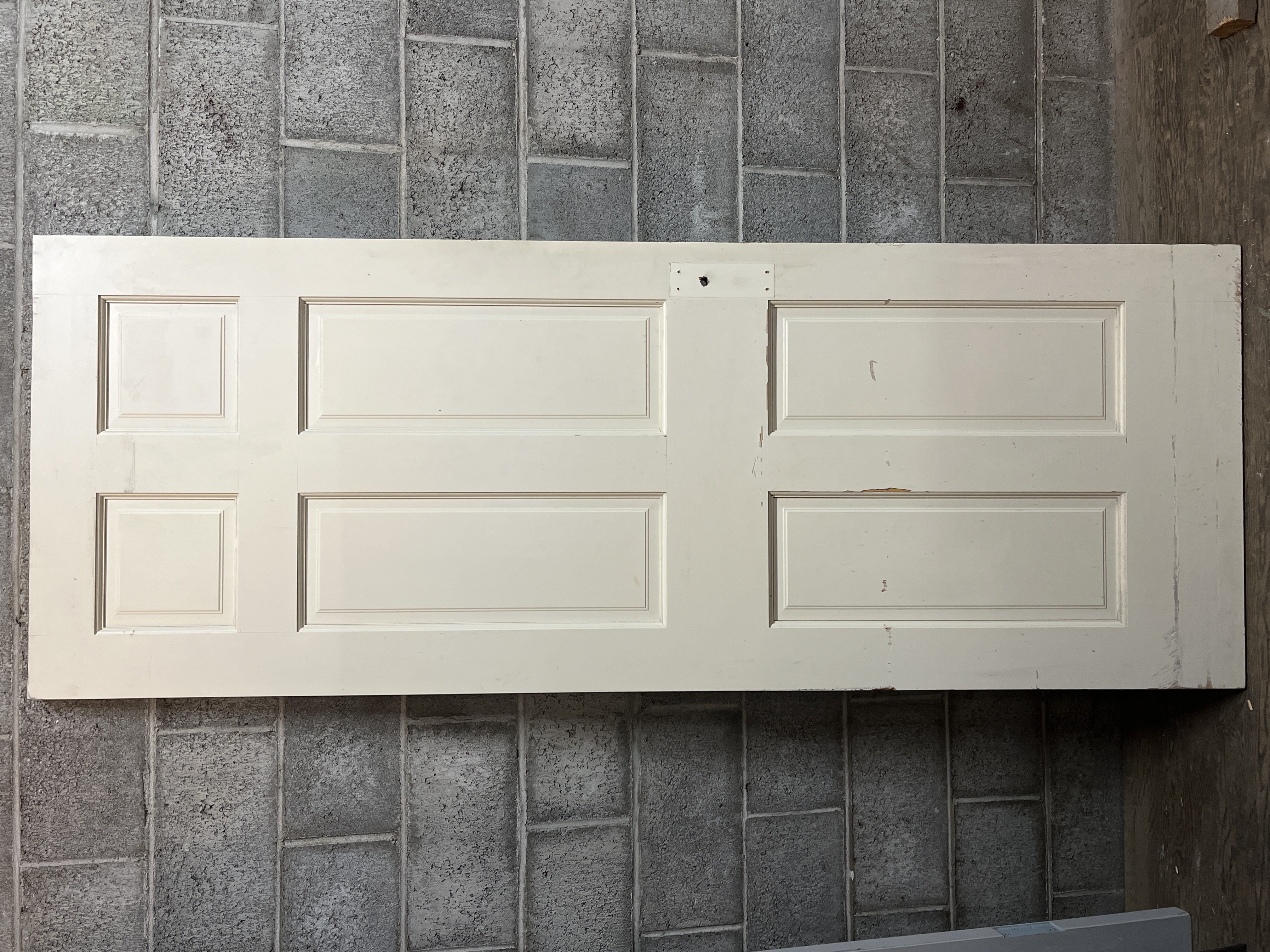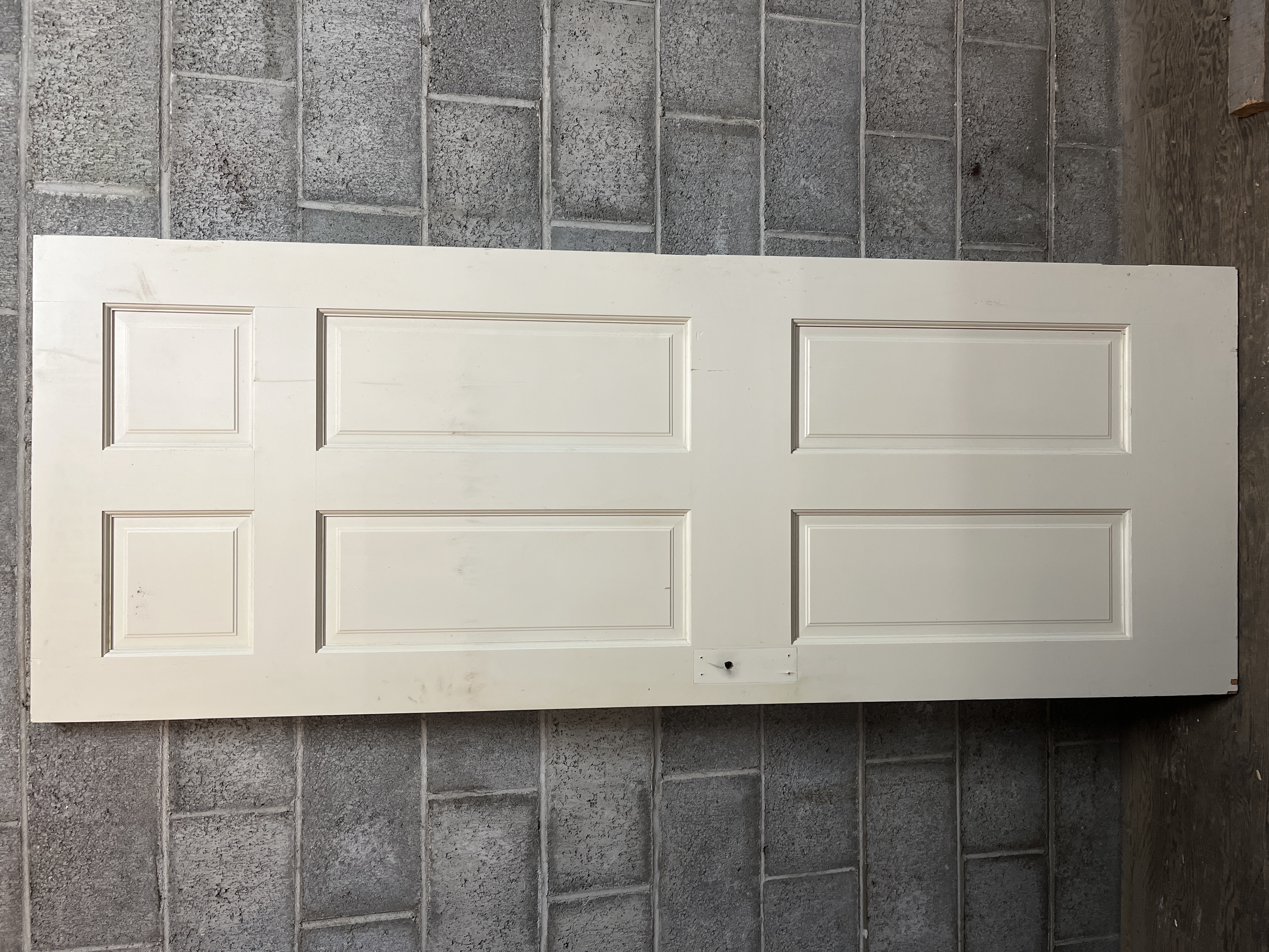 A modern six panel left hand swing door that is set up for vintage components. It is drilled out for use of a mortise box inside. It has some wear from previous use, but a good sturdy door altogether. Measures 29.75 x 79.25 x 1.25 inches.
