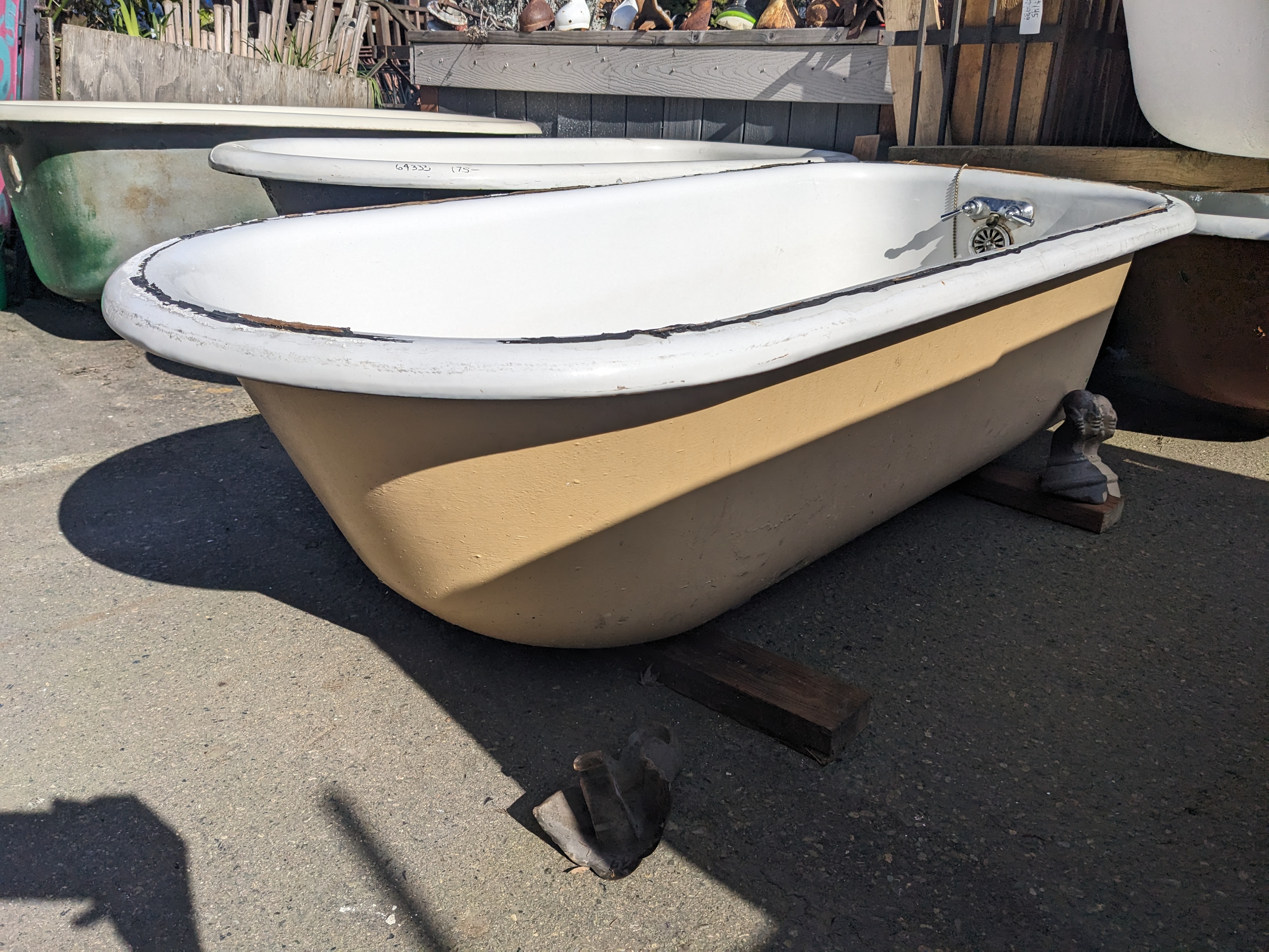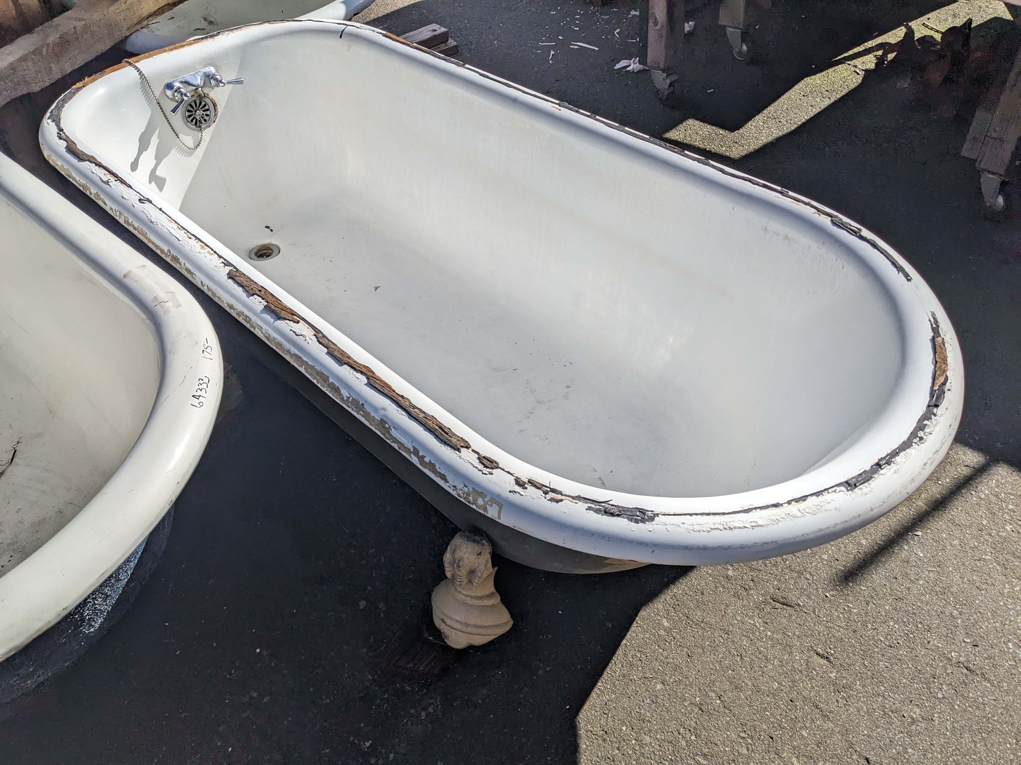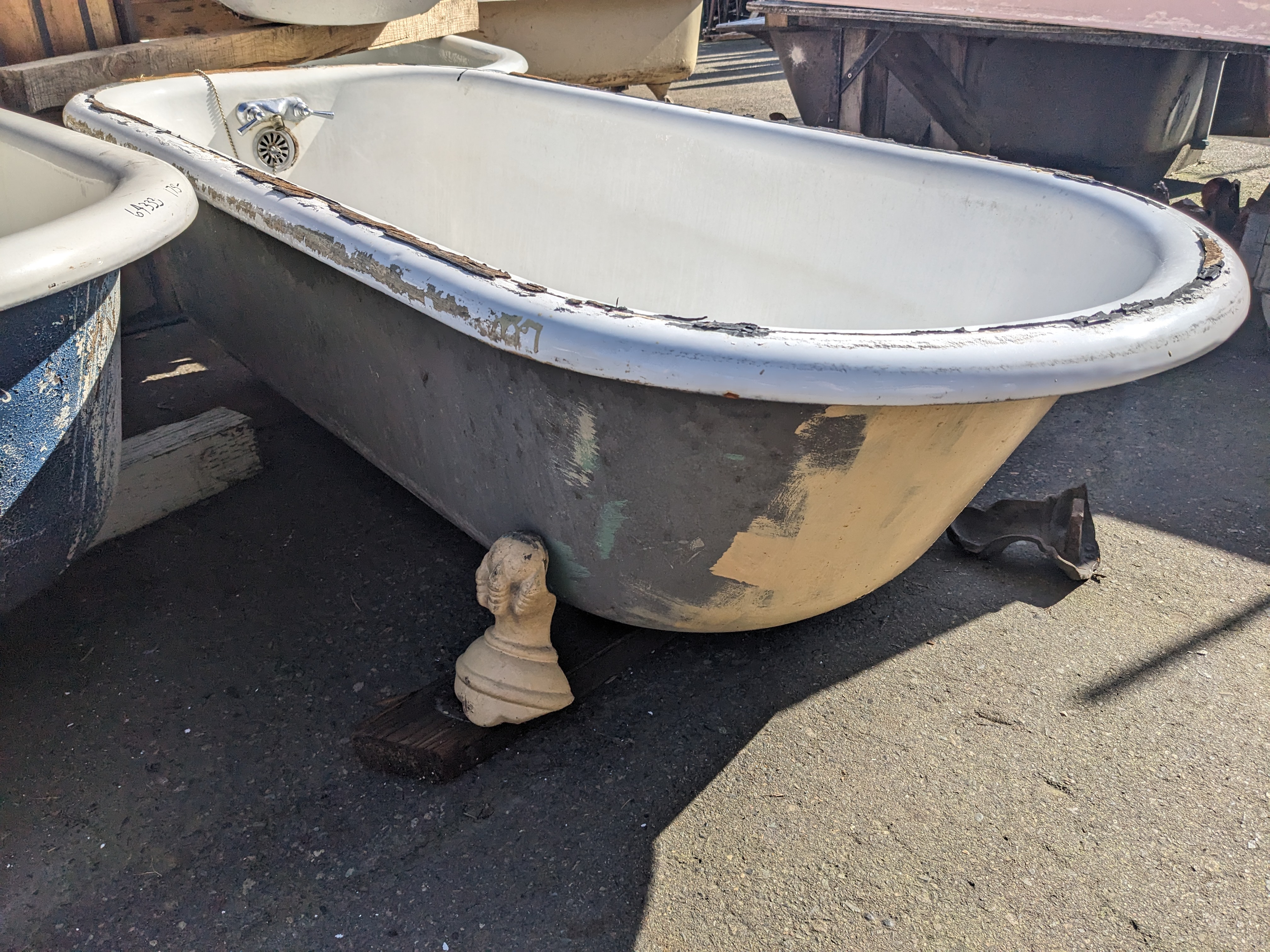 This 5.5 foot Clawfoot Tub is painted beige on one side and gray on the other. There is unfortunately scratches and the remnants of an installation adhesive which could be removed with some elbow grease. The claw feet would need to be replaced as well.
