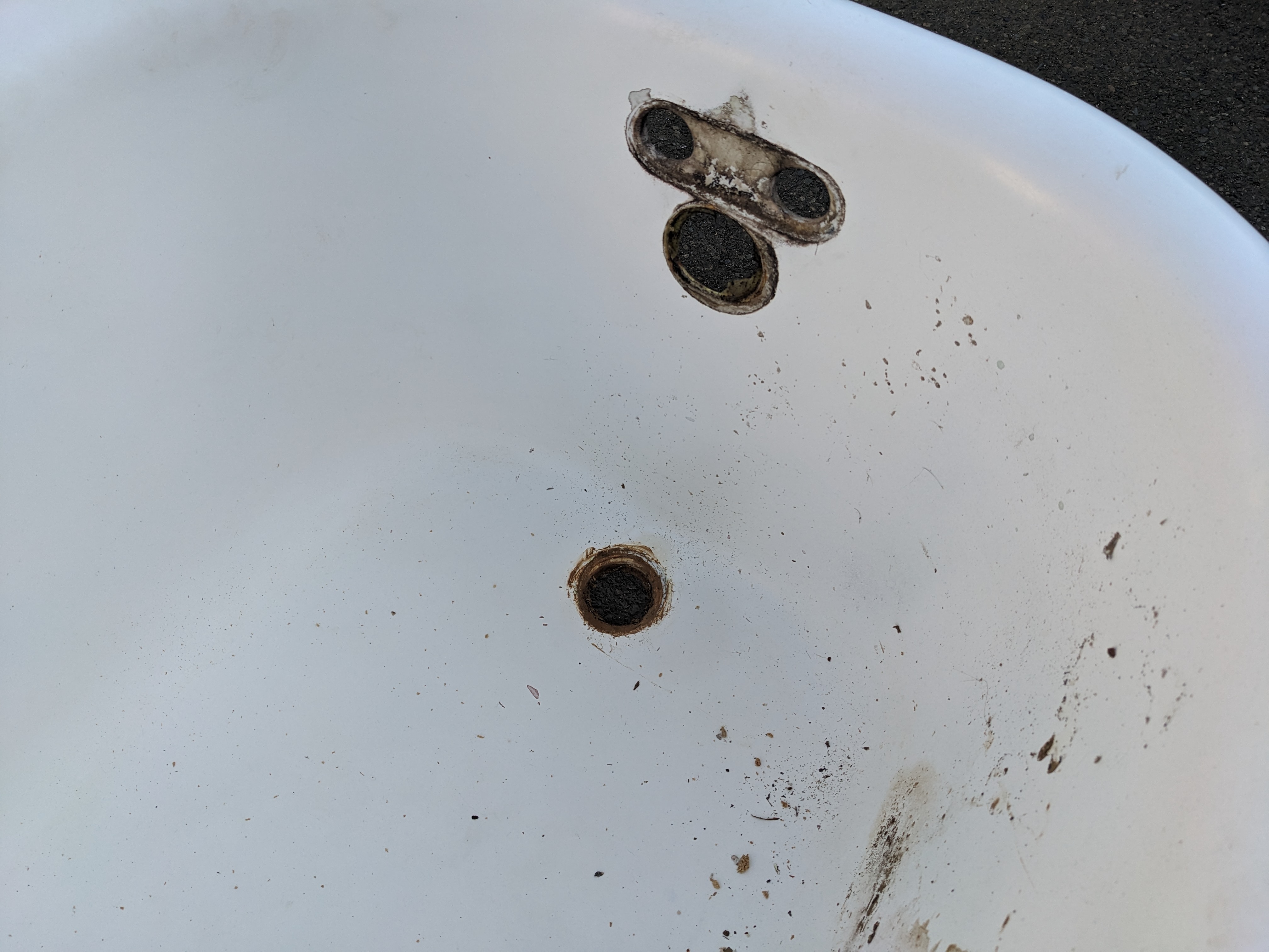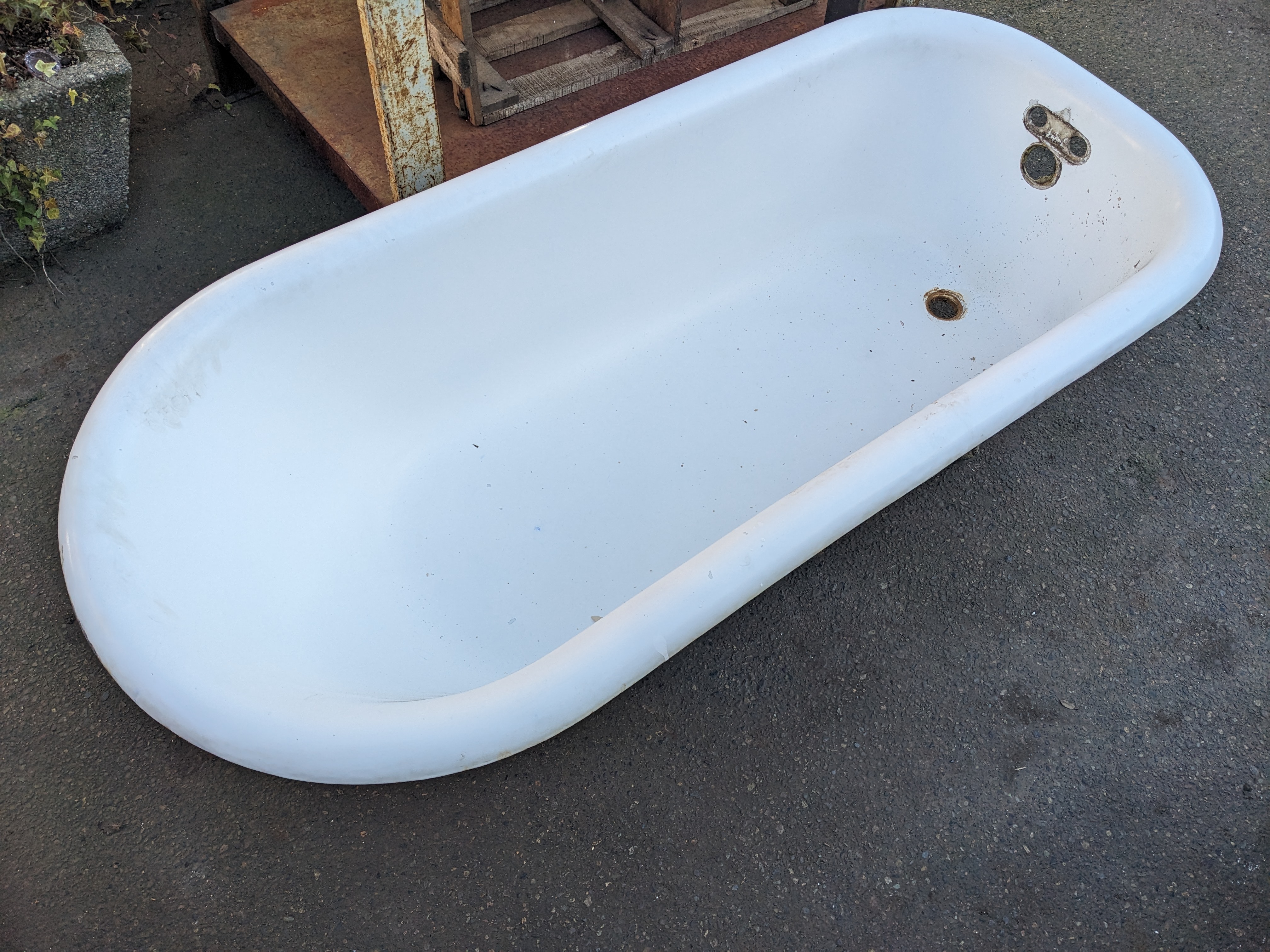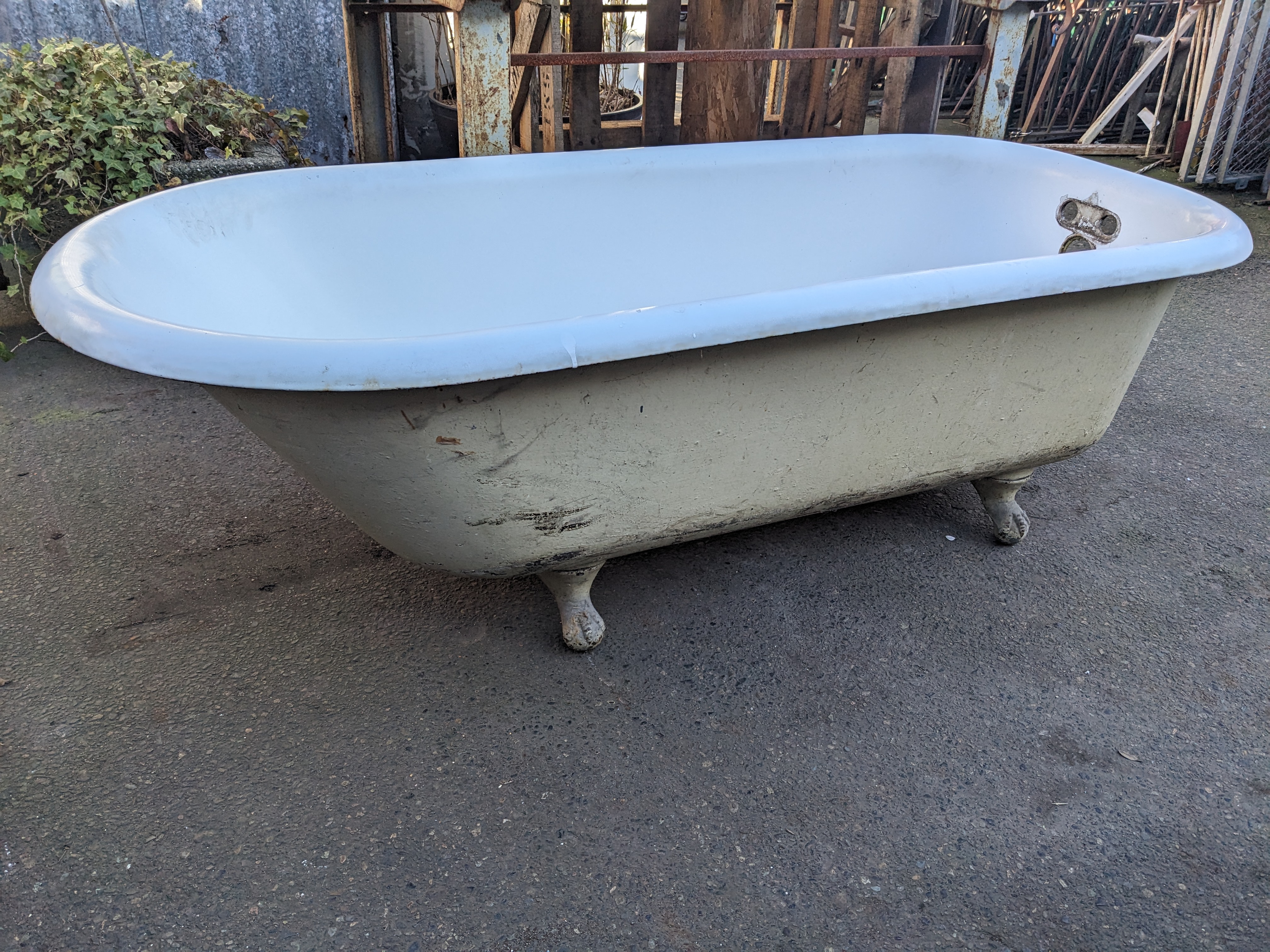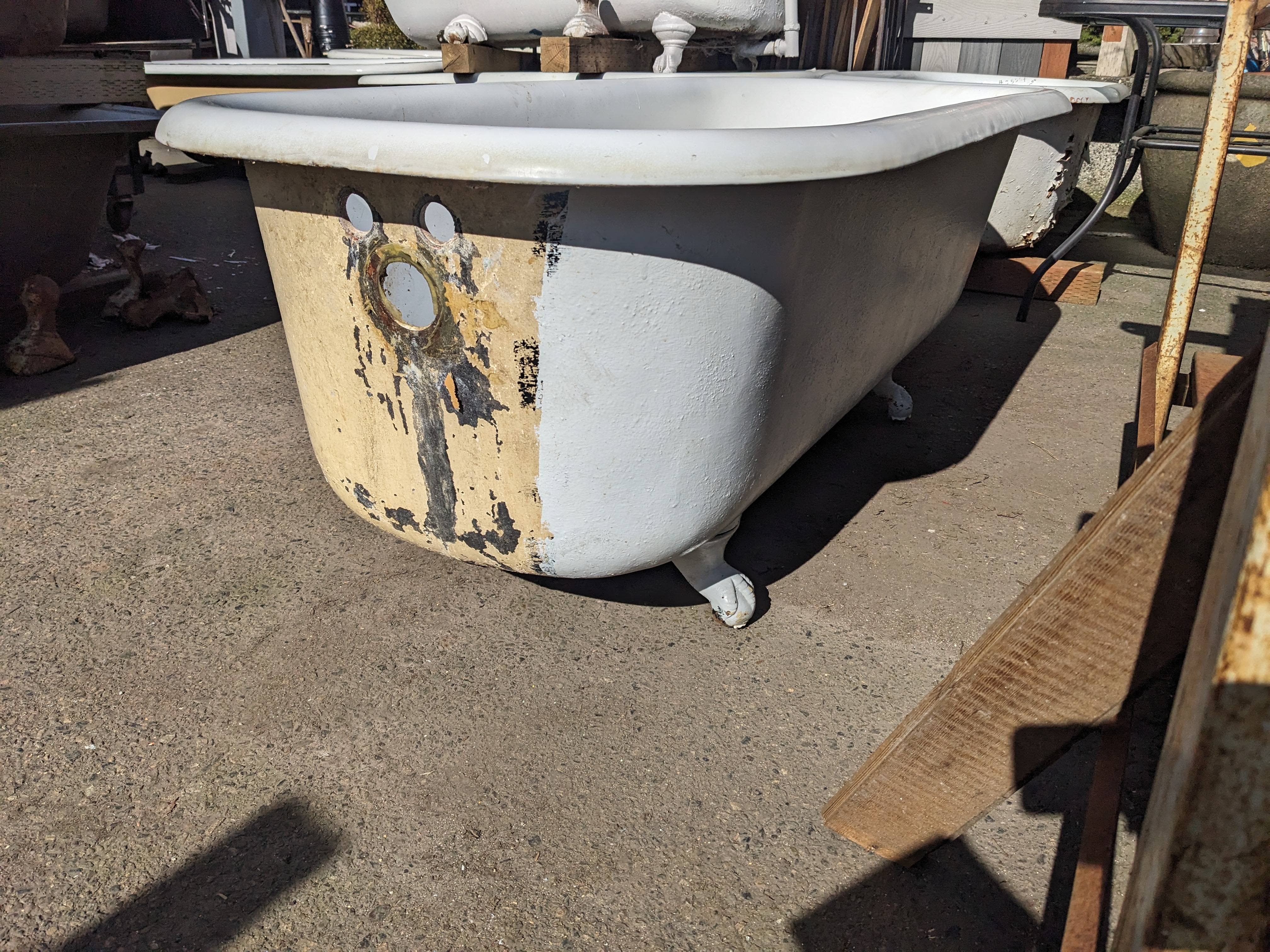 This 5.5 foot Clawfoot Tub is painted beige on one side and gray on the other. It does have some rust spots near the drain and where the downspout was. It includes the claw feet.