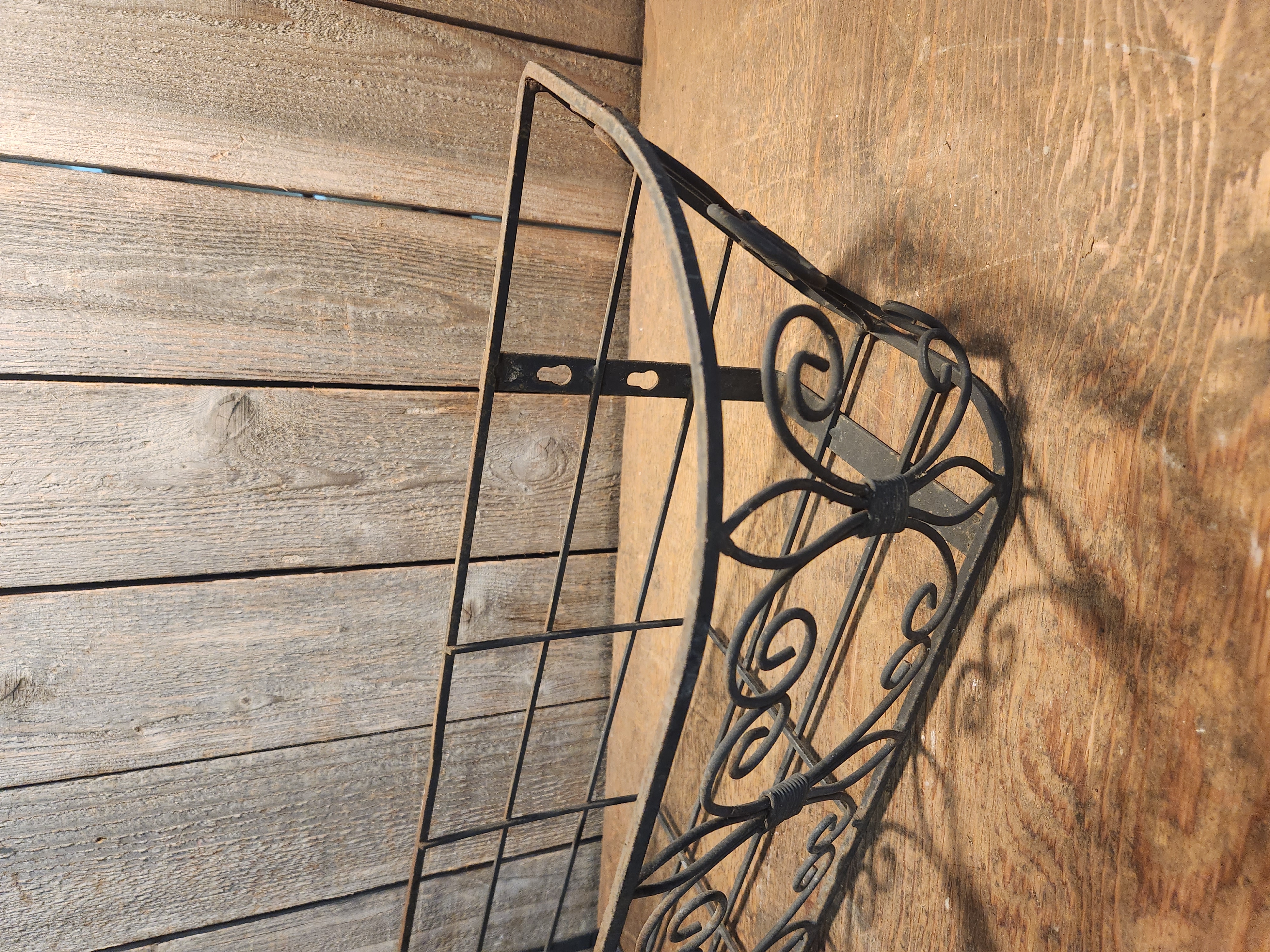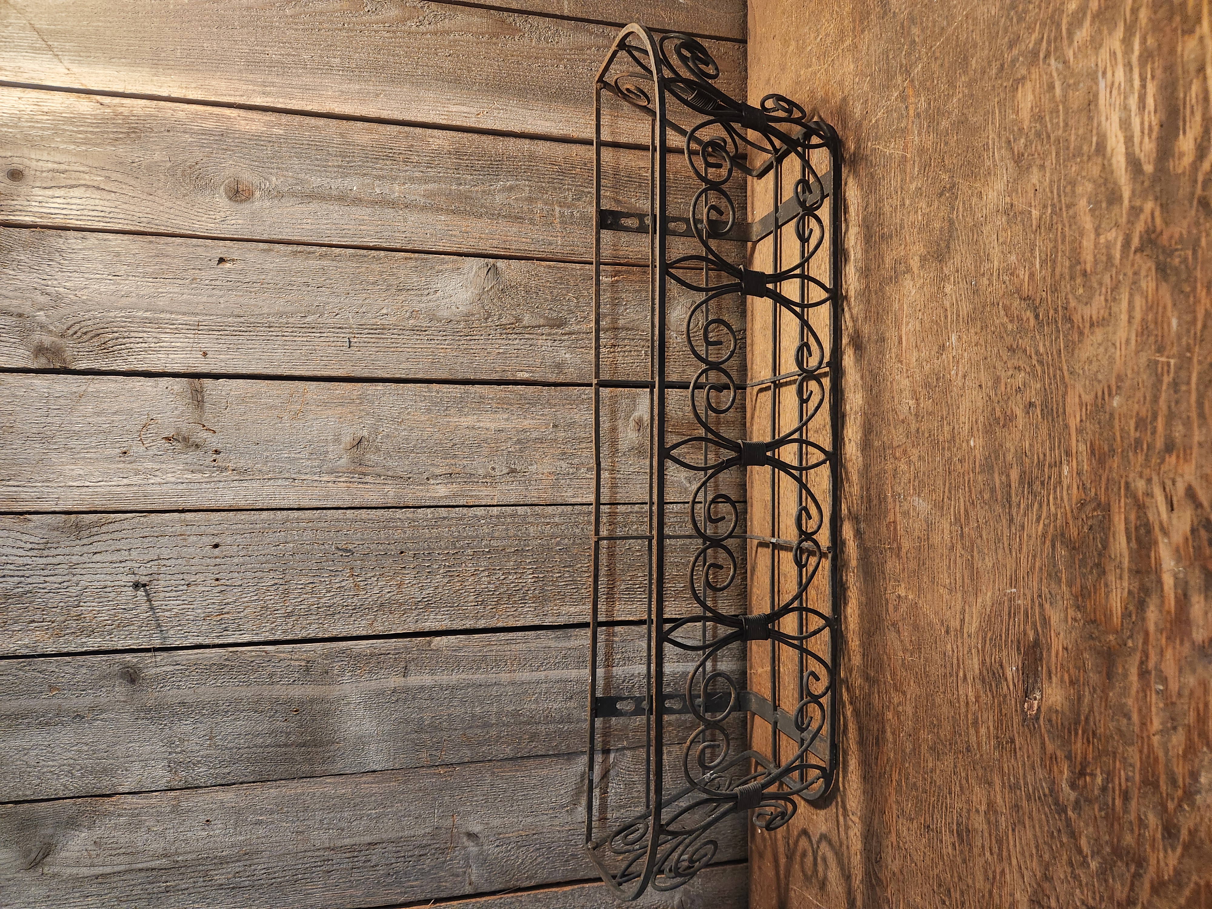Wrought iron planter box with a Fleur de Lis pattern. Rusty in some spots, but will be easy to hang. Get it just in time to get some blooms in! Measures 30 x 7 x 8.75.
