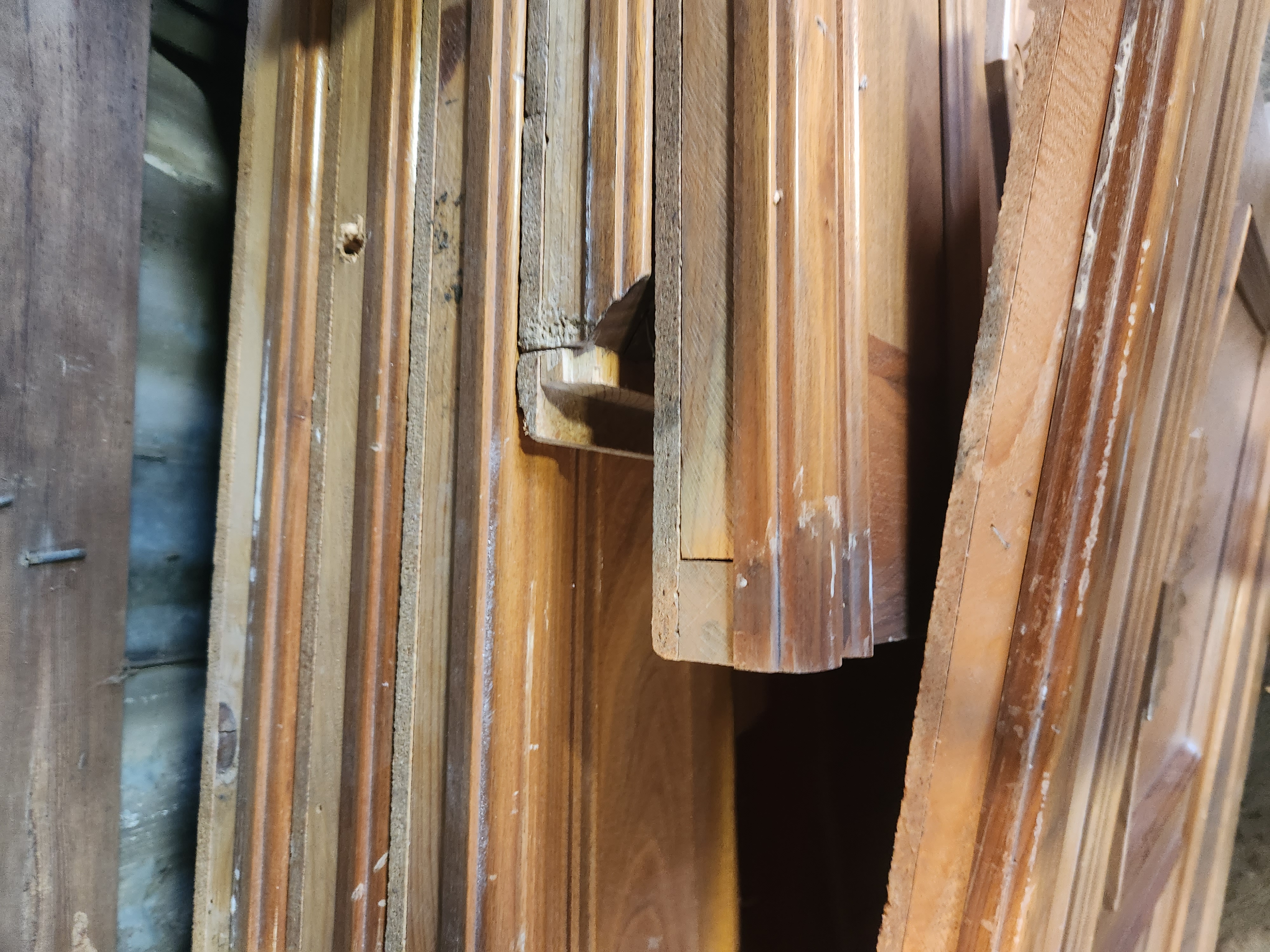 Wainscoting panels with a Cherry front and more material on the back for some extra spacing. This lot comes in 7 sections, all in fair condition with some varying wear. Some have scratches and nails sticking out. Some sections also have cutouts for electrical. Some were used in corners, and have trim that extends beyond the panel. Length was measured for minimum width of the panel.
