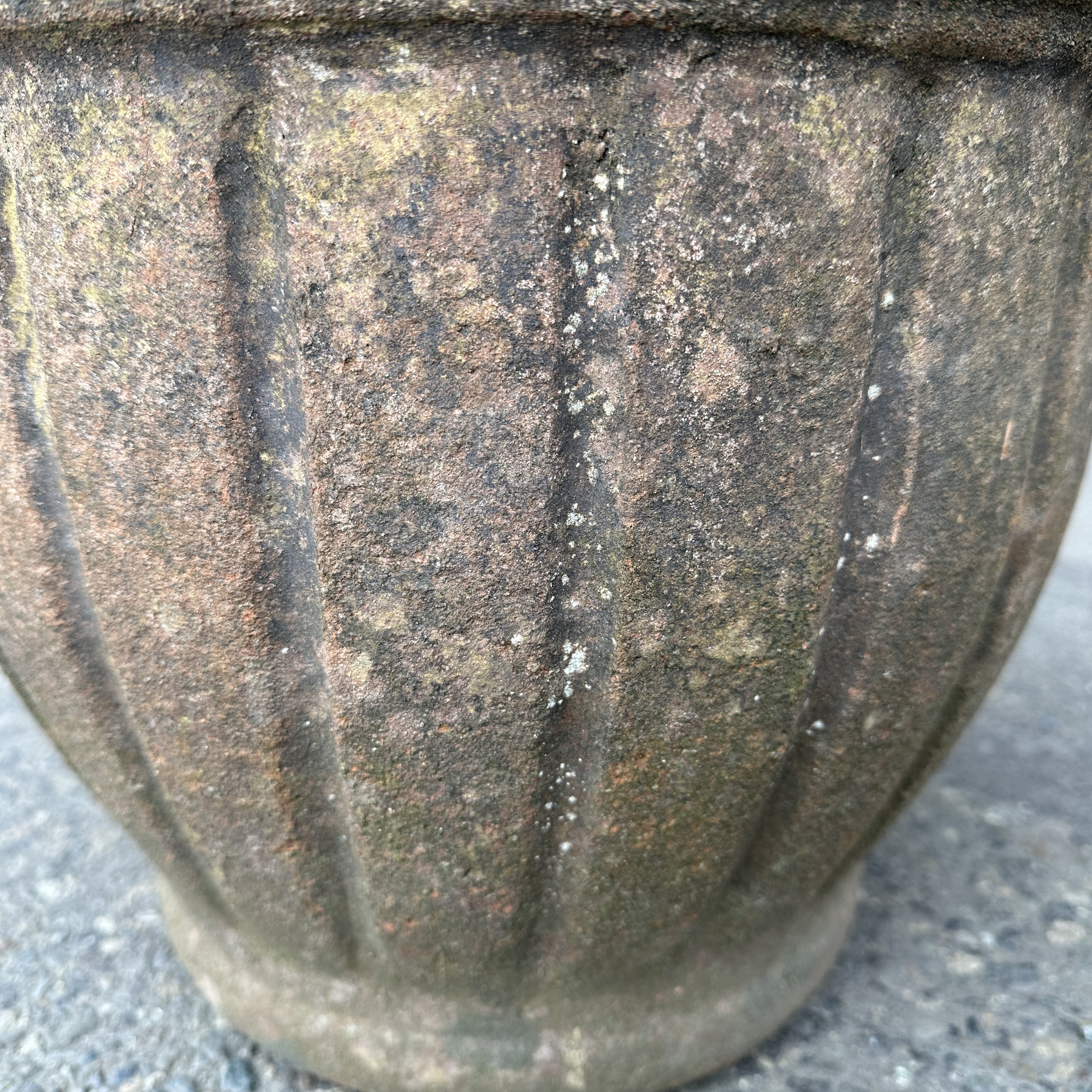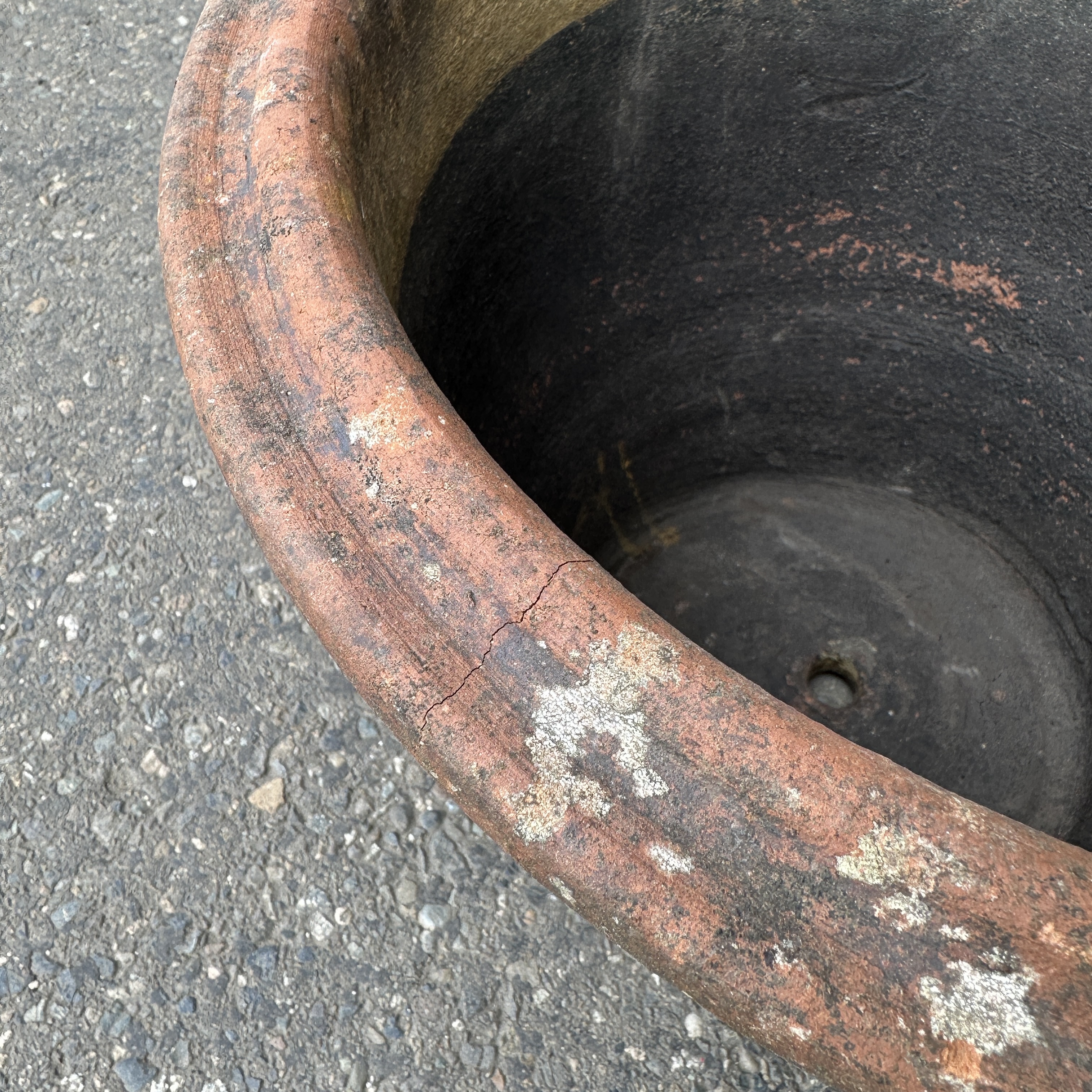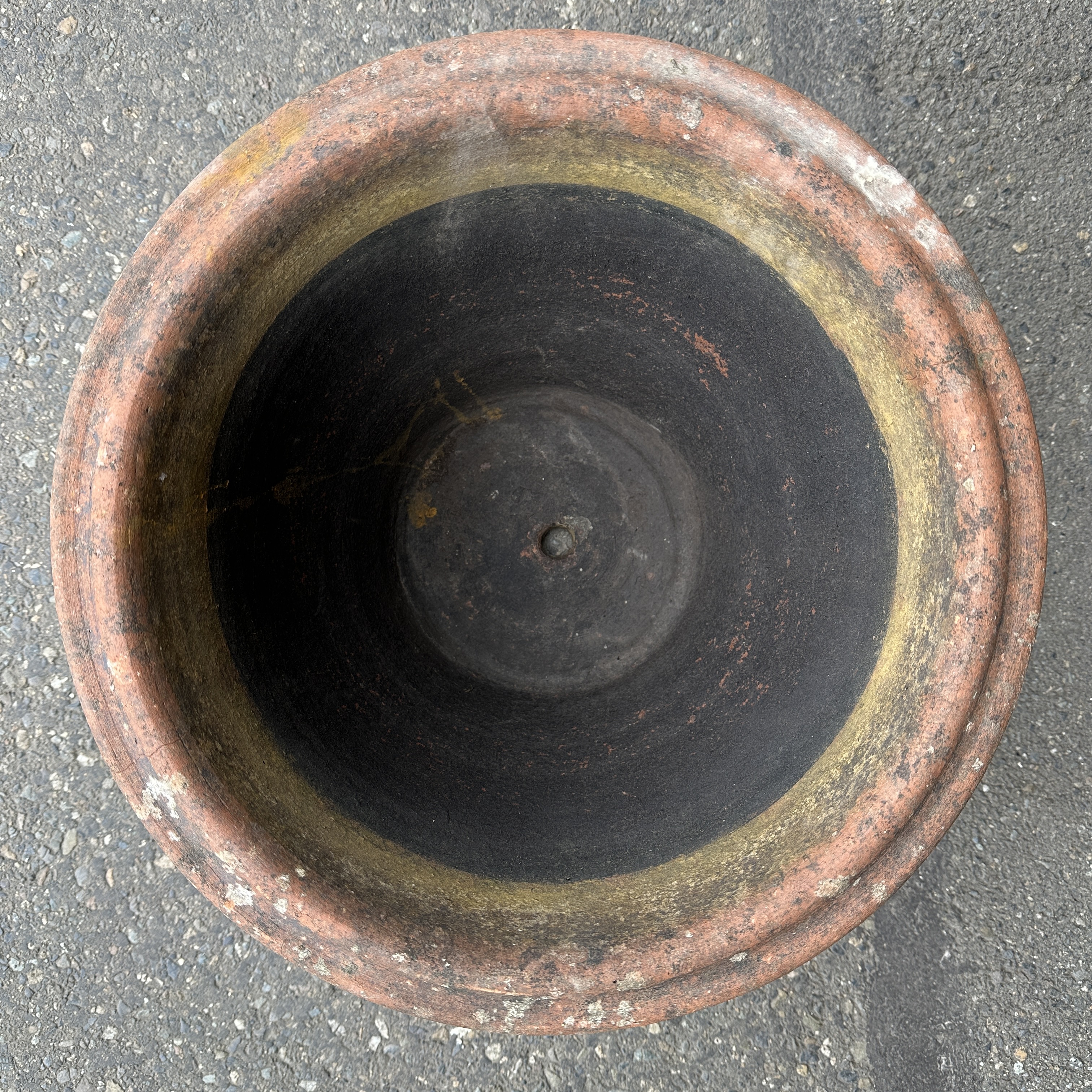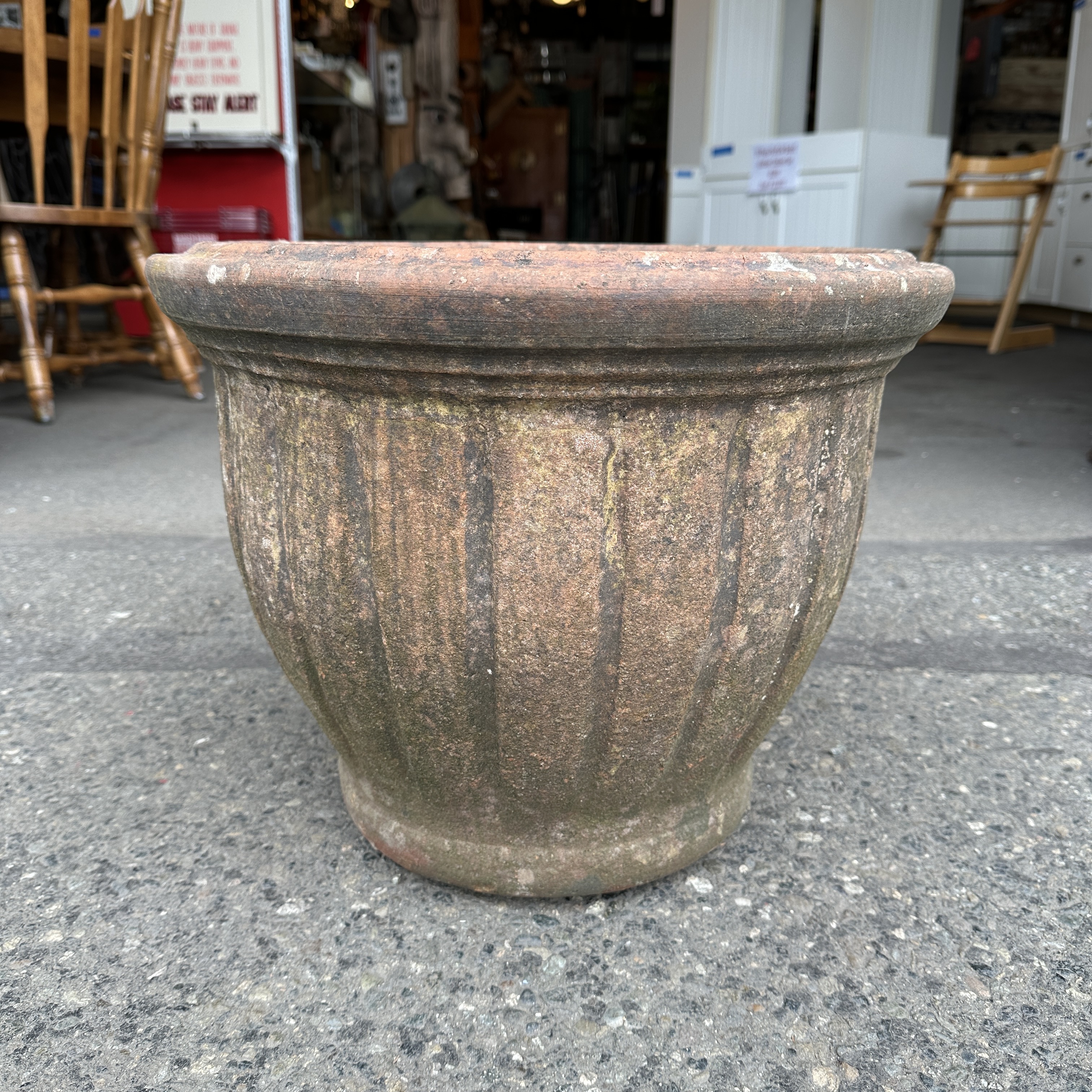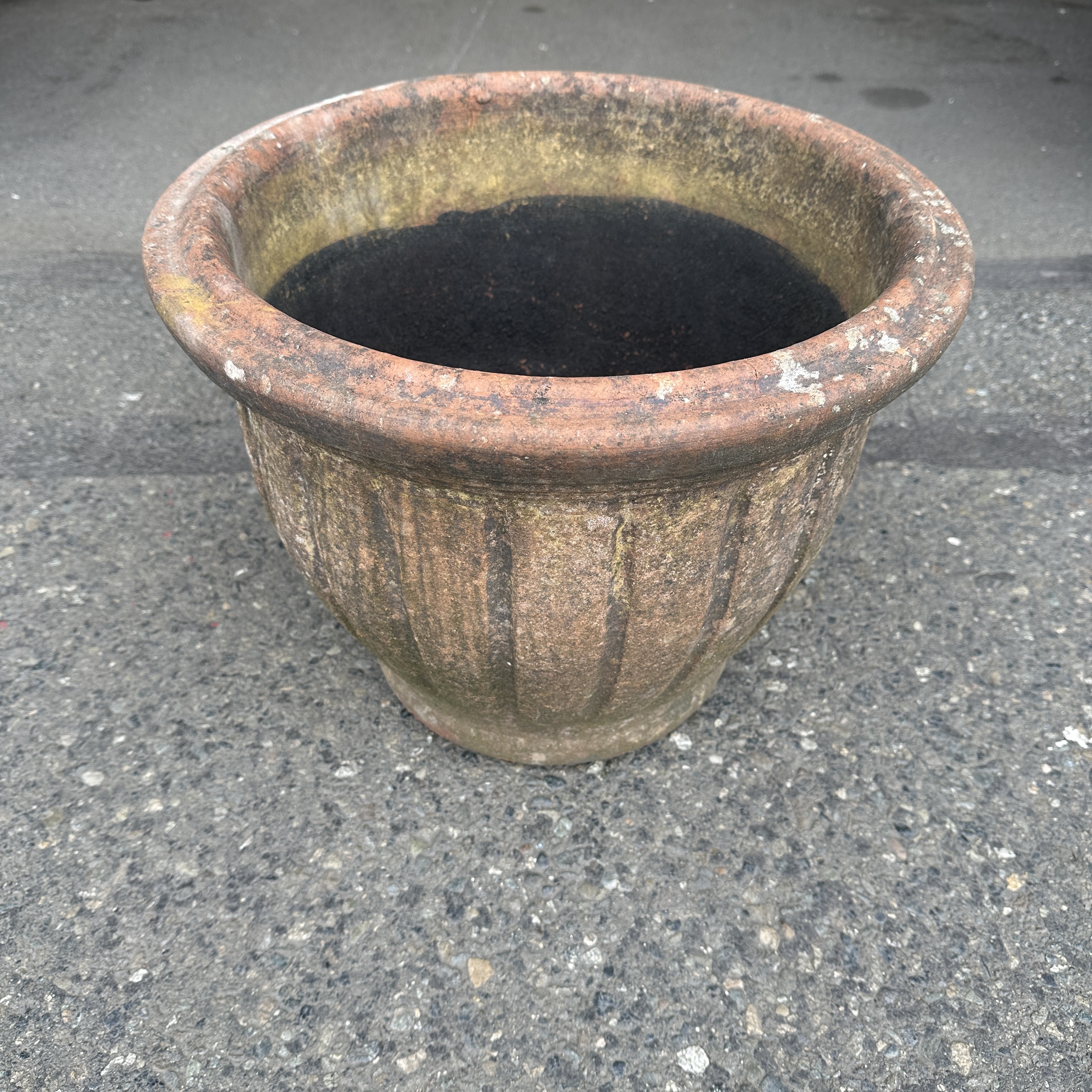 Vintage ribbed terracotta pot in decent condition. Has one hairline crack and a small chip but doesn’t seem unstable. It has one, 1 inch drainage hole in the center and lots of patina/small lichens.
