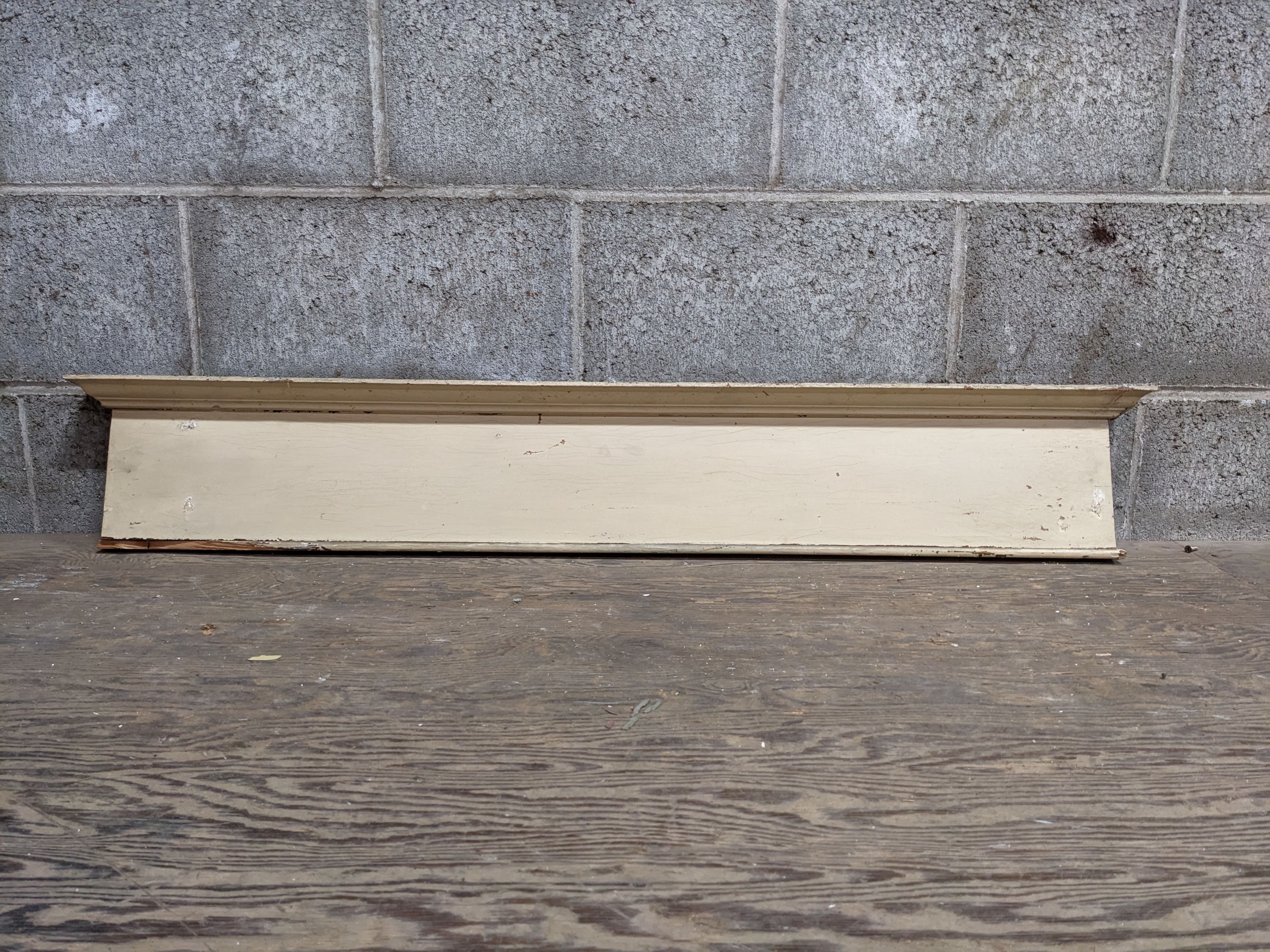 This vintage cornice has been heavily painted and has a few chips in the paint and some nail holes from previous installation. In good condition overall. It measures 44.50 x 7 x 2.25 inches.