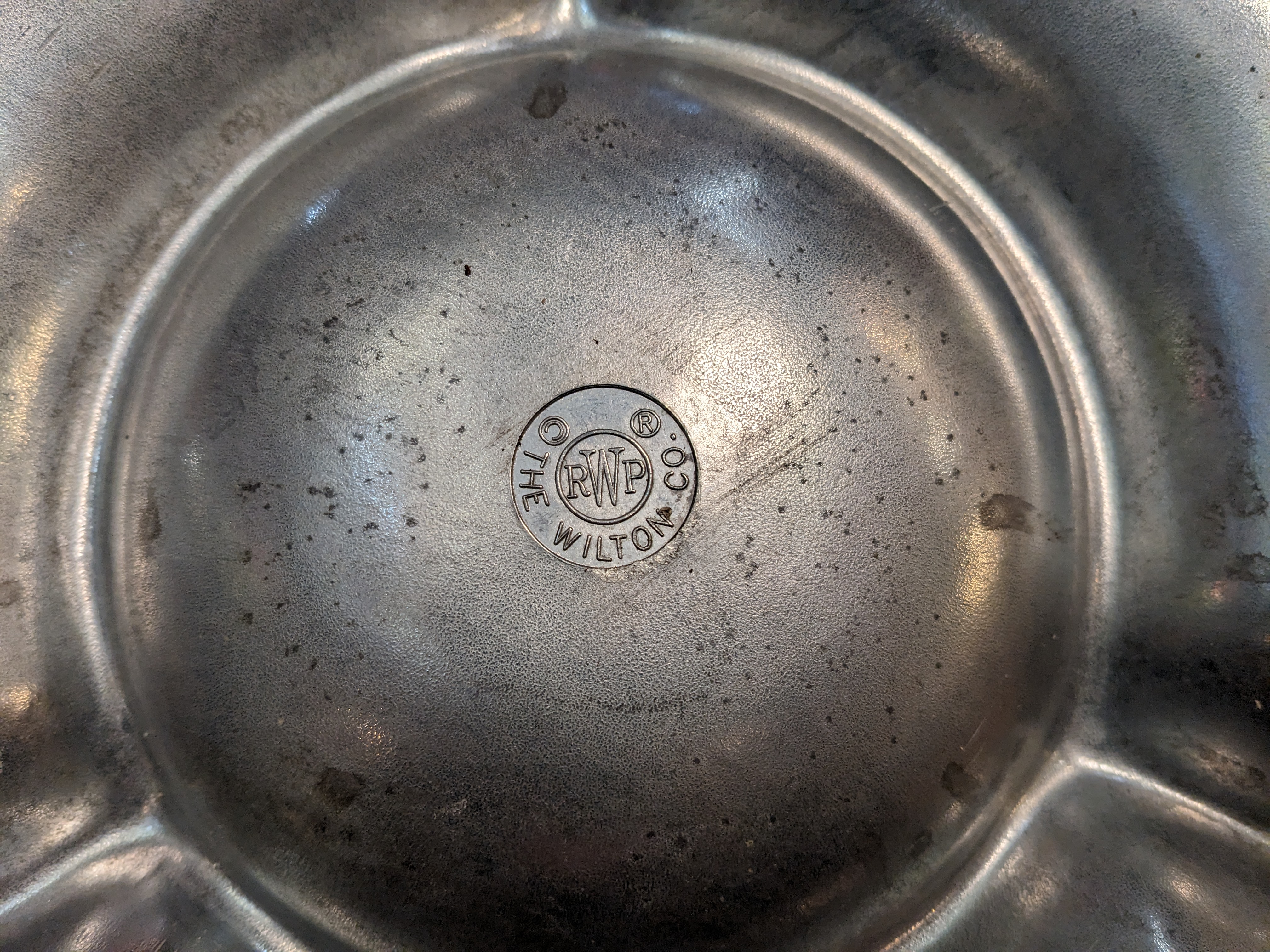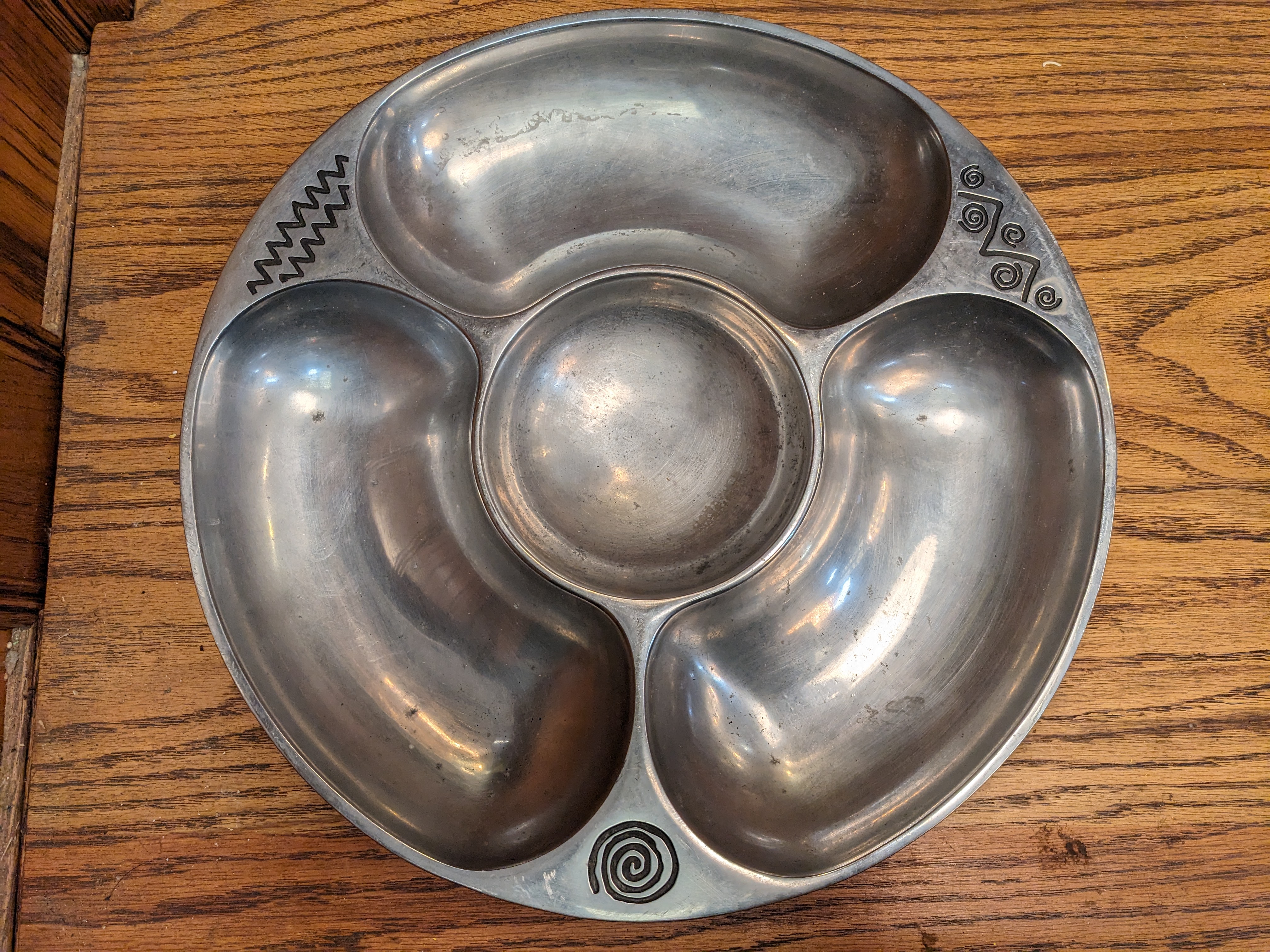 This platter has three bean shaped spaces for chips or veggies and a circle in the middle for your dip of choice.