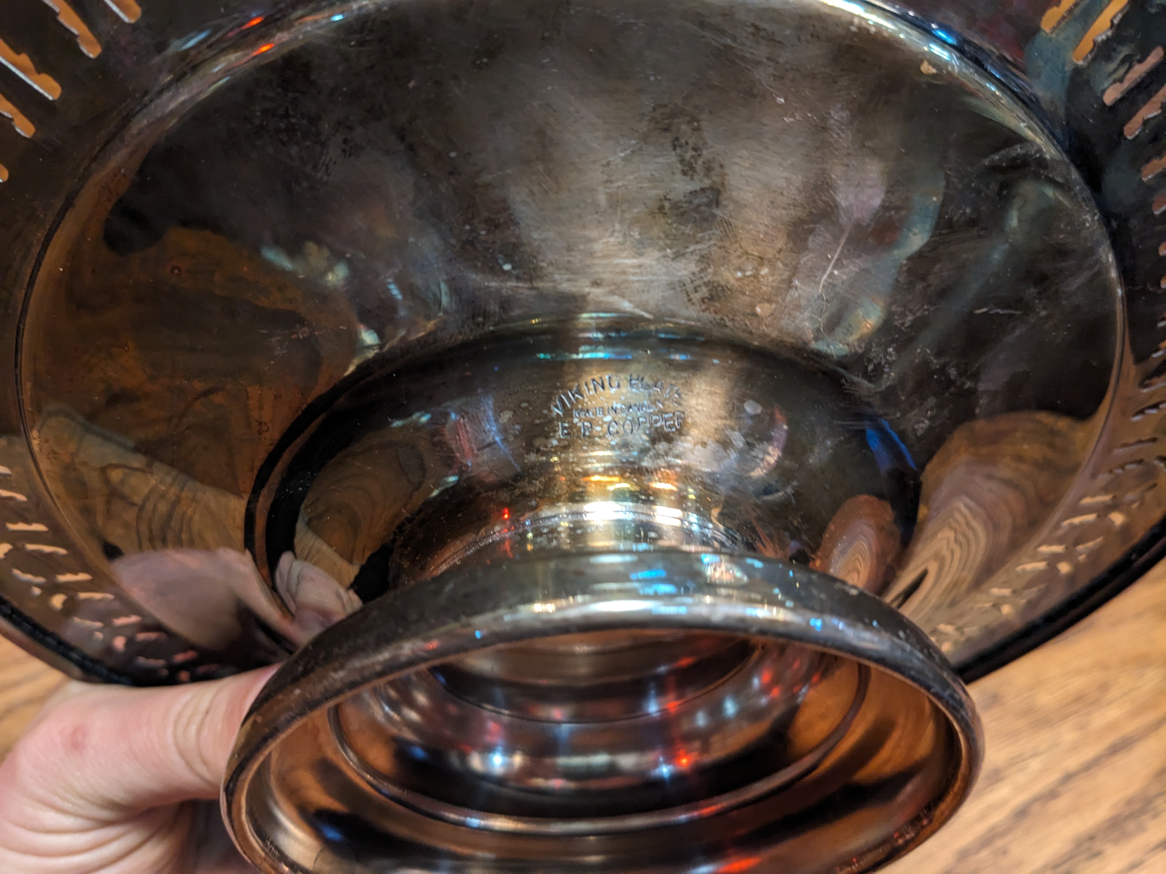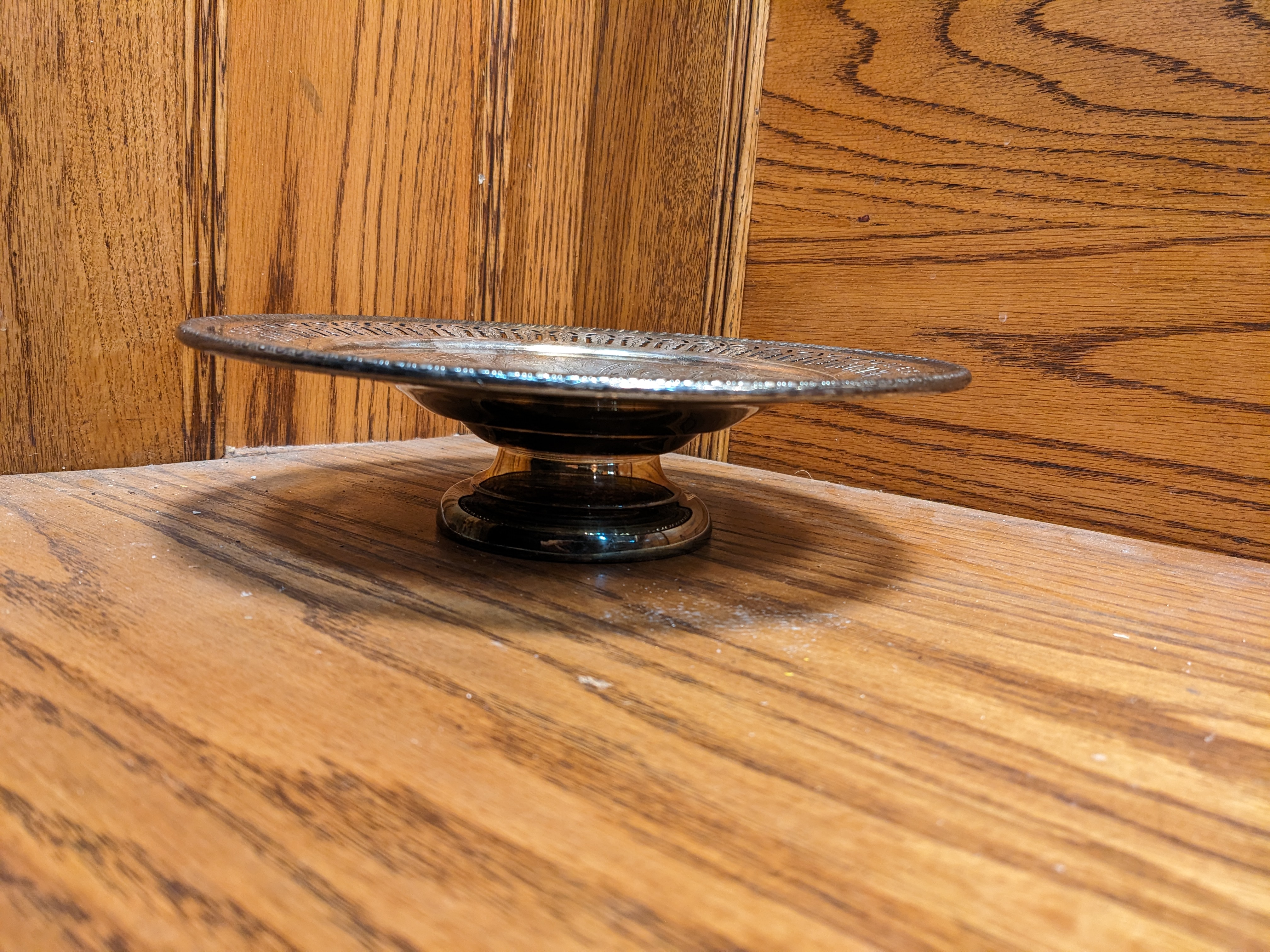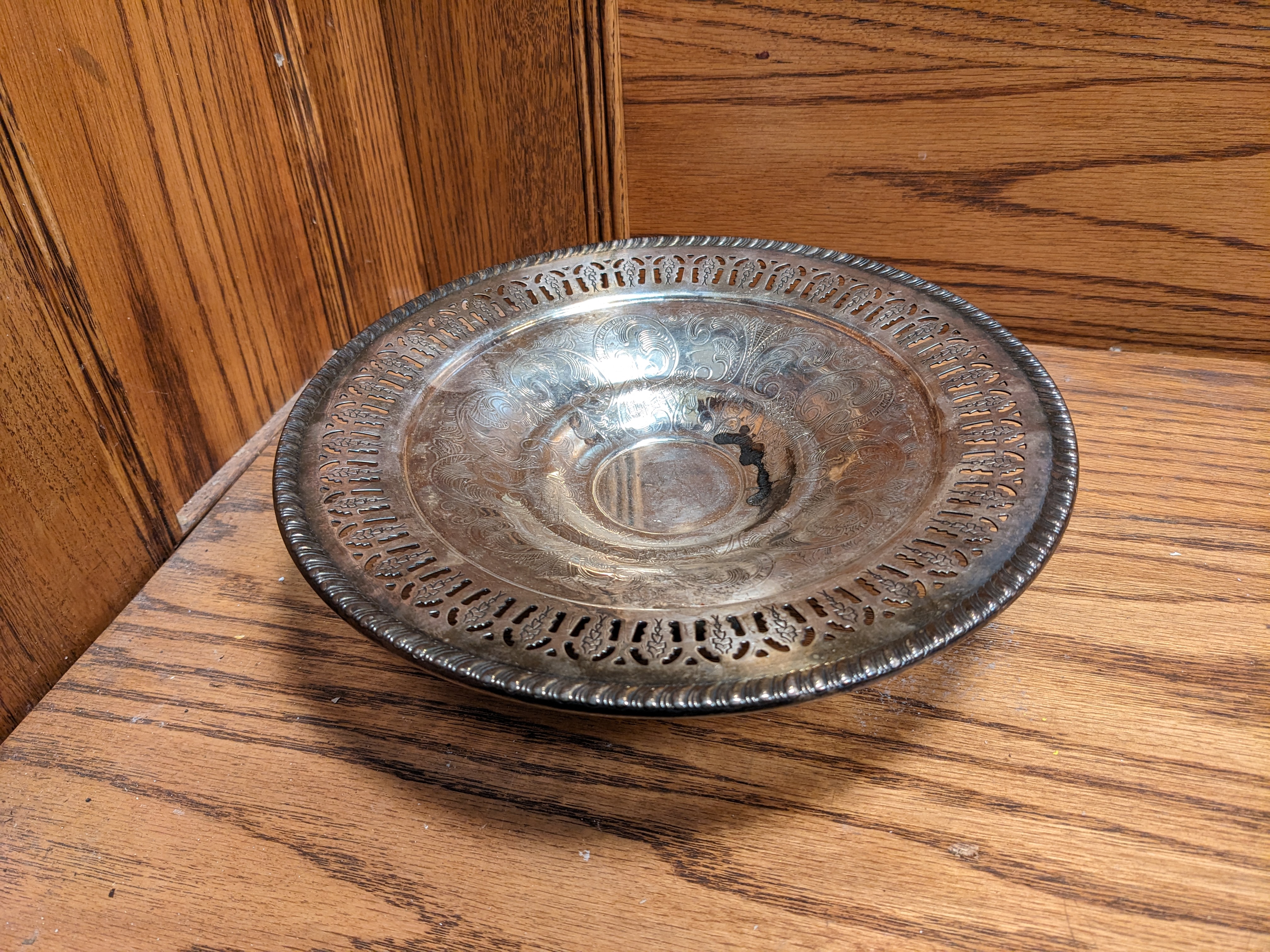 This ornate dessert dish was made by Viking Plate out of electroplated copper. It features a little stand that elevates it, raised details, and lazer cut patterns around the edge. The sterling silver plating is a bit tarnished and can be cleaned with silver polish.