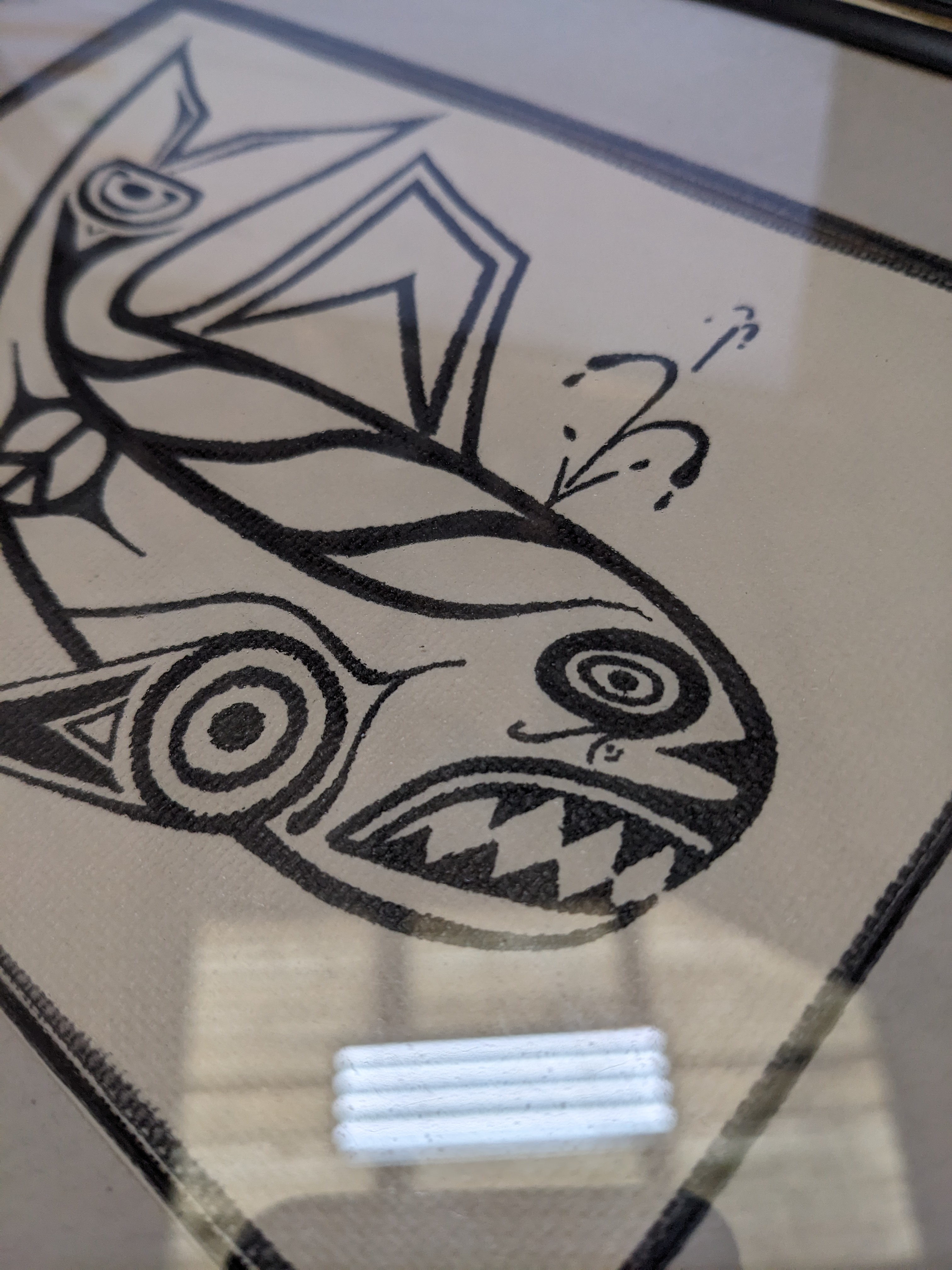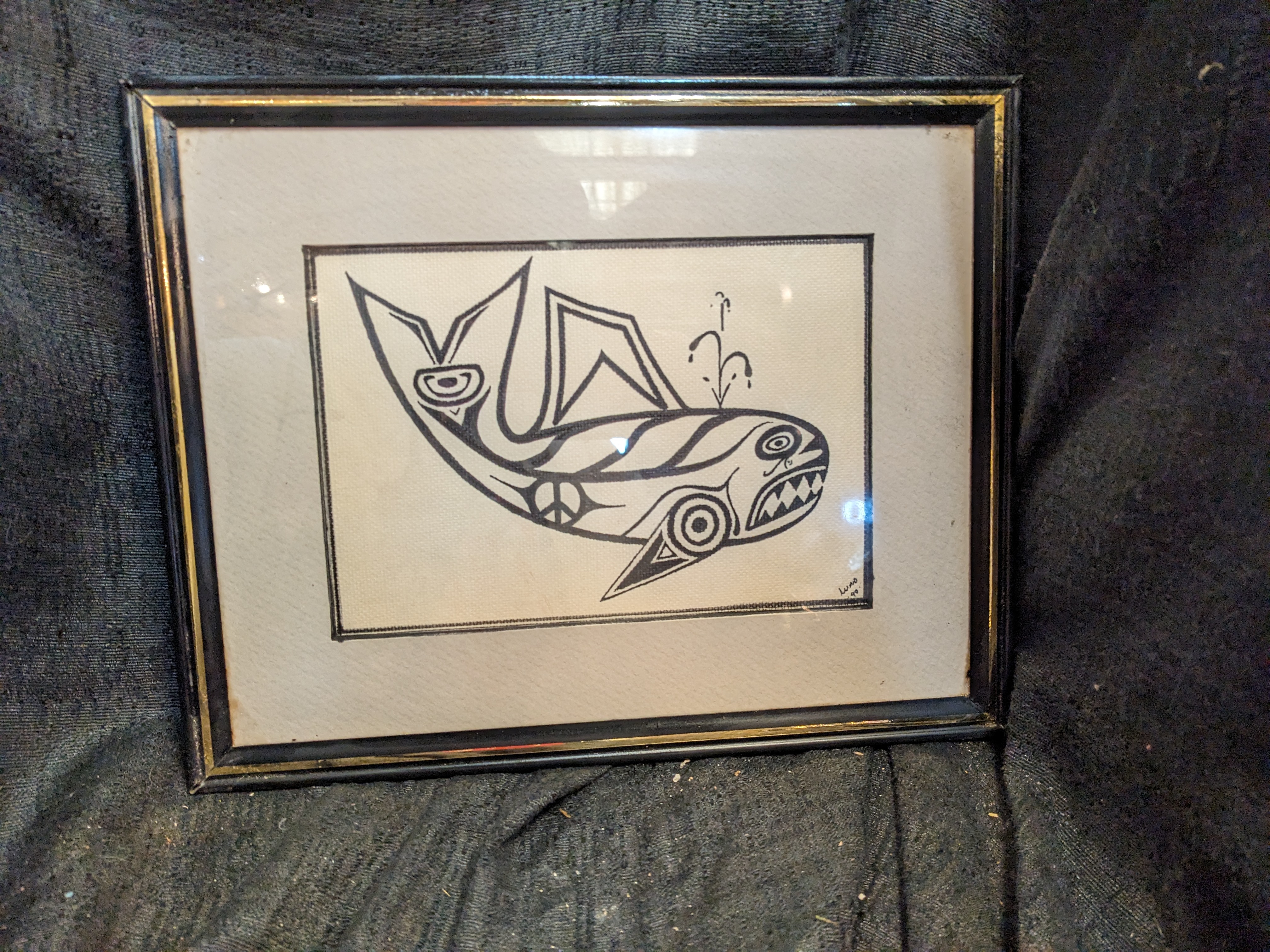 This gorgeous piece is of a black and white print whale in the traditional style of PNW native artists. It features a great stitched border and is framed in a black and gold frame. The bottom is signed Luao' 1990, but we couldn't find any information on the artist. It's even more stunning in person. It measures 10.25 x 8.25.