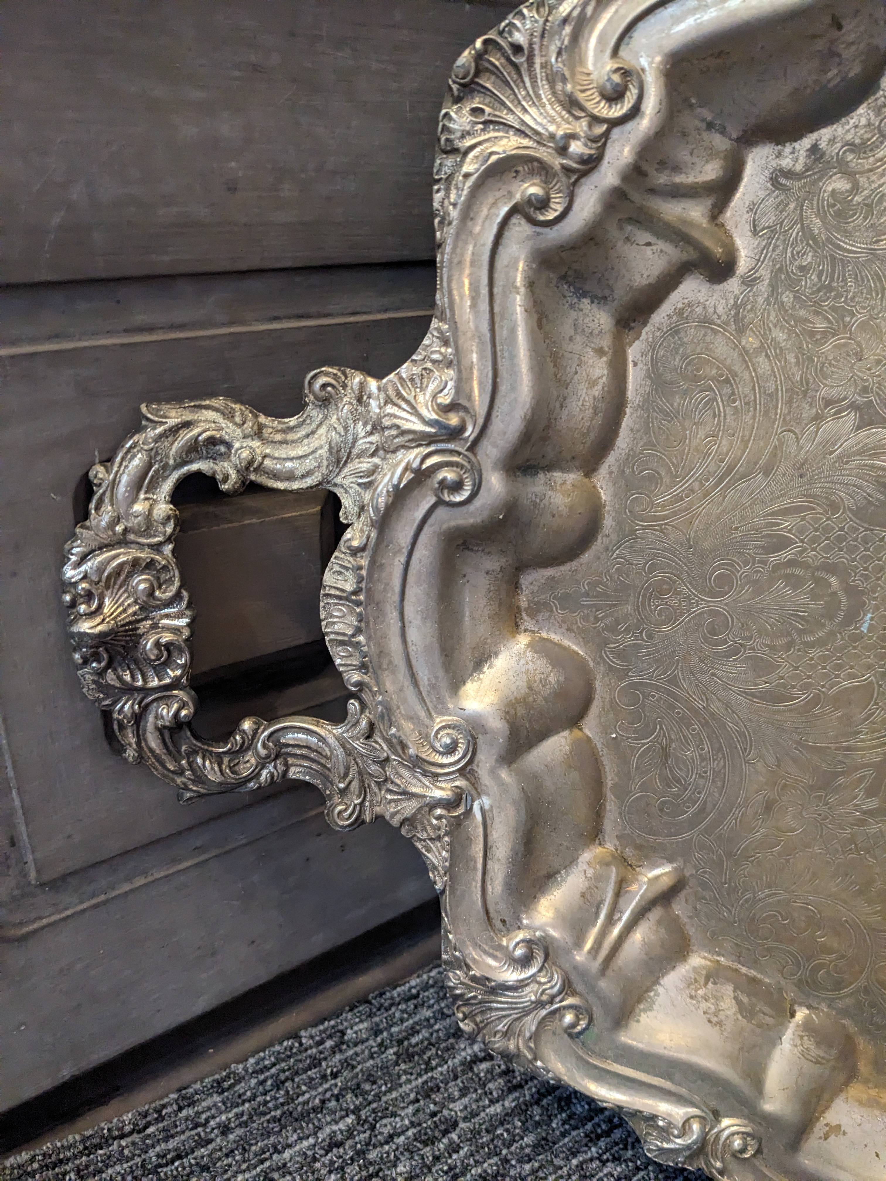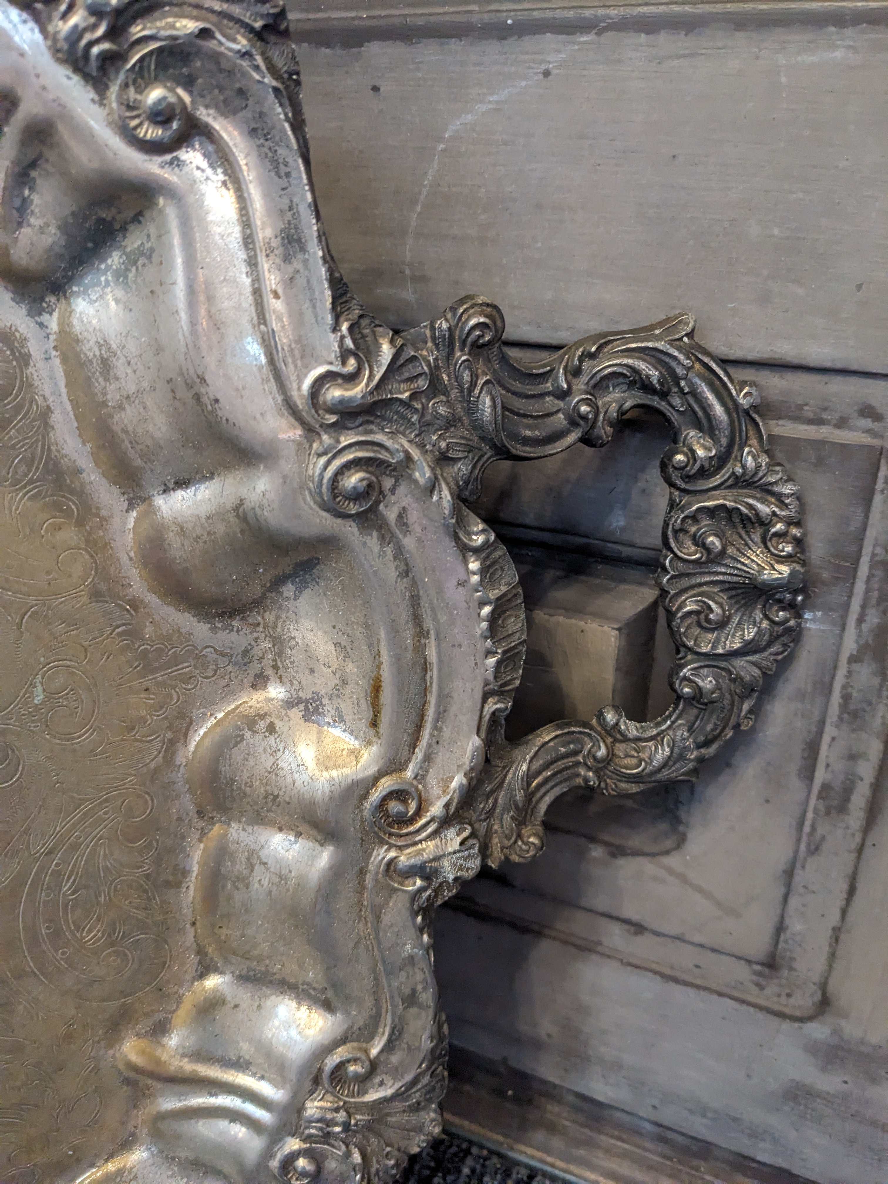 This stunning antique platter measures 28.5 x 18.5 and is in fantastic shape. It would be perfect for your dining table during tea time or as a tapered candle display.
