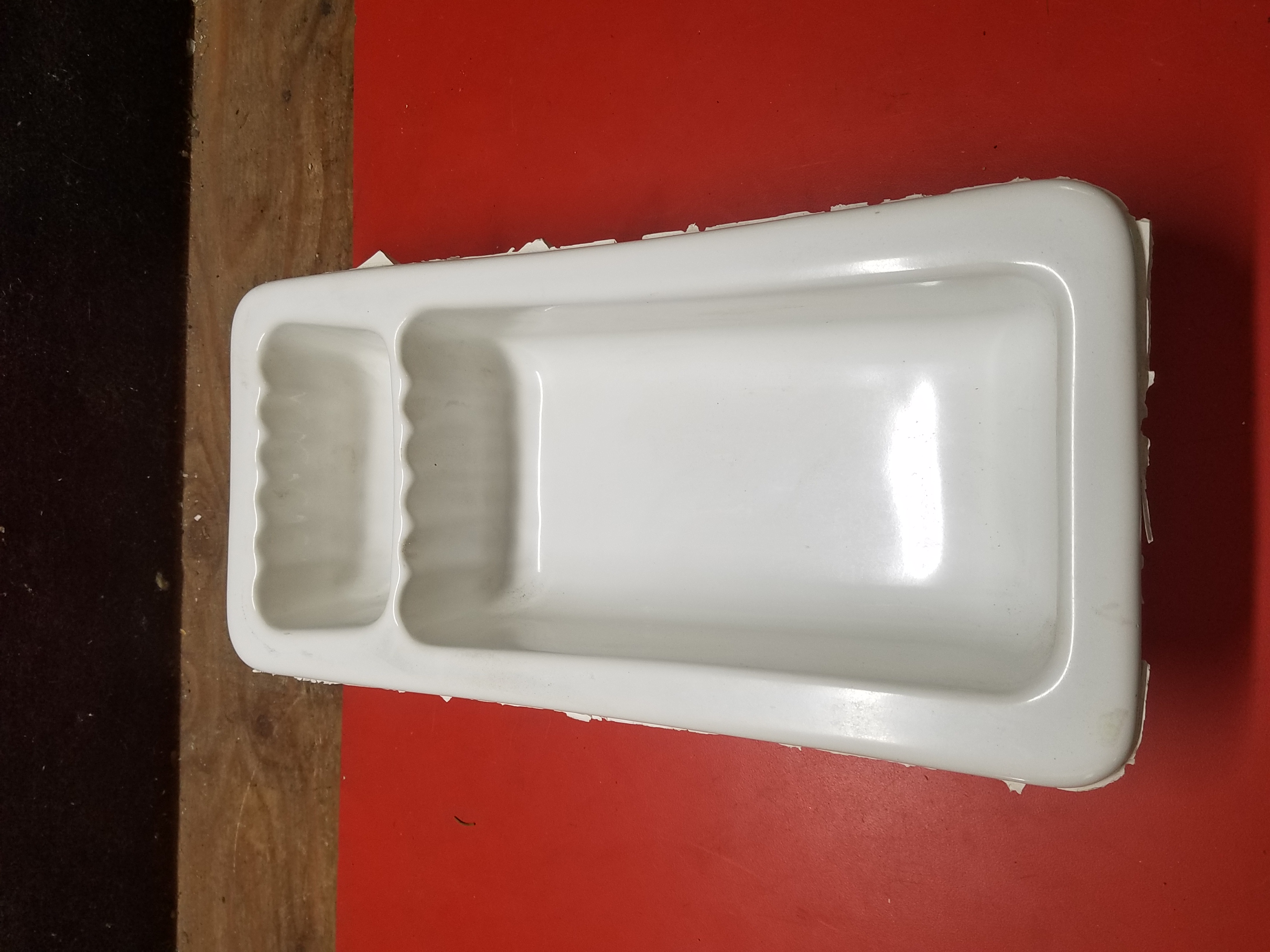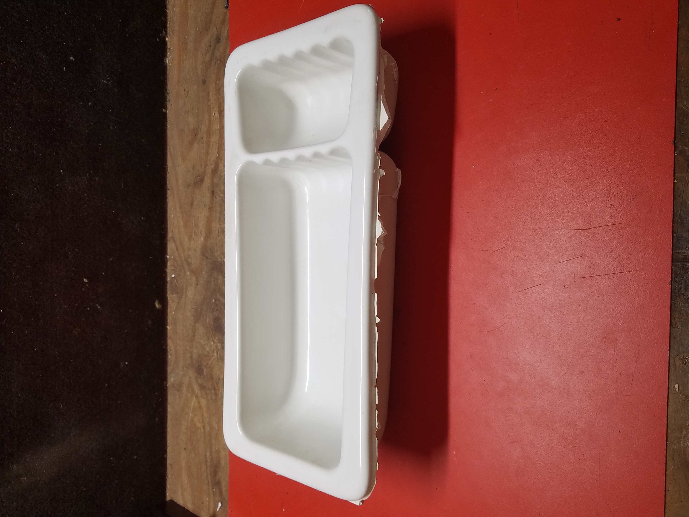 A heavy duty porcelain shampoo and soap holder.