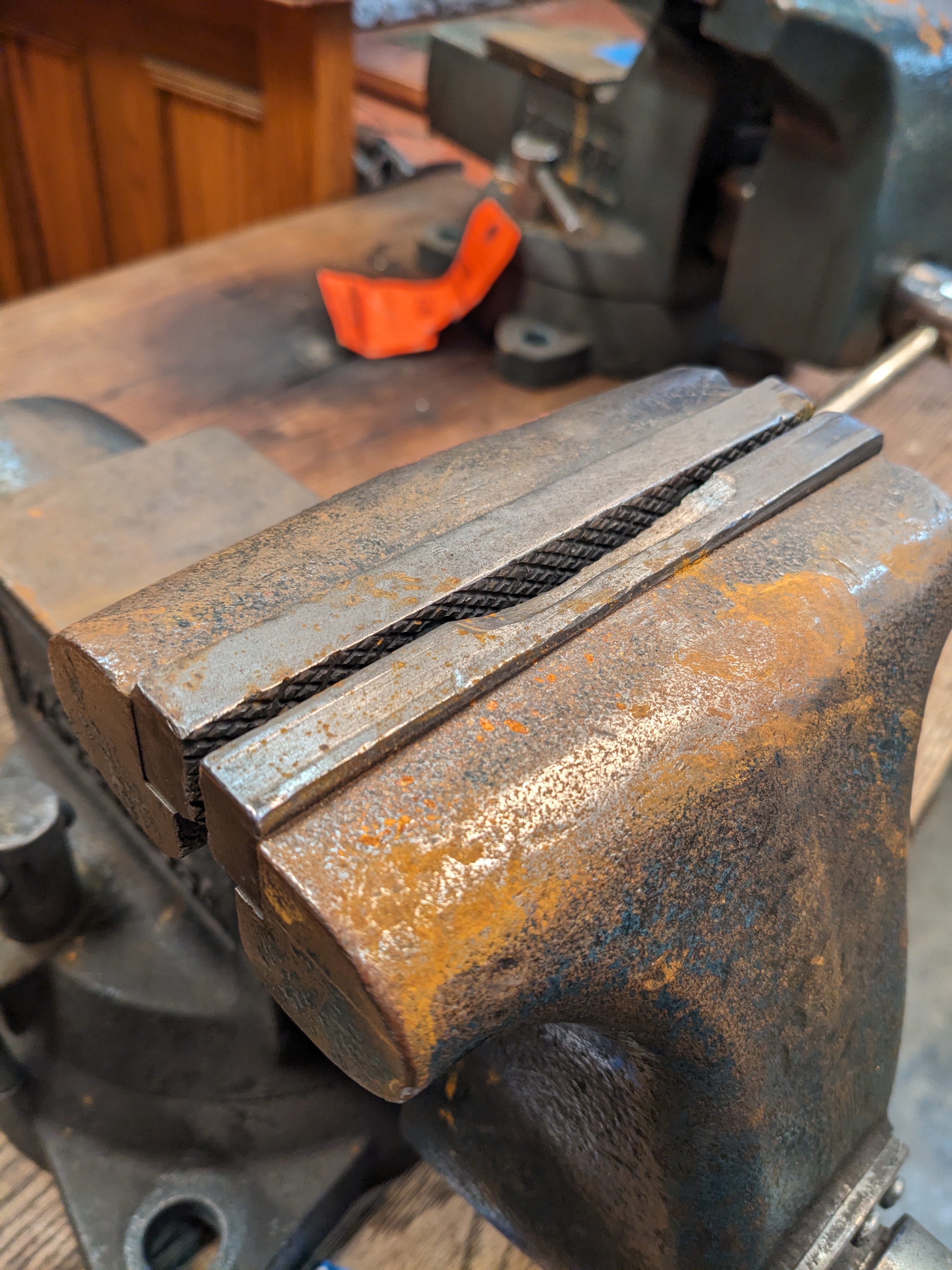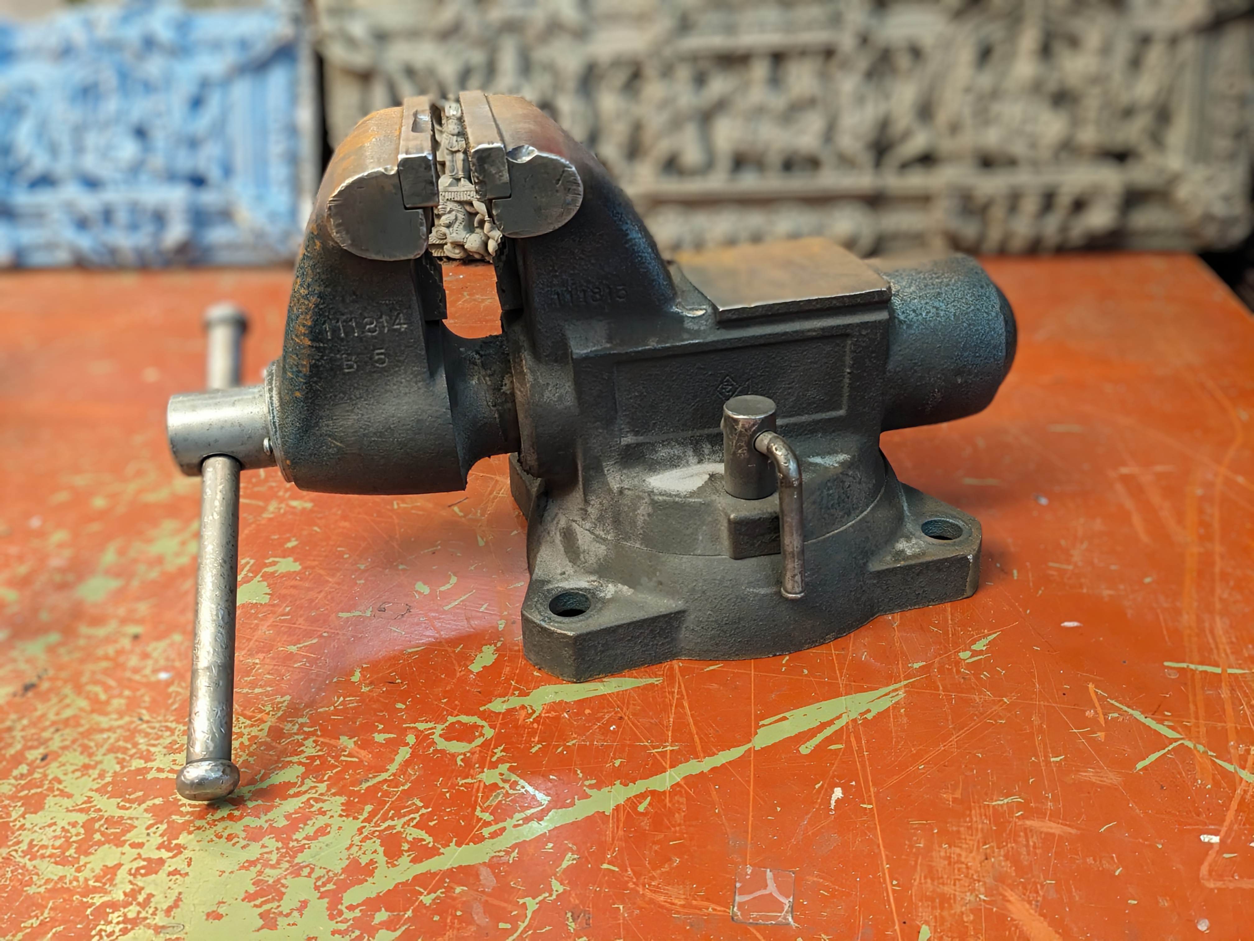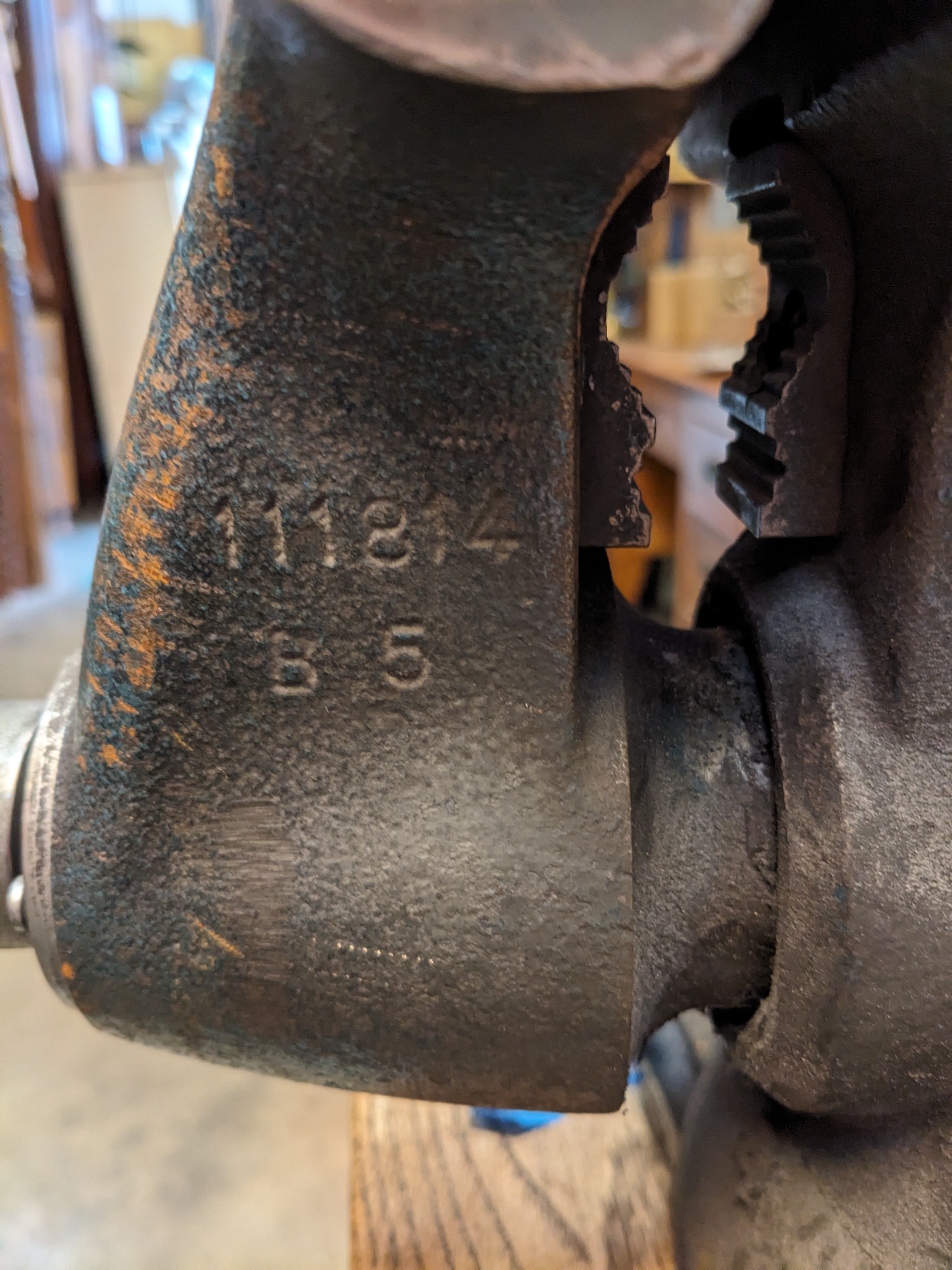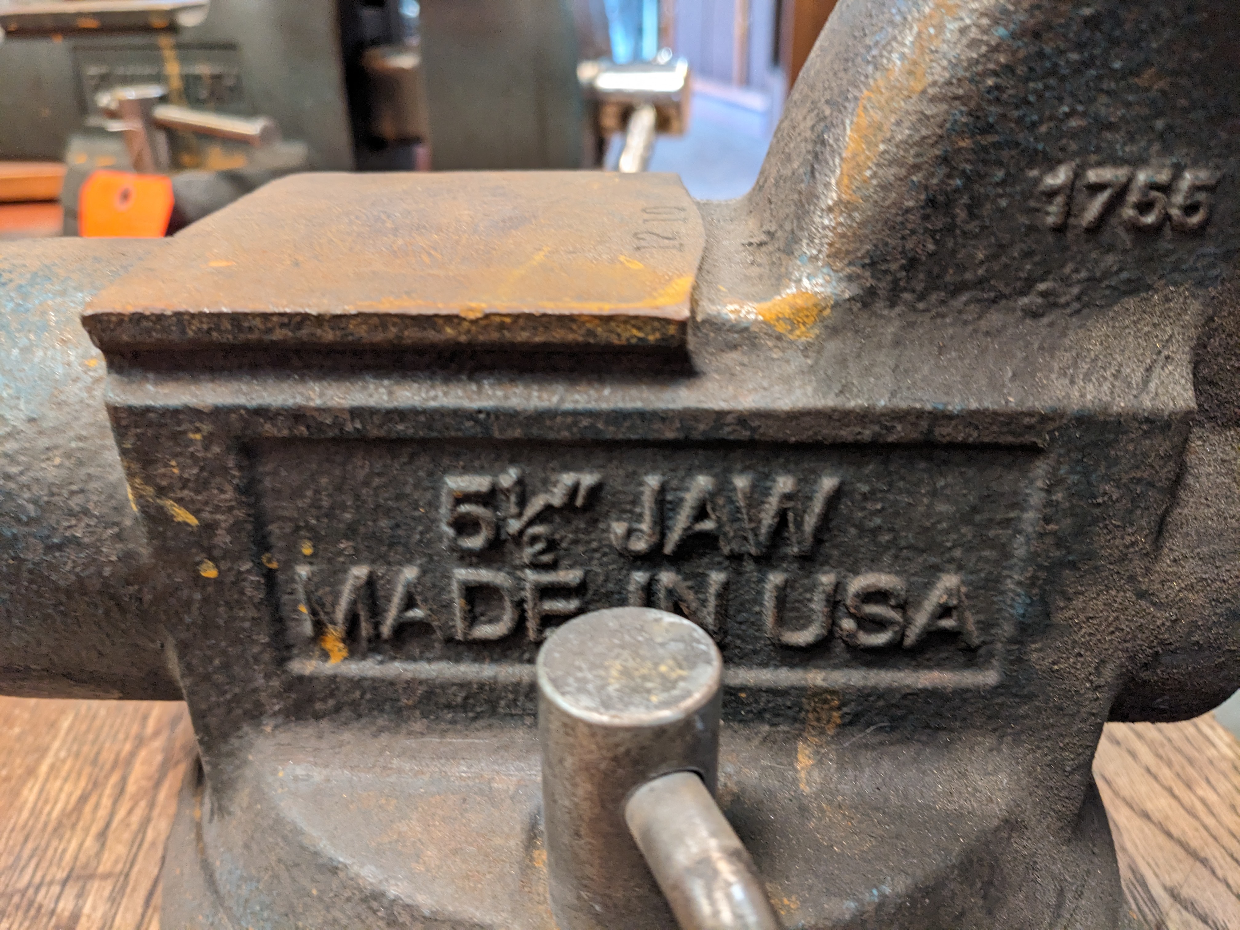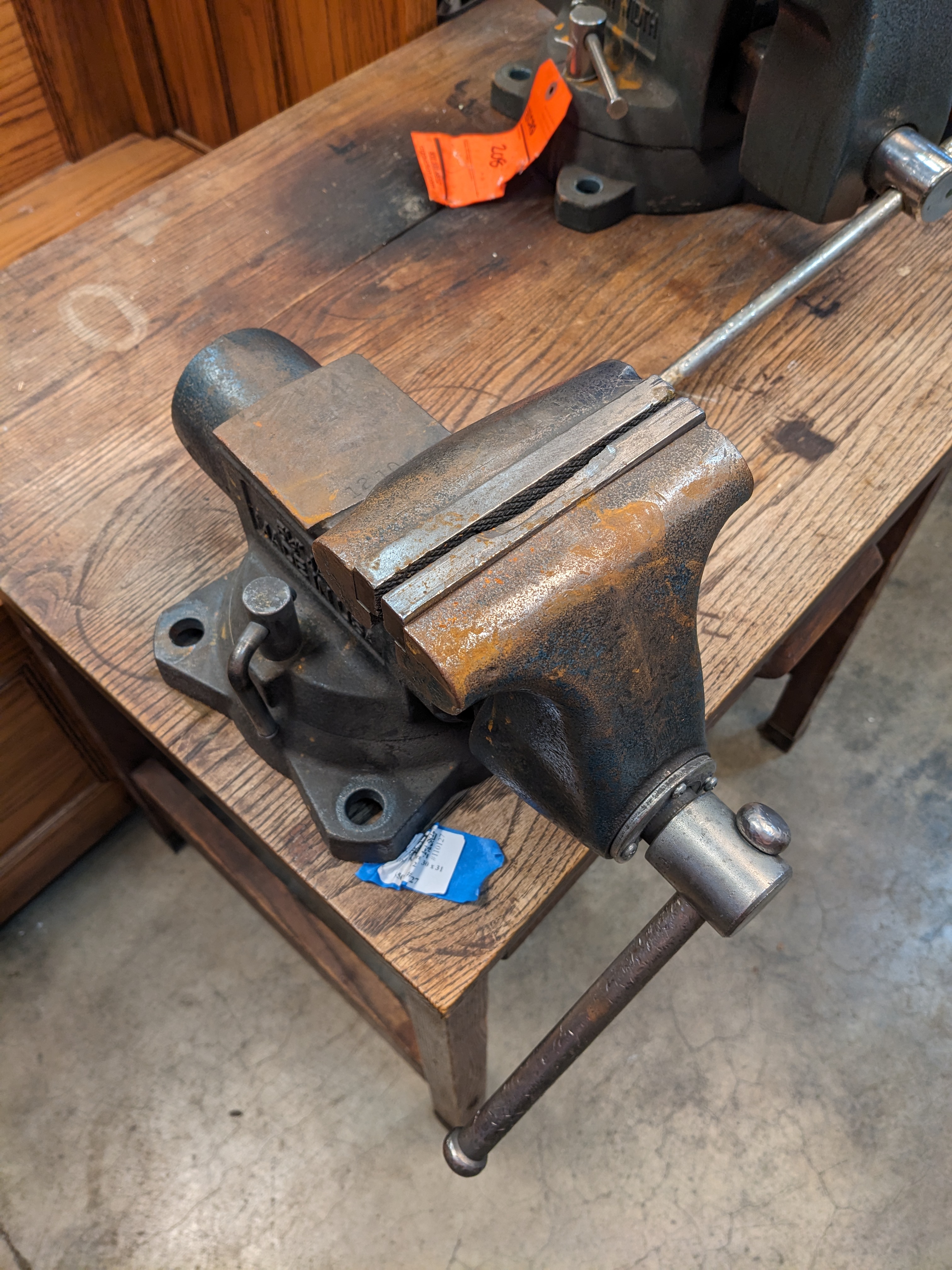 This Wilton 5.5 Inch Bullet Bench Vise is heavy duty and industrial. This piece was salvaged from an old bottle manufacturing company. Combination bench and pipe vises feature upper jaws for holding flat workpieces and lower jaws for holding pipe and round stock. They bolt onto a workbench, tabletop, or other work surface to provide a fixed workholding station. These combo vises withstand frequent use and are typically used to secure metal workpieces for industrial, automotive, and plumbing repair, maintenance, and fabrication tasks.