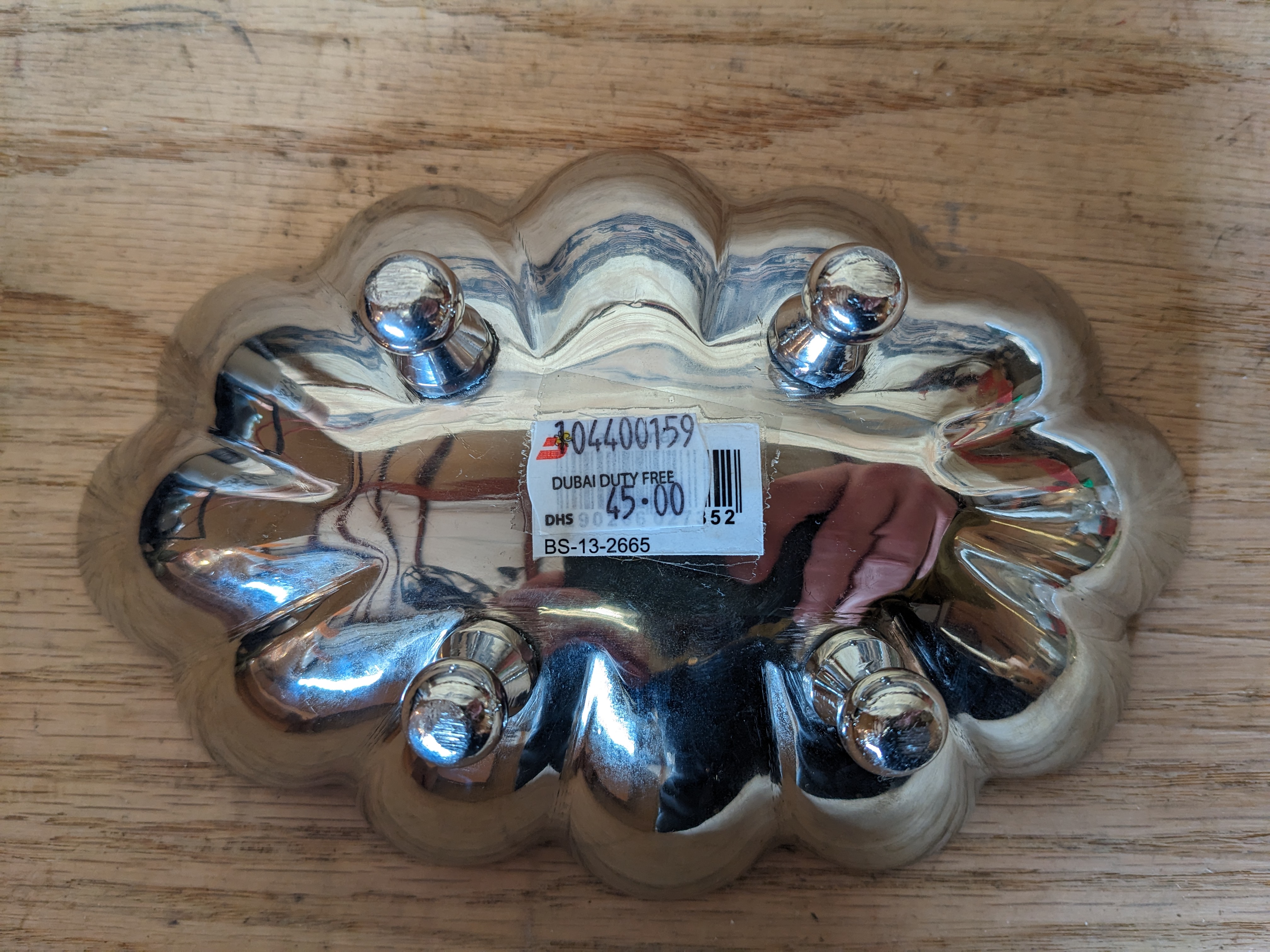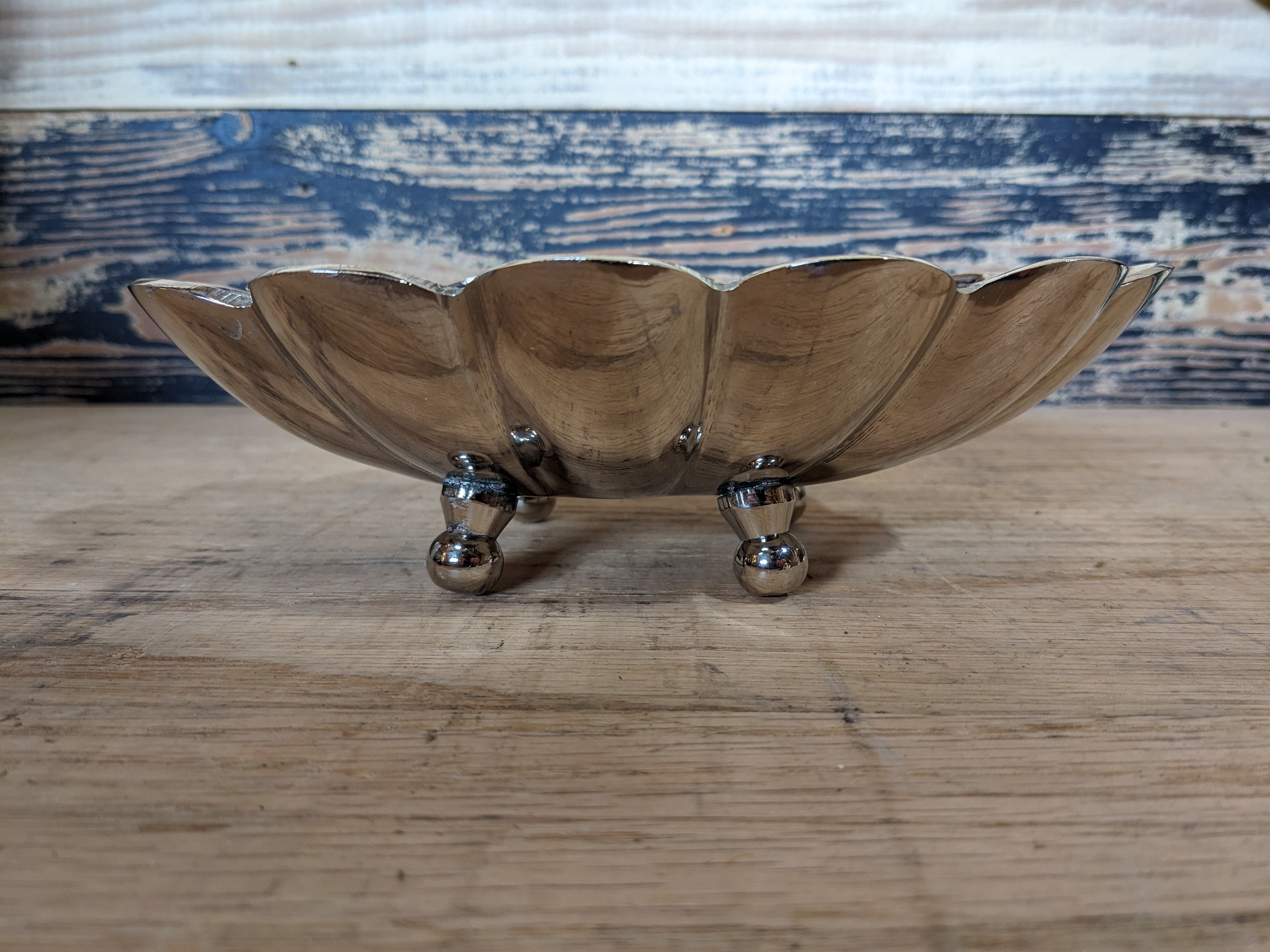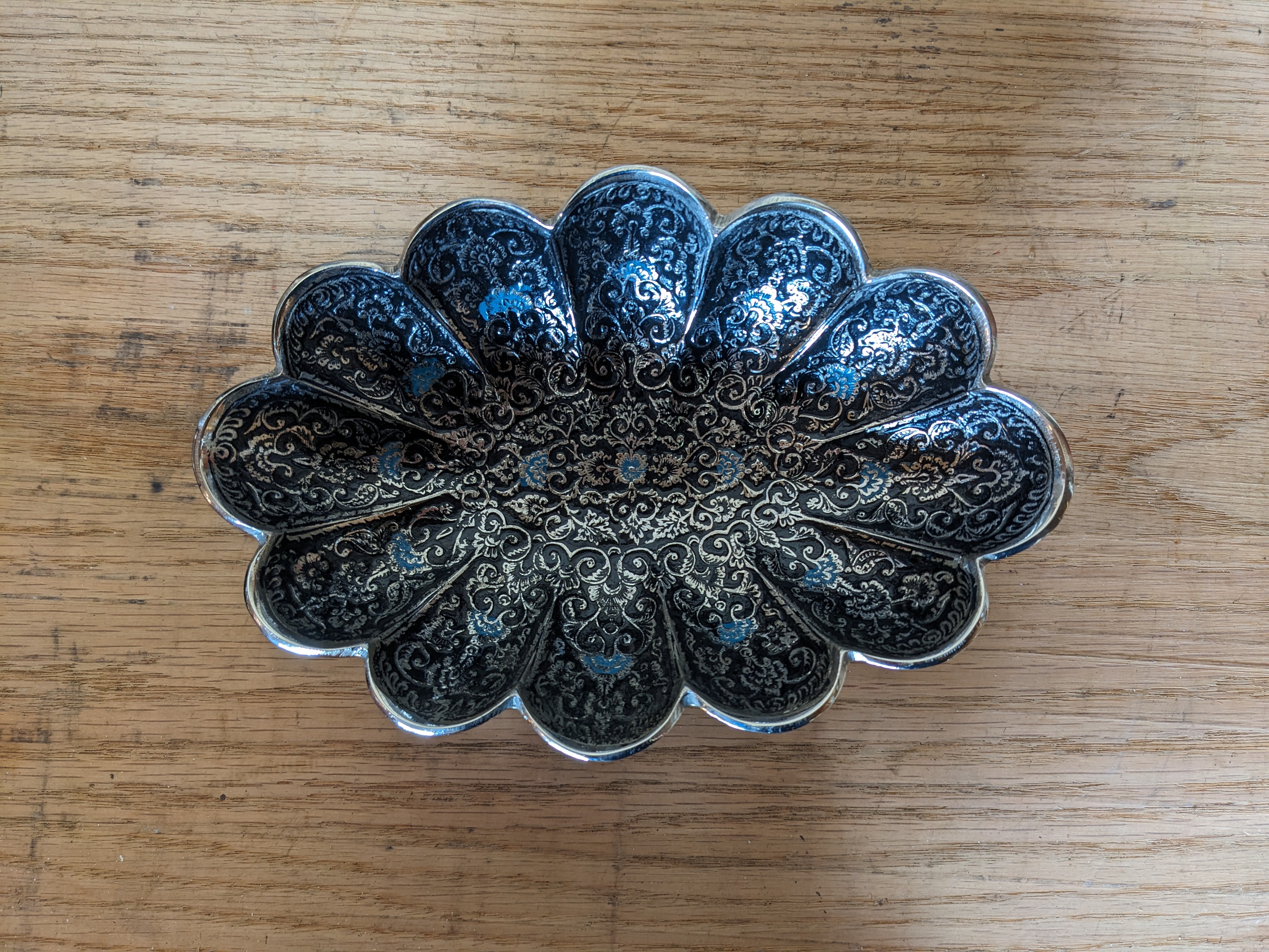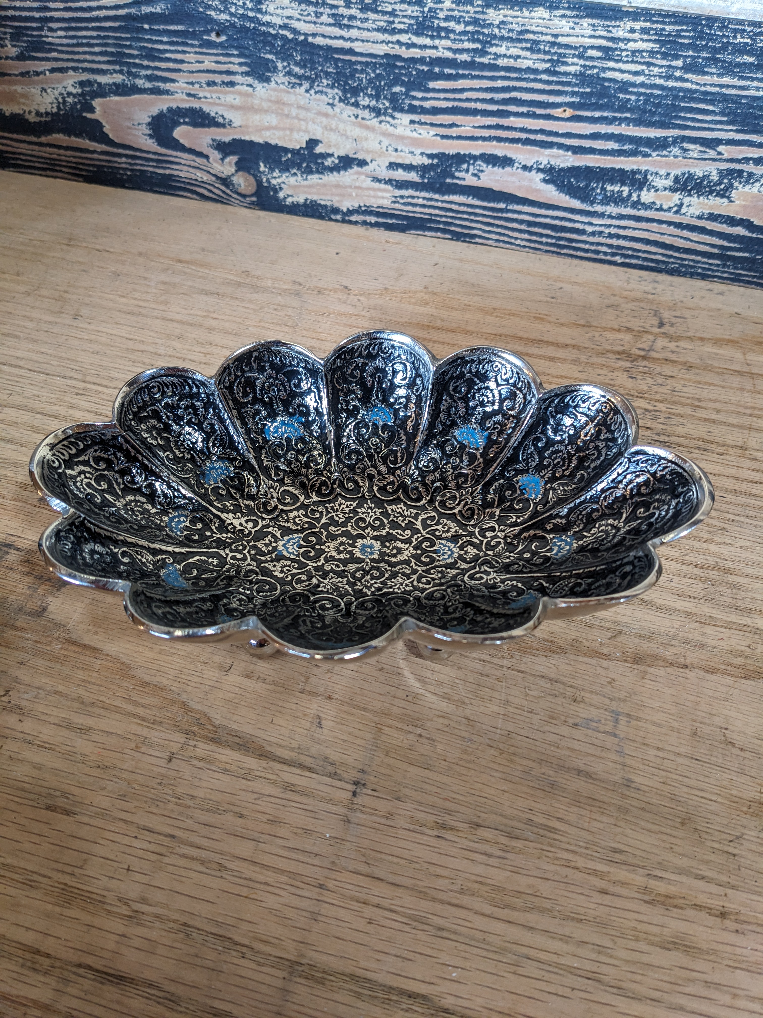 A vintage chrome plated brass & black enamel scalloped edge bonbon dish. Its of Middle Eastern origin, with fine detail.