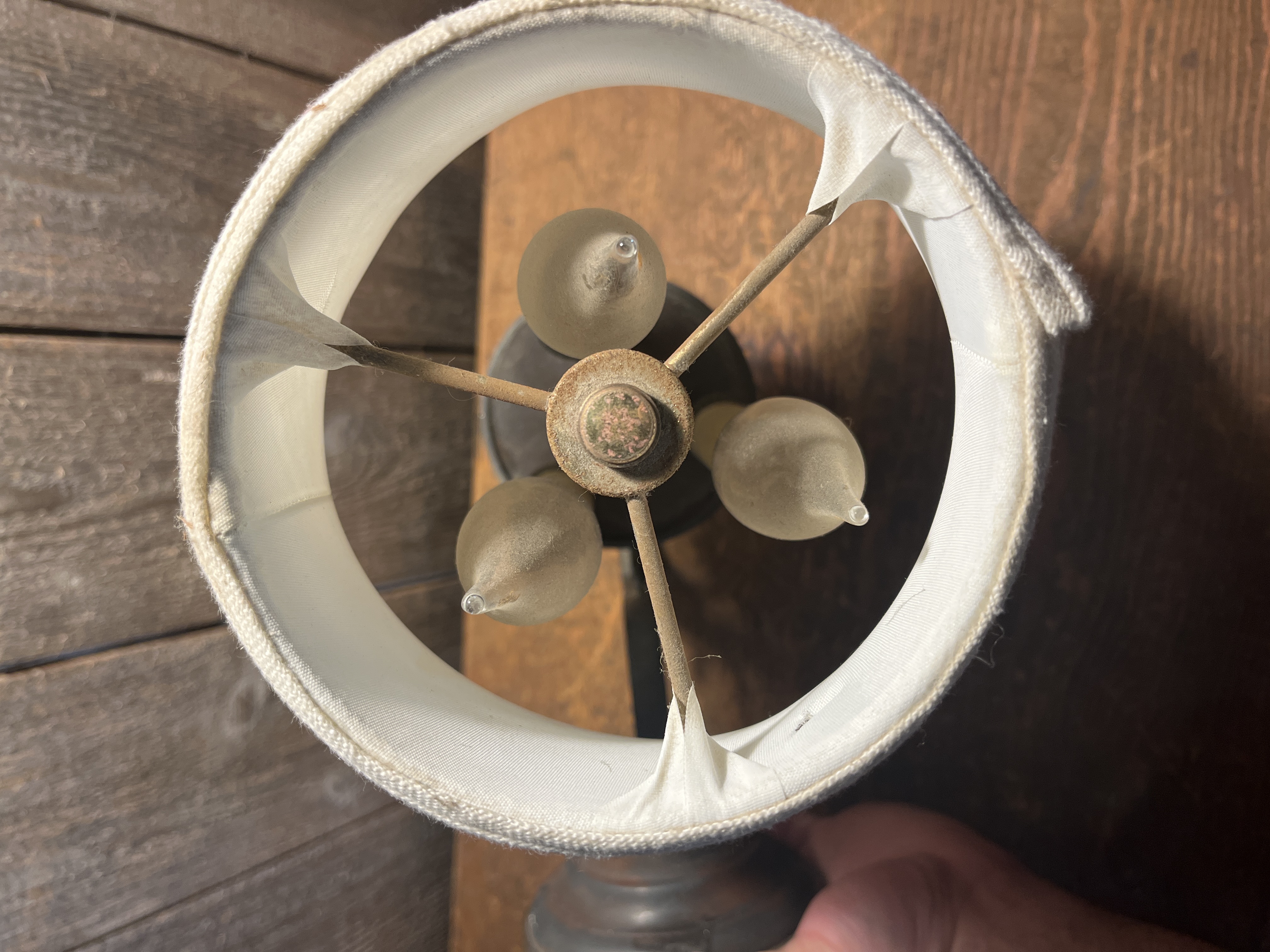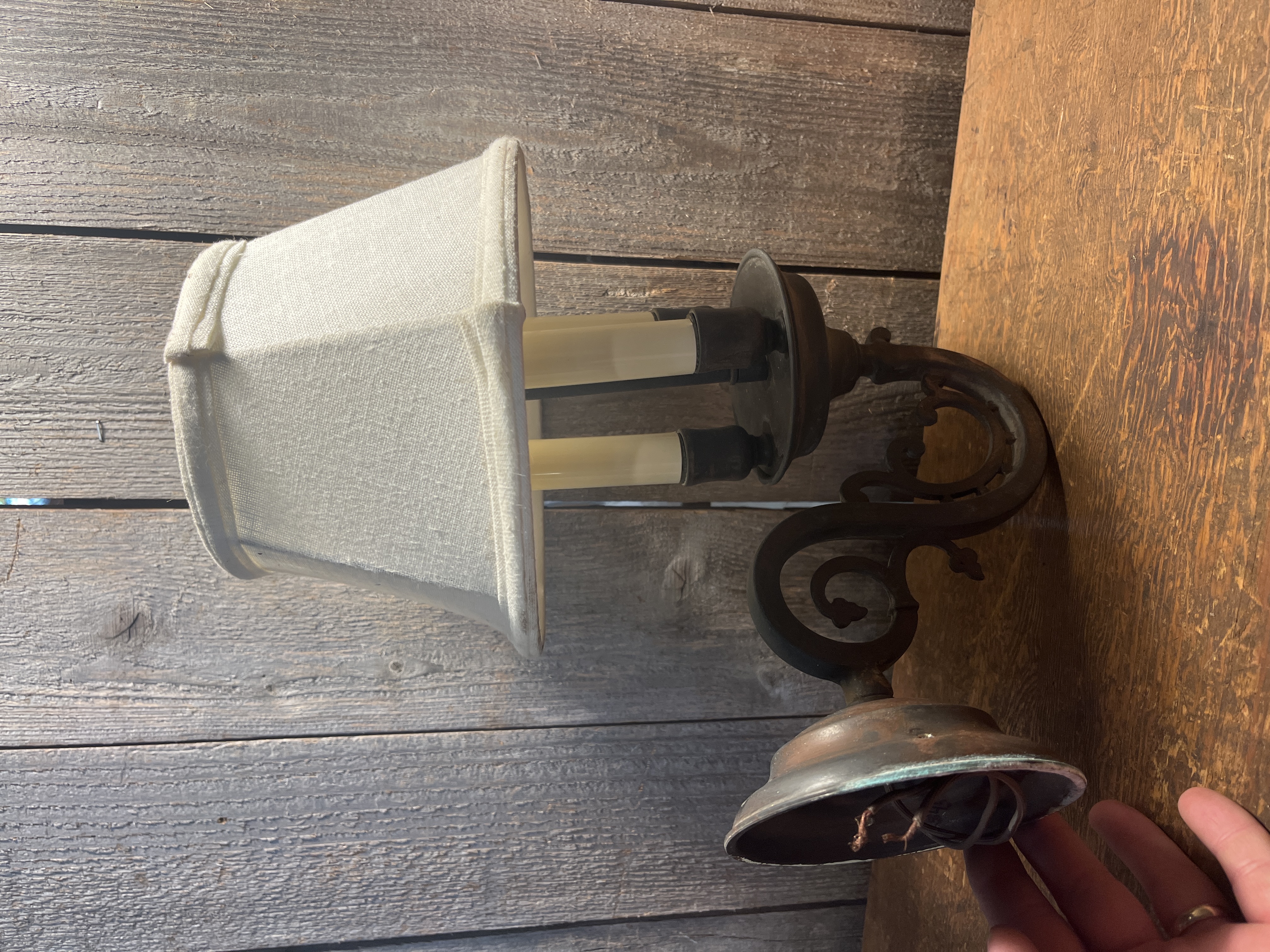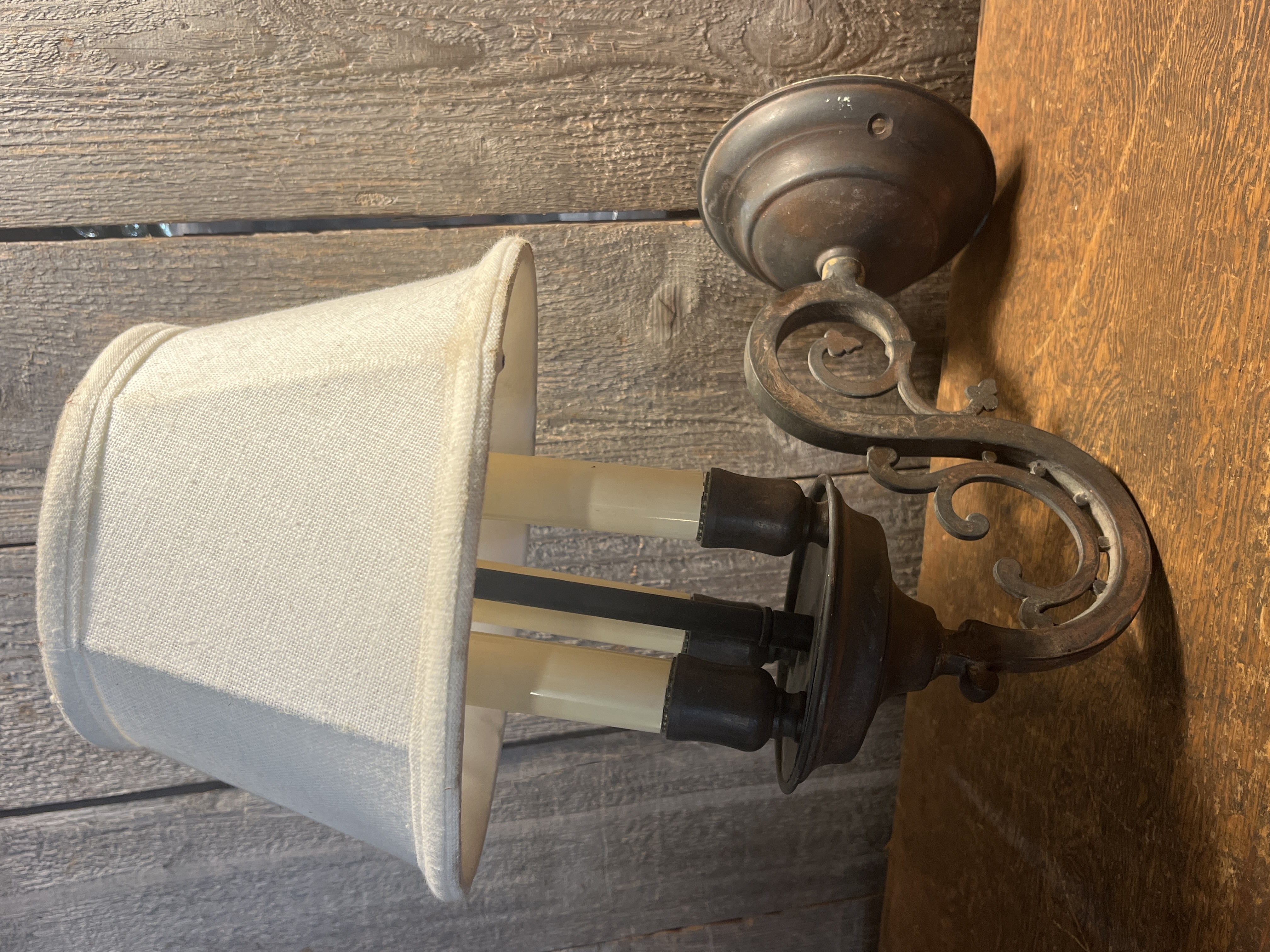 Rustic little sconce with three faux candlesticks and a lampshade style topper.