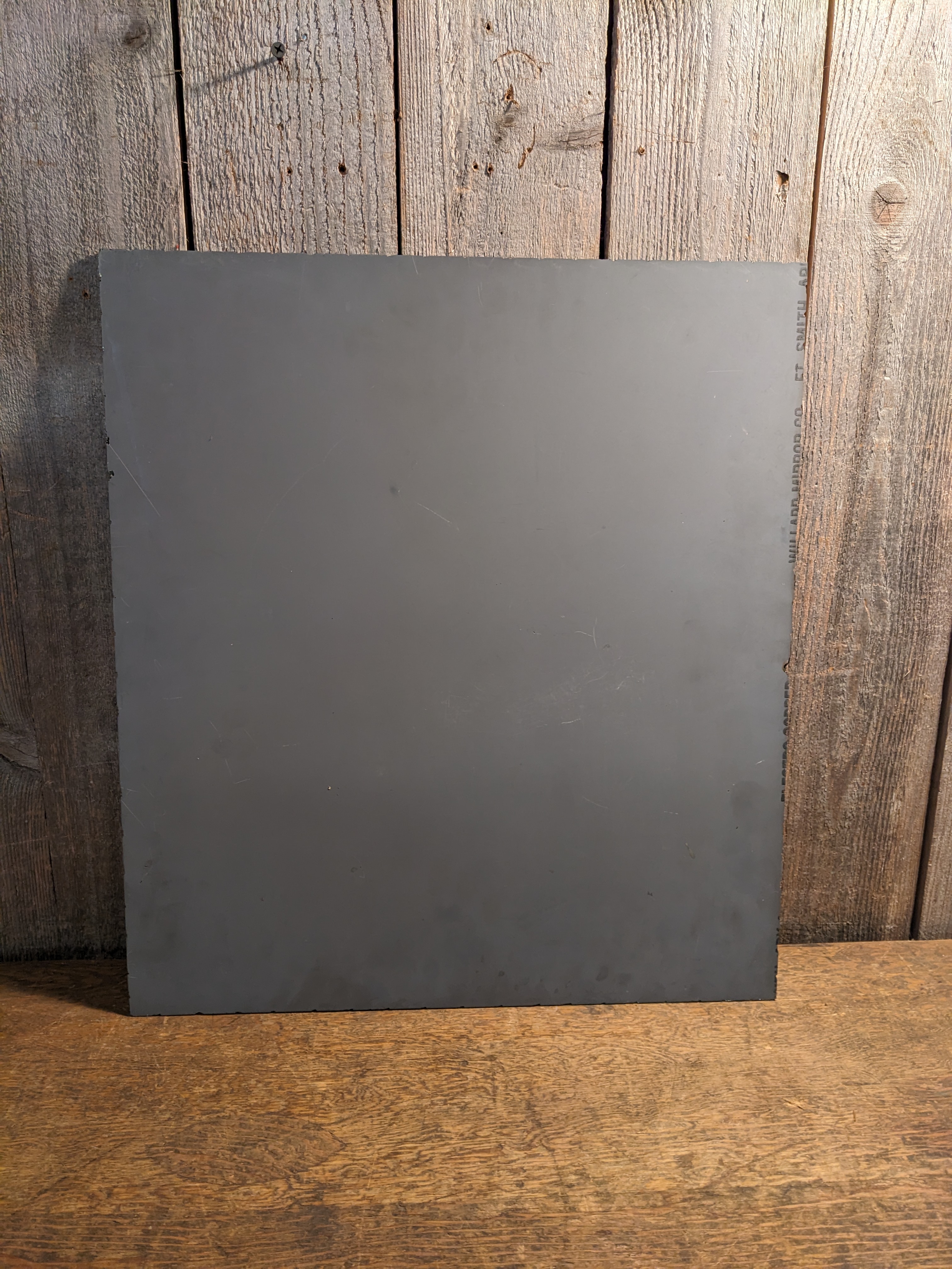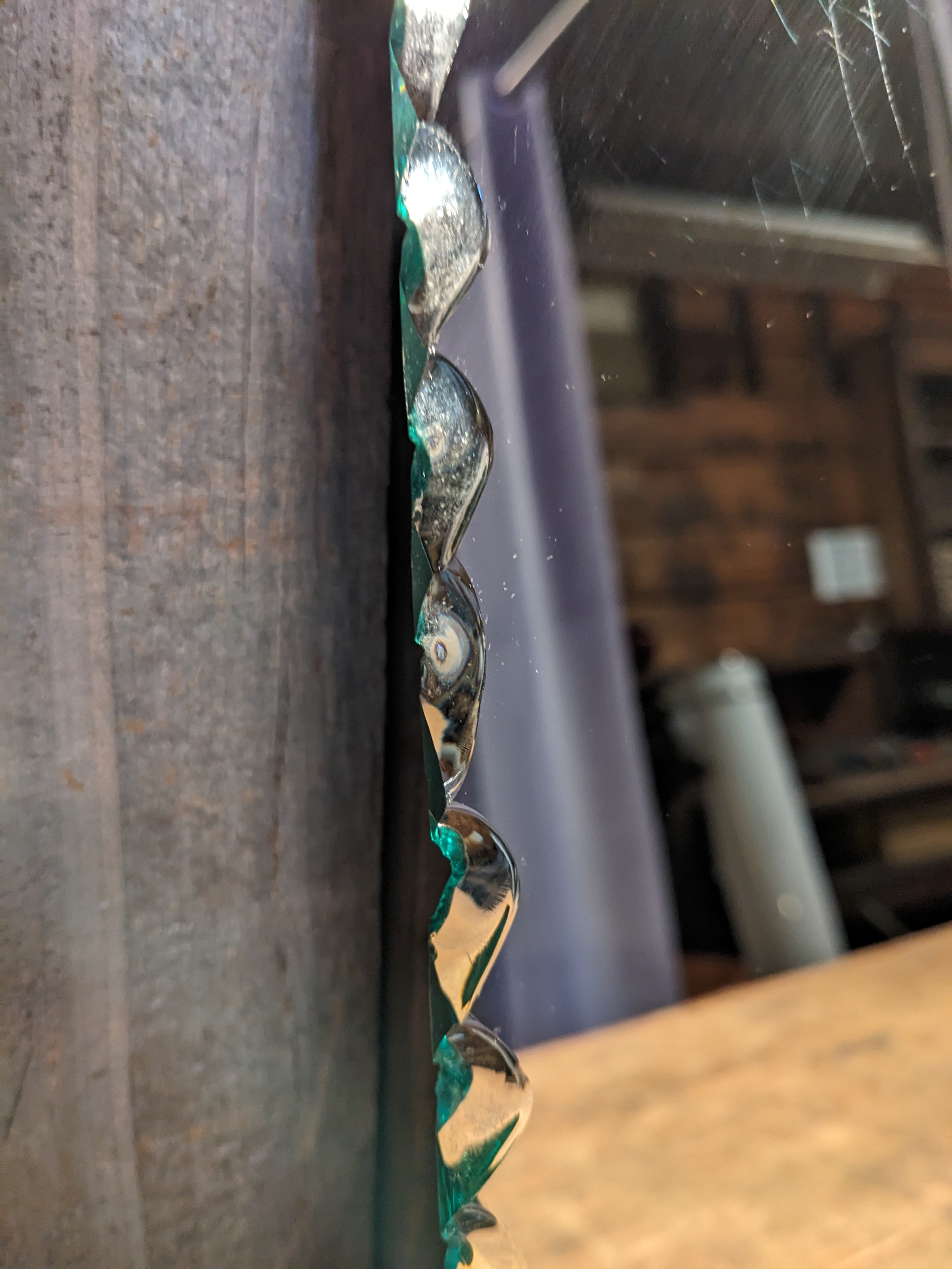 A small mirror with edges that have been artfully chipped to look crimped. It's in good condition with no chips scratches or cracks, and measures 17 x 19 inches.