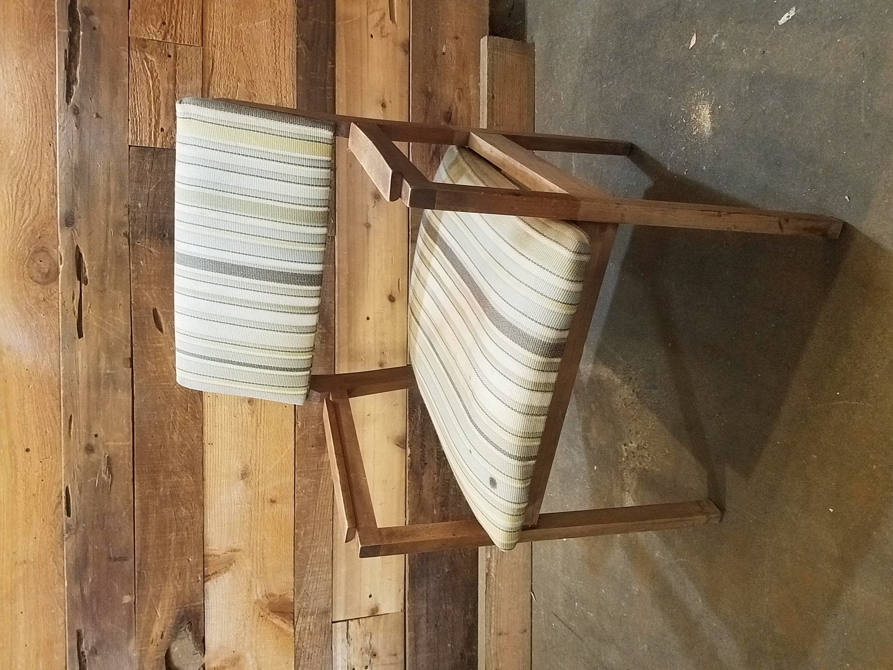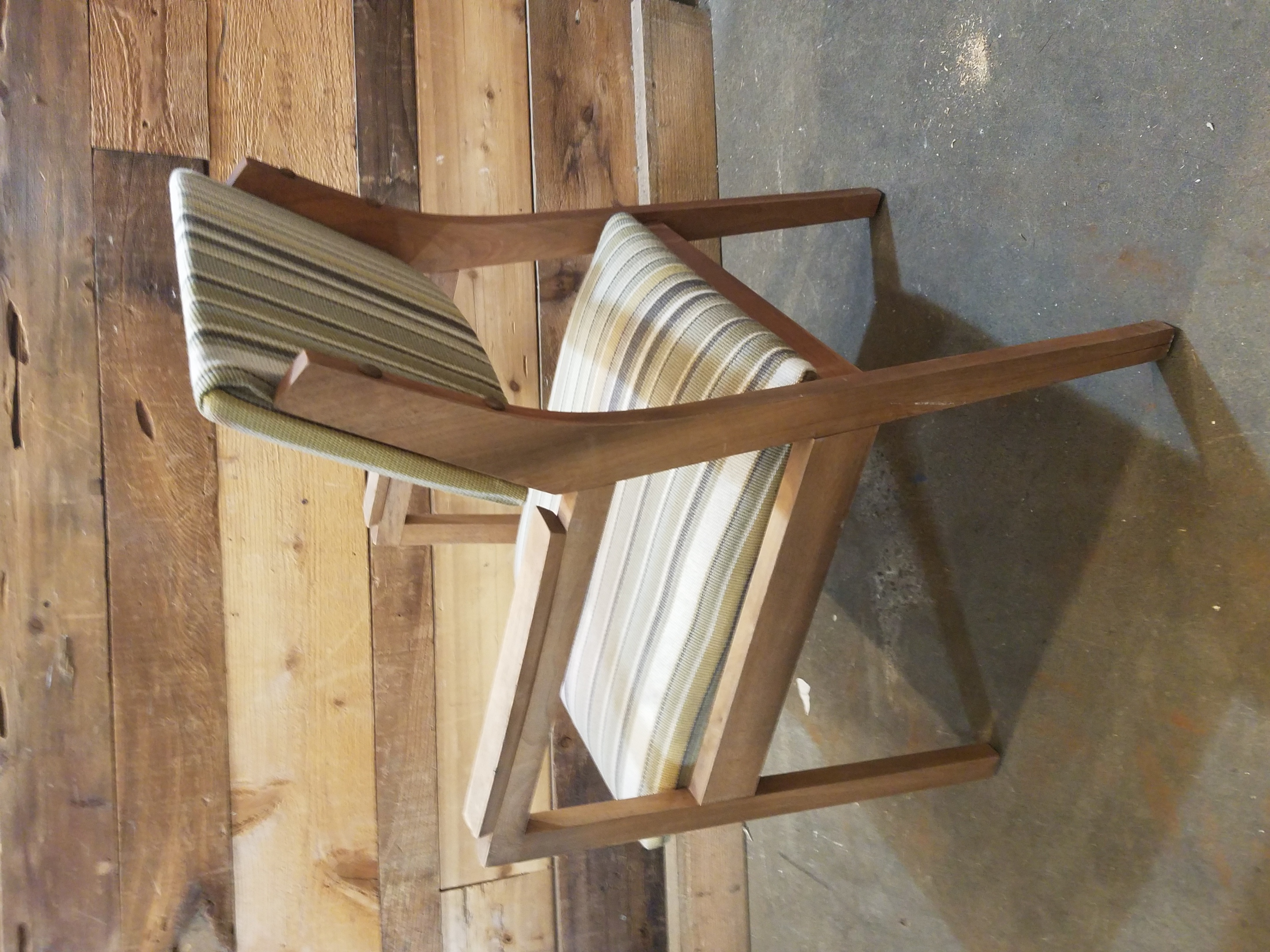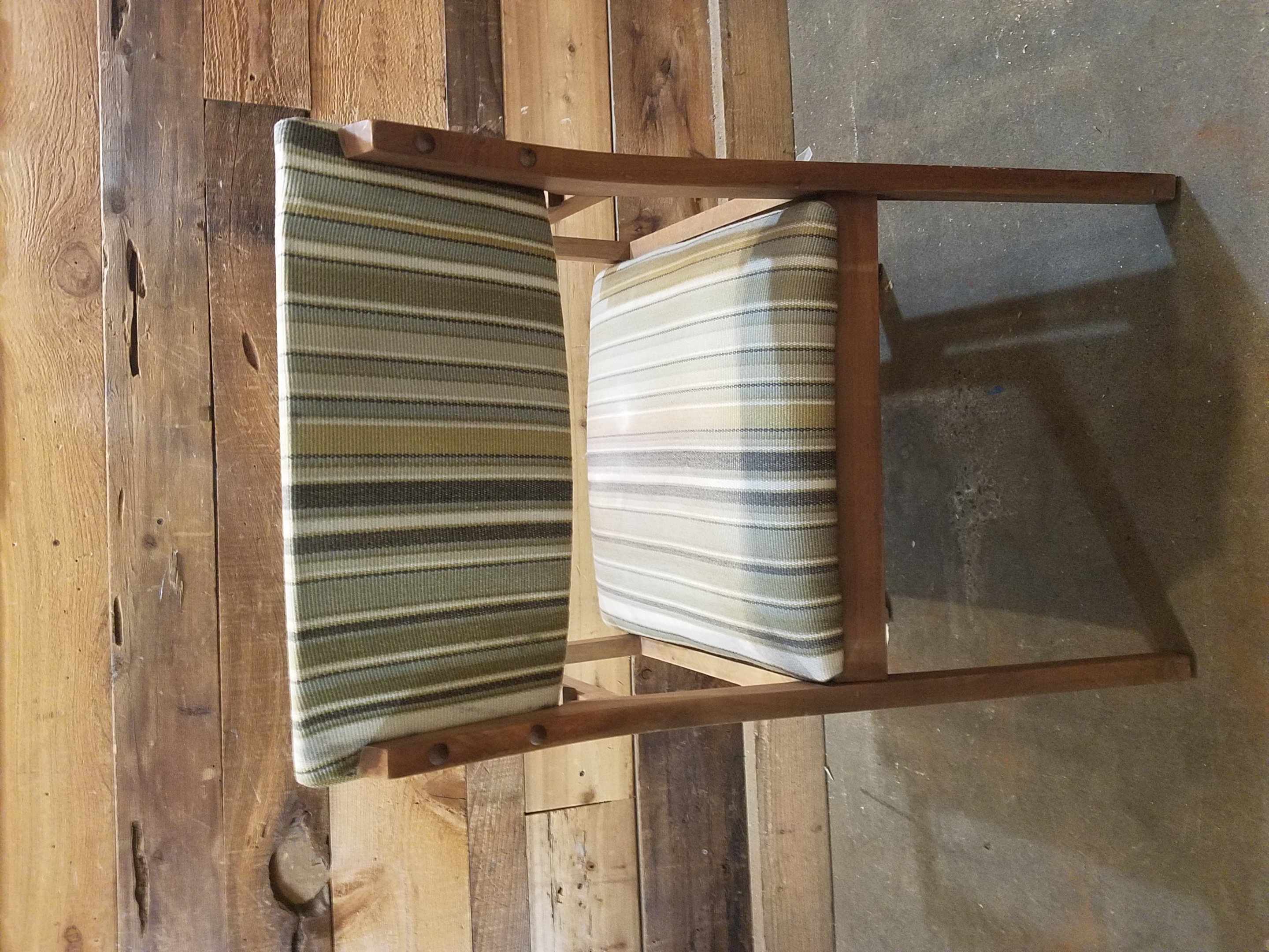 Lovely set of two mid-century modern chairs with sturdy wooden frames and fitted with green and cream striped upholstery.