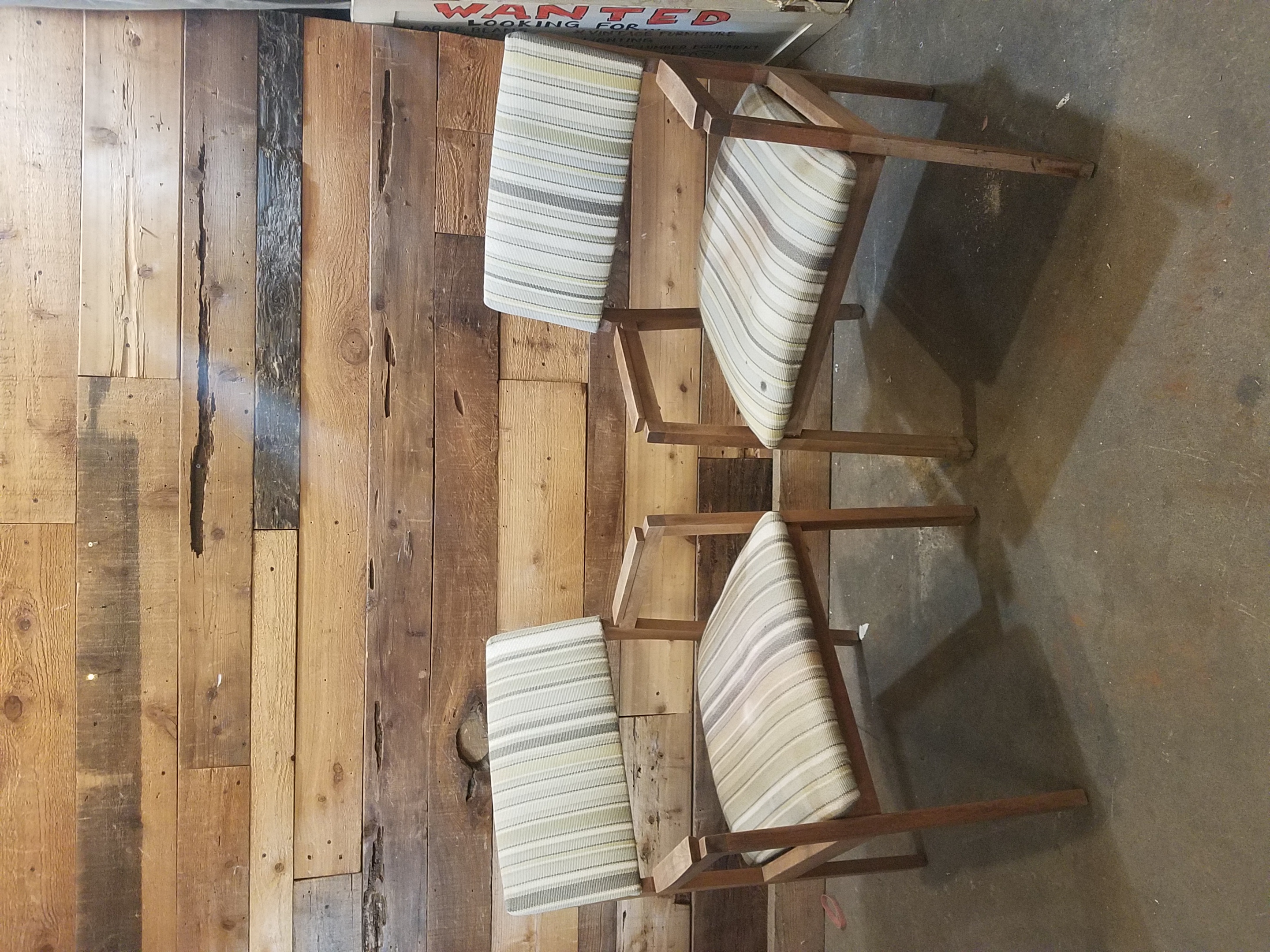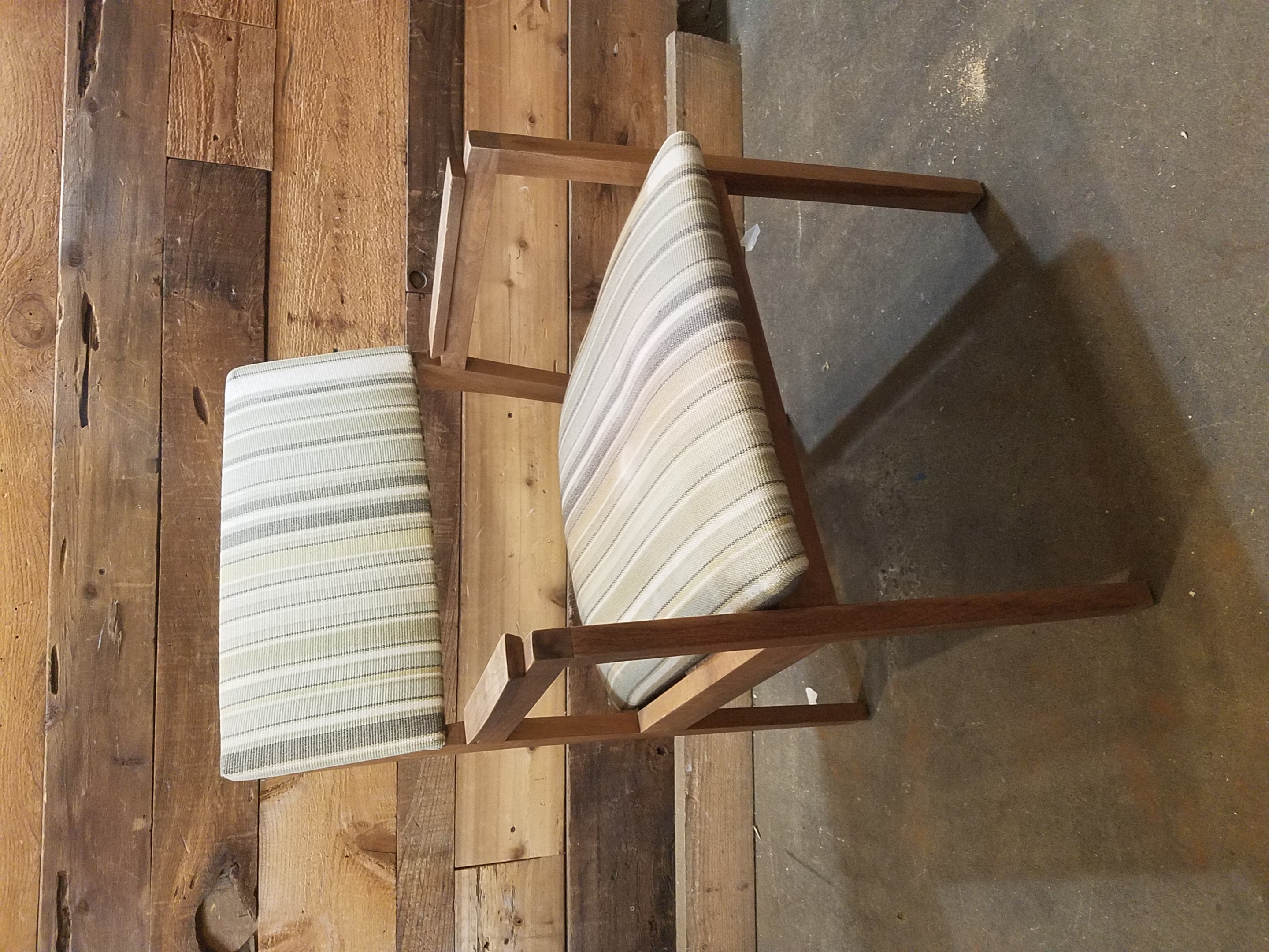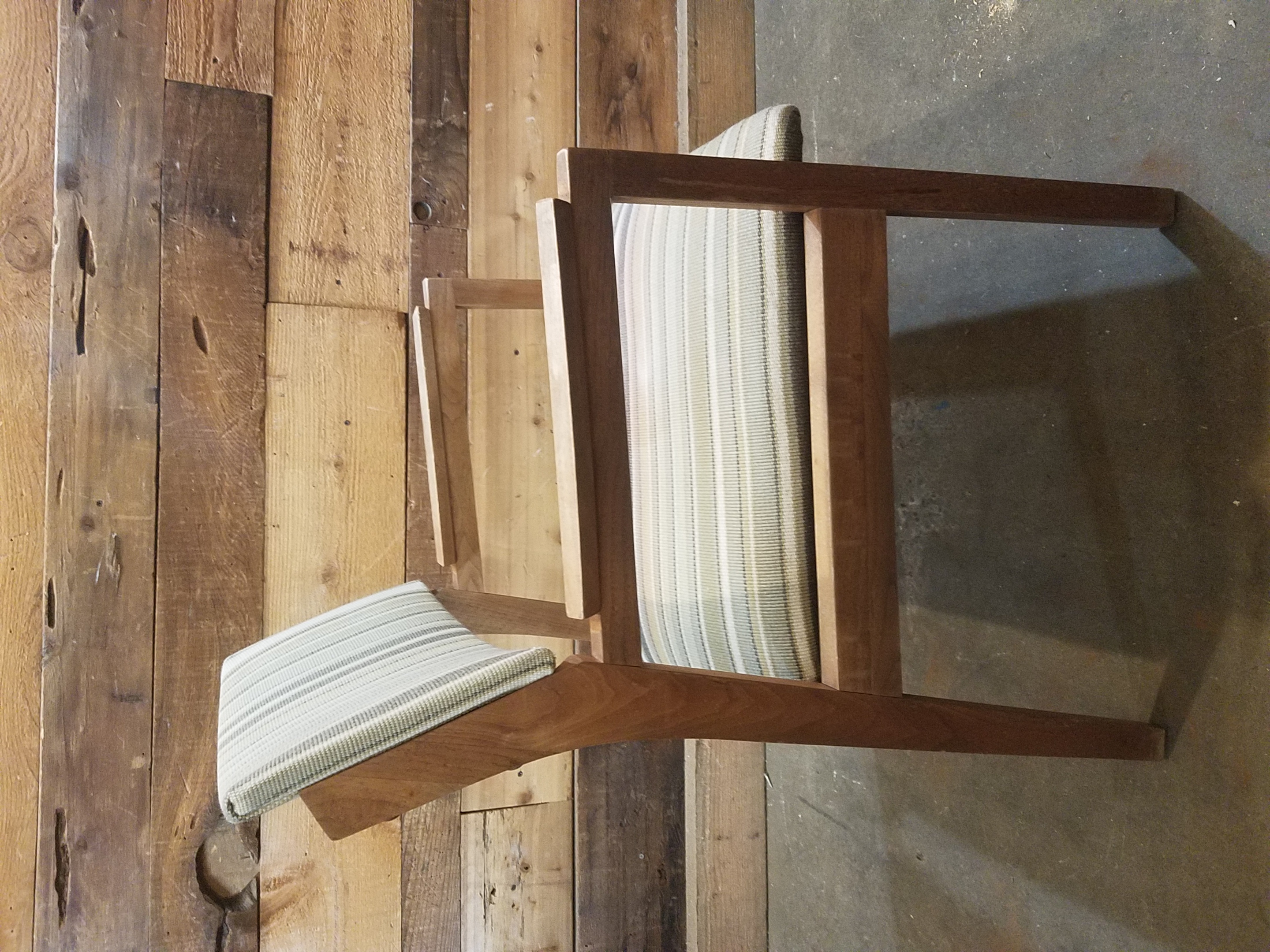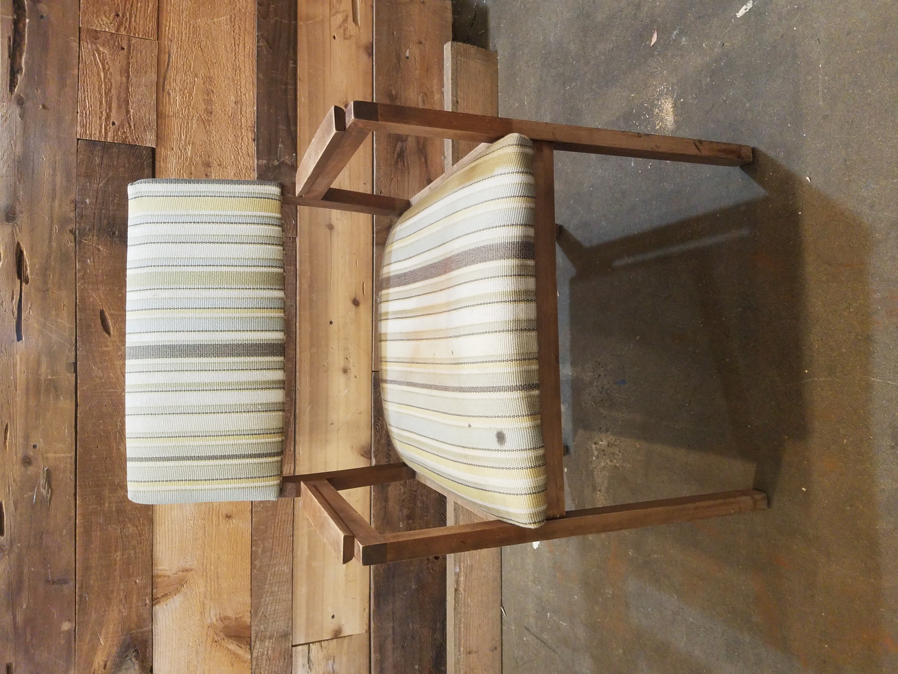 Lovely set of two mid-century modern chairs with sturdy wooden frames and fitted with green and cream striped upholstery.
