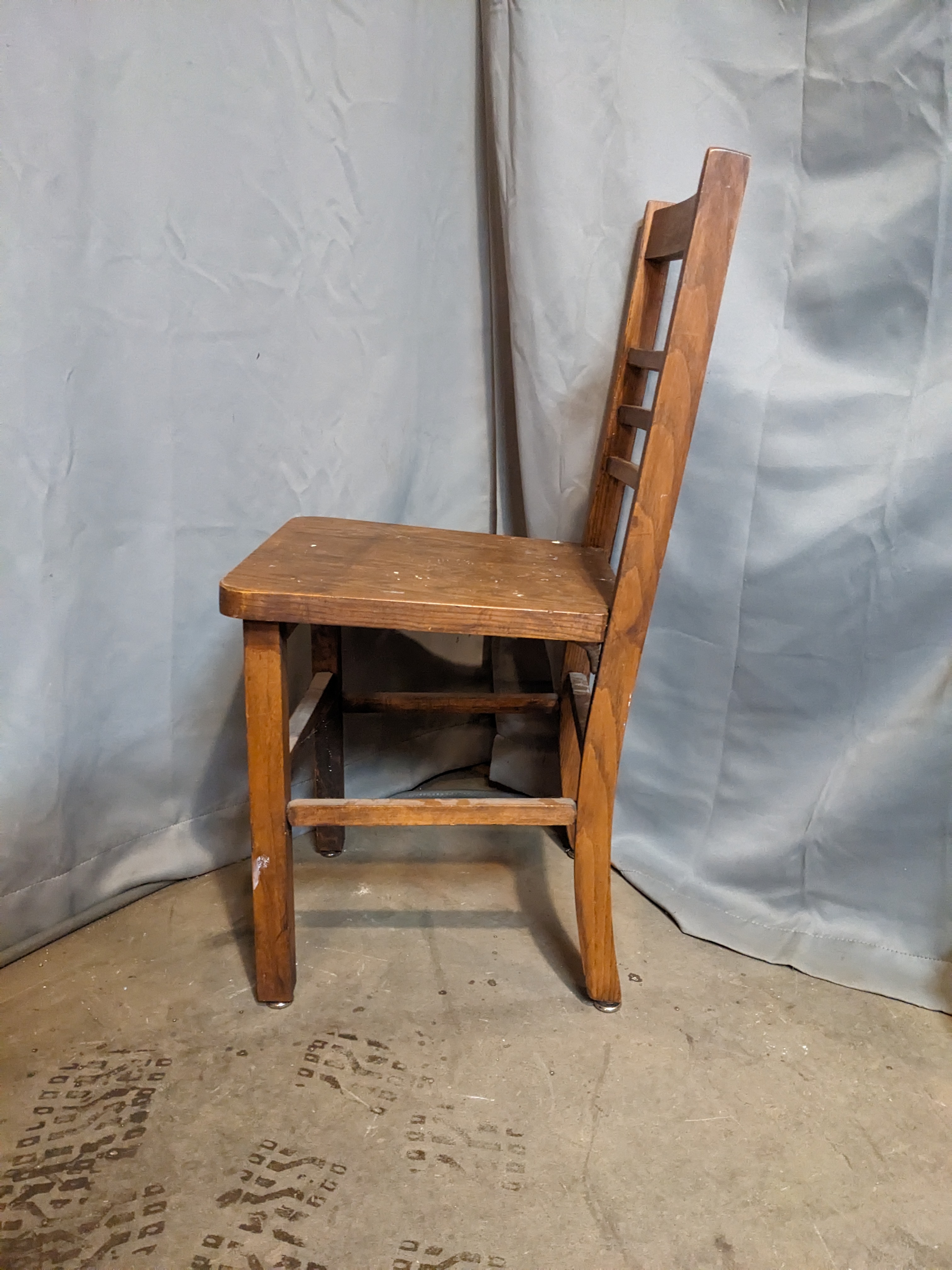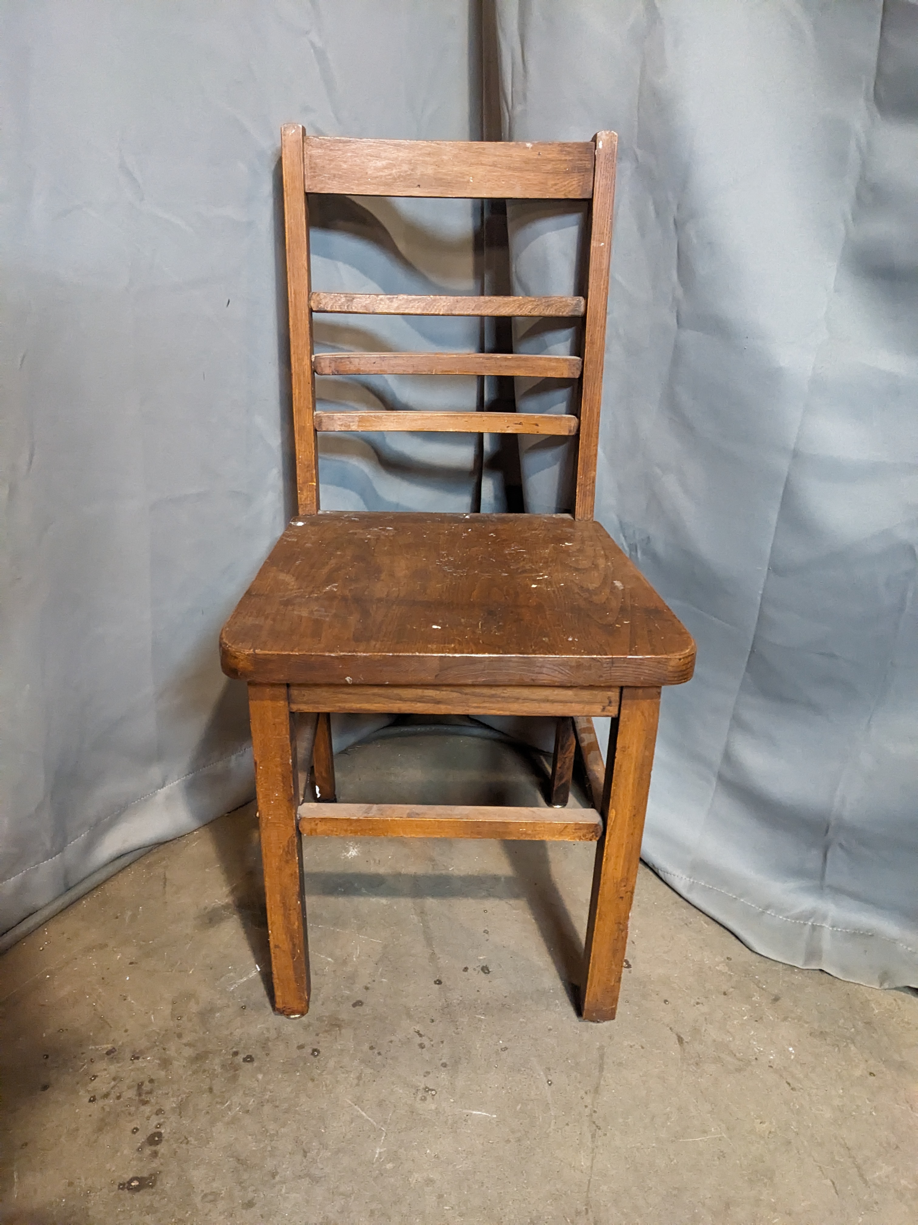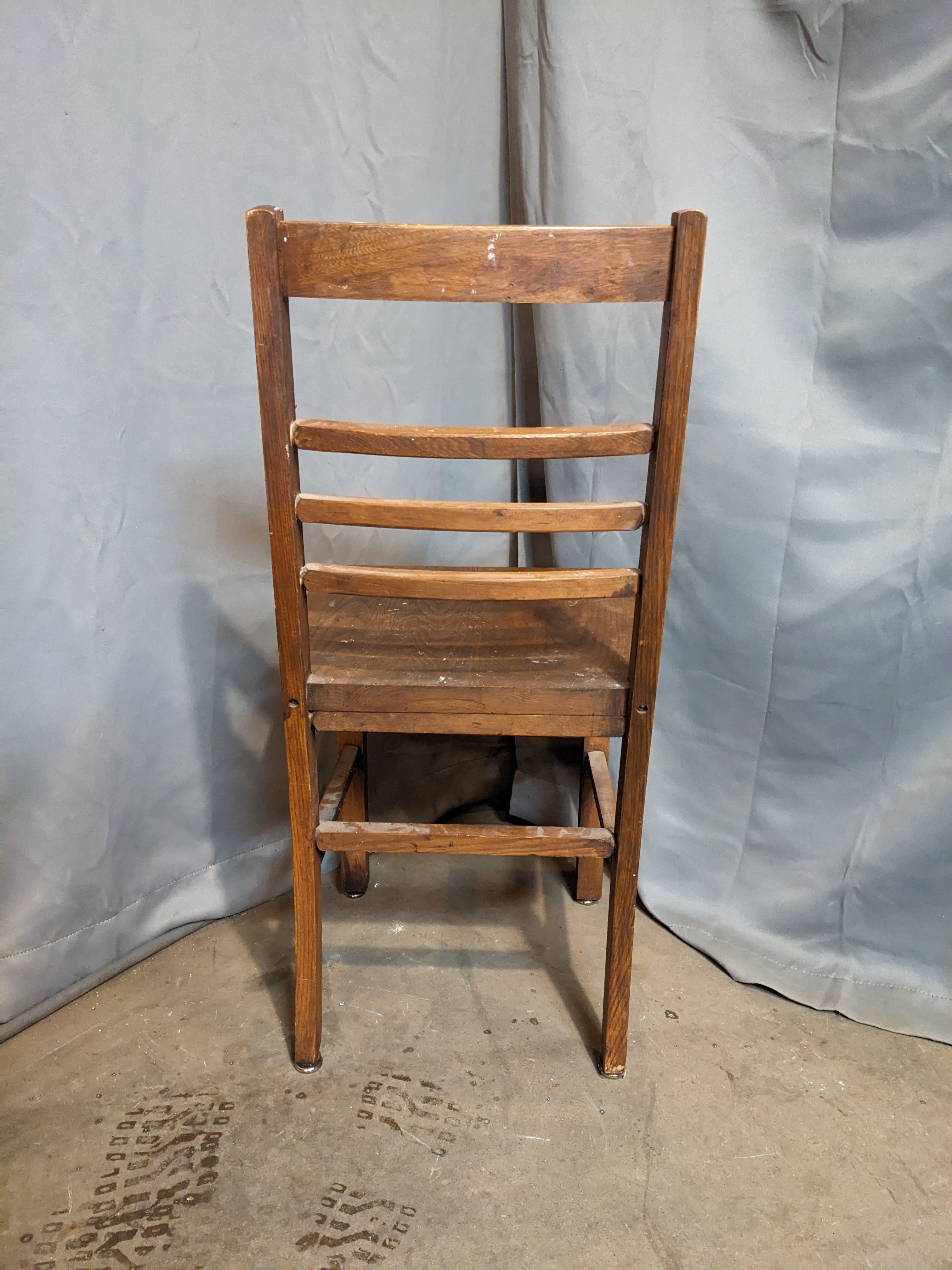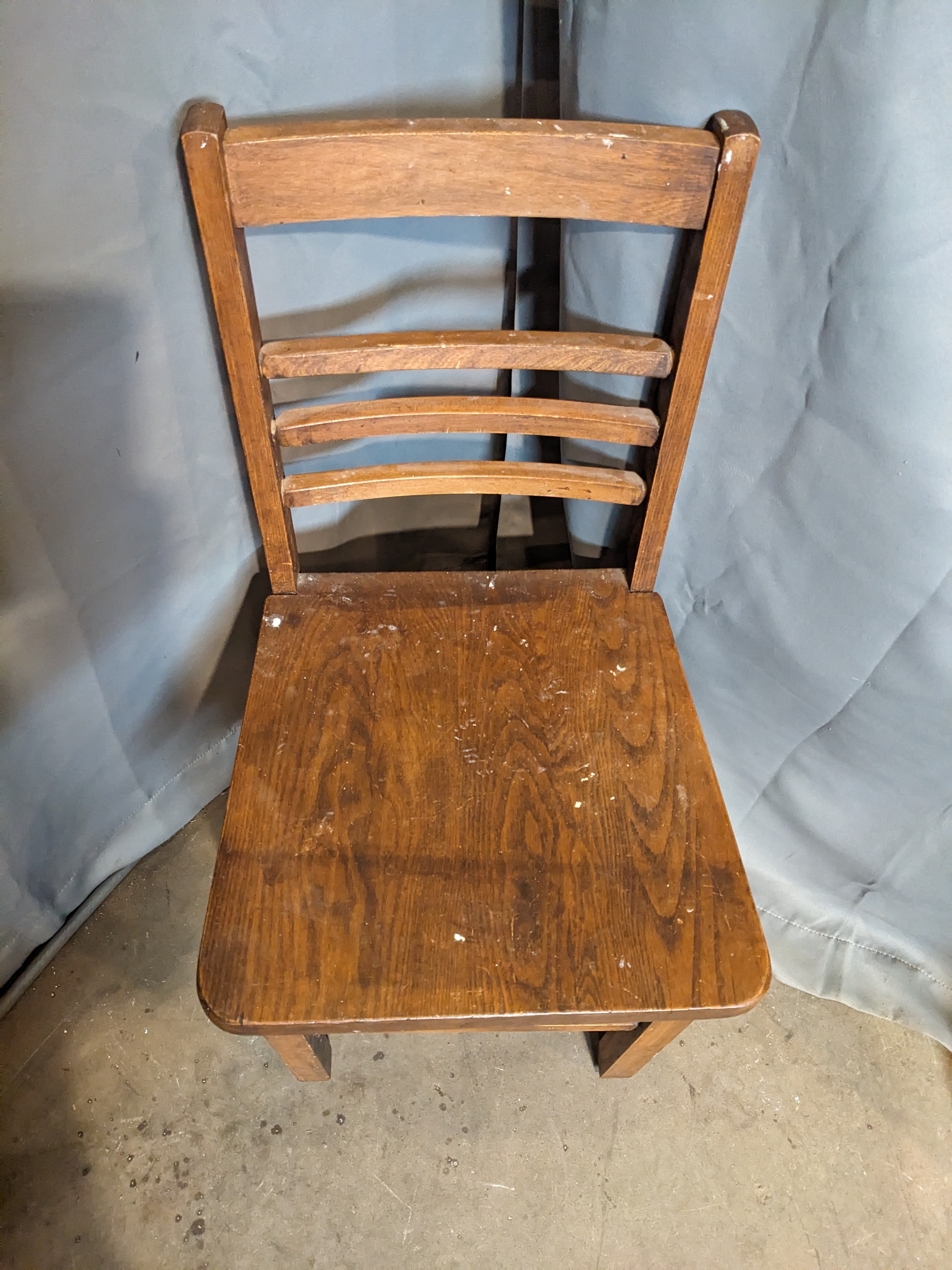 A wooden chair with a simple design. It's in good shape overall with some wear and paint splatters. It measures 15.375 x 31.5 x 17 inches.
