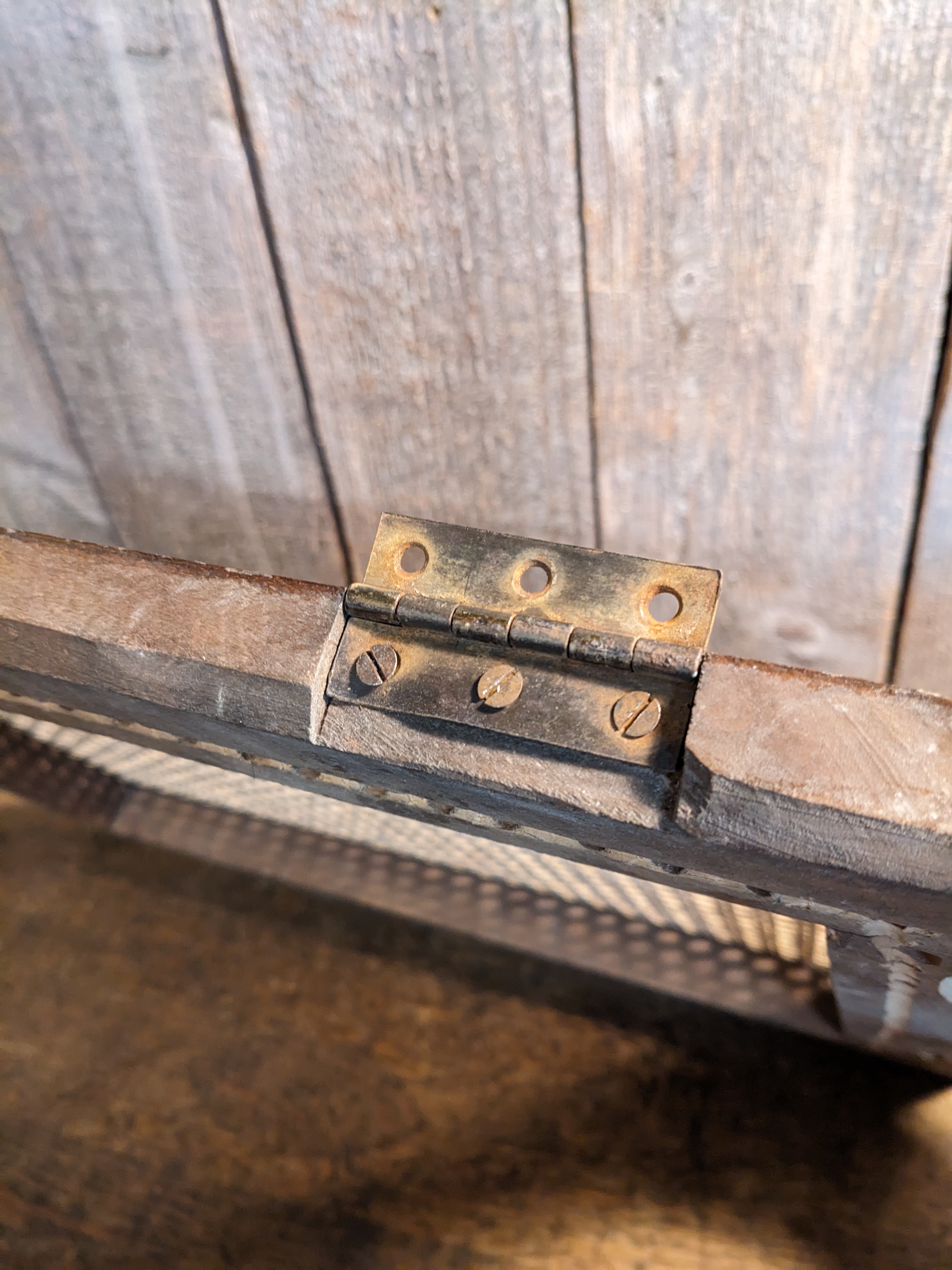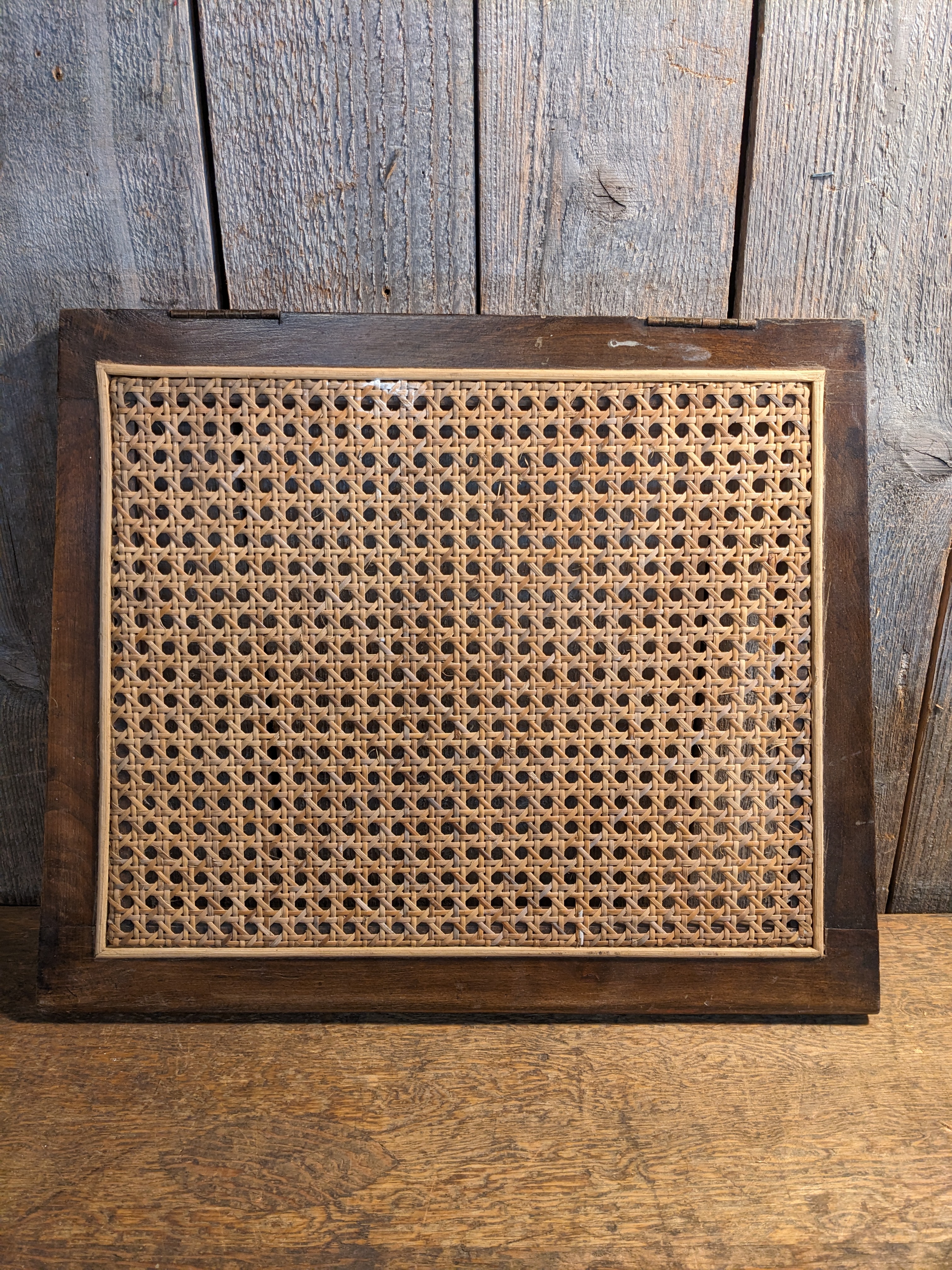 A caned chair seat with a set of hinges on the back. It's in good condition with a bit of wear, and measures 17.25 x 14 x 0.75 inches.